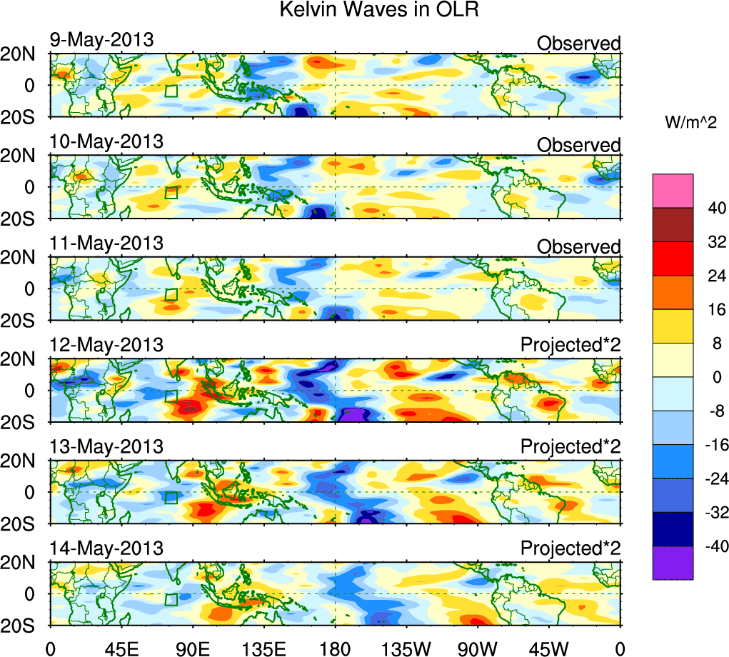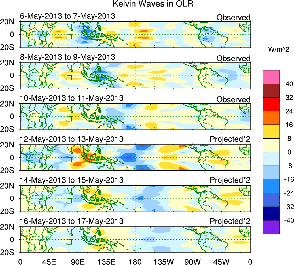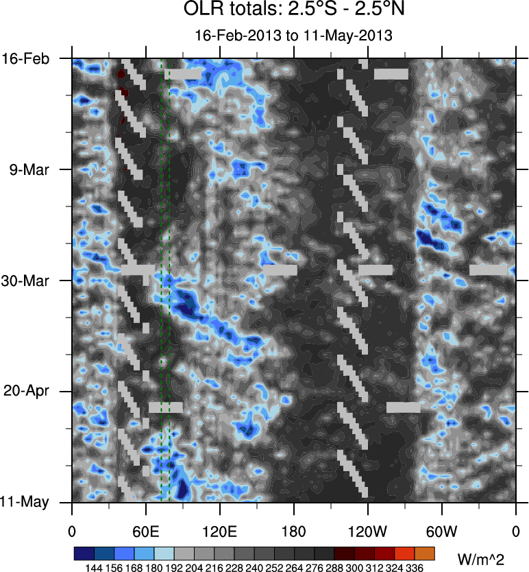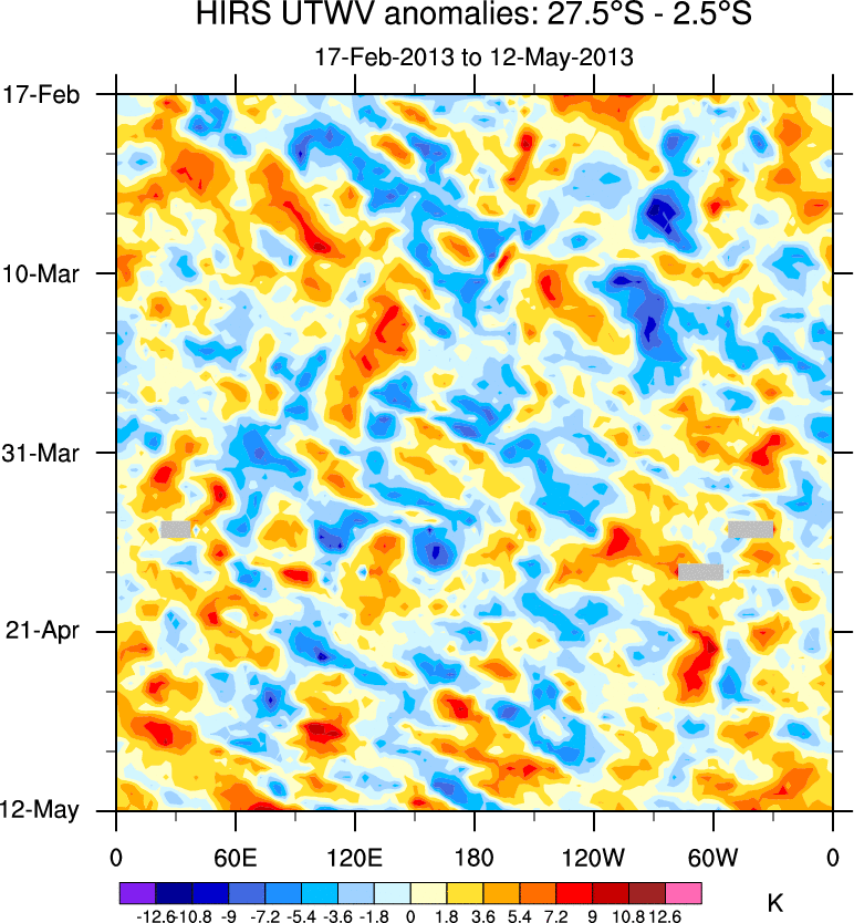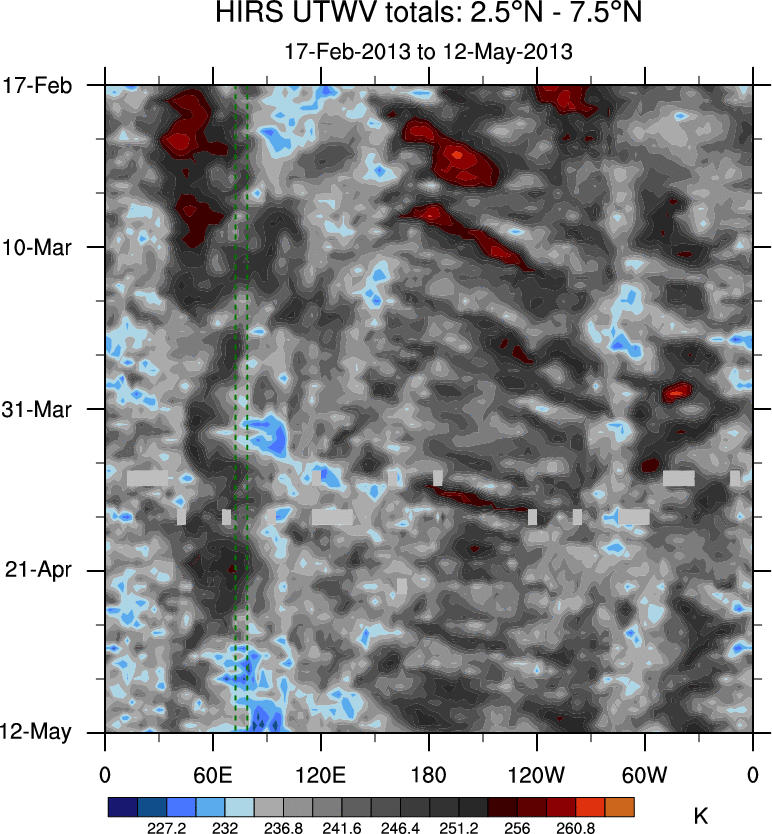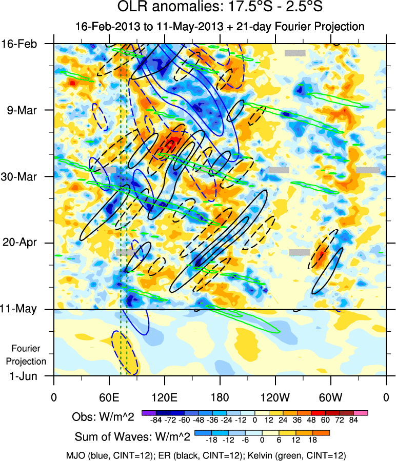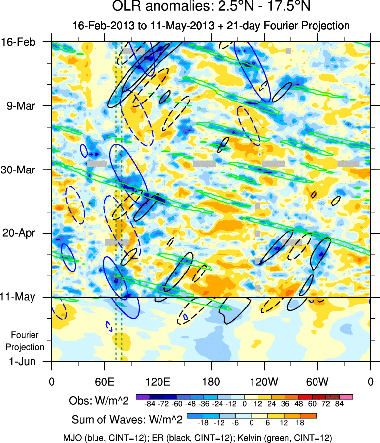 To identify tropical waves in near real-time, the OLR and UTWV data are filtered following Wheeler & Weickmann (2001 MWR). The daily anomalies are calculated using the first 3 harmonics of the seasonal cycle for 1979–2009. Missing values are then filled using linear interpolation in space and time. The most recent 365 days of anomalies are padded with 659 days of zeroes, and the result is filtered for each wave type.