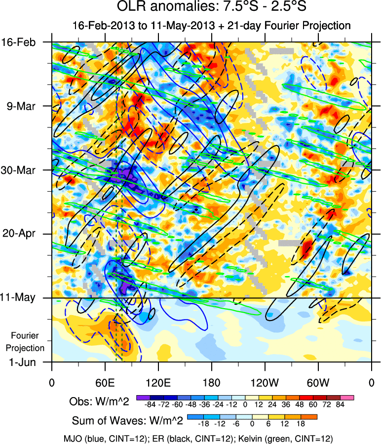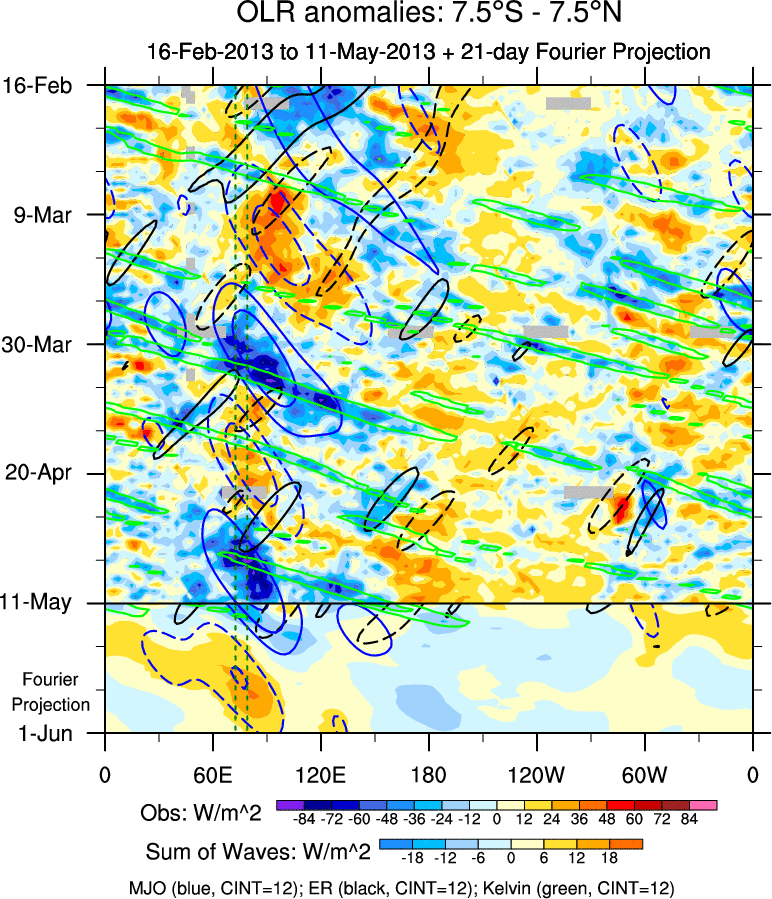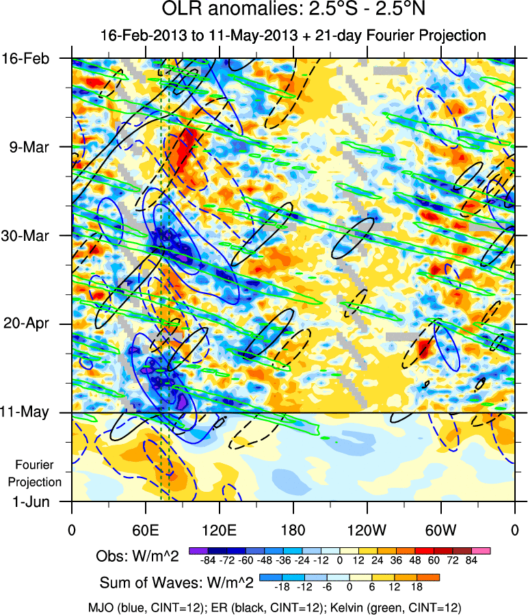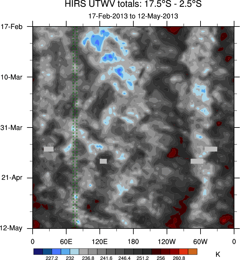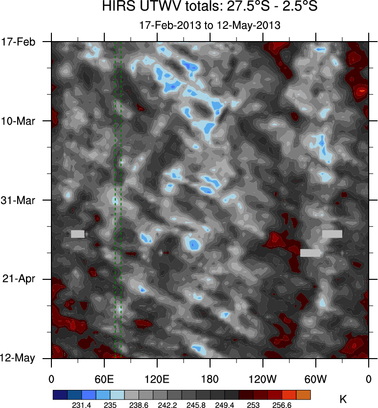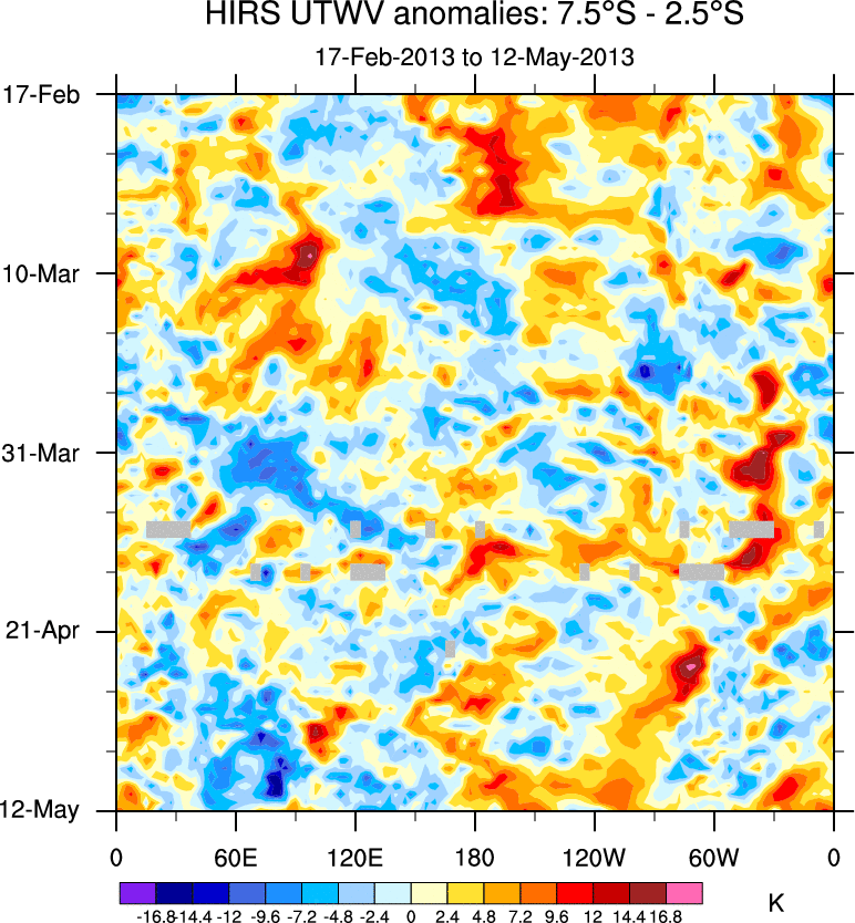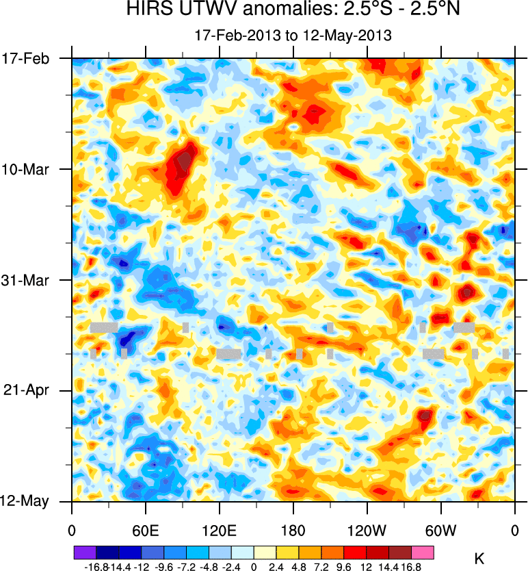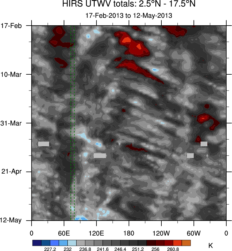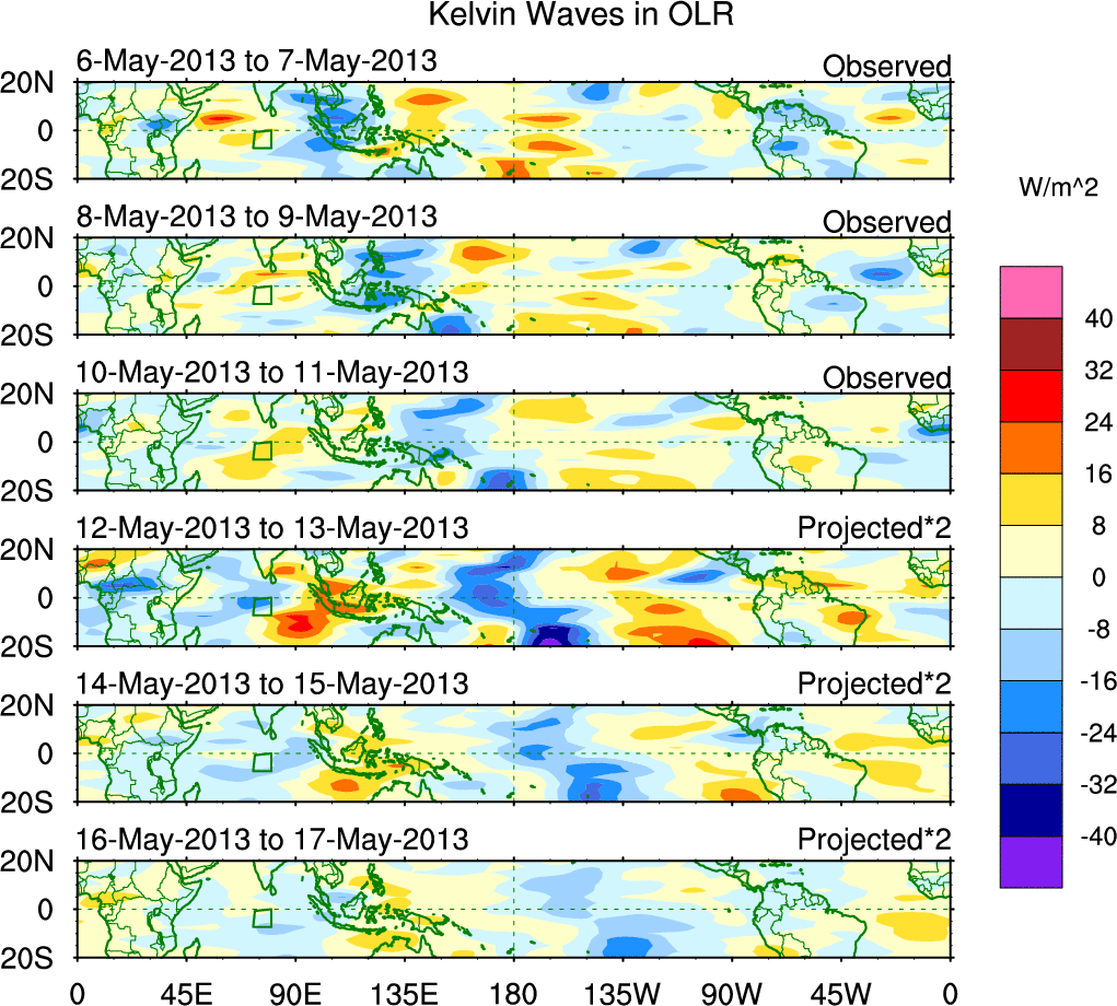 To identify tropical waves in near real-time, the OLR and UTWV data are filtered following Wheeler & Weickmann (2001 MWR). The daily anomalies are calculated using the first 3 harmonics of the seasonal cycle for 1979–2009. Missing values are then filled using linear interpolation in space and time. The most recent 365 days of anomalies are padded with 659 days of zeroes, and the result is filtered for each wave type.