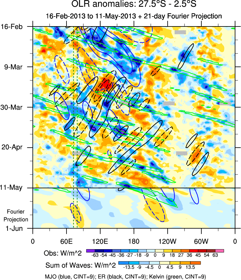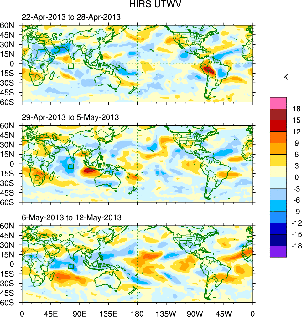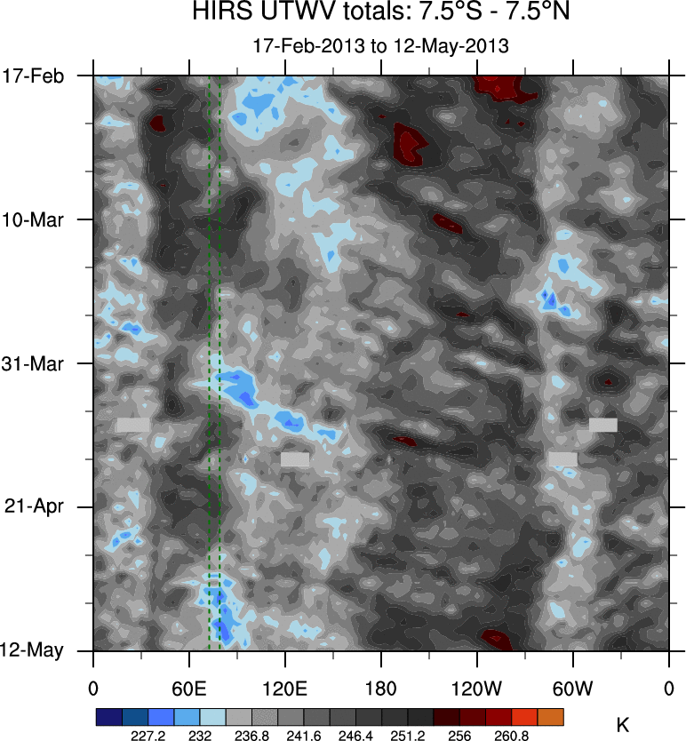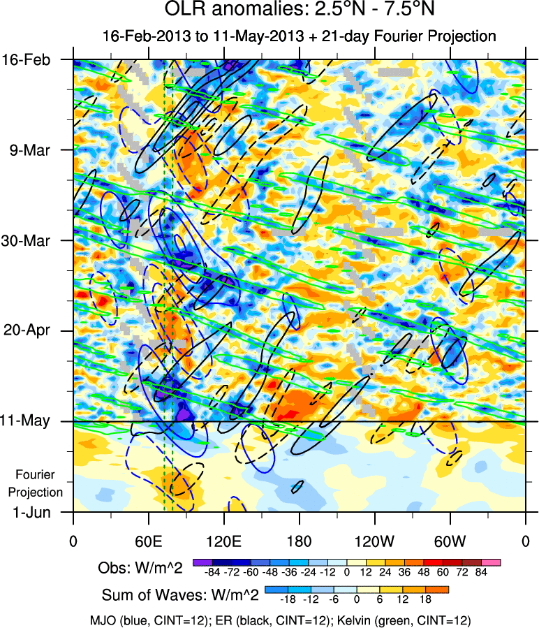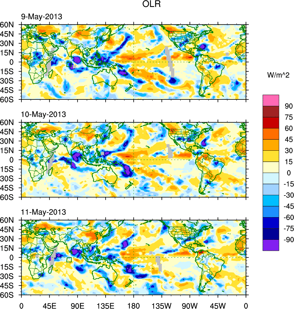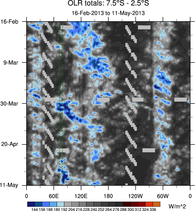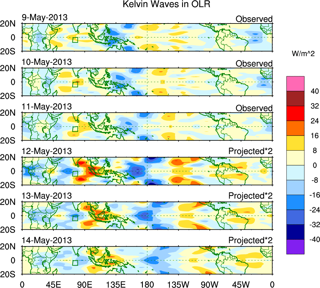 To identify tropical waves in near real-time, the OLR and UTWV data are filtered following Wheeler & Weickmann (2001 MWR). The daily anomalies are calculated using the first 3 harmonics of the seasonal cycle for 1979–2009. Missing values are then filled using linear interpolation in space and time. The most recent 365 days of anomalies are padded with 659 days of zeroes, and the result is filtered for each wave type.