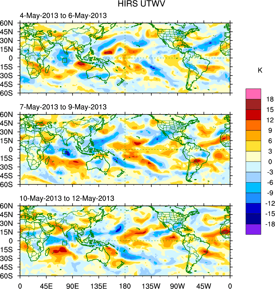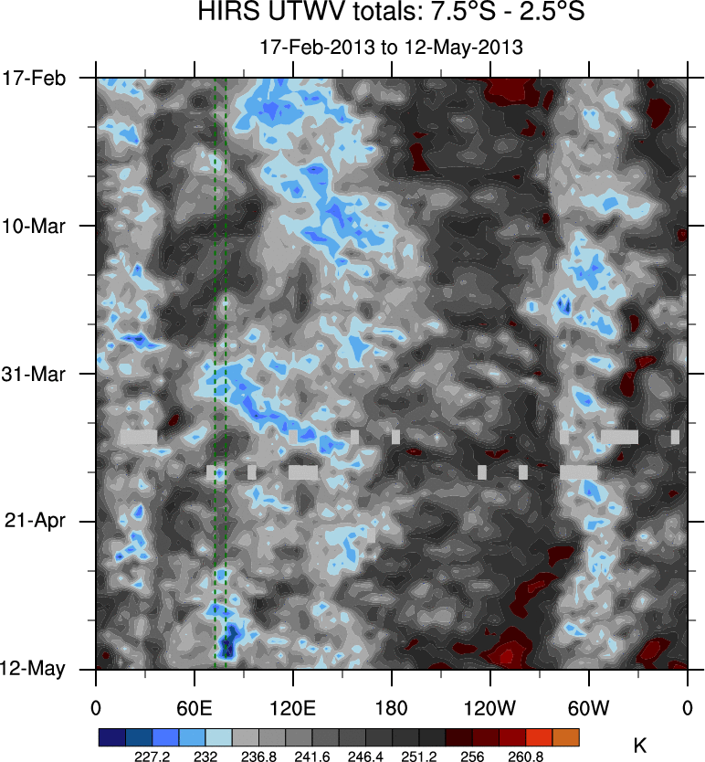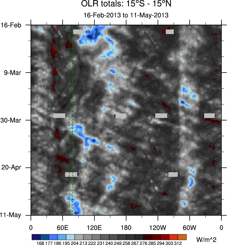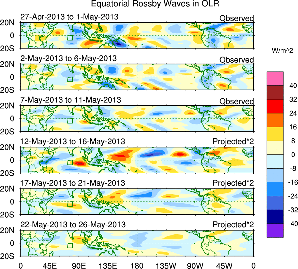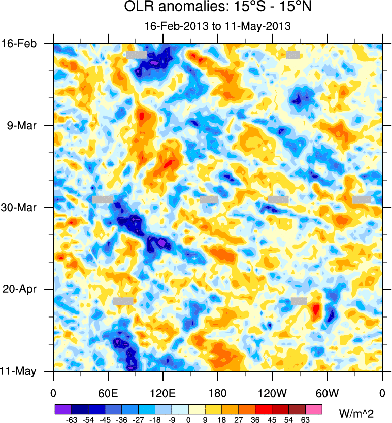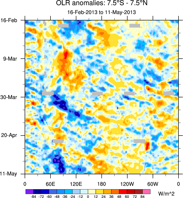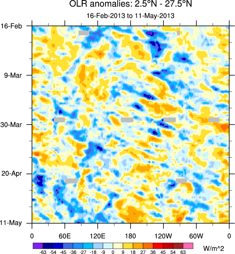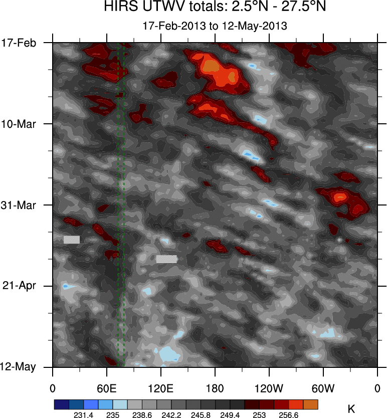 To identify tropical waves in near real-time, the OLR and UTWV data are filtered following Wheeler & Weickmann (2001 MWR). The daily anomalies are calculated using the first 3 harmonics of the seasonal cycle for 1979–2009. Missing values are then filled using linear interpolation in space and time. The most recent 365 days of anomalies are padded with 659 days of zeroes, and the result is filtered for each wave type.