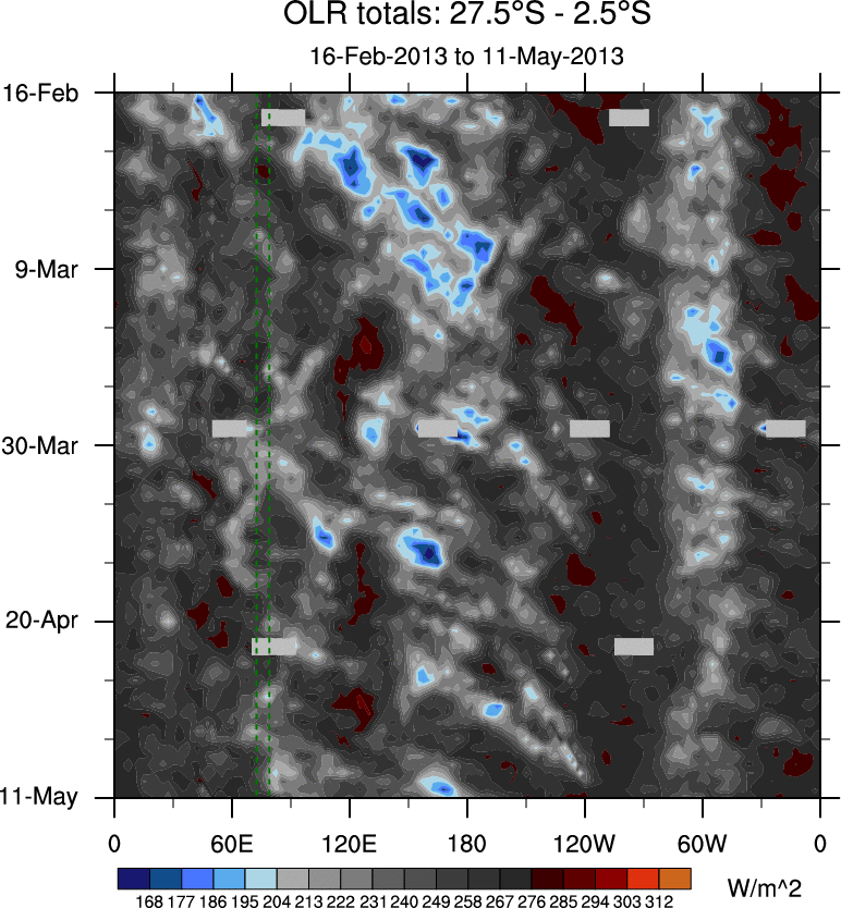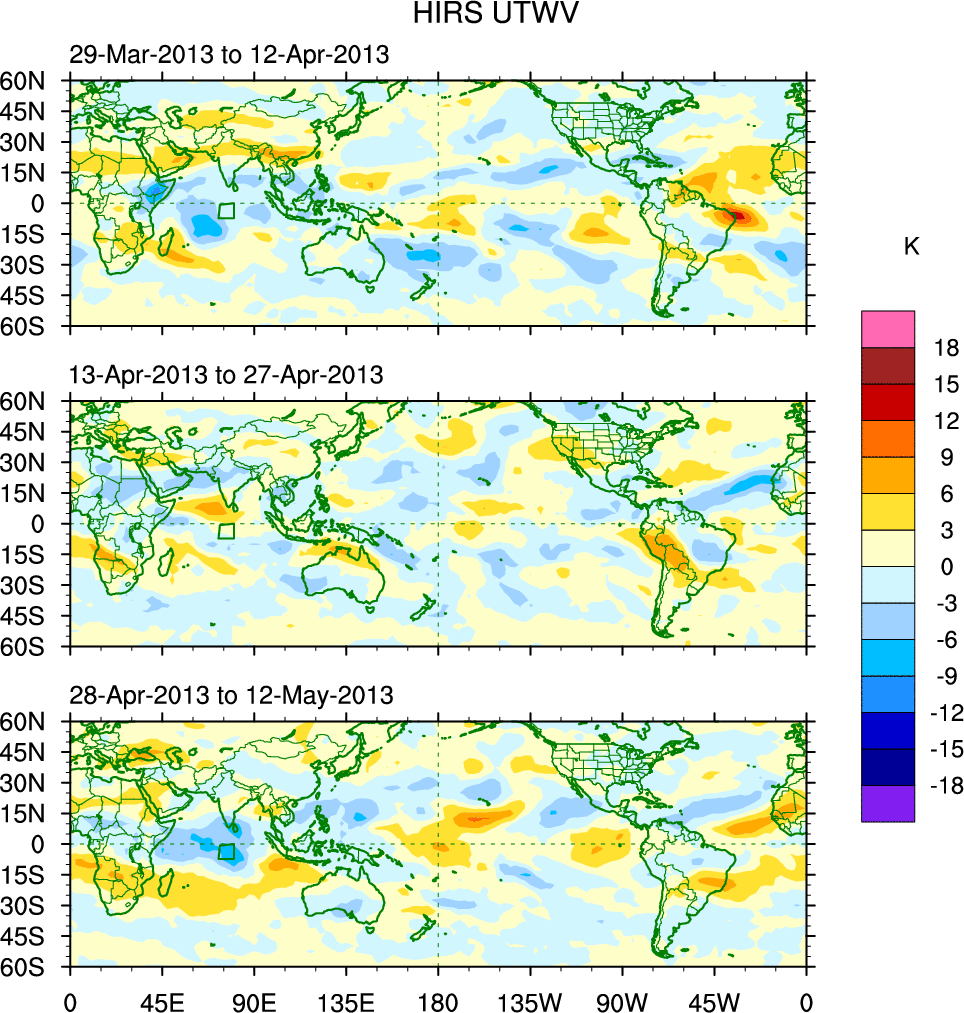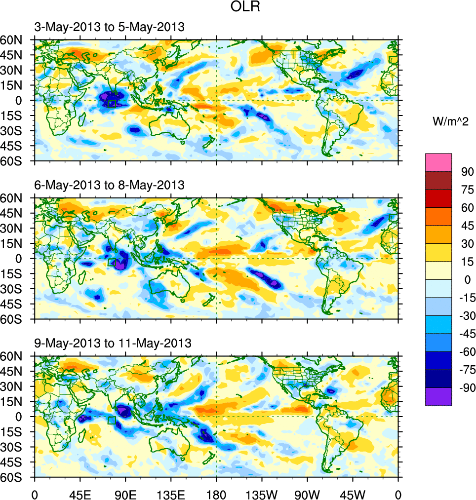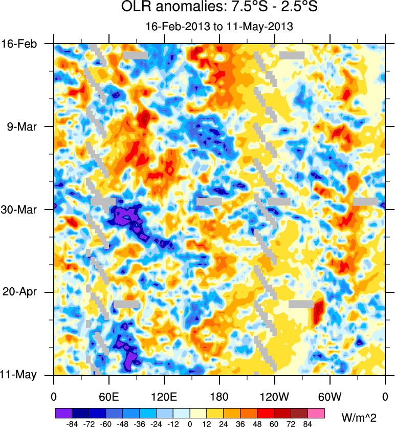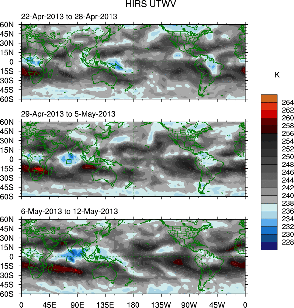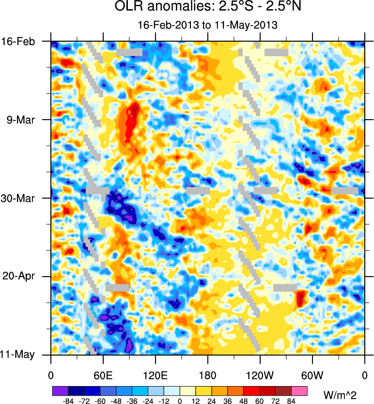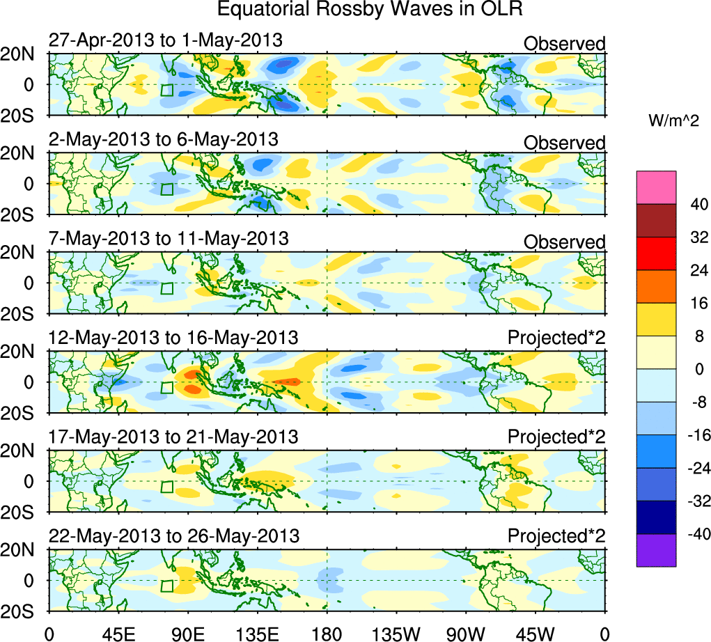 To identify tropical waves in near real-time, the OLR and UTWV data are filtered following Wheeler & Weickmann (2001 MWR). The daily anomalies are calculated using the first 3 harmonics of the seasonal cycle for 1979–2009. Missing values are then filled using linear interpolation in space and time. The most recent 365 days of anomalies are padded with 659 days of zeroes, and the result is filtered for each wave type.