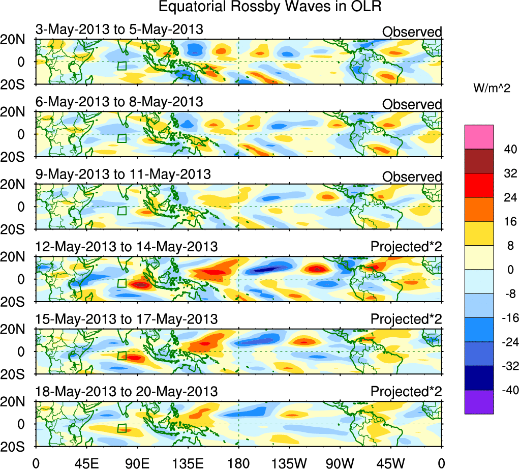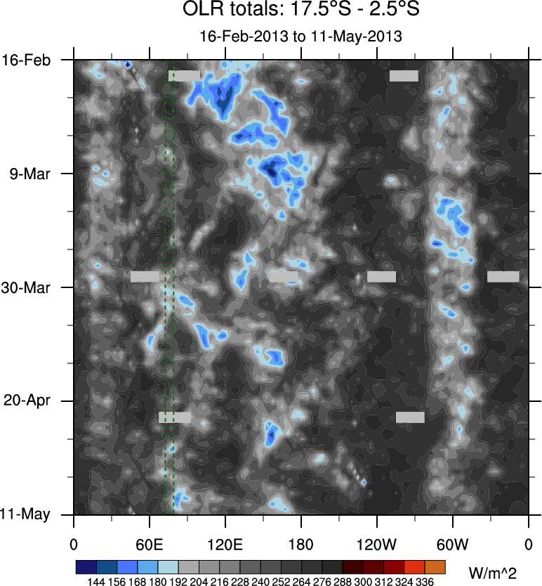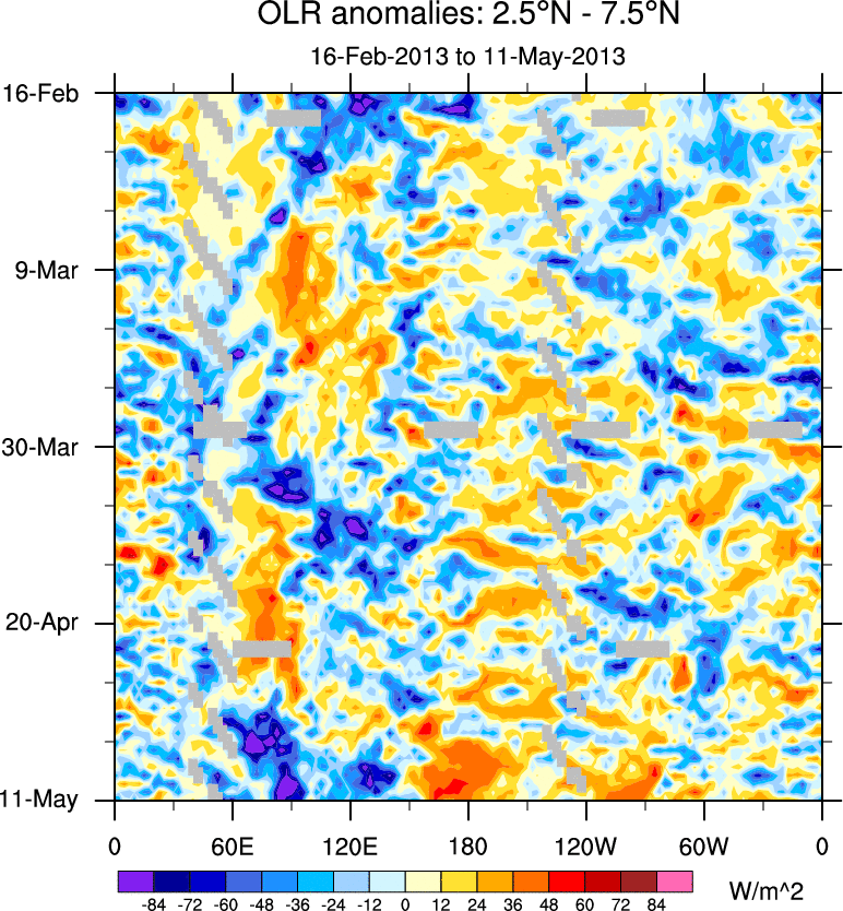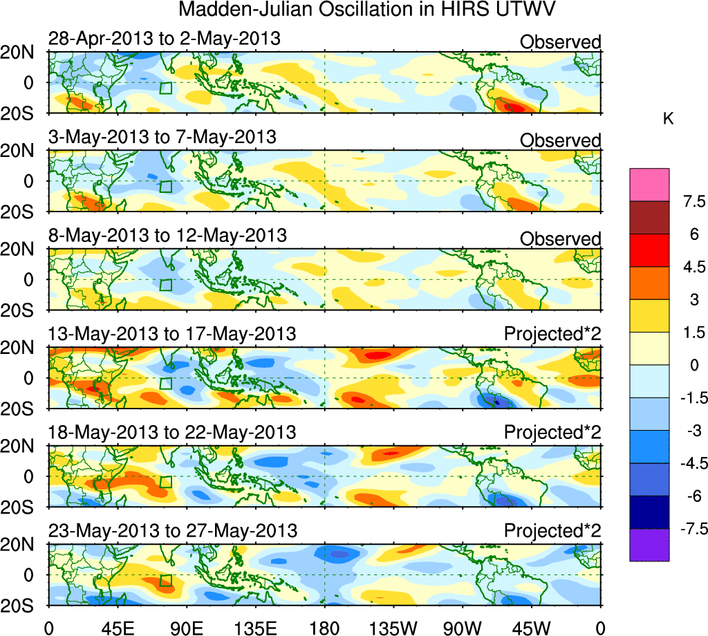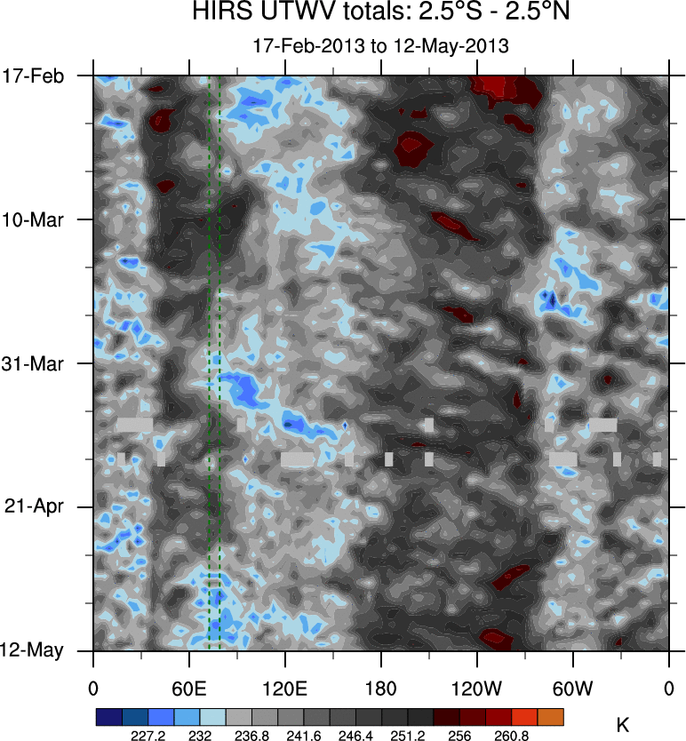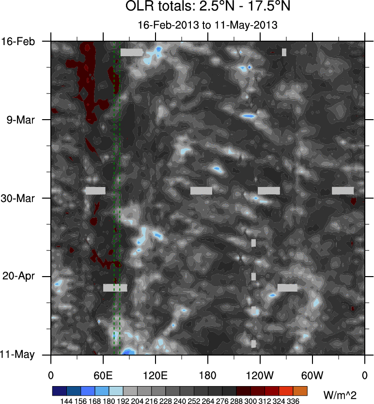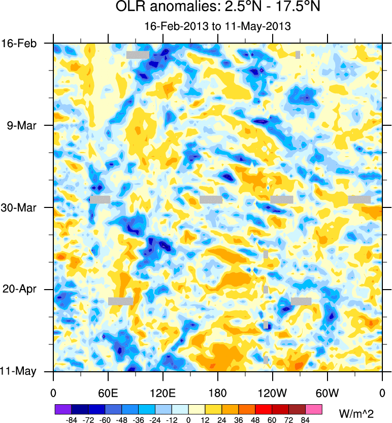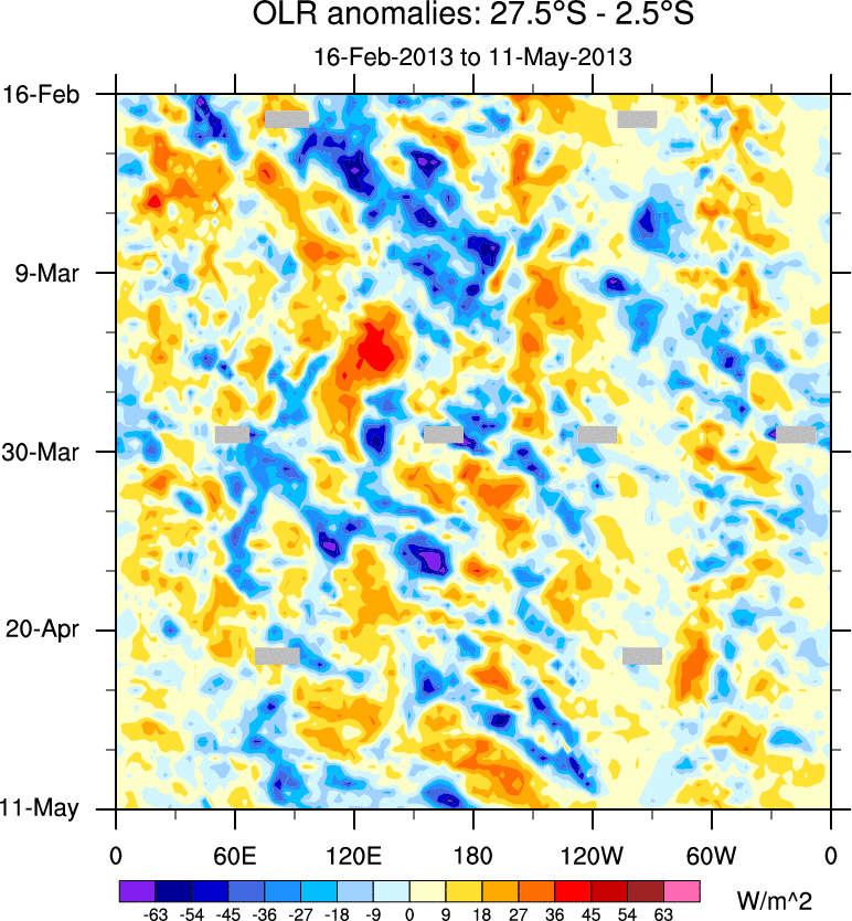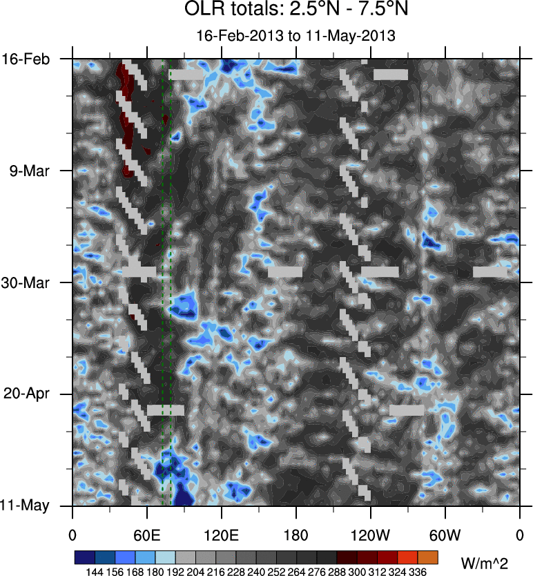 To identify tropical waves in near real-time, the OLR and UTWV data are filtered following Wheeler & Weickmann (2001 MWR). The daily anomalies are calculated using the first 3 harmonics of the seasonal cycle for 1979–2009. Missing values are then filled using linear interpolation in space and time. The most recent 365 days of anomalies are padded with 659 days of zeroes, and the result is filtered for each wave type.