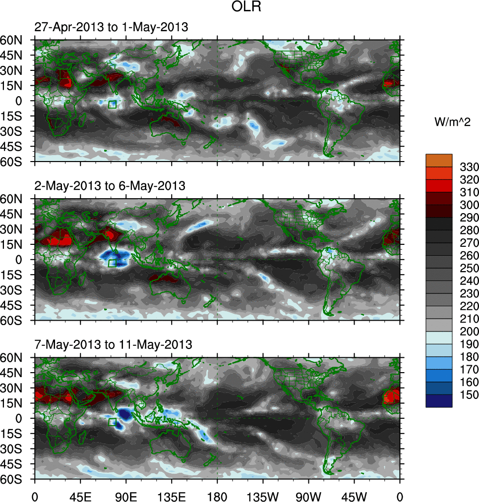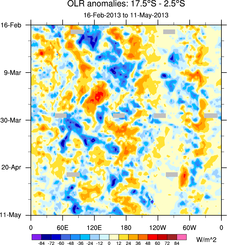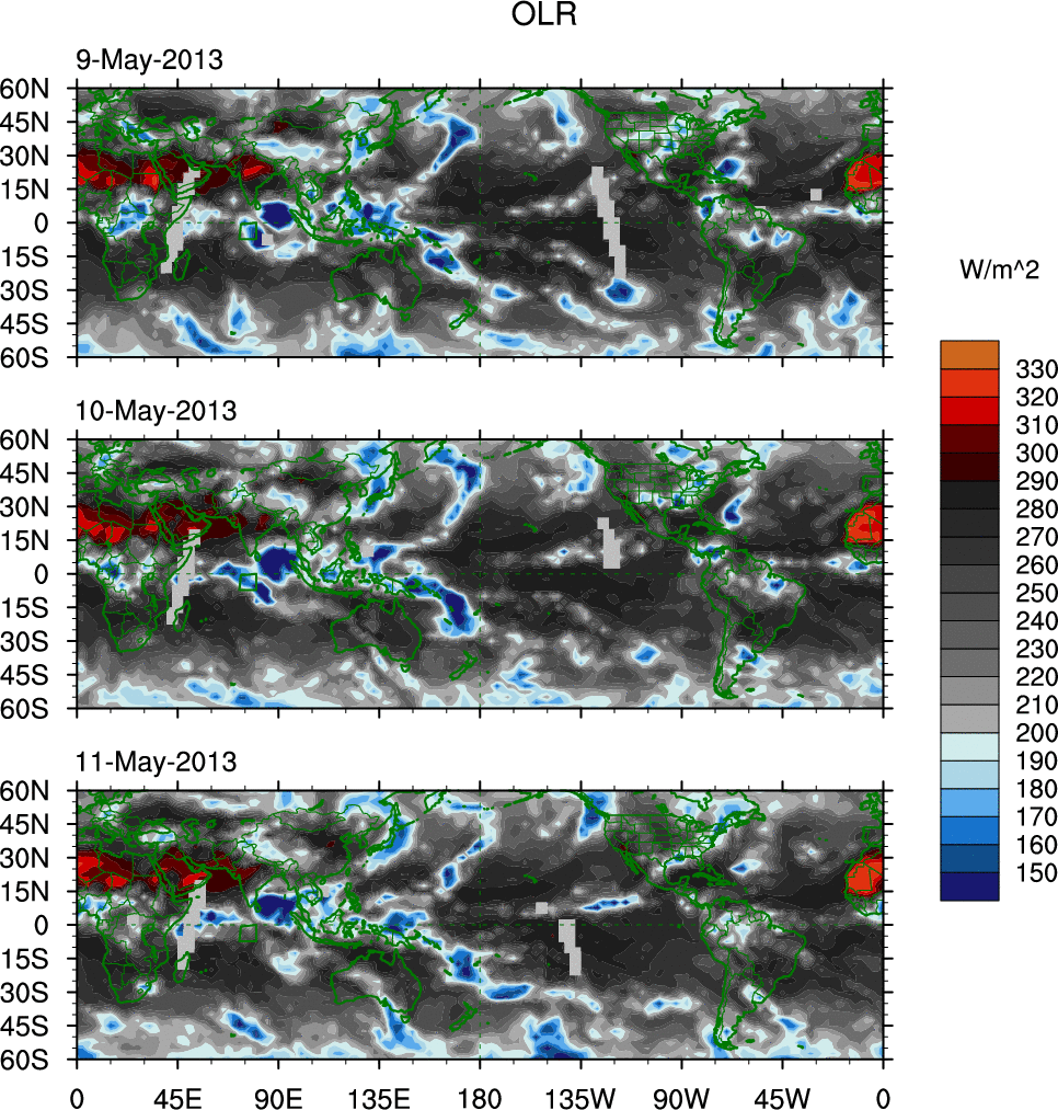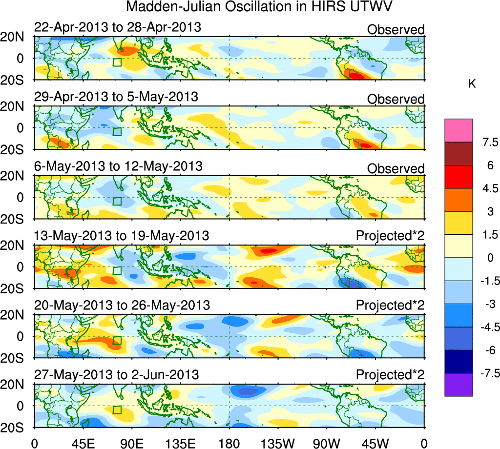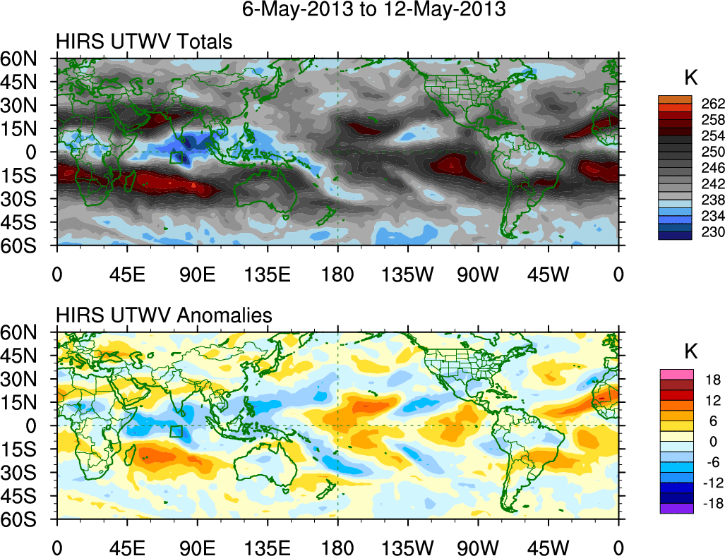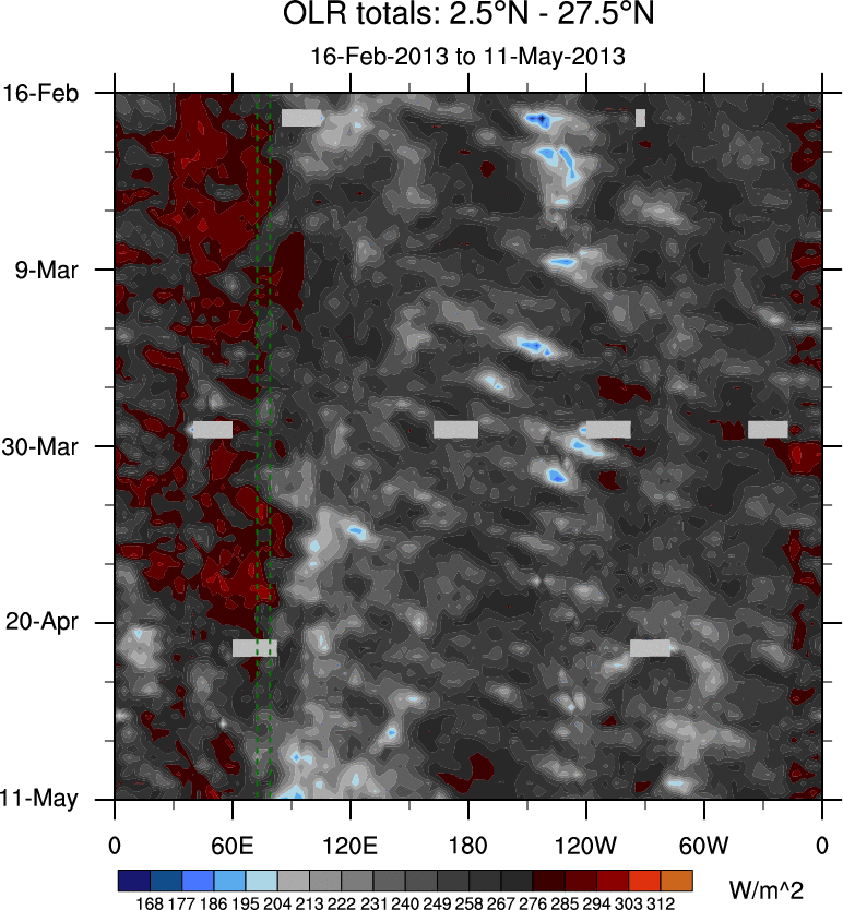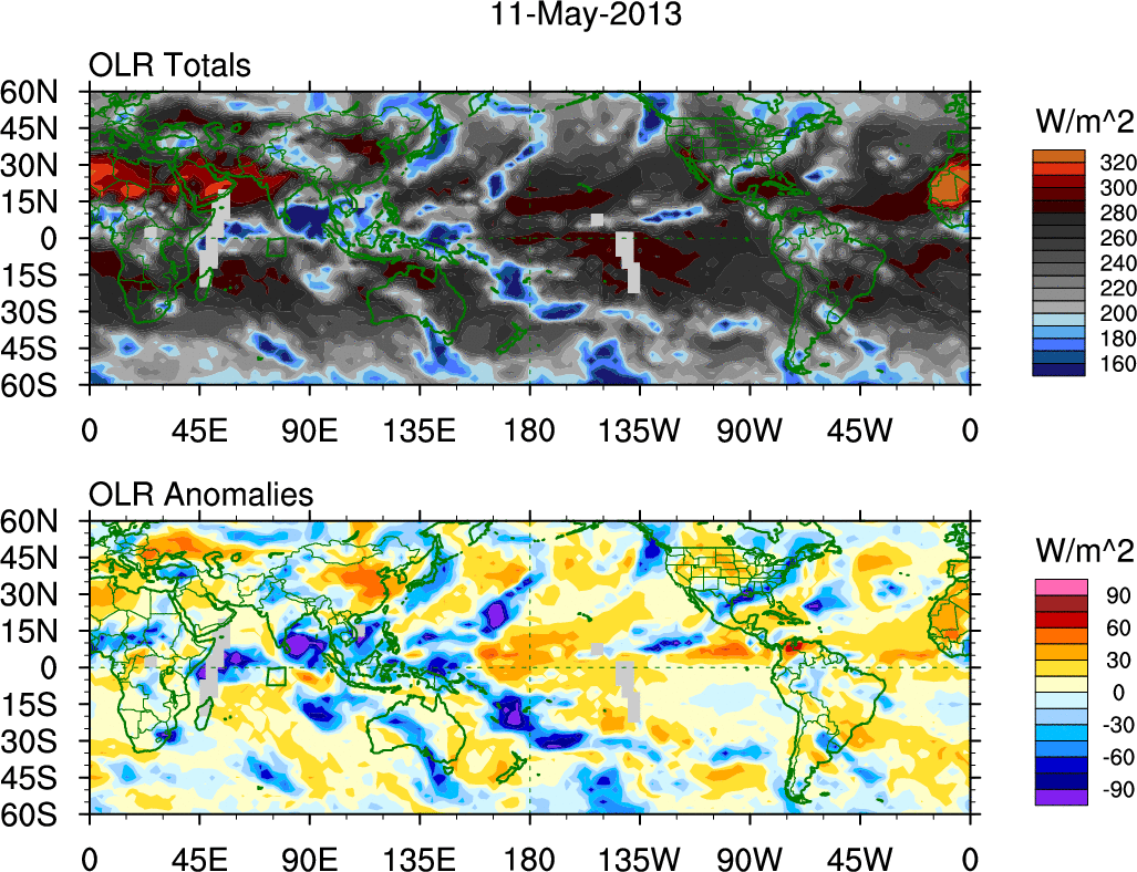 To identify tropical waves in near real-time, the OLR and UTWV data are filtered following Wheeler & Weickmann (2001 MWR). The daily anomalies are calculated using the first 3 harmonics of the seasonal cycle for 1979–2009. Missing values are then filled using linear interpolation in space and time. The most recent 365 days of anomalies are padded with 659 days of zeroes, and the result is filtered for each wave type.