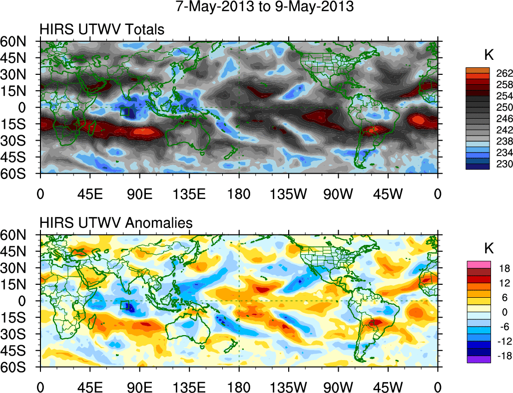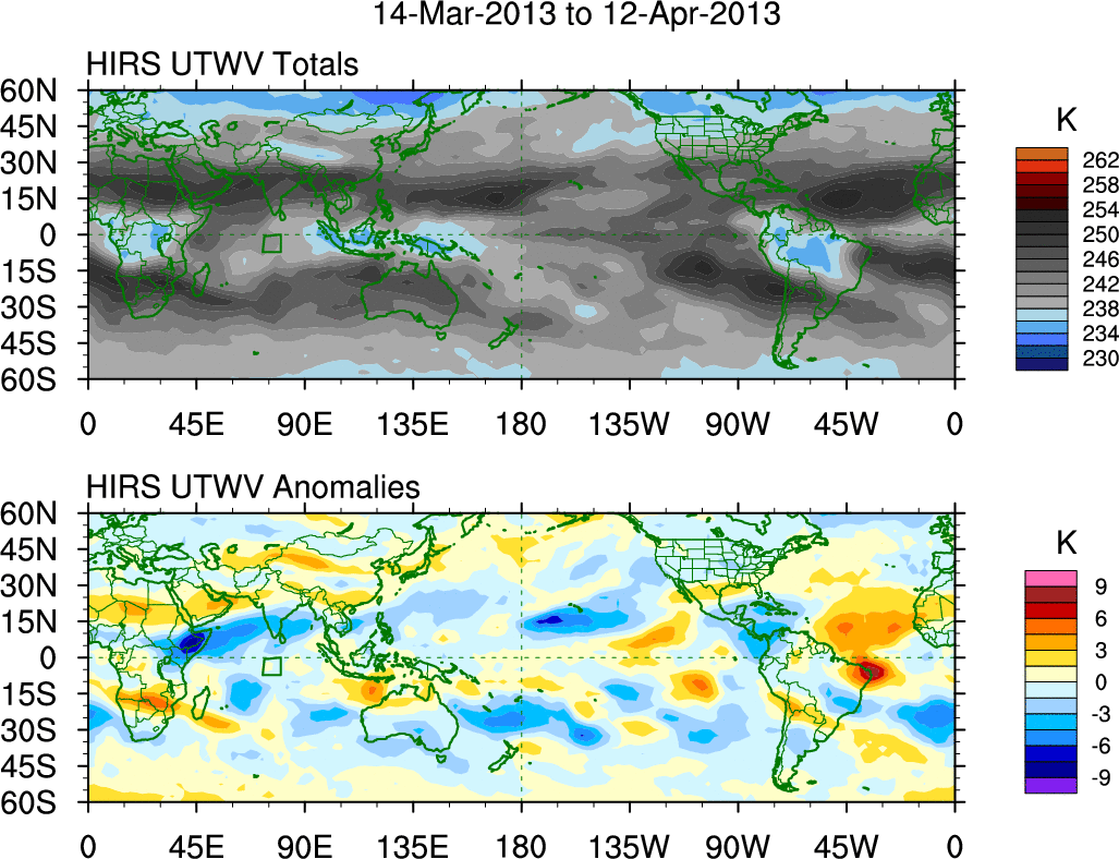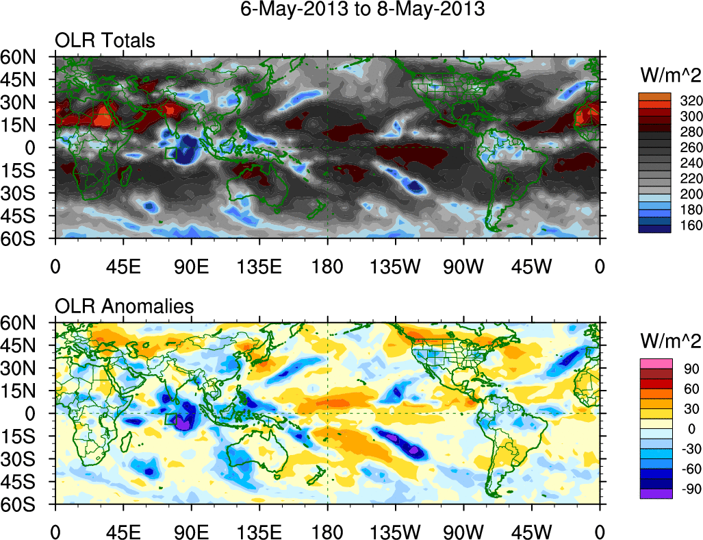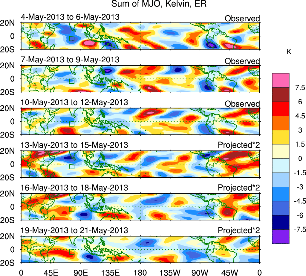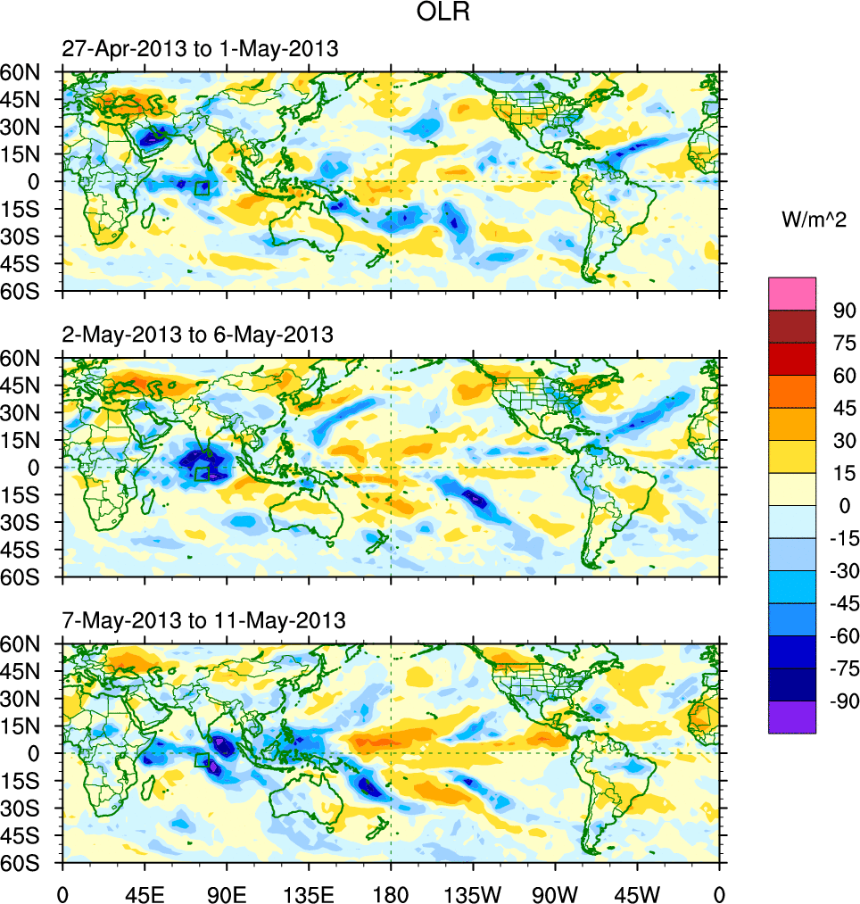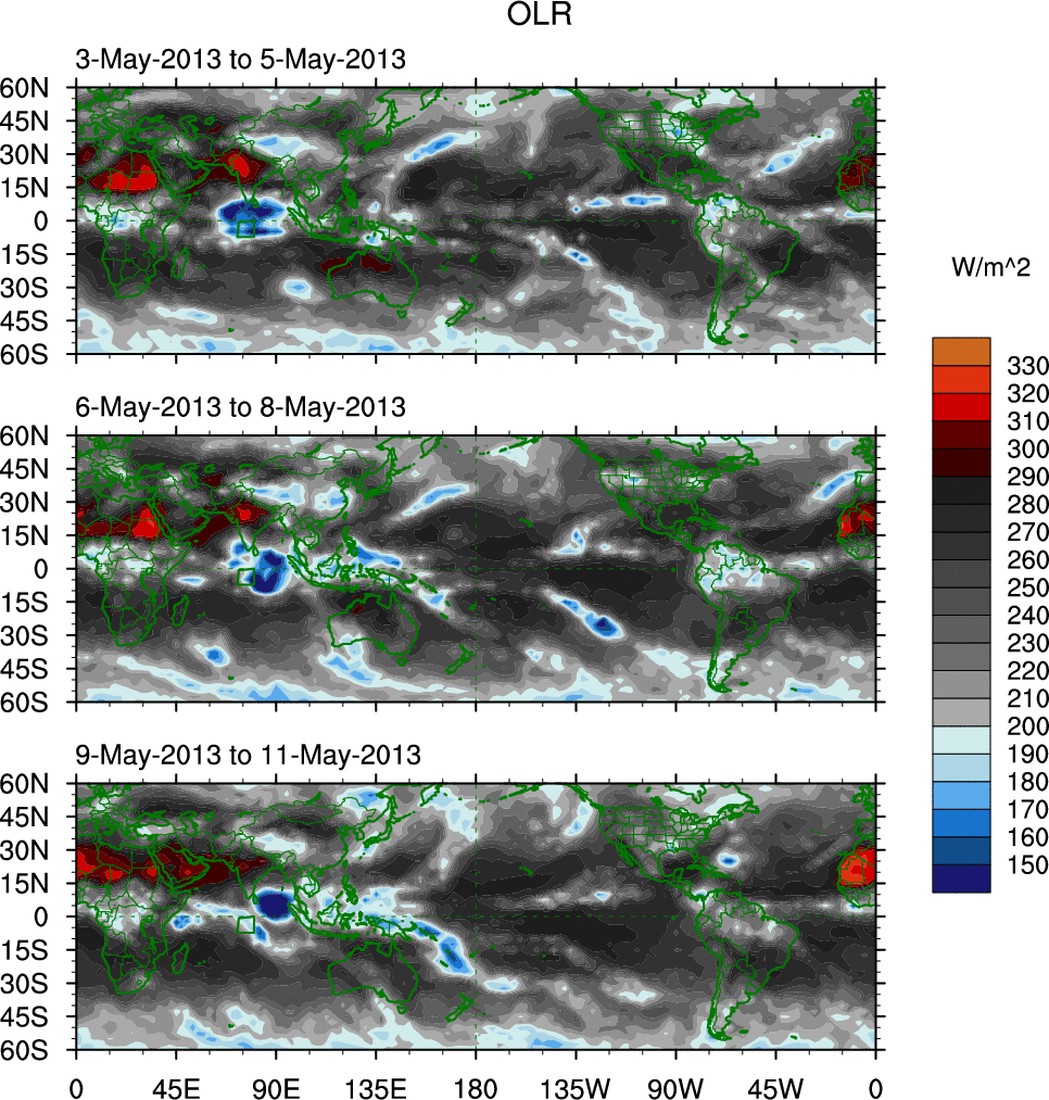 To identify tropical waves in near real-time, the OLR and UTWV data are filtered following Wheeler & Weickmann (2001 MWR). The daily anomalies are calculated using the first 3 harmonics of the seasonal cycle for 1979–2009. Missing values are then filled using linear interpolation in space and time. The most recent 365 days of anomalies are padded with 659 days of zeroes, and the result is filtered for each wave type.