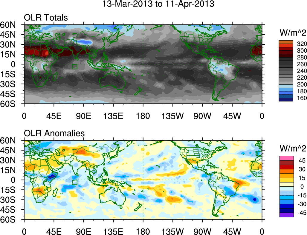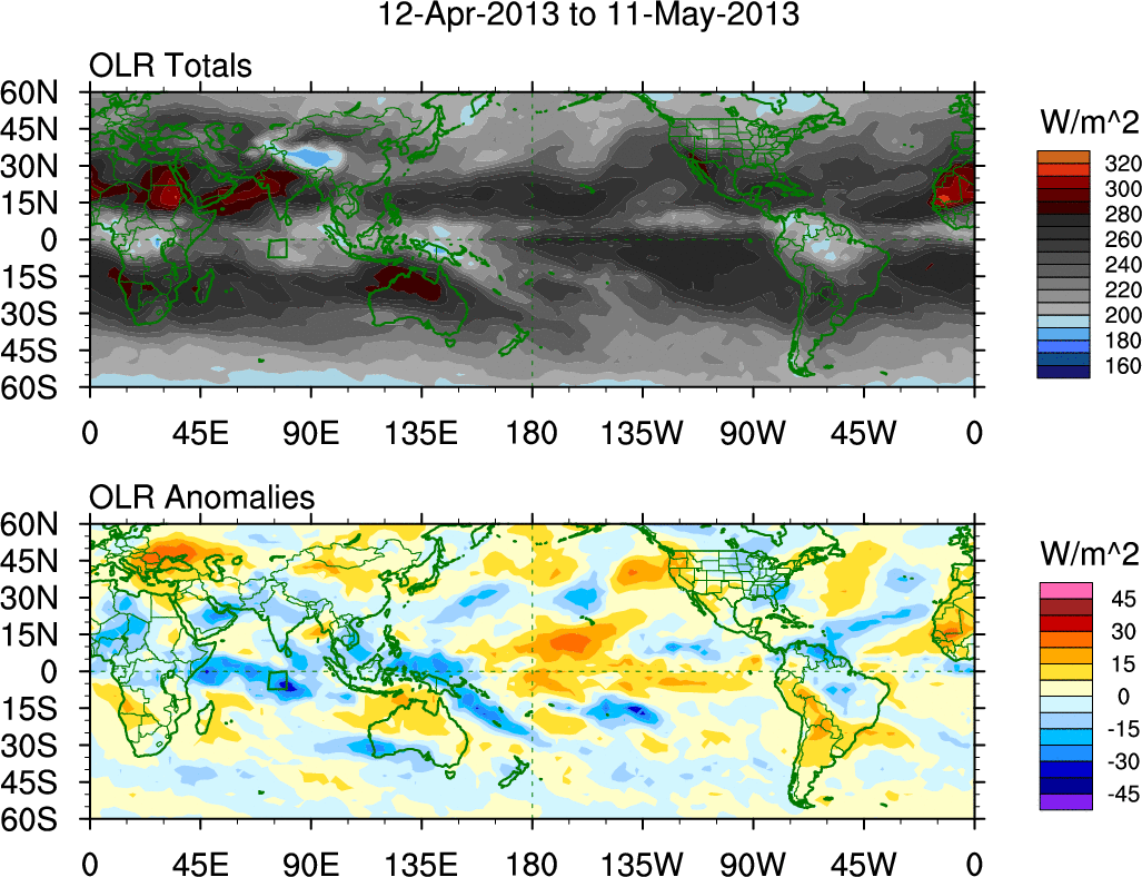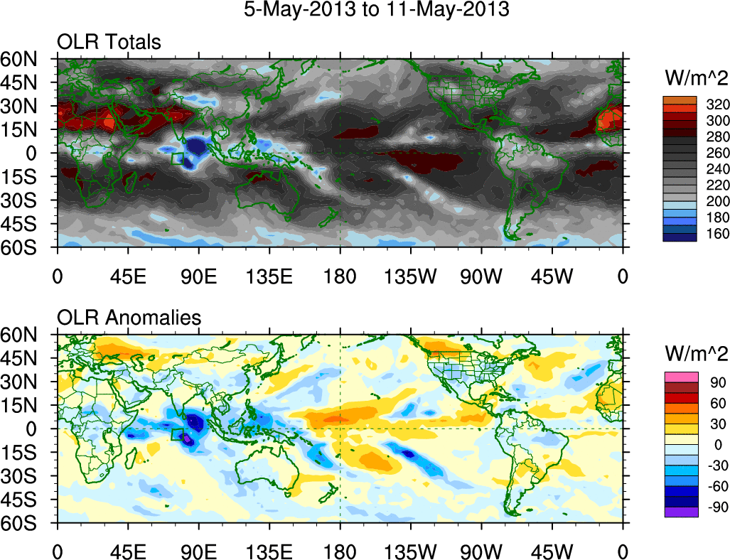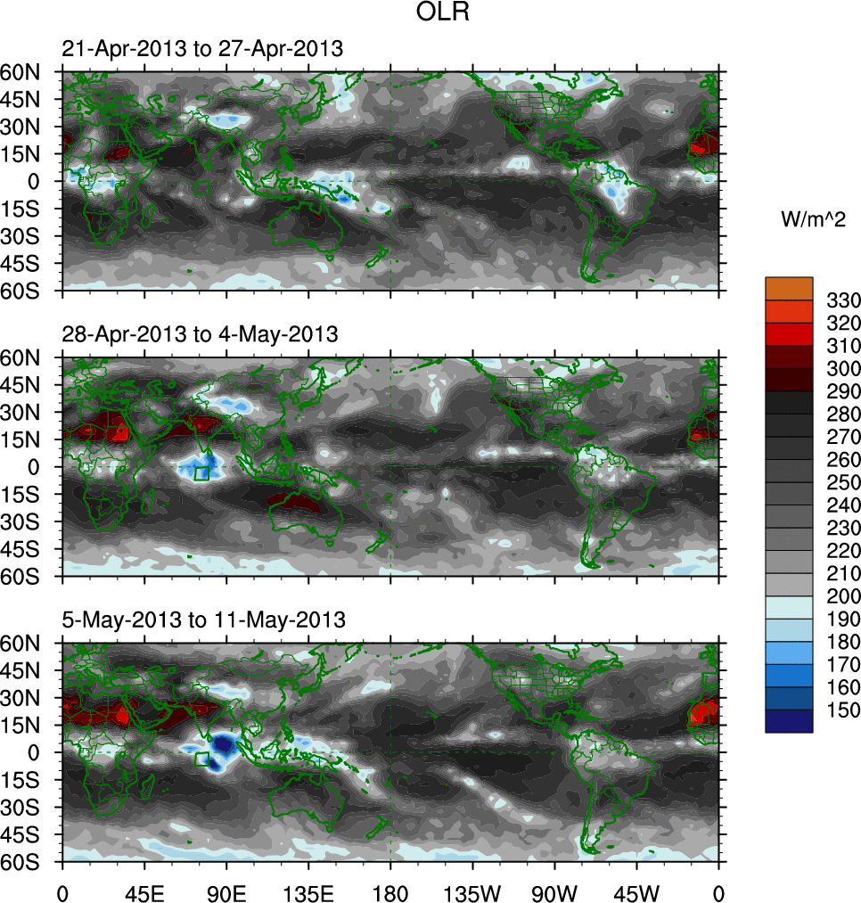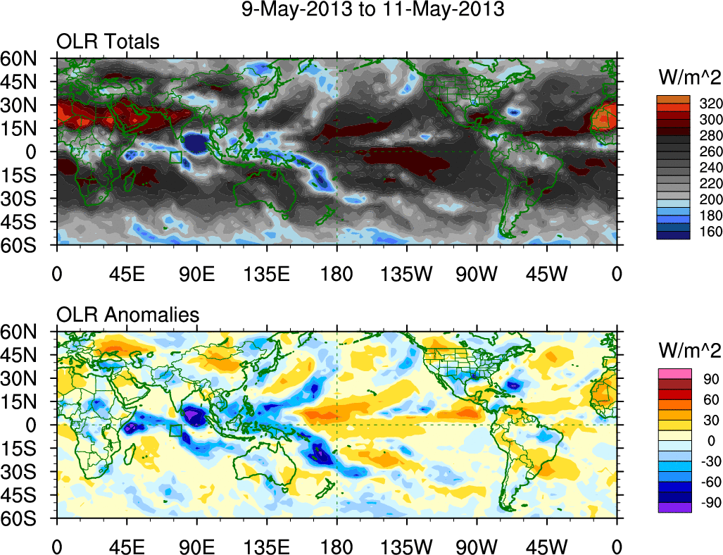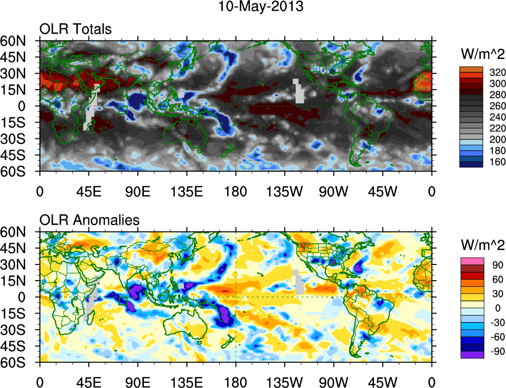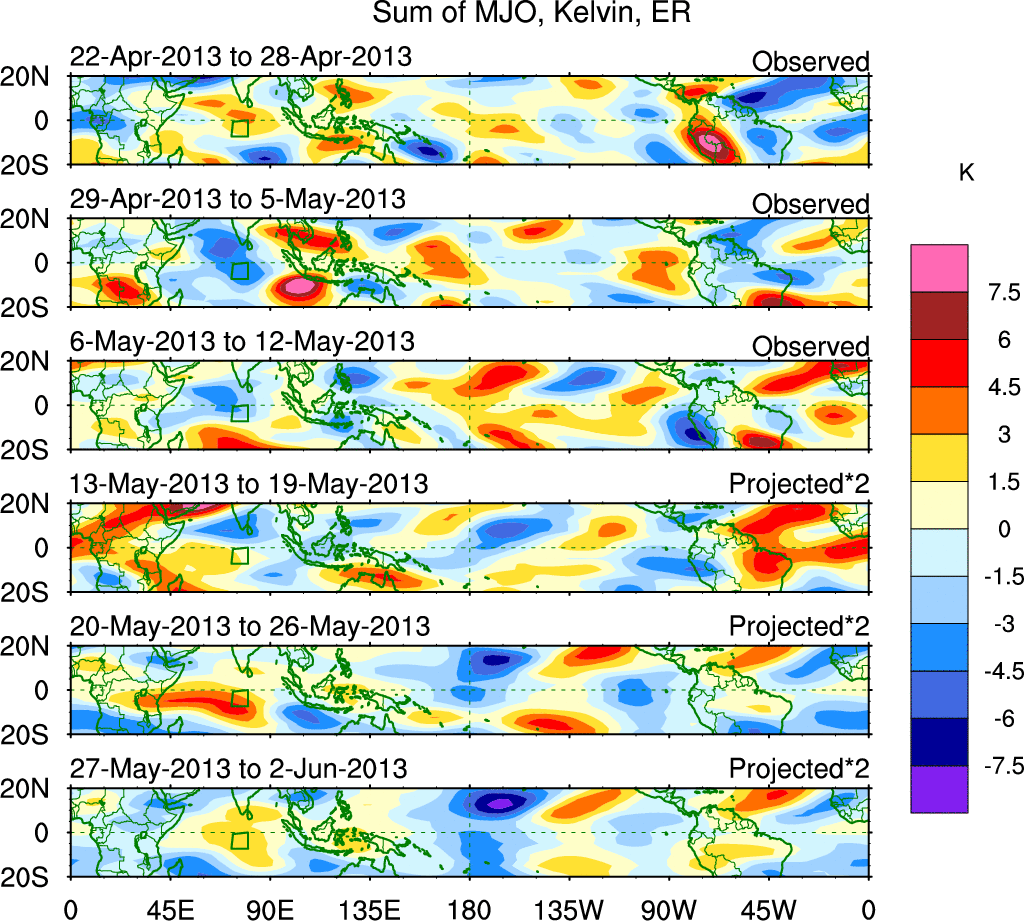 To identify tropical waves in near real-time, the OLR and UTWV data are filtered following Wheeler & Weickmann (2001 MWR). The daily anomalies are calculated using the first 3 harmonics of the seasonal cycle for 1979–2009. Missing values are then filled using linear interpolation in space and time. The most recent 365 days of anomalies are padded with 659 days of zeroes, and the result is filtered for each wave type.
