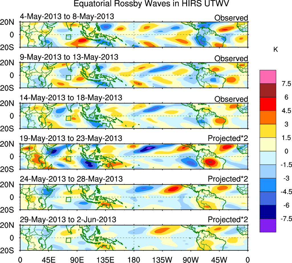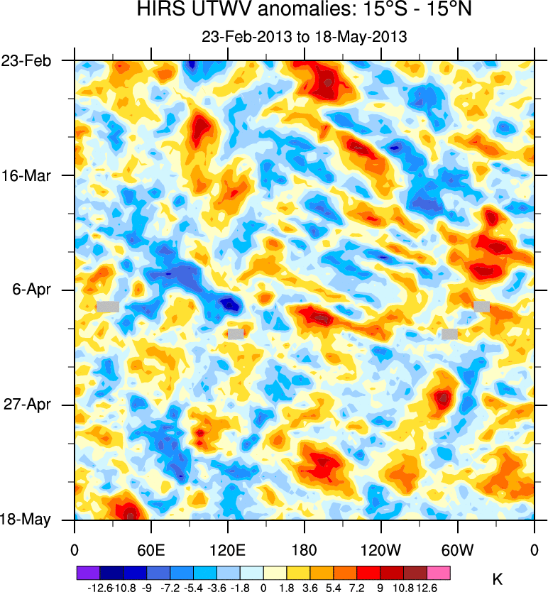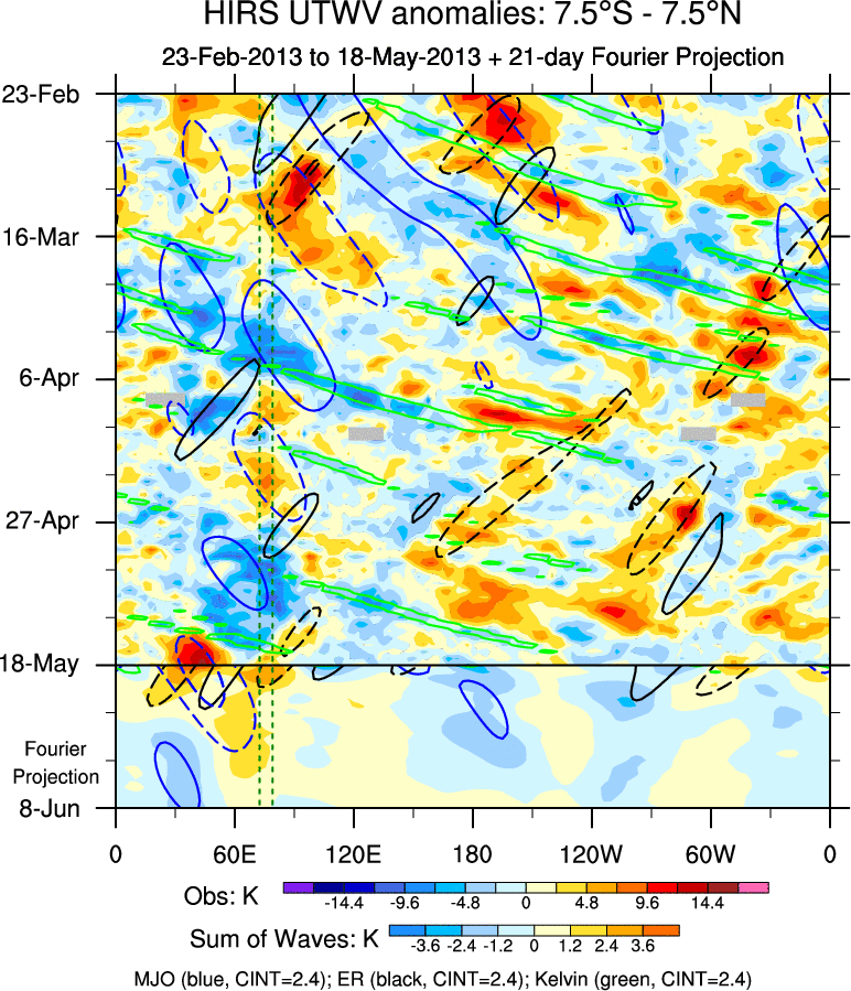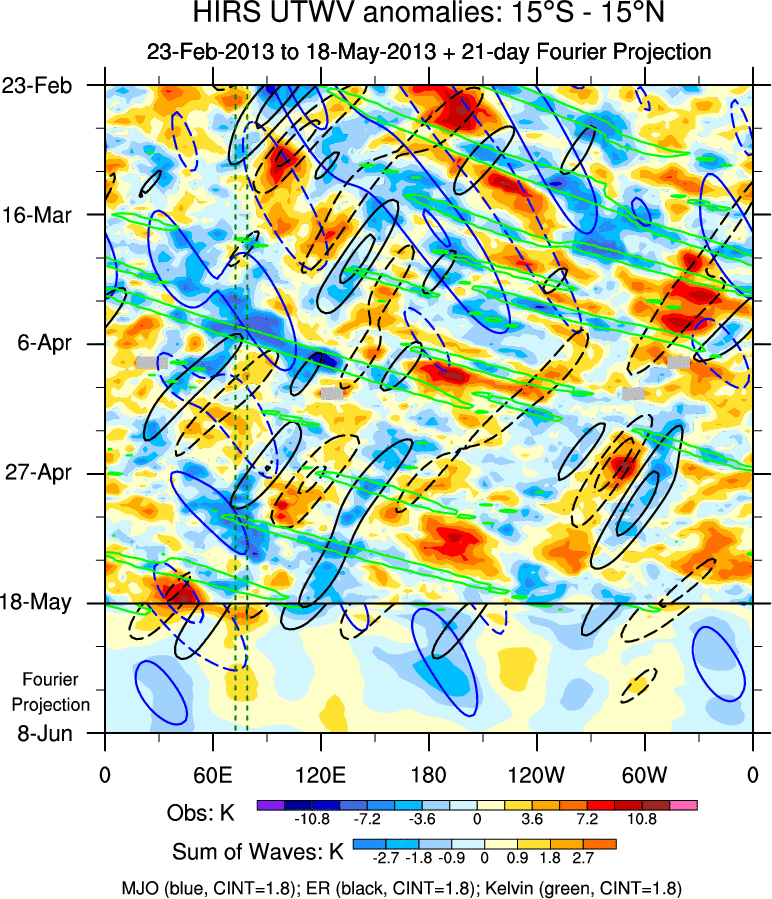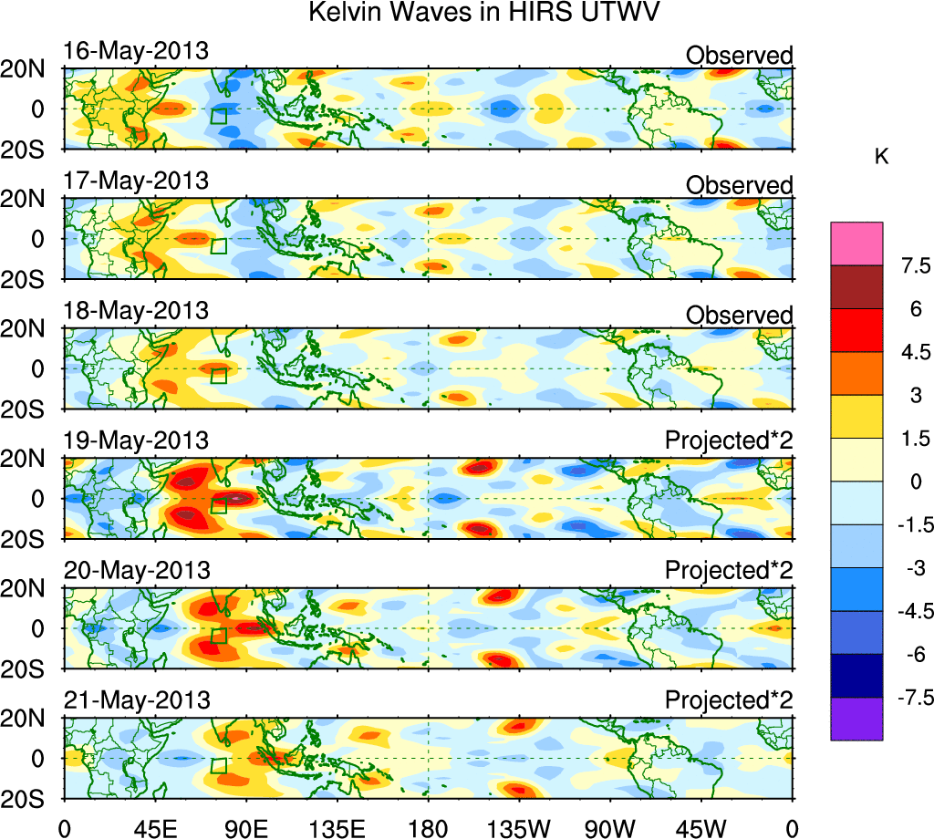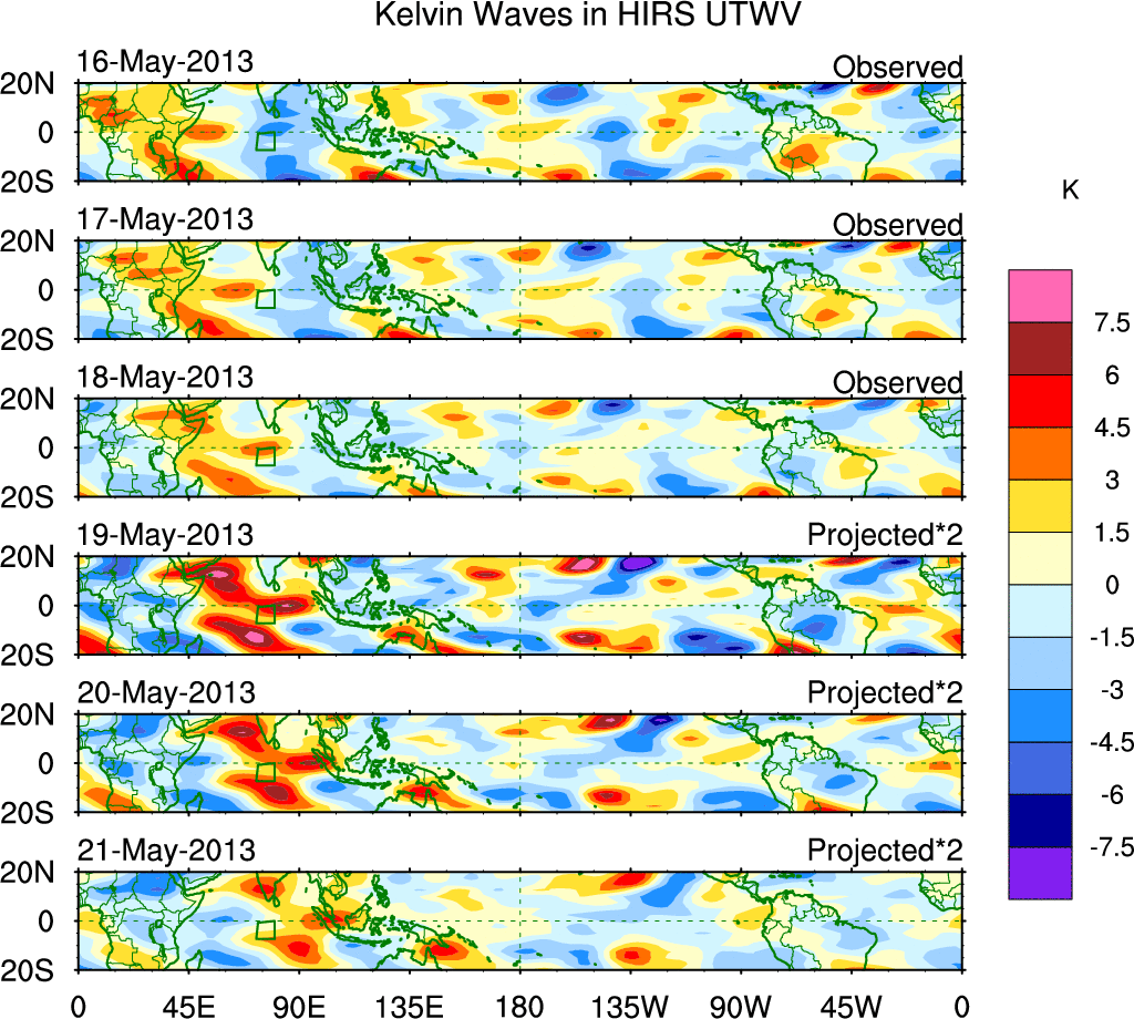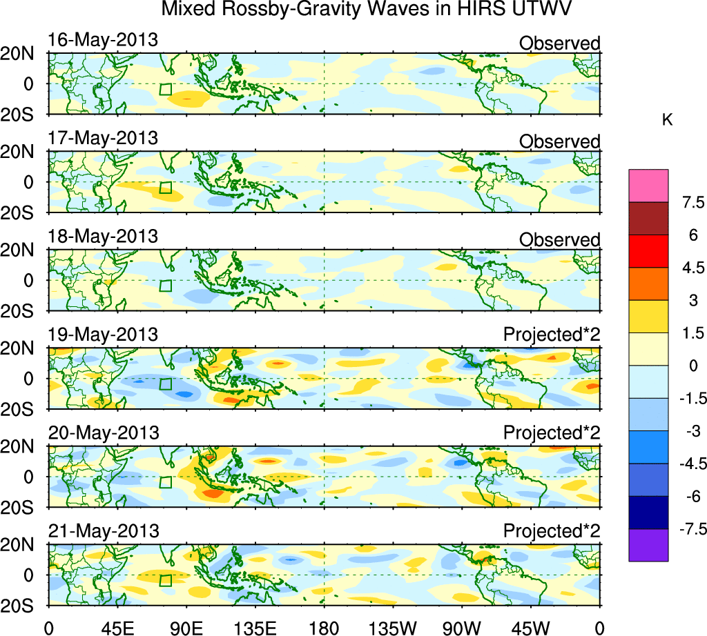 To identify tropical waves in near real-time, the OLR and UTWV data are filtered following Wheeler & Weickmann (2001 MWR). The daily anomalies are calculated using the first 3 harmonics of the seasonal cycle for 1979–2009. Missing values are then filled using linear interpolation in space and time. The most recent 365 days of anomalies are padded with 659 days of zeroes, and the result is filtered for each wave type.