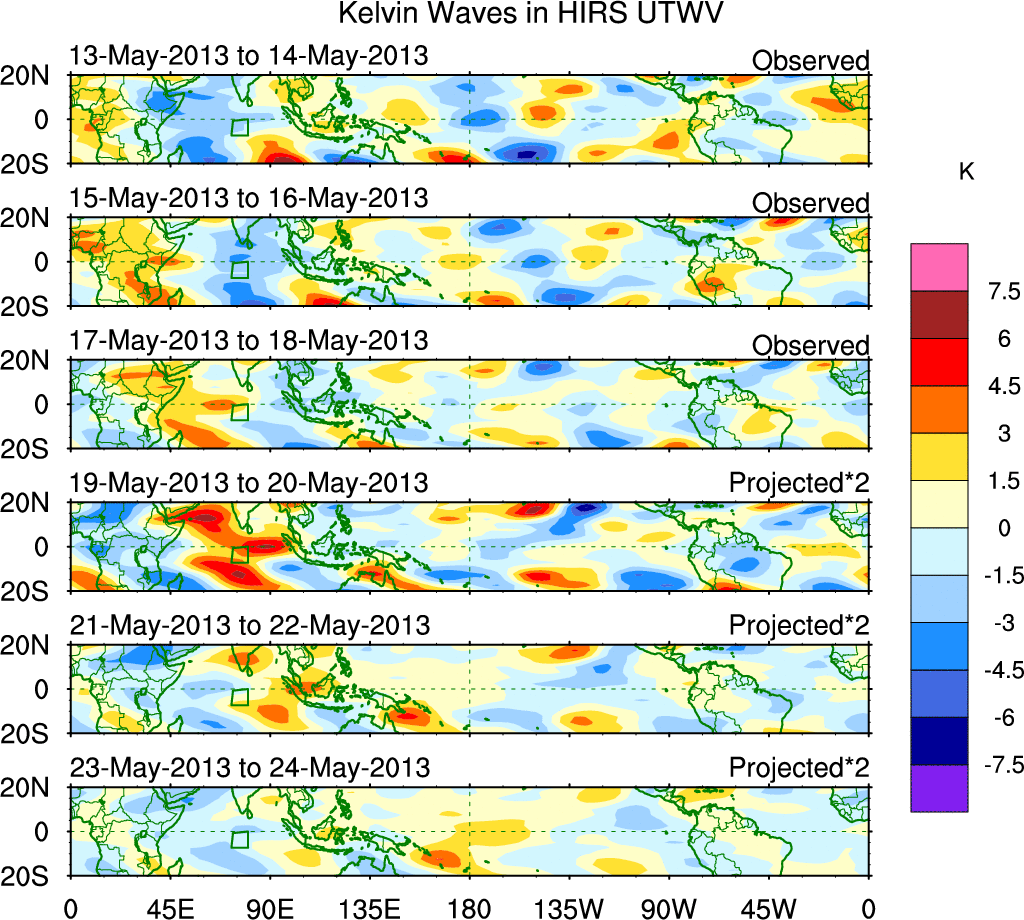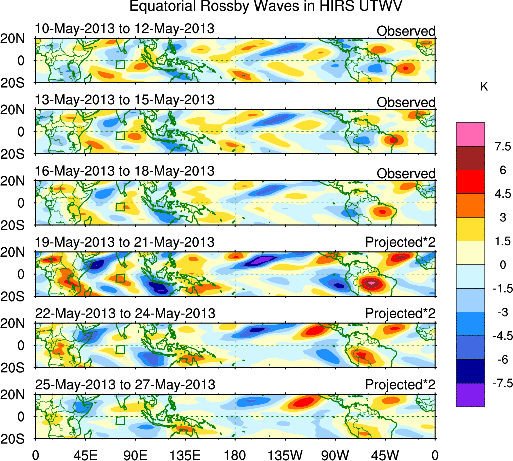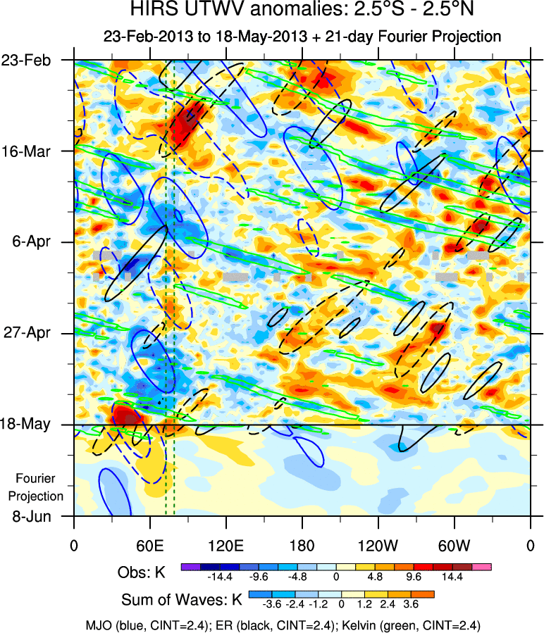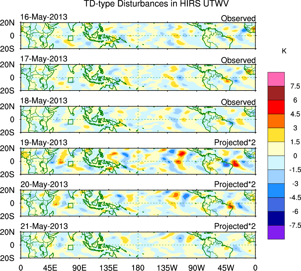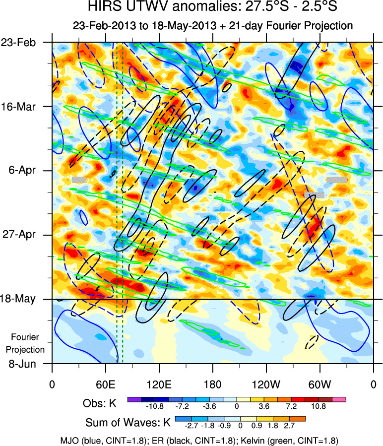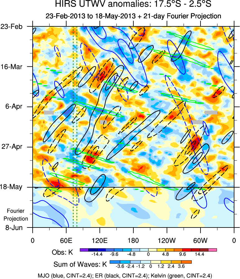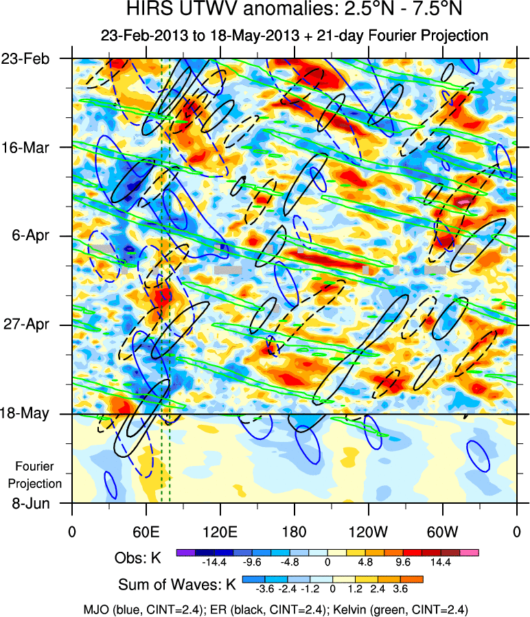 To identify tropical waves in near real-time, the OLR and UTWV data are filtered following Wheeler & Weickmann (2001 MWR). The daily anomalies are calculated using the first 3 harmonics of the seasonal cycle for 1979–2009. Missing values are then filled using linear interpolation in space and time. The most recent 365 days of anomalies are padded with 659 days of zeroes, and the result is filtered for each wave type.