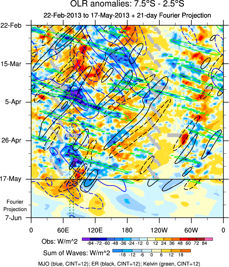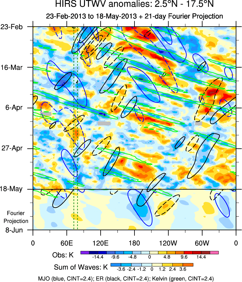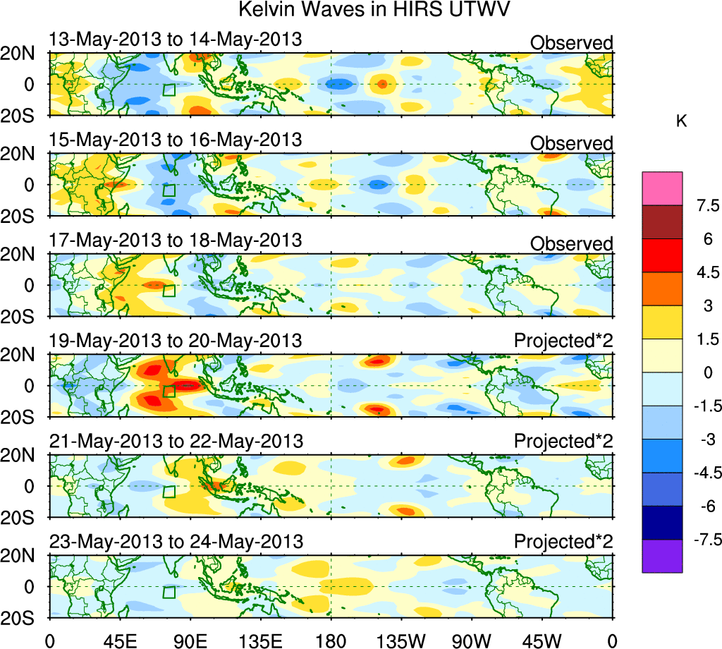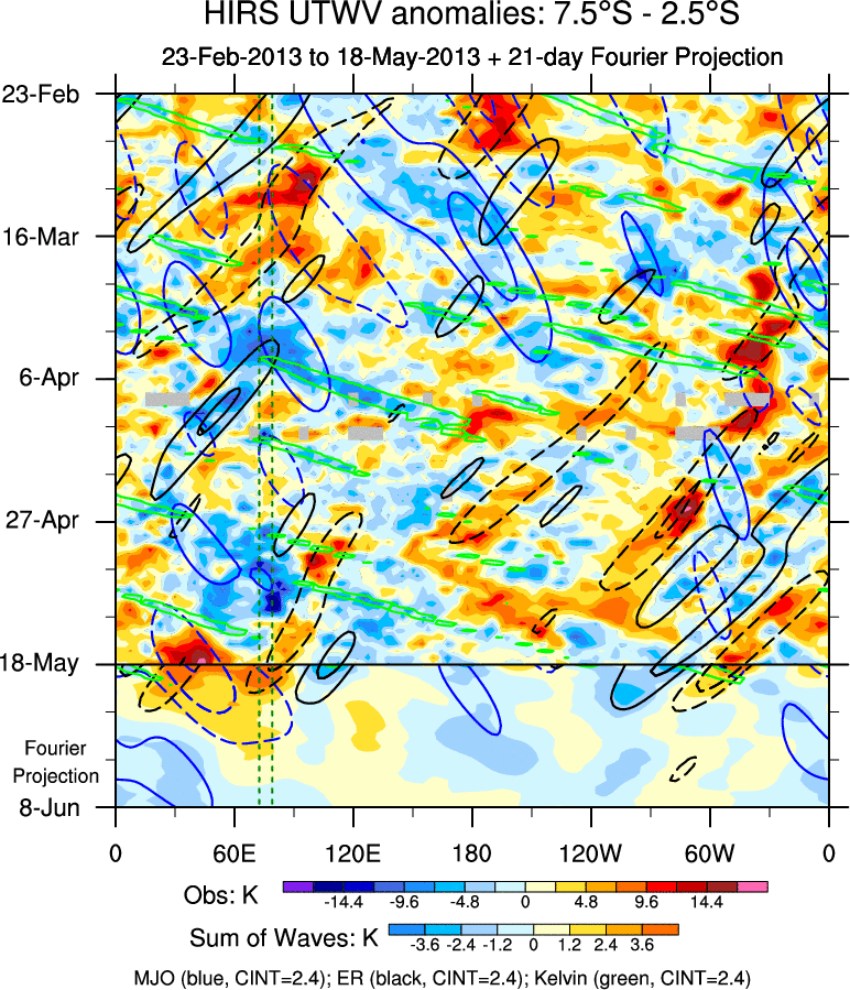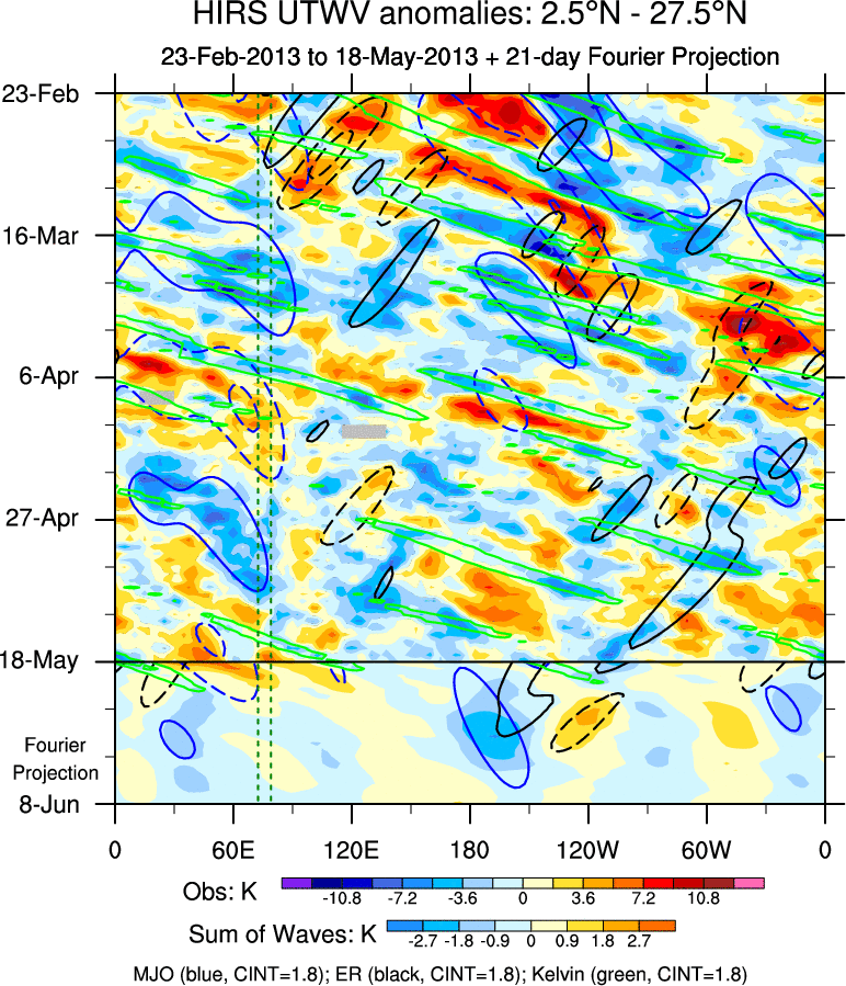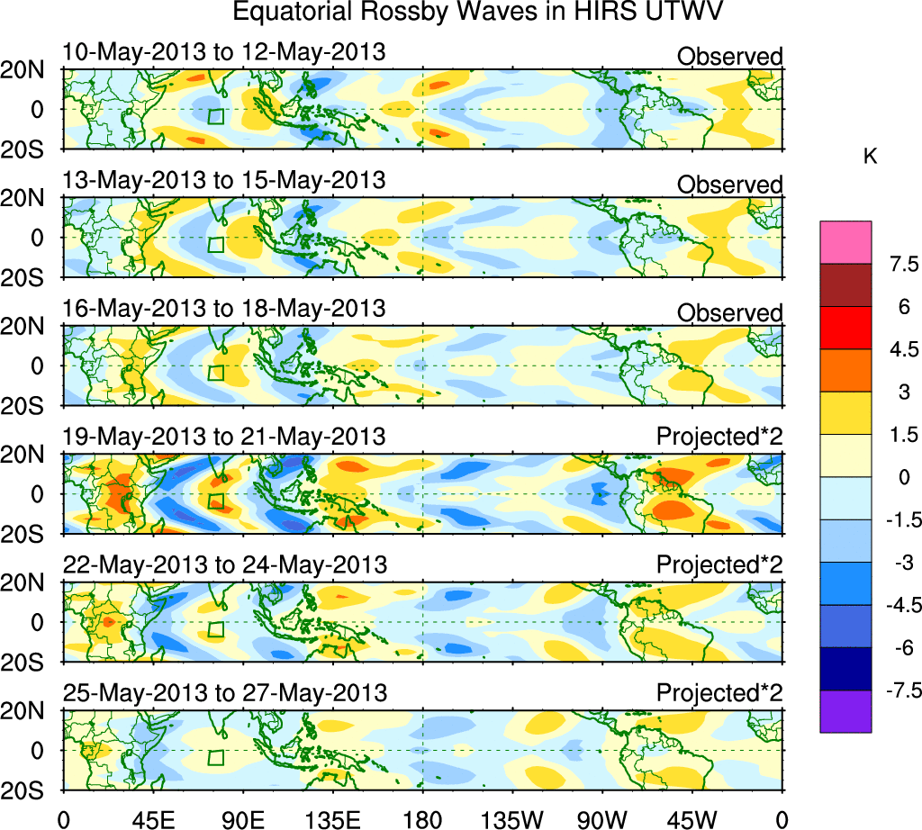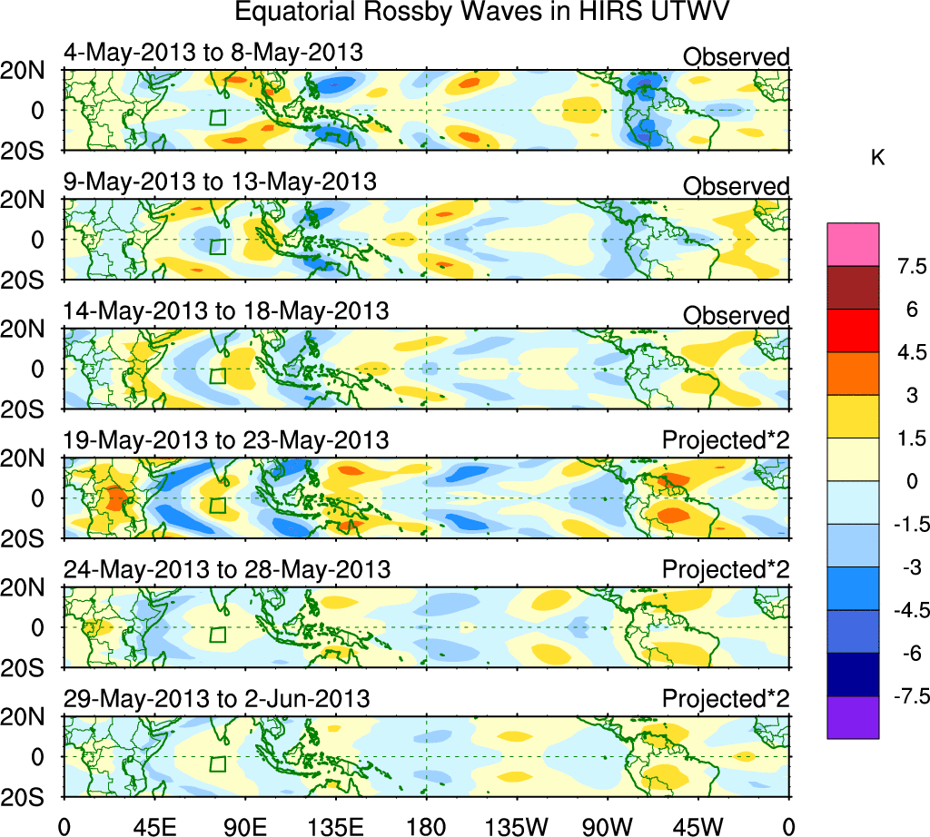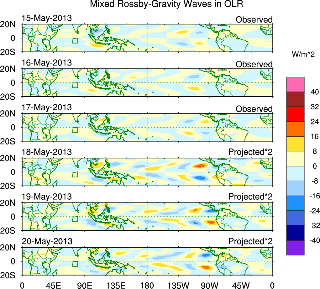 To identify tropical waves in near real-time, the OLR and UTWV data are filtered following Wheeler & Weickmann (2001 MWR). The daily anomalies are calculated using the first 3 harmonics of the seasonal cycle for 1979–2009. Missing values are then filled using linear interpolation in space and time. The most recent 365 days of anomalies are padded with 659 days of zeroes, and the result is filtered for each wave type.