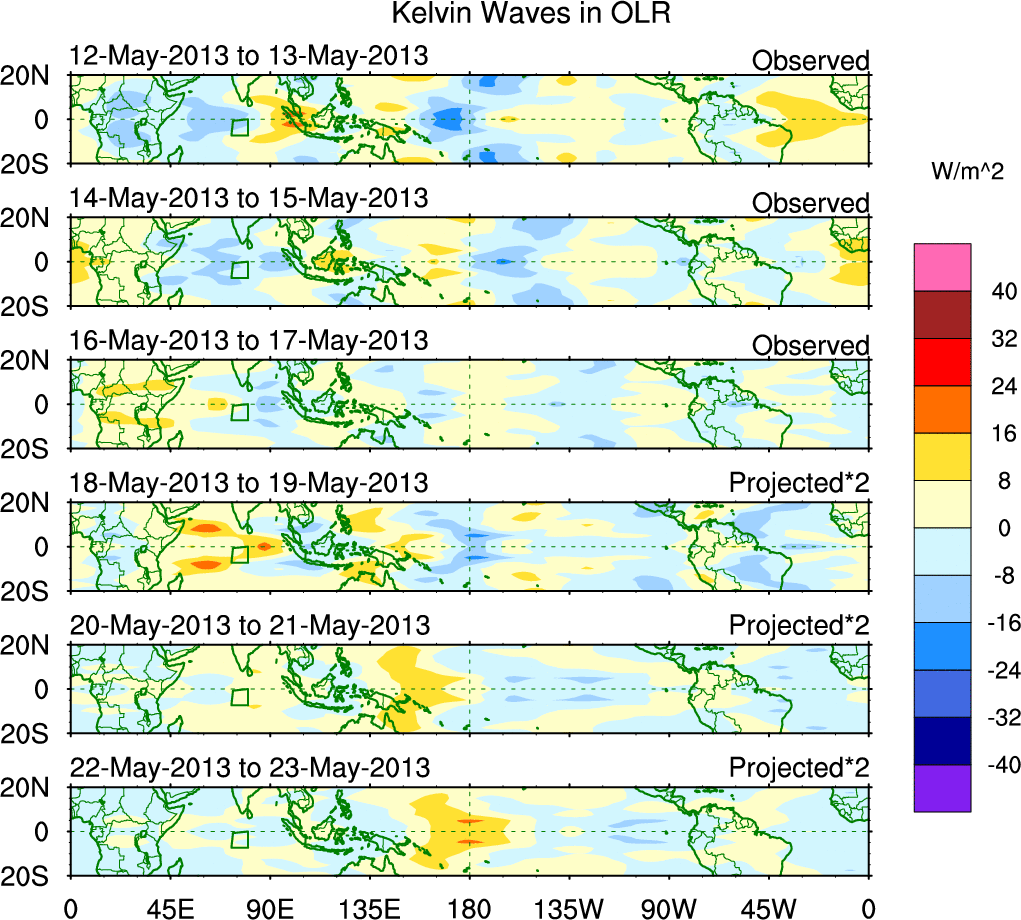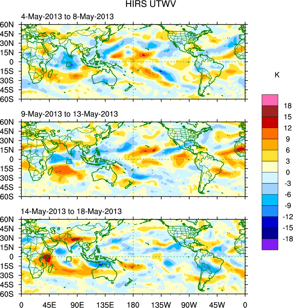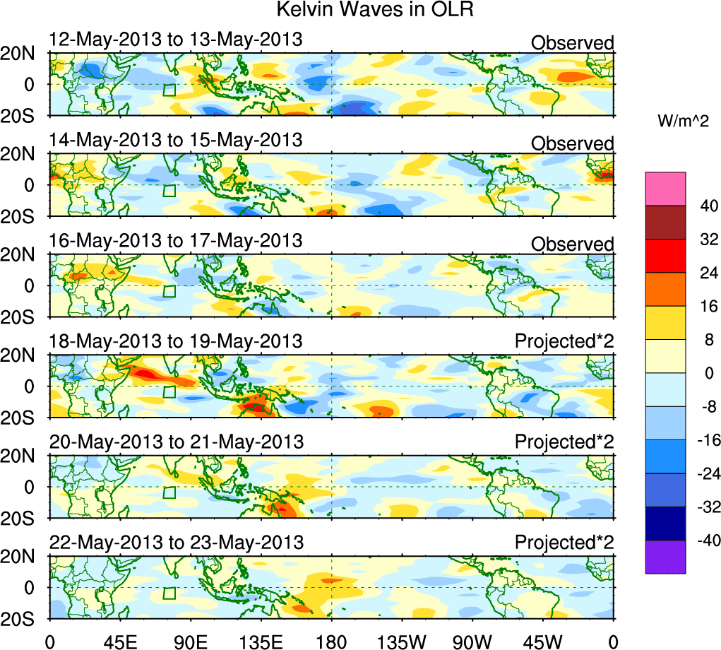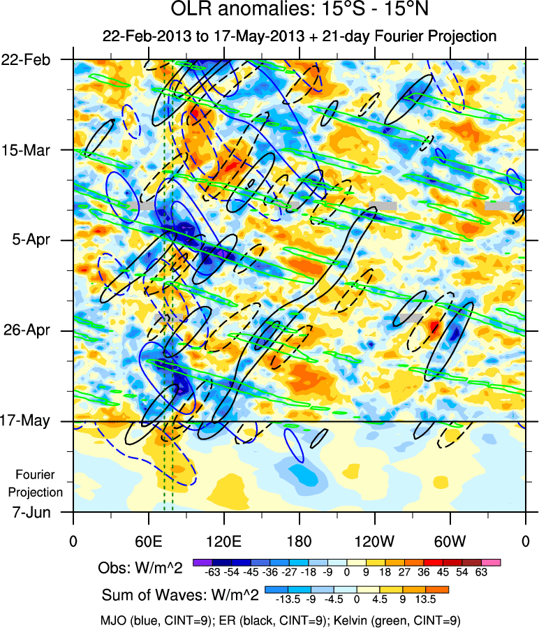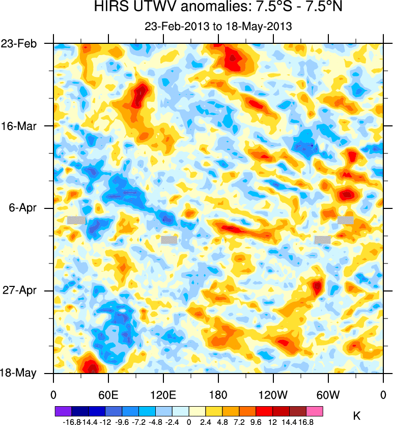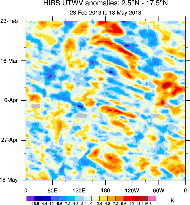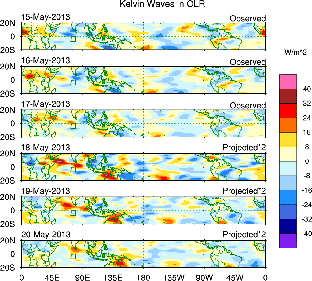 To identify tropical waves in near real-time, the OLR and UTWV data are filtered following Wheeler & Weickmann (2001 MWR). The daily anomalies are calculated using the first 3 harmonics of the seasonal cycle for 1979–2009. Missing values are then filled using linear interpolation in space and time. The most recent 365 days of anomalies are padded with 659 days of zeroes, and the result is filtered for each wave type.
