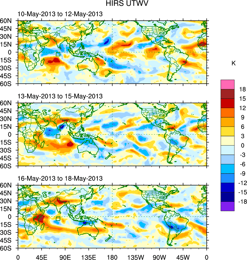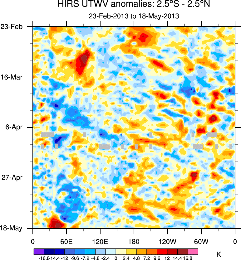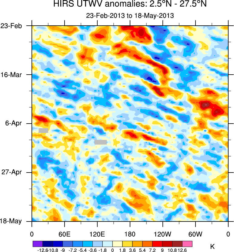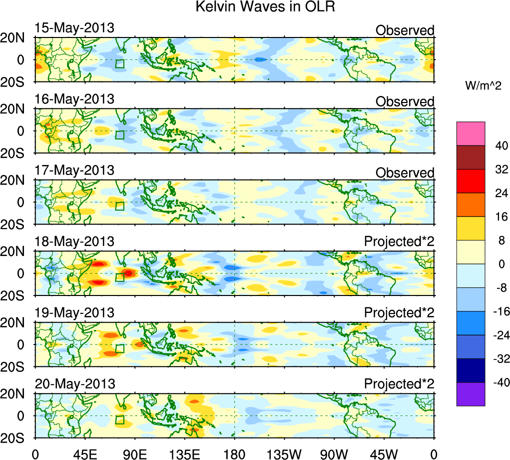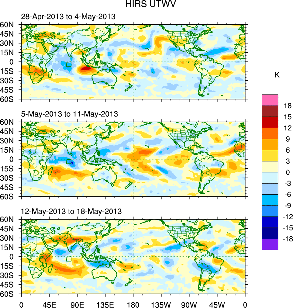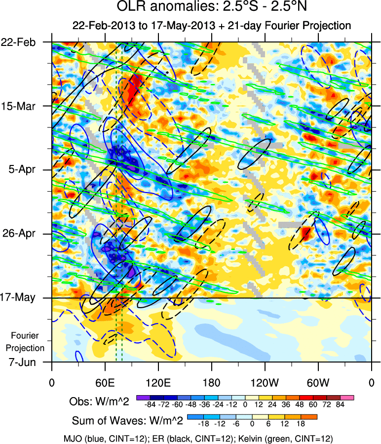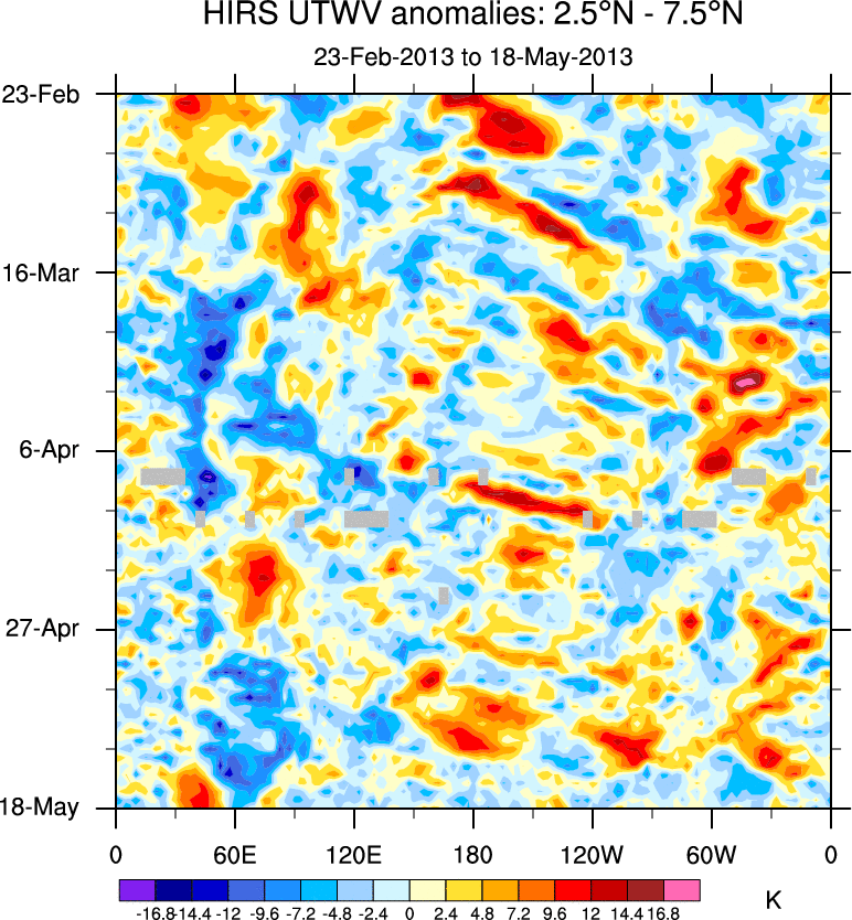 To identify tropical waves in near real-time, the OLR and UTWV data are filtered following Wheeler & Weickmann (2001 MWR). The daily anomalies are calculated using the first 3 harmonics of the seasonal cycle for 1979–2009. Missing values are then filled using linear interpolation in space and time. The most recent 365 days of anomalies are padded with 659 days of zeroes, and the result is filtered for each wave type.