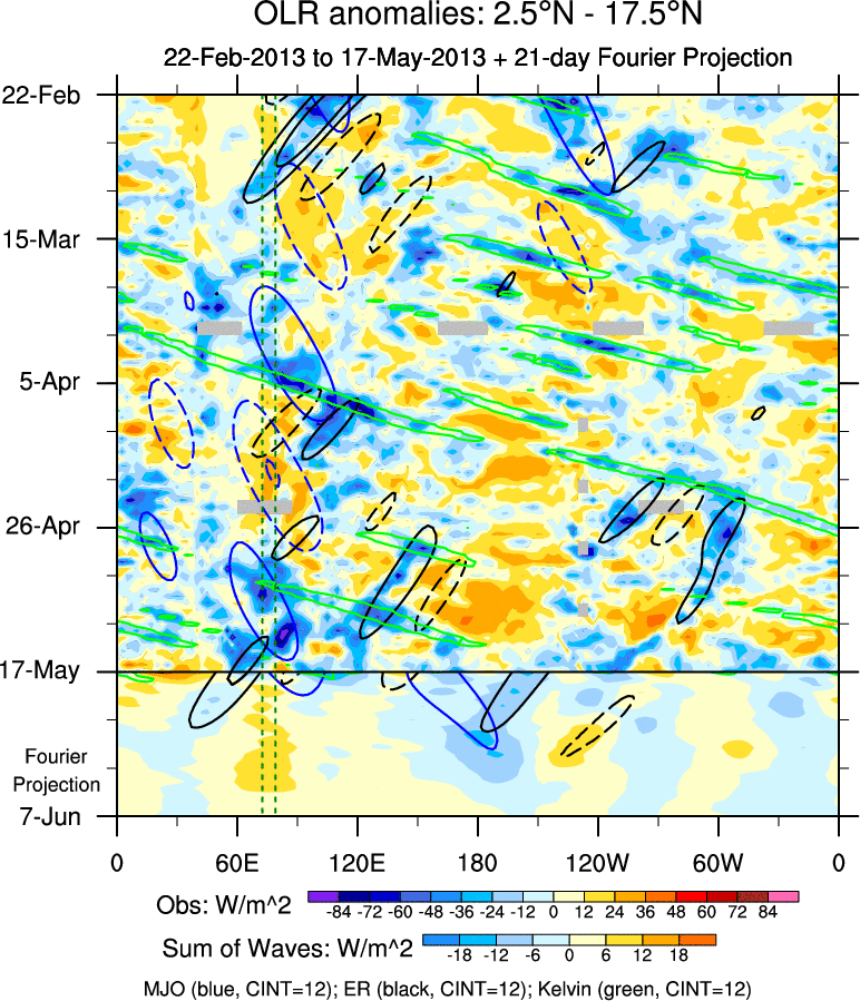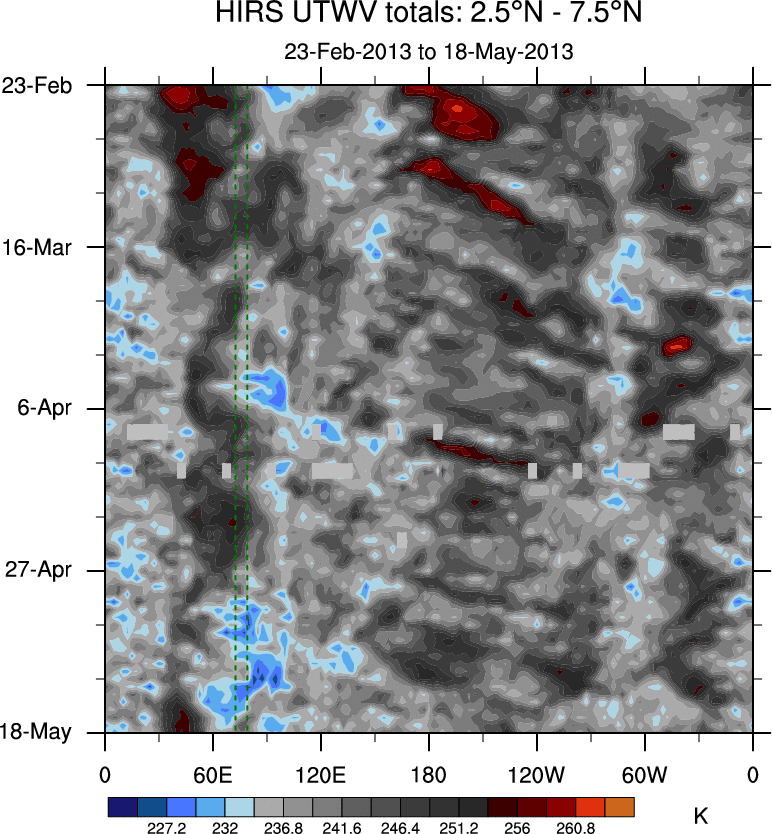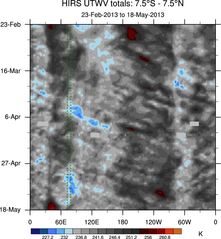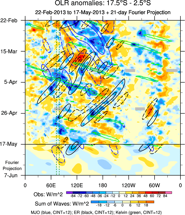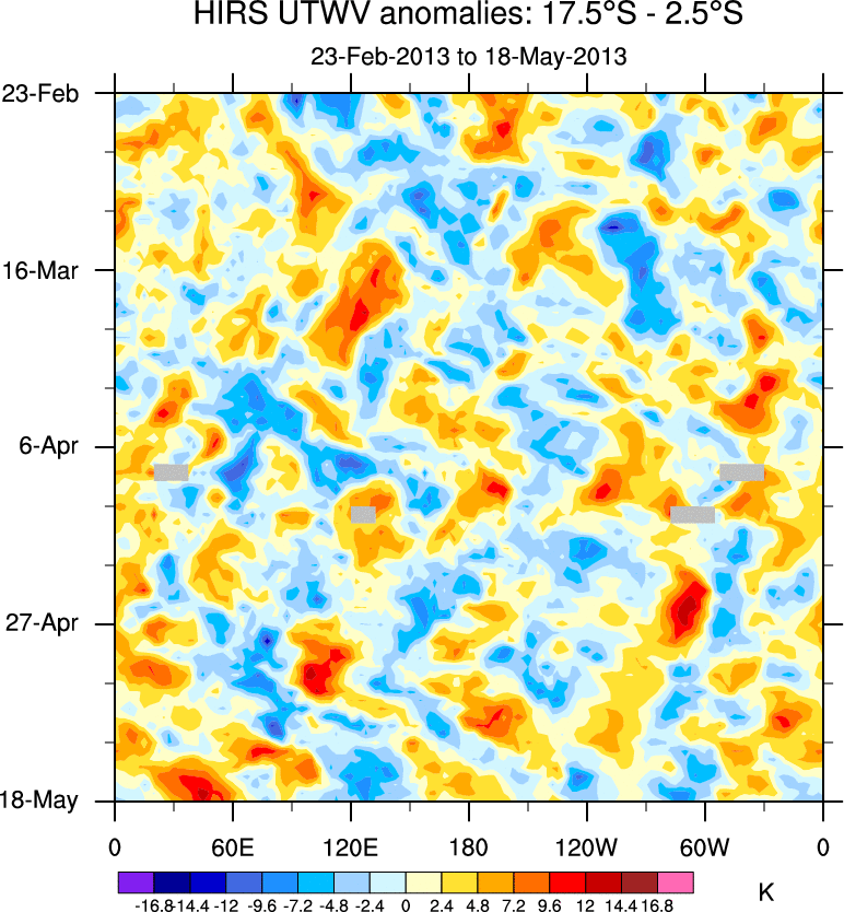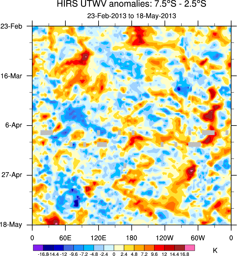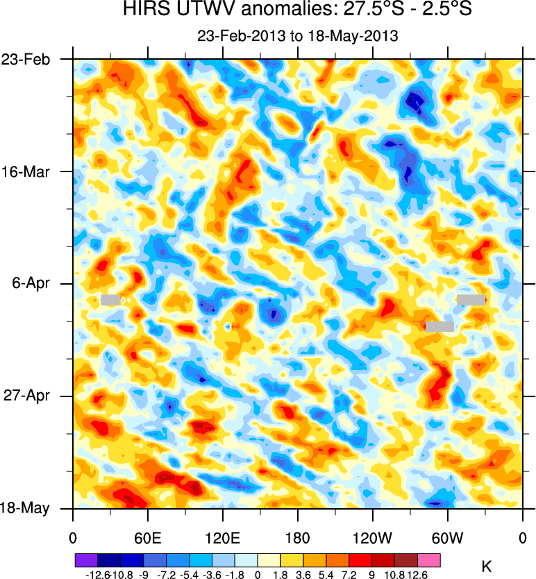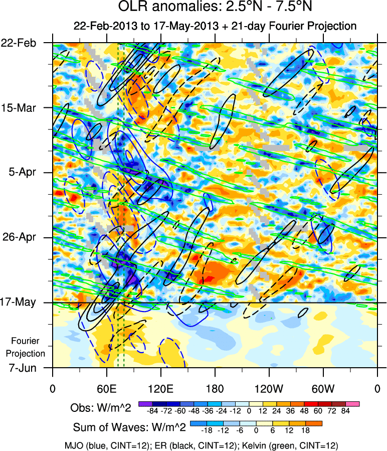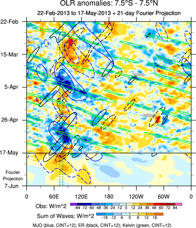 To identify tropical waves in near real-time, the OLR and UTWV data are filtered following Wheeler & Weickmann (2001 MWR). The daily anomalies are calculated using the first 3 harmonics of the seasonal cycle for 1979–2009. Missing values are then filled using linear interpolation in space and time. The most recent 365 days of anomalies are padded with 659 days of zeroes, and the result is filtered for each wave type.