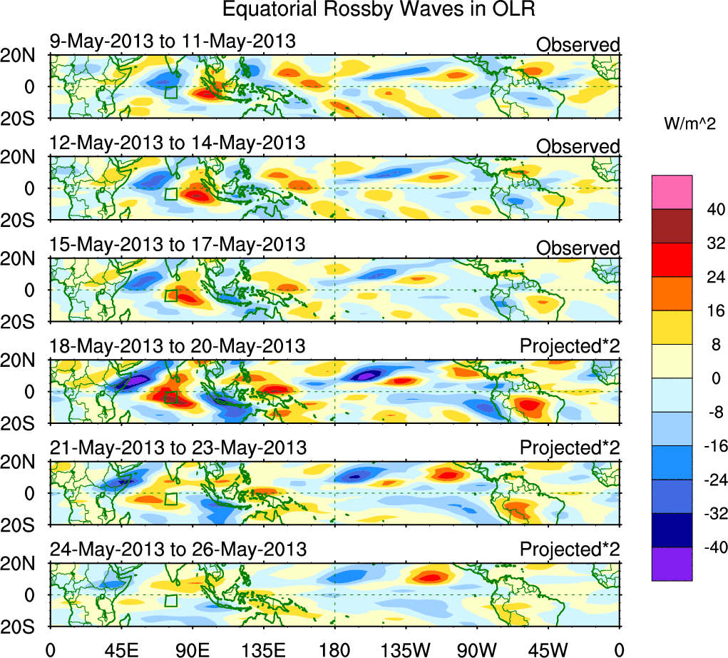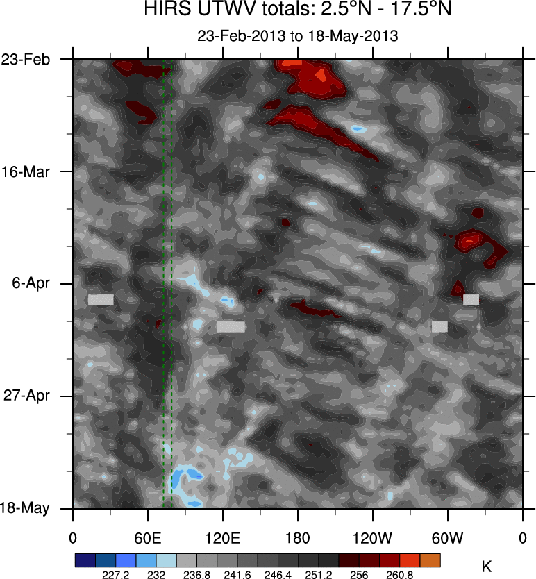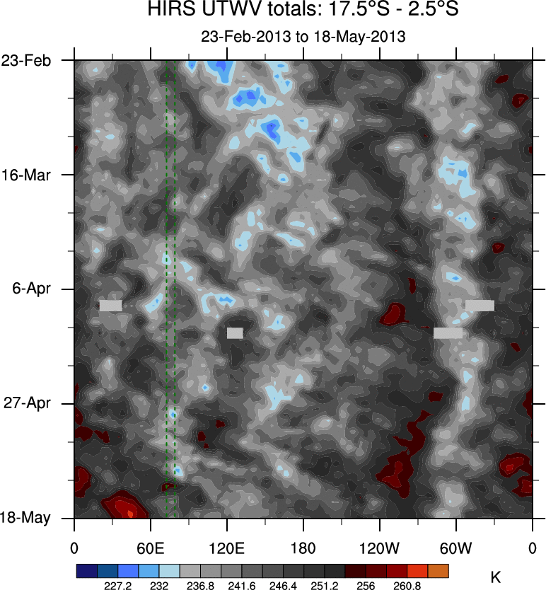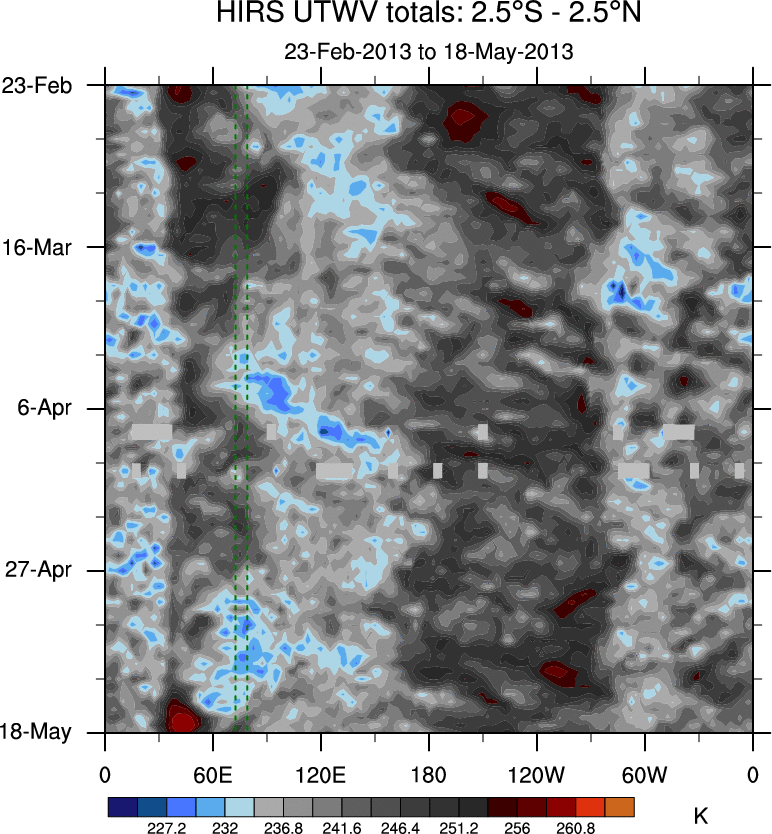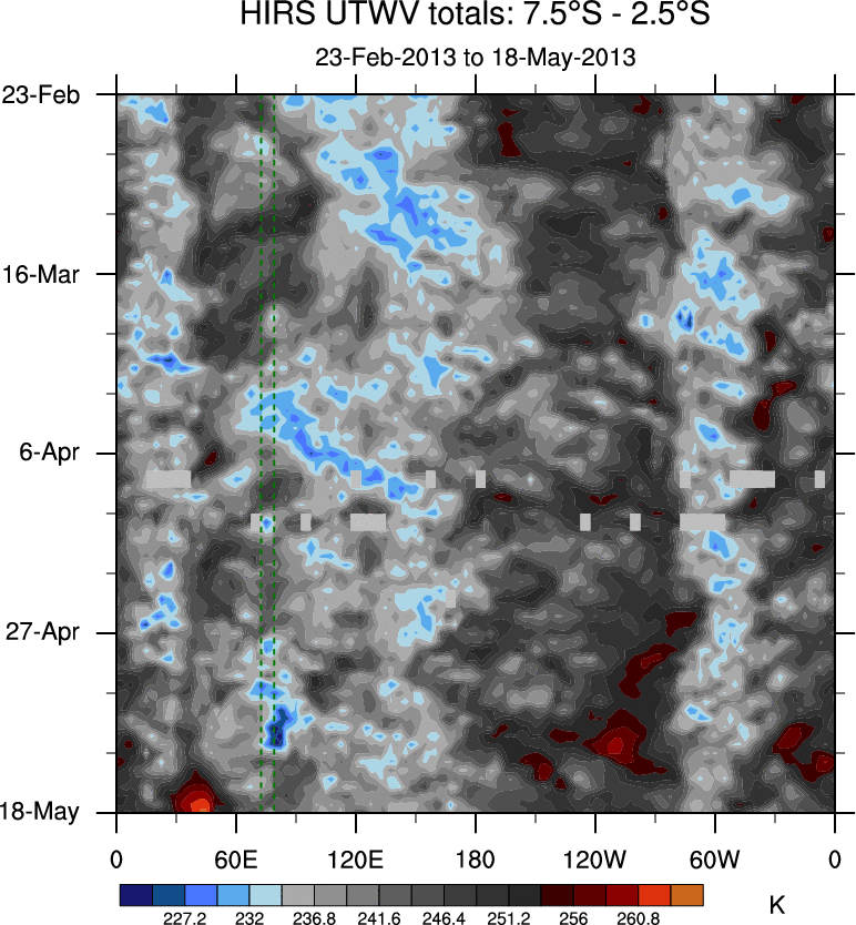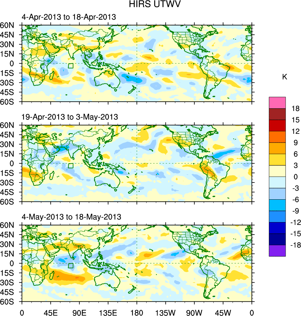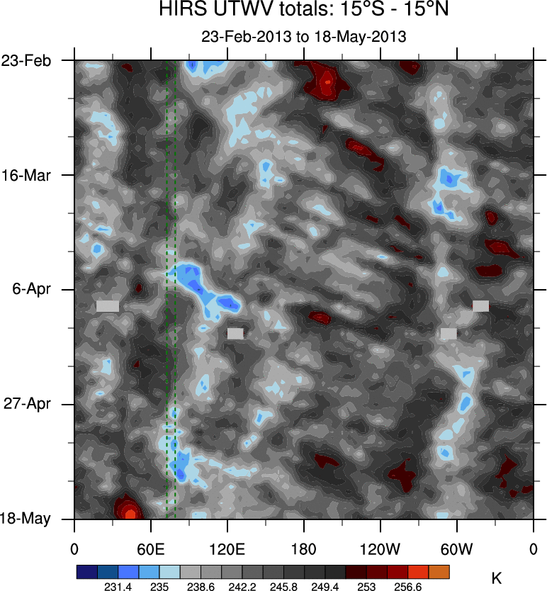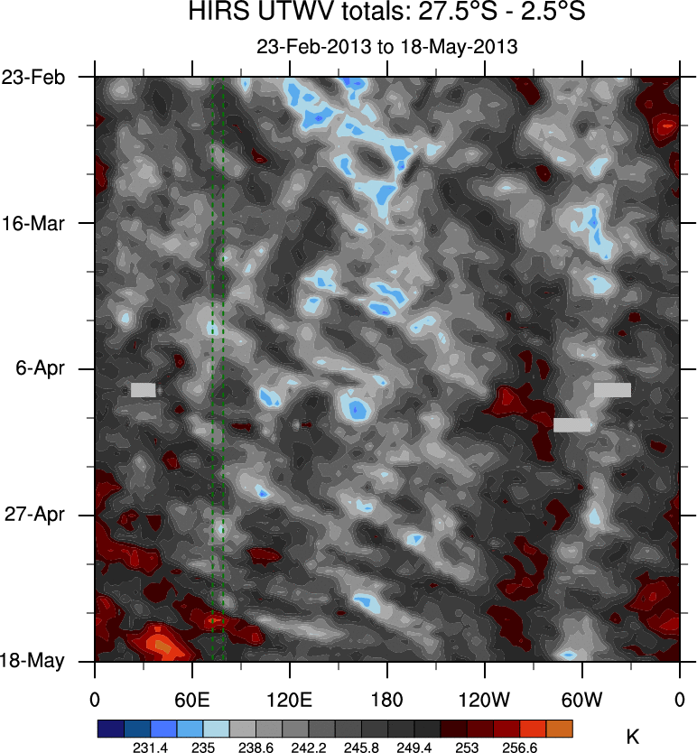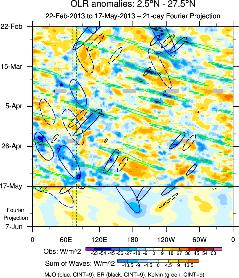 To identify tropical waves in near real-time, the OLR and UTWV data are filtered following Wheeler & Weickmann (2001 MWR). The daily anomalies are calculated using the first 3 harmonics of the seasonal cycle for 1979–2009. Missing values are then filled using linear interpolation in space and time. The most recent 365 days of anomalies are padded with 659 days of zeroes, and the result is filtered for each wave type.