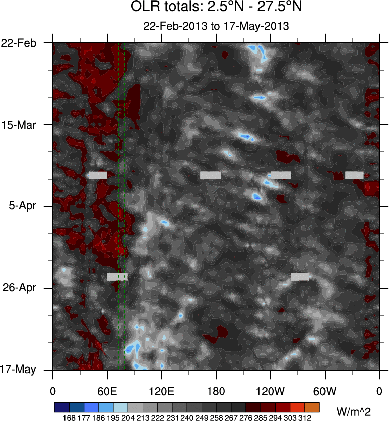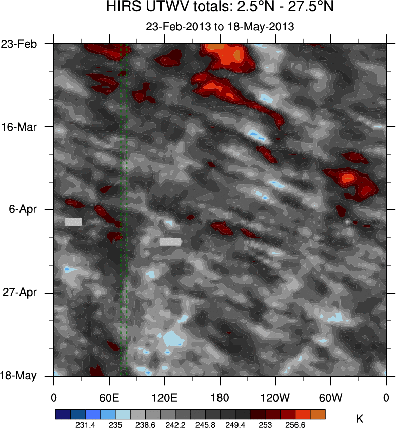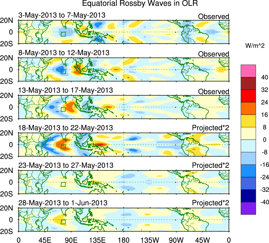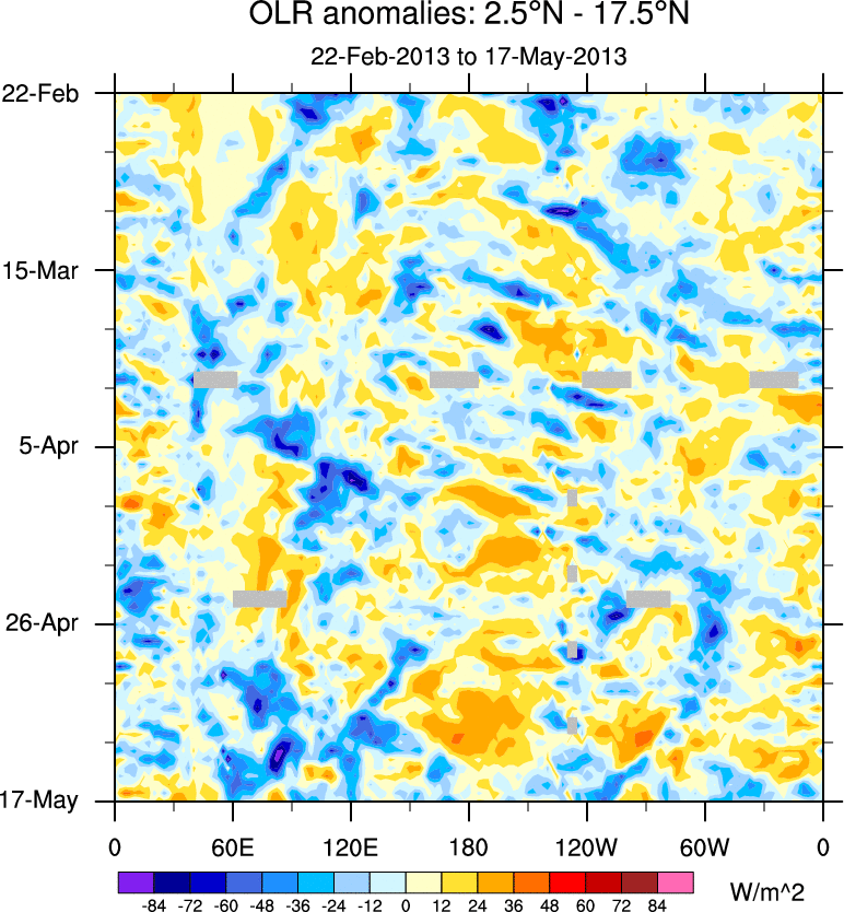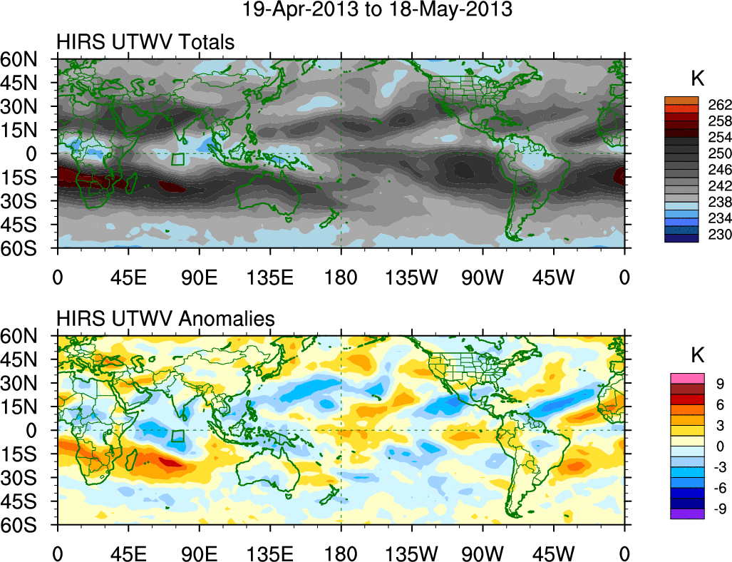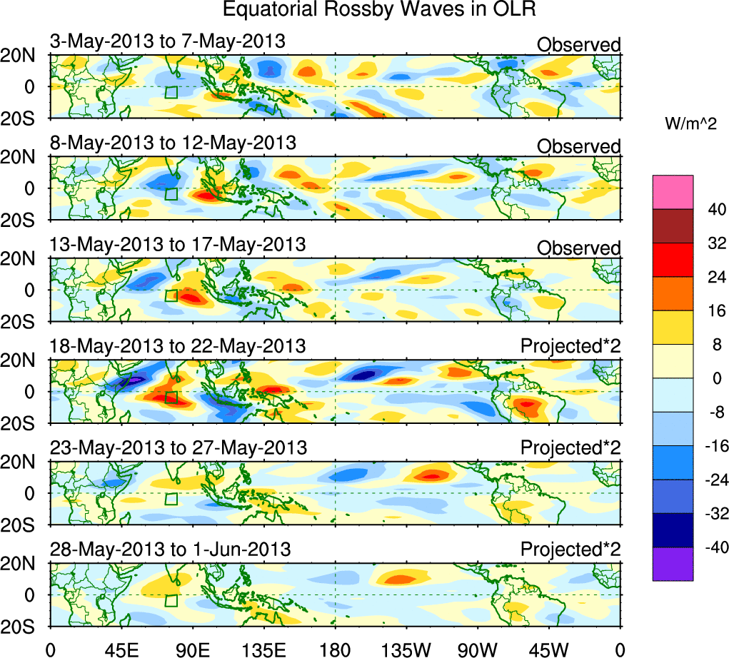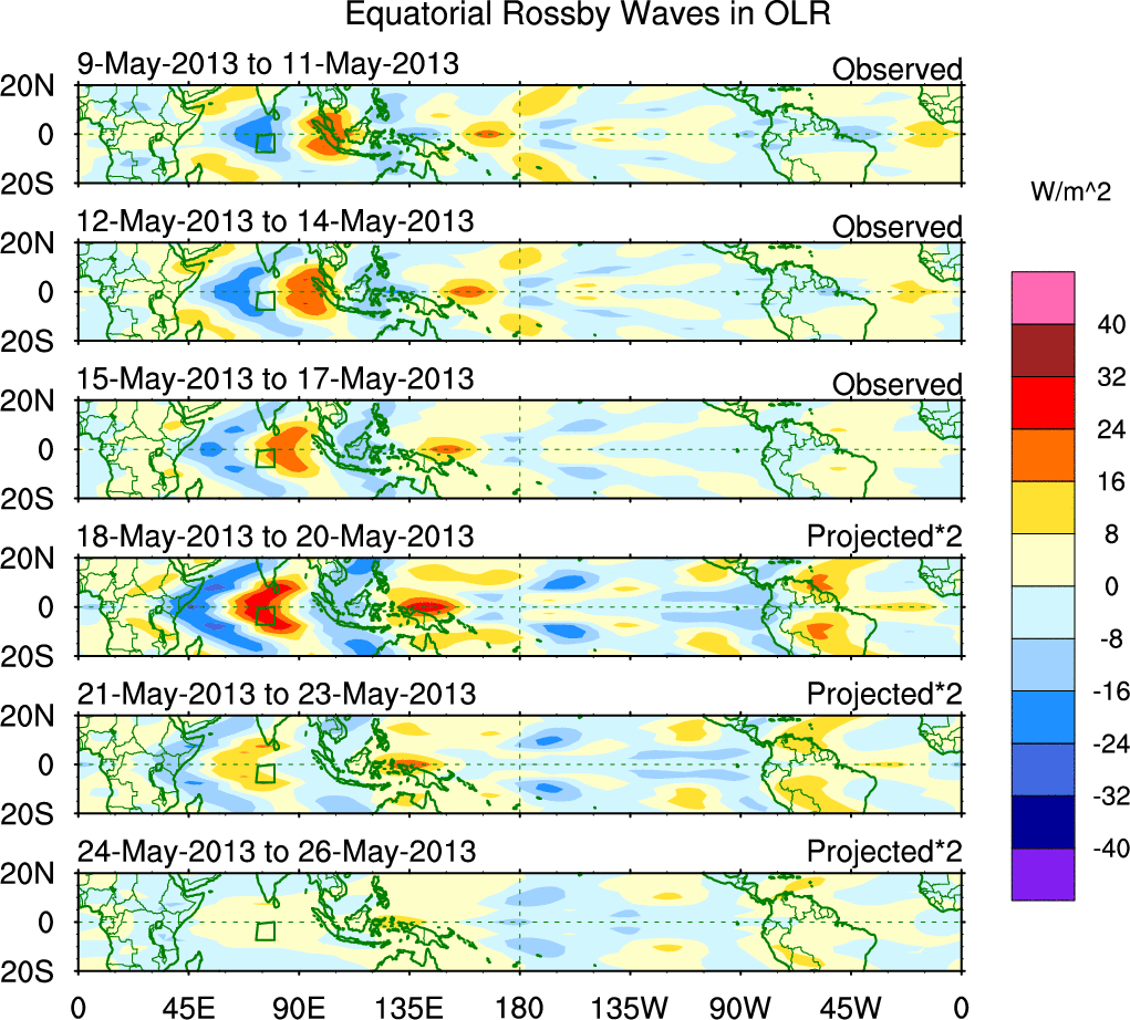 To identify tropical waves in near real-time, the OLR and UTWV data are filtered following Wheeler & Weickmann (2001 MWR). The daily anomalies are calculated using the first 3 harmonics of the seasonal cycle for 1979–2009. Missing values are then filled using linear interpolation in space and time. The most recent 365 days of anomalies are padded with 659 days of zeroes, and the result is filtered for each wave type.