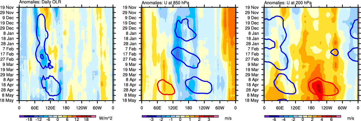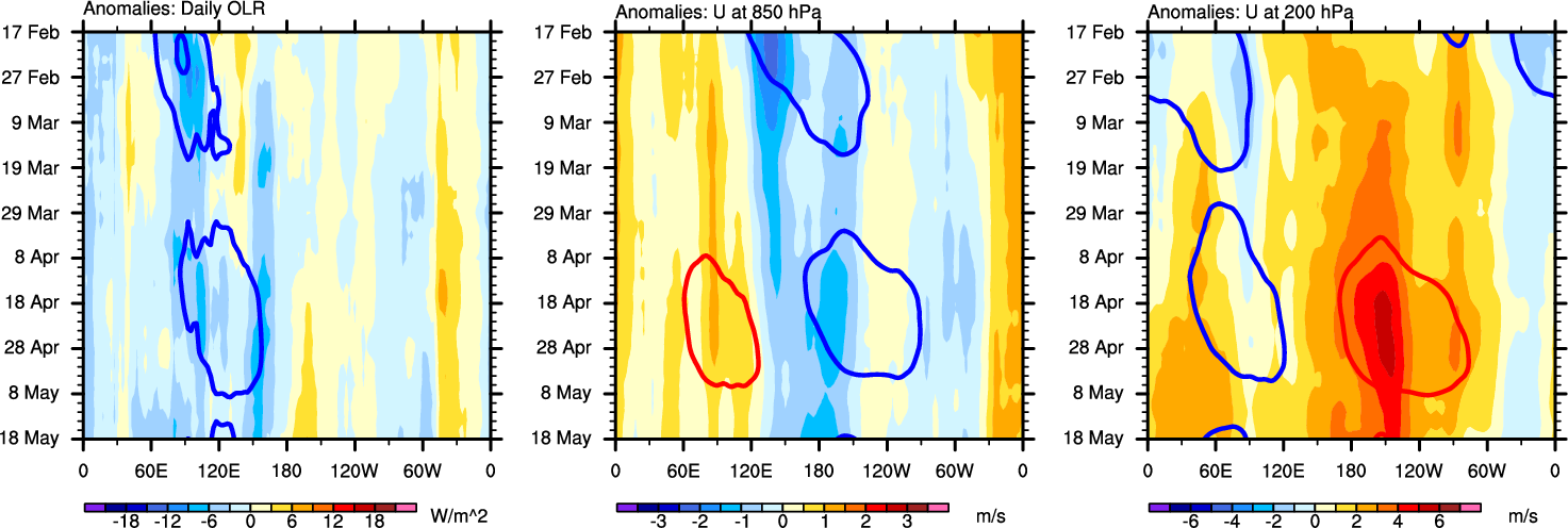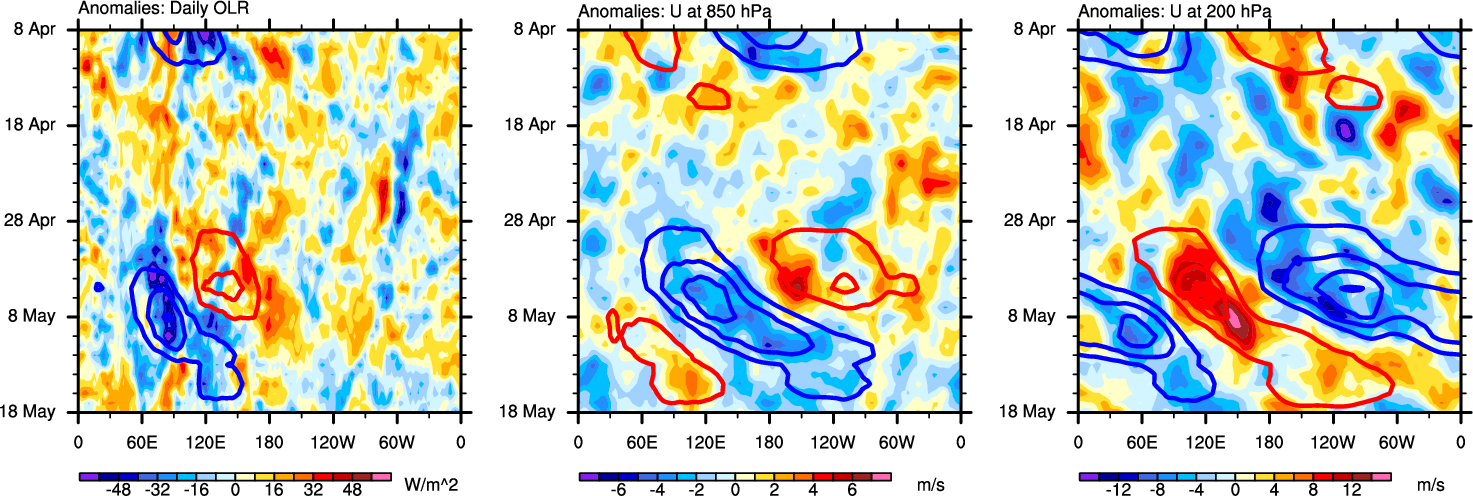 The Hovmollers show longitude-time plots for OLR, U-850, and U-200. The shading indicates the observed anomalies, while the contours are the projection of those anomalies onto the RMM EOFs.