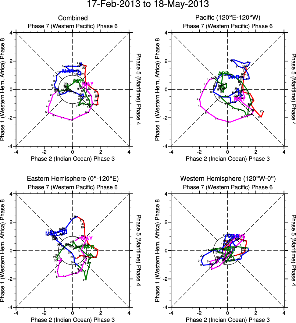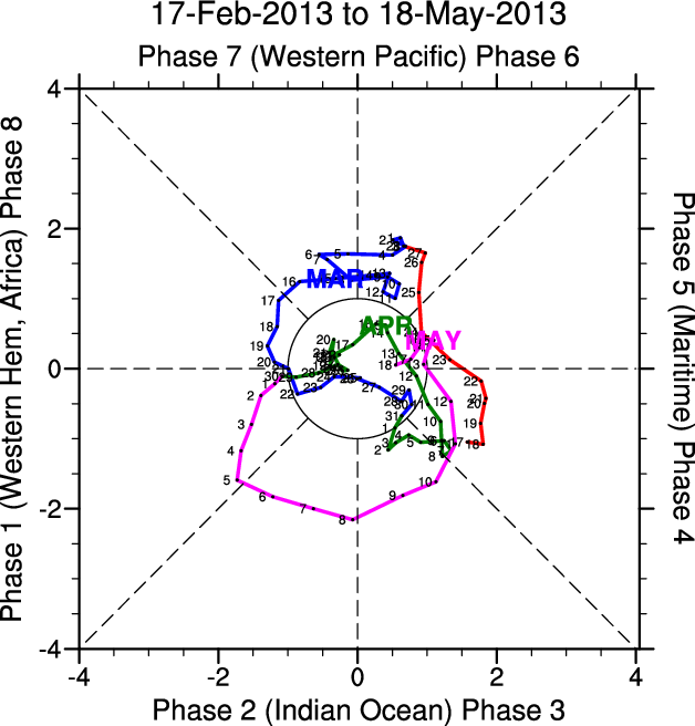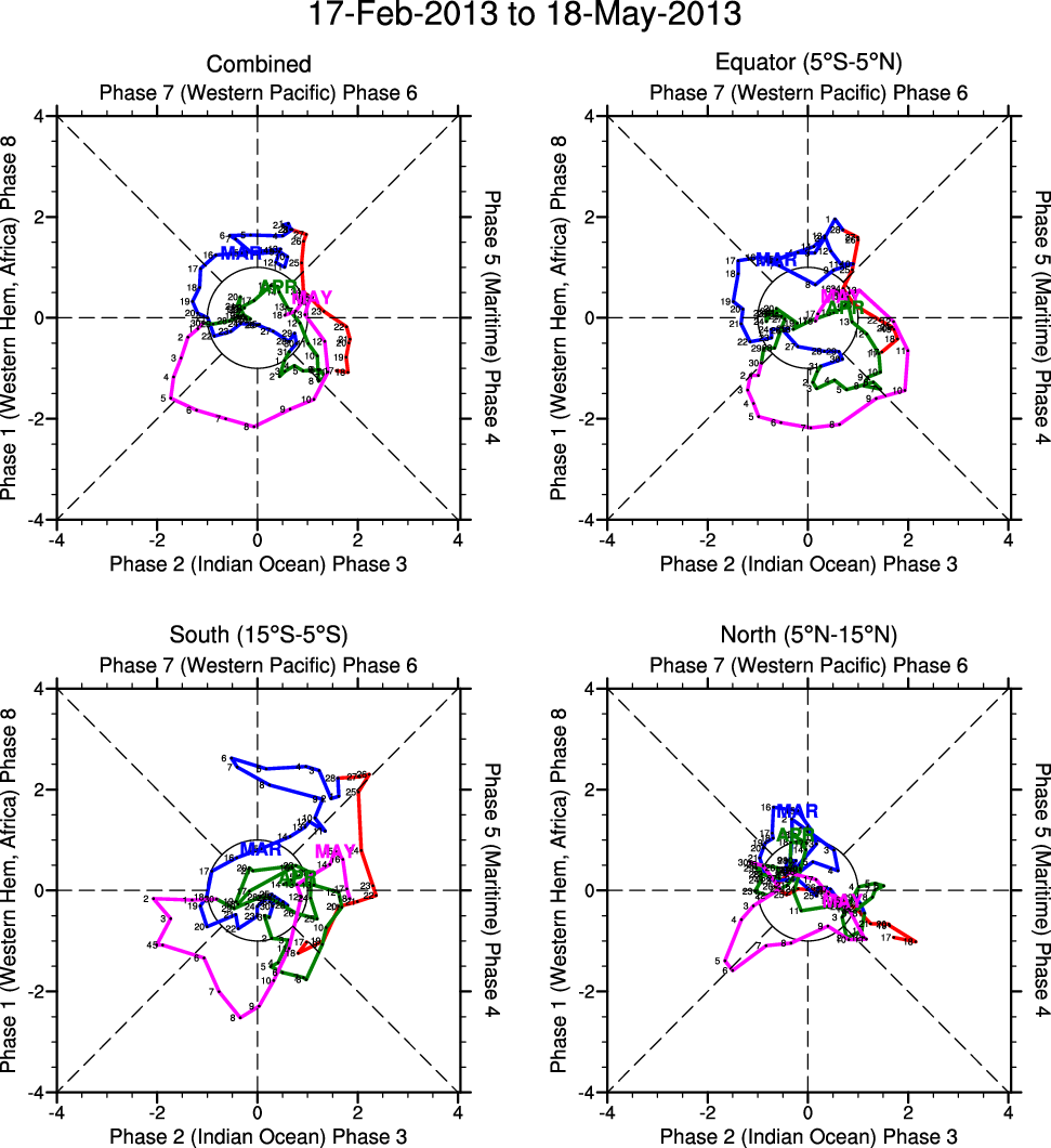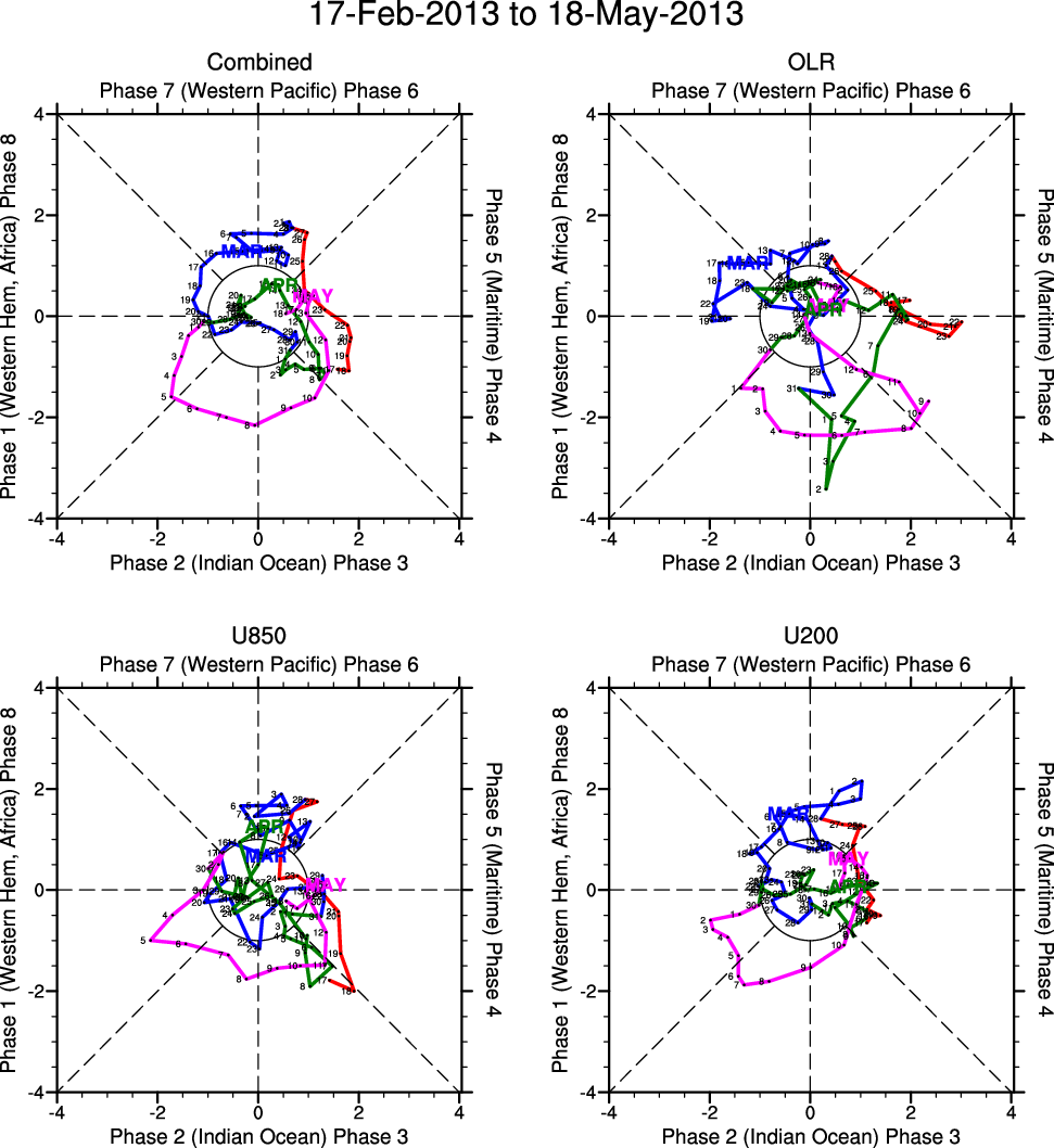 Wheeler and Hendon (2004) constructed the RMM index for monitoring the MJO. This index consists of the first two principal components (PCs) of OLR, 850-hPa zonal wind, and 200-hPa zonal wind averaged 15S-15N.