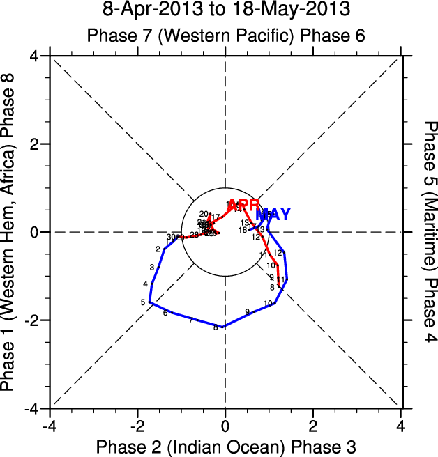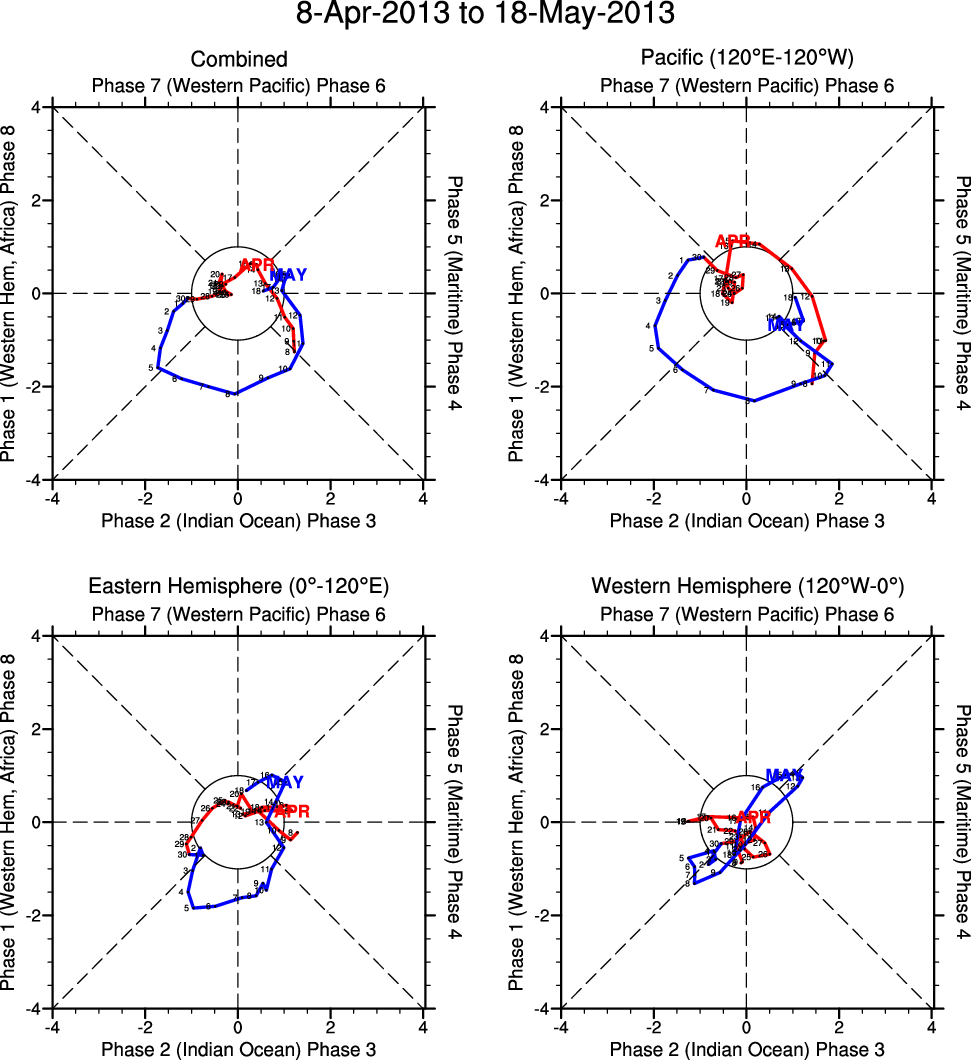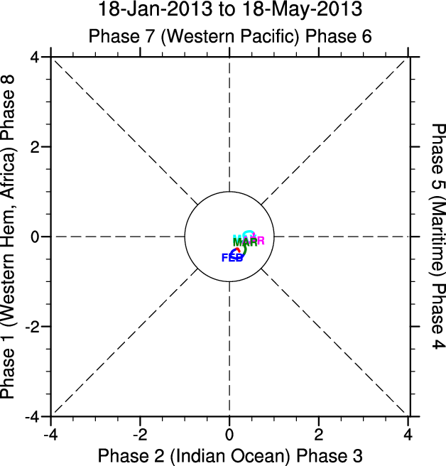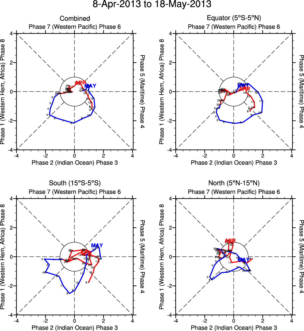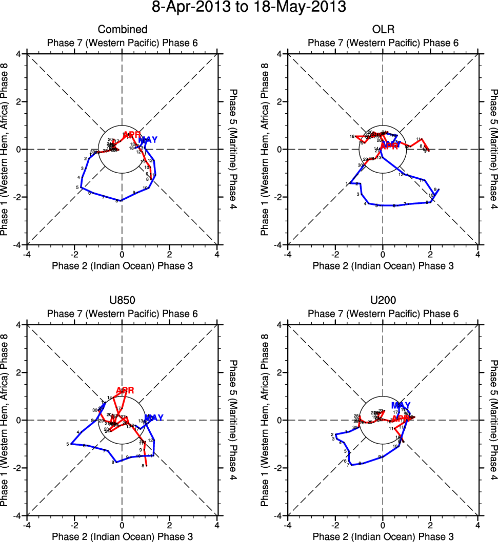 Wheeler and Hendon (2004) constructed the RMM index for monitoring the MJO. This index consists of the first two principal components (PCs) of OLR, 850-hPa zonal wind, and 200-hPa zonal wind averaged 15S-15N.