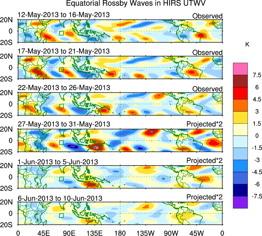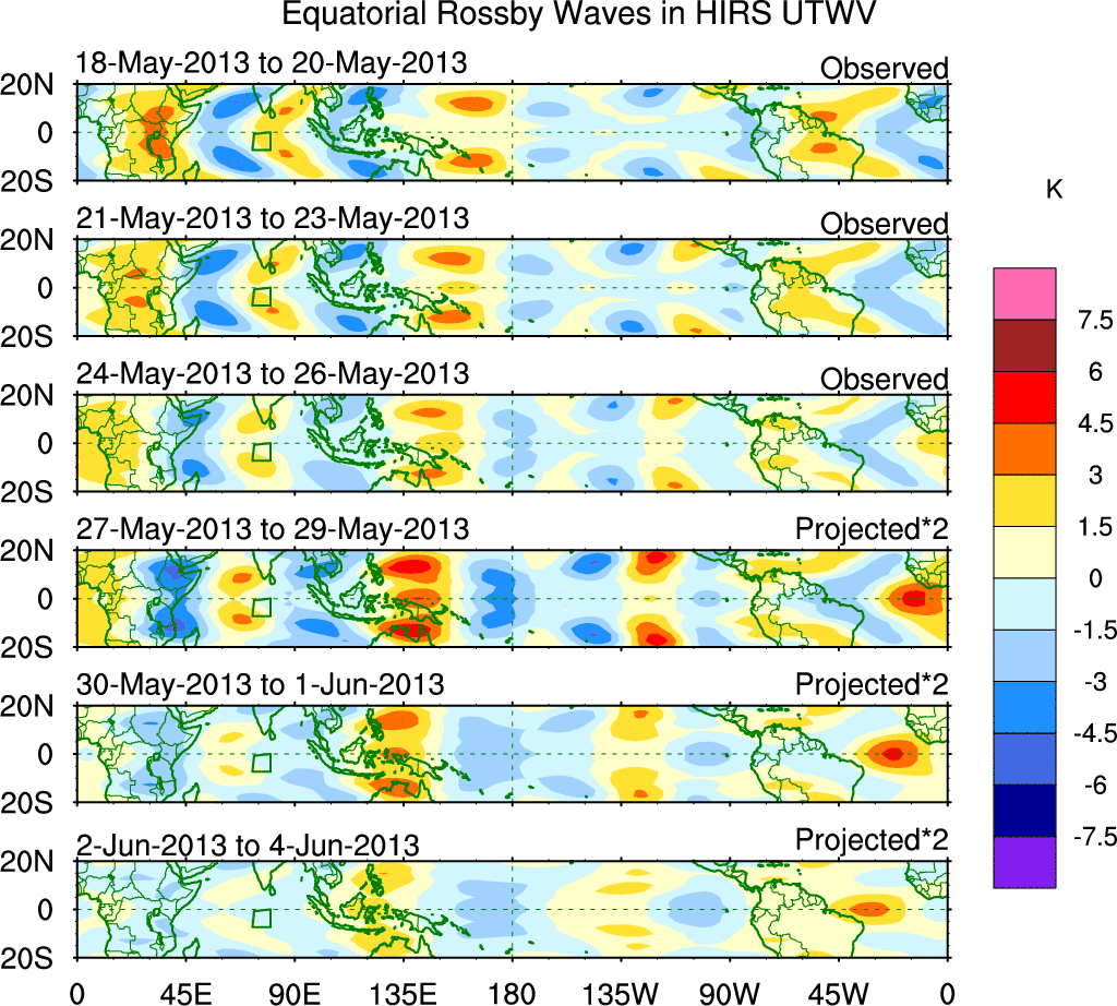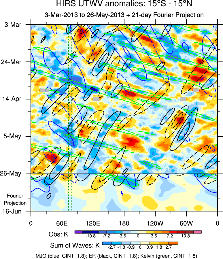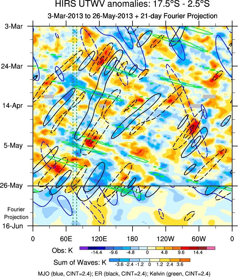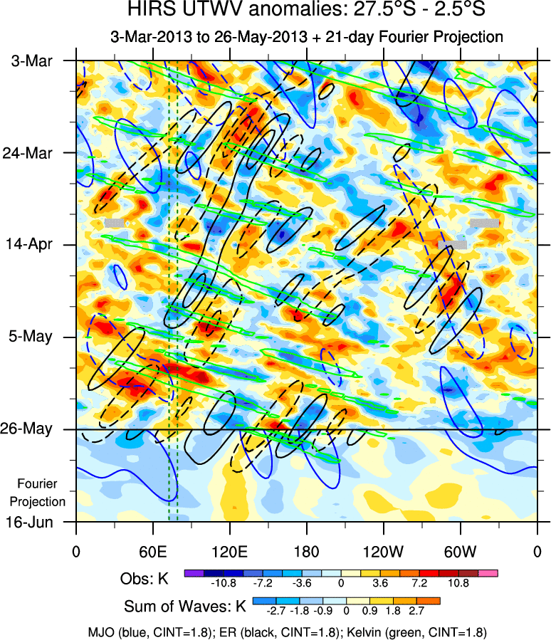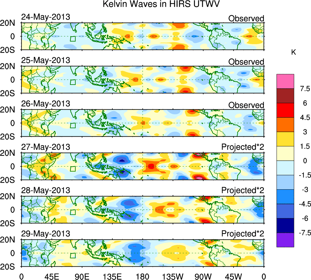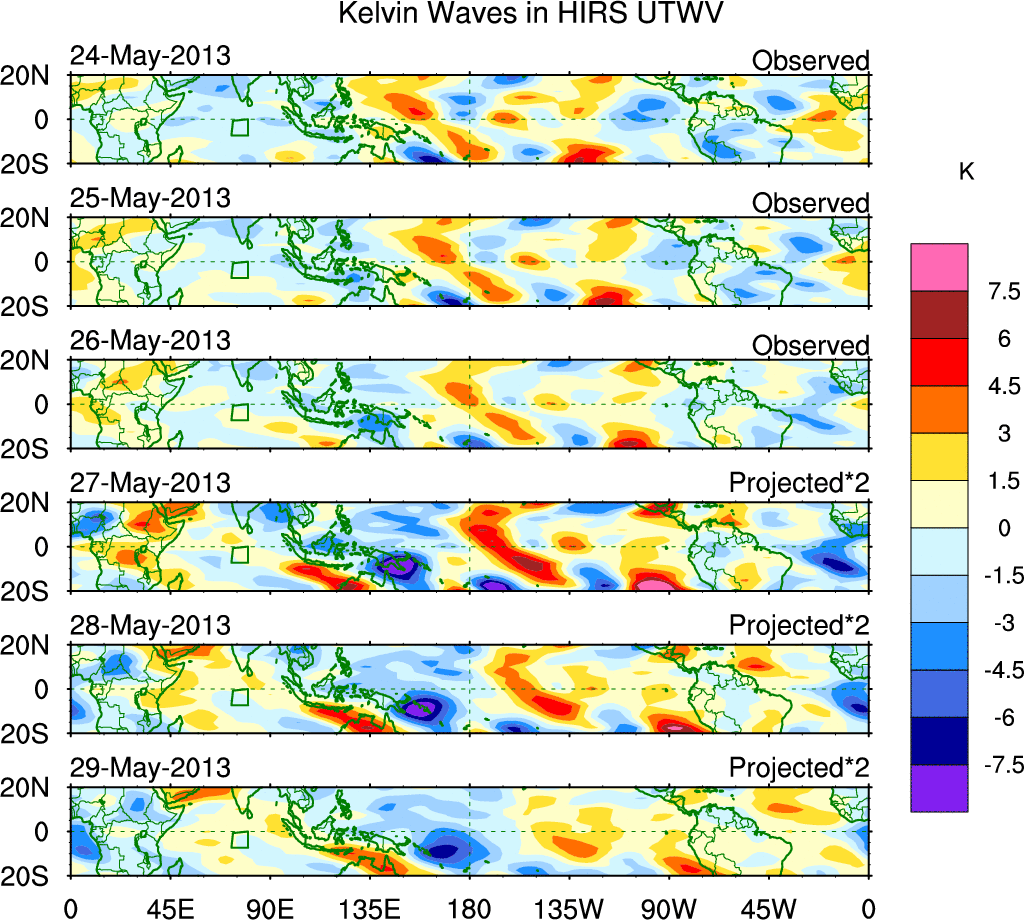 To identify tropical waves in near real-time, the OLR and UTWV data are filtered following Wheeler & Weickmann (2001 MWR). The daily anomalies are calculated using the first 3 harmonics of the seasonal cycle for 1979–2009. Missing values are then filled using linear interpolation in space and time. The most recent 365 days of anomalies are padded with 659 days of zeroes, and the result is filtered for each wave type.
