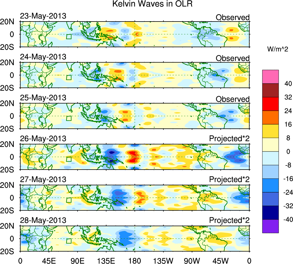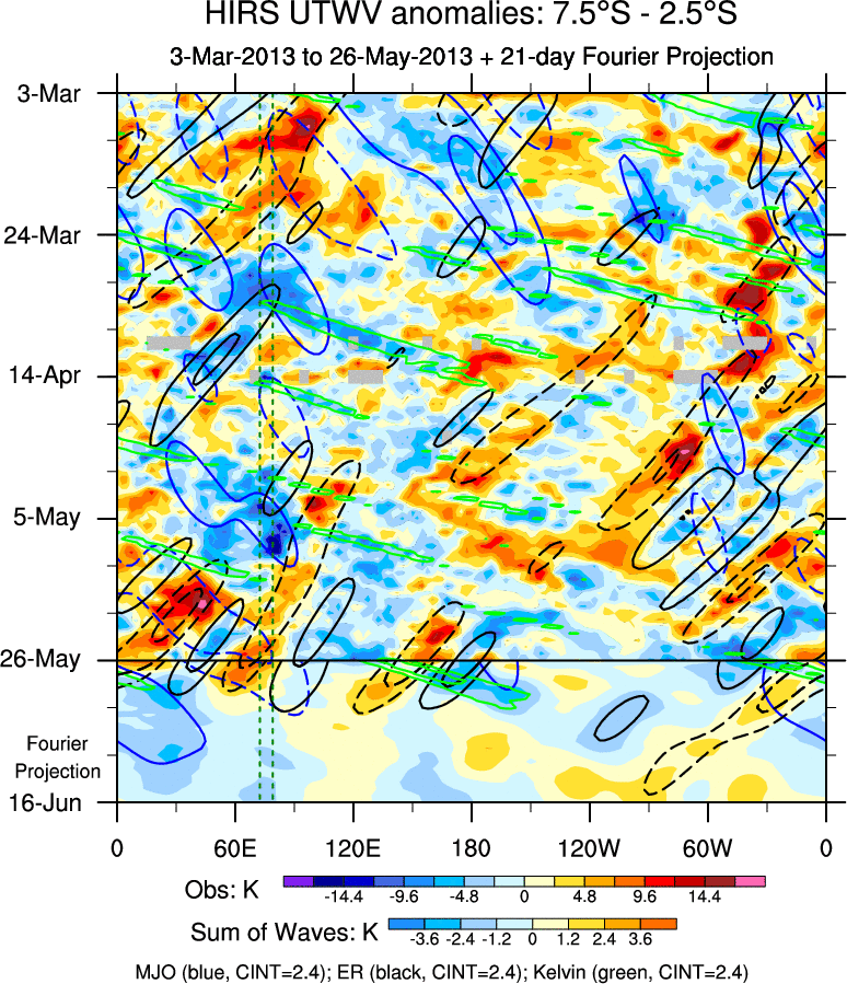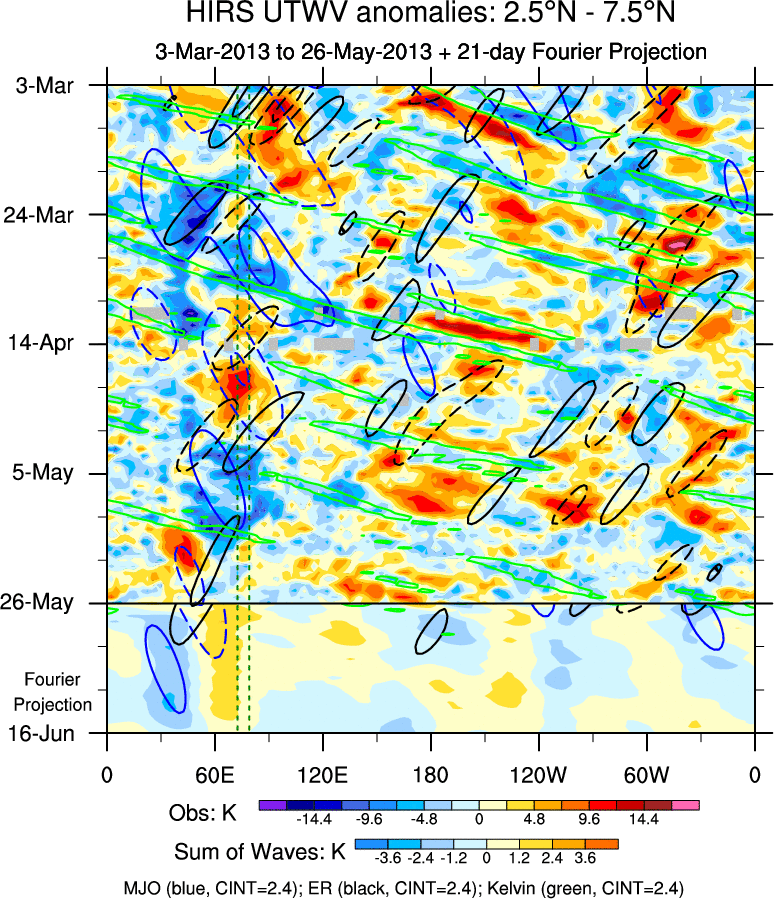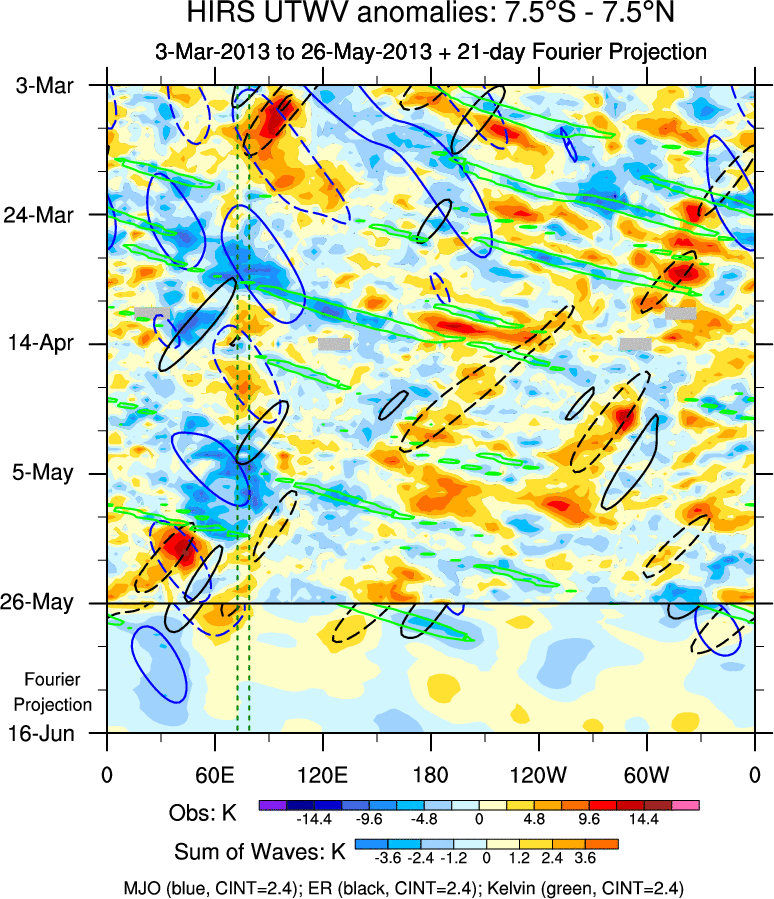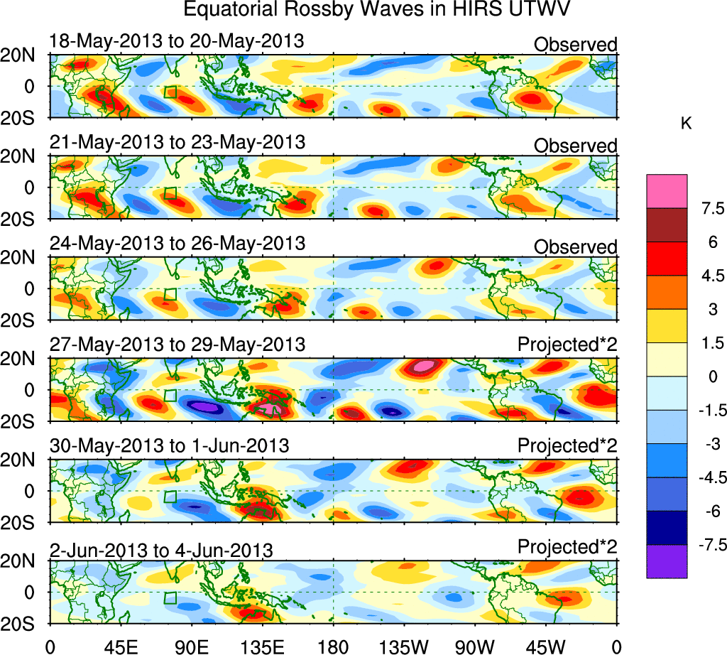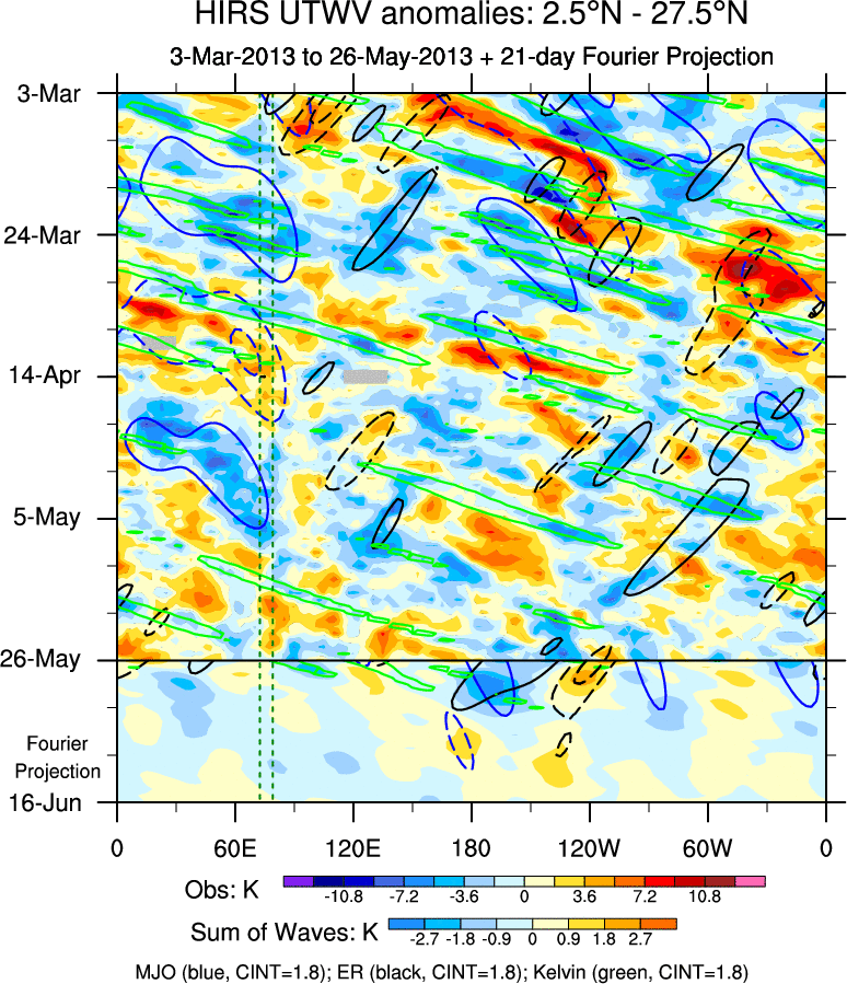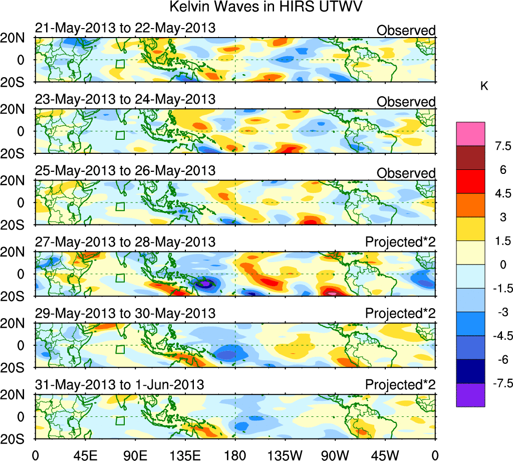 To identify tropical waves in near real-time, the OLR and UTWV data are filtered following Wheeler & Weickmann (2001 MWR). The daily anomalies are calculated using the first 3 harmonics of the seasonal cycle for 1979–2009. Missing values are then filled using linear interpolation in space and time. The most recent 365 days of anomalies are padded with 659 days of zeroes, and the result is filtered for each wave type.