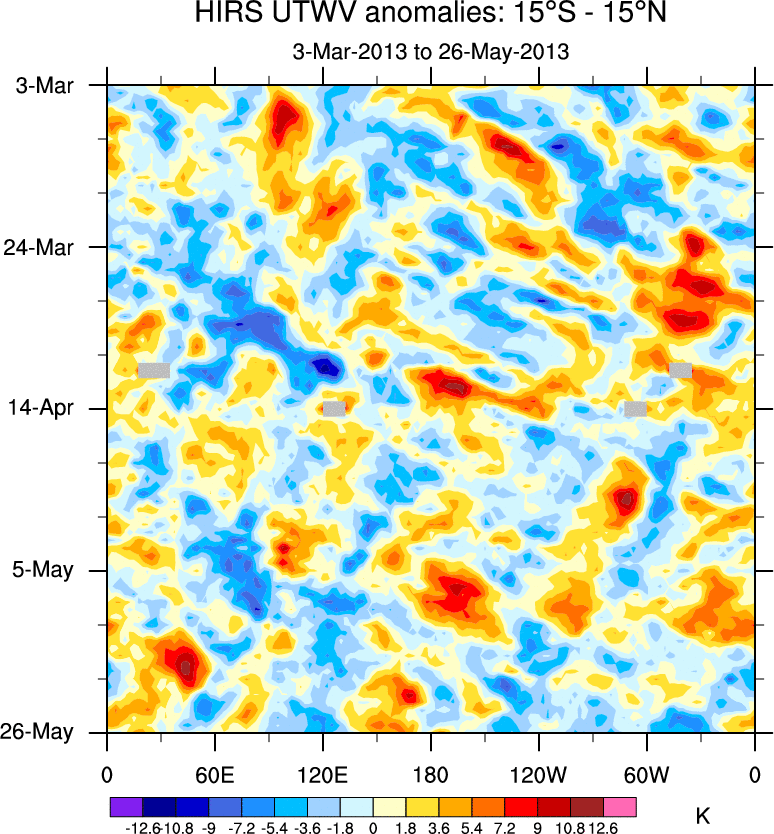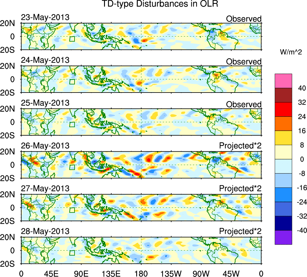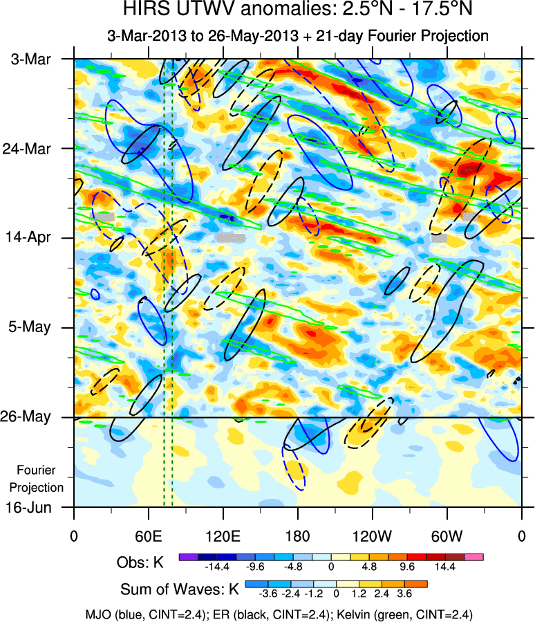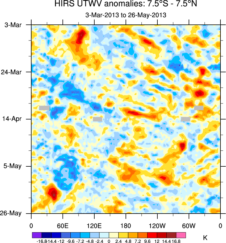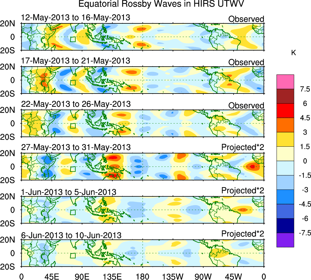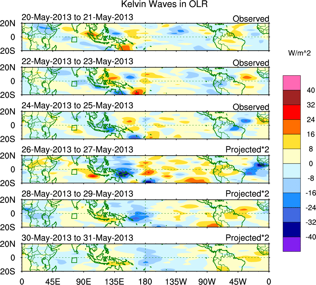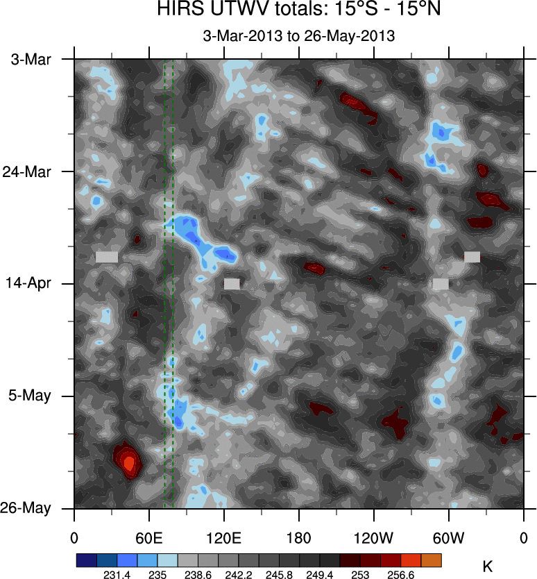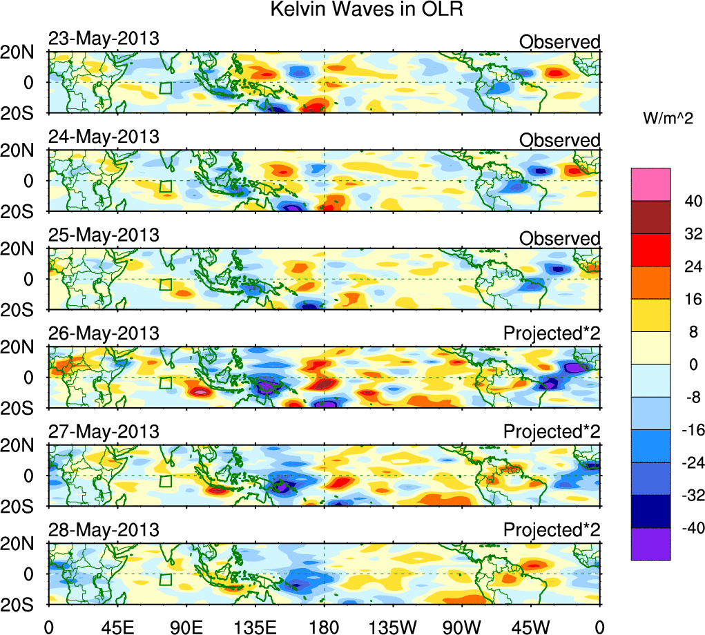 To identify tropical waves in near real-time, the OLR and UTWV data are filtered following Wheeler & Weickmann (2001 MWR). The daily anomalies are calculated using the first 3 harmonics of the seasonal cycle for 1979–2009. Missing values are then filled using linear interpolation in space and time. The most recent 365 days of anomalies are padded with 659 days of zeroes, and the result is filtered for each wave type.