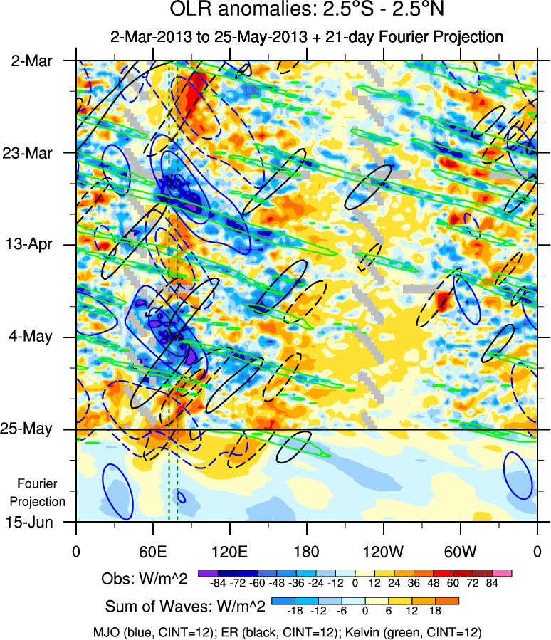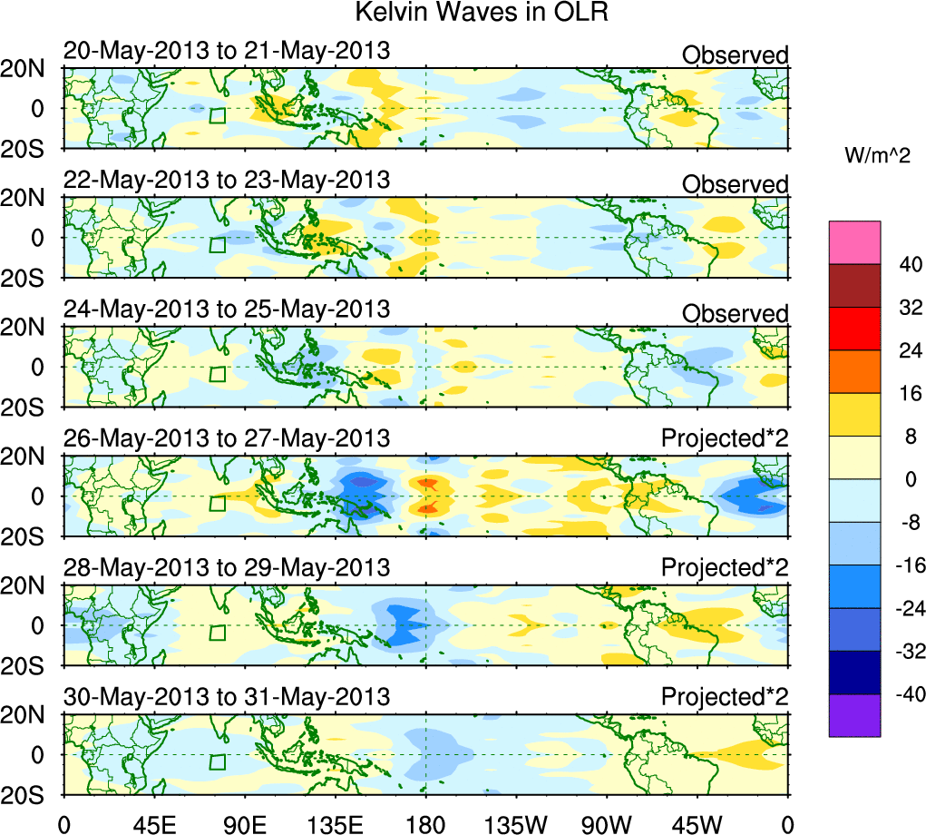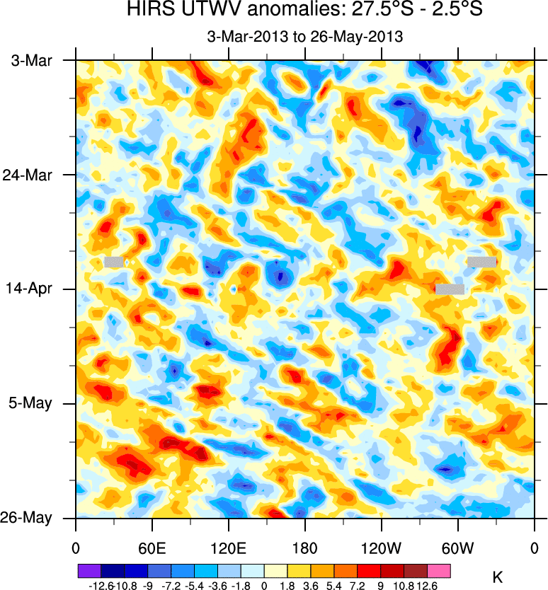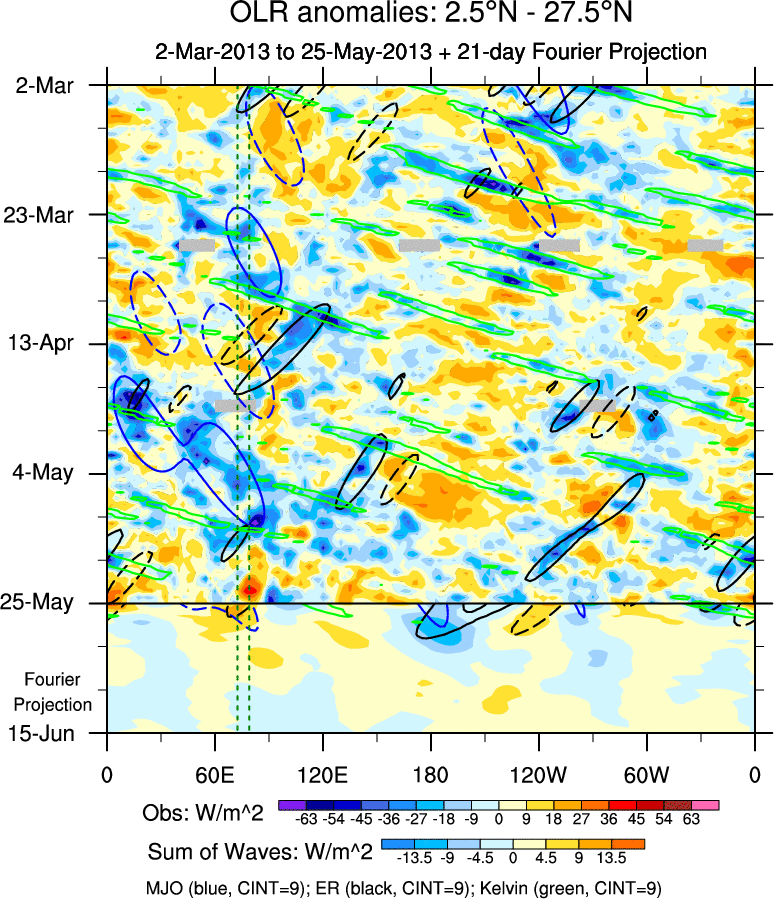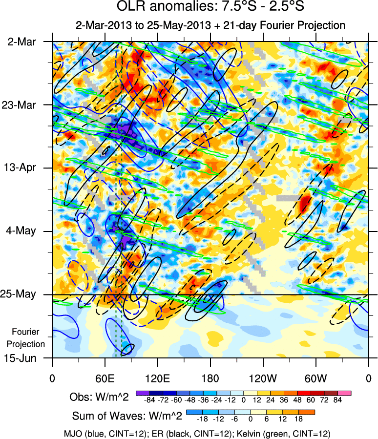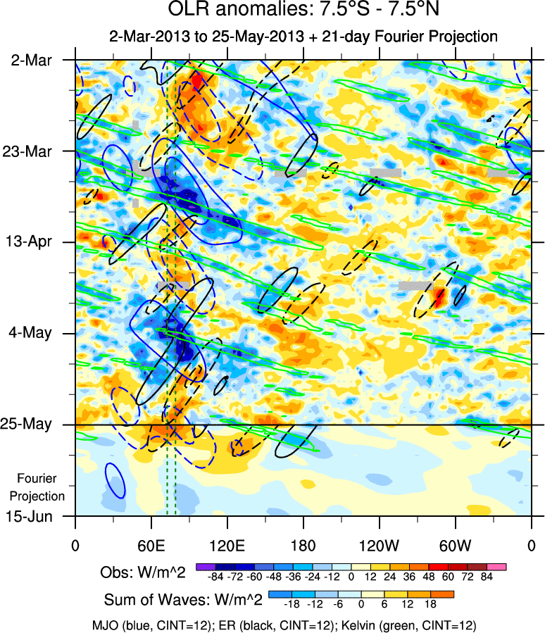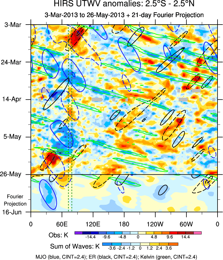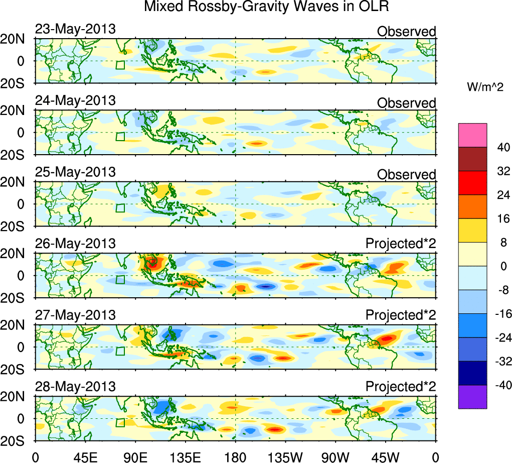 To identify tropical waves in near real-time, the OLR and UTWV data are filtered following Wheeler & Weickmann (2001 MWR). The daily anomalies are calculated using the first 3 harmonics of the seasonal cycle for 1979–2009. Missing values are then filled using linear interpolation in space and time. The most recent 365 days of anomalies are padded with 659 days of zeroes, and the result is filtered for each wave type.