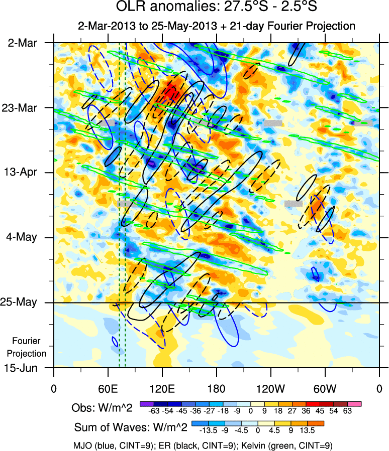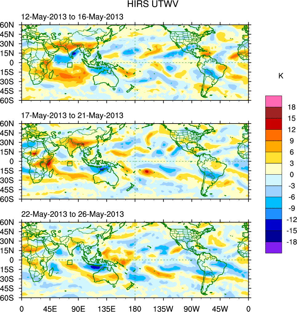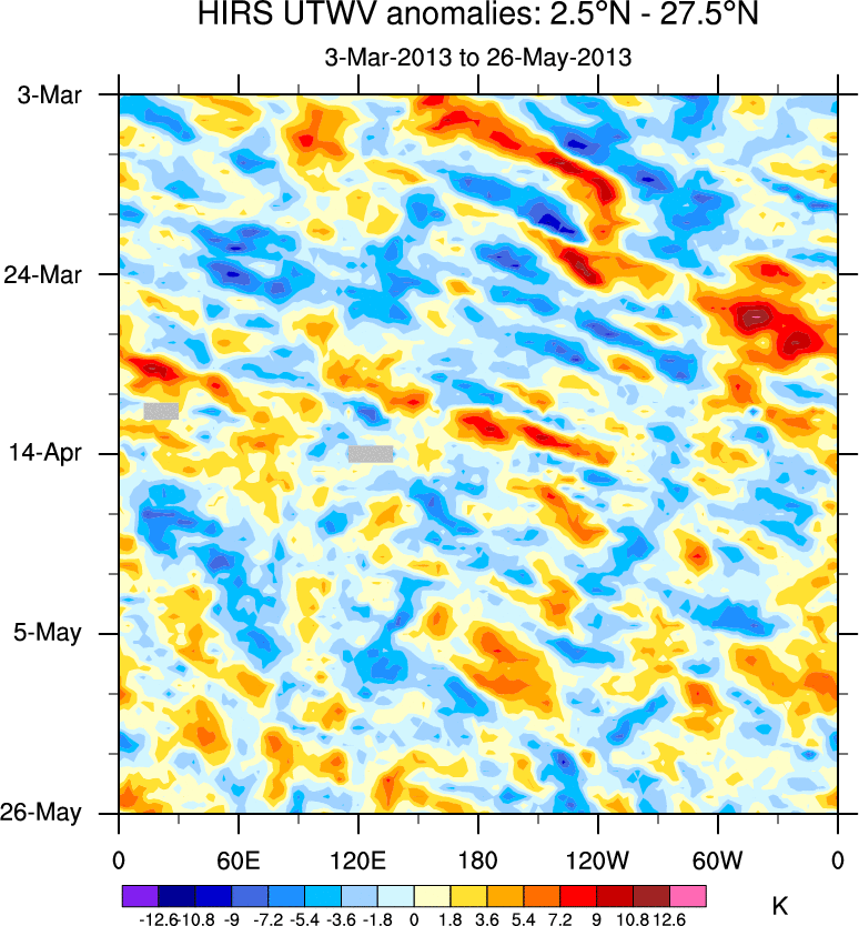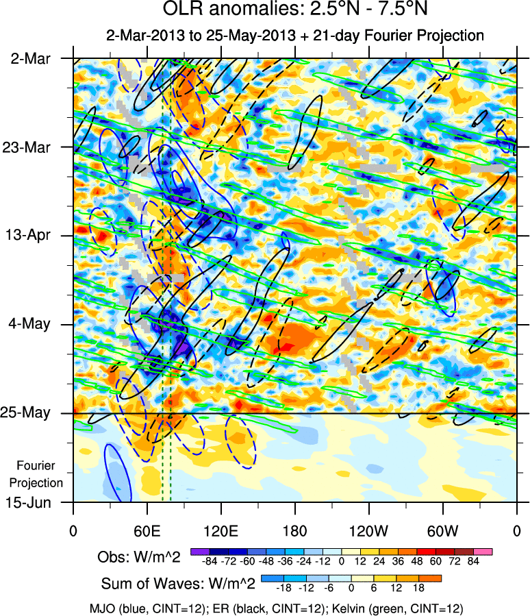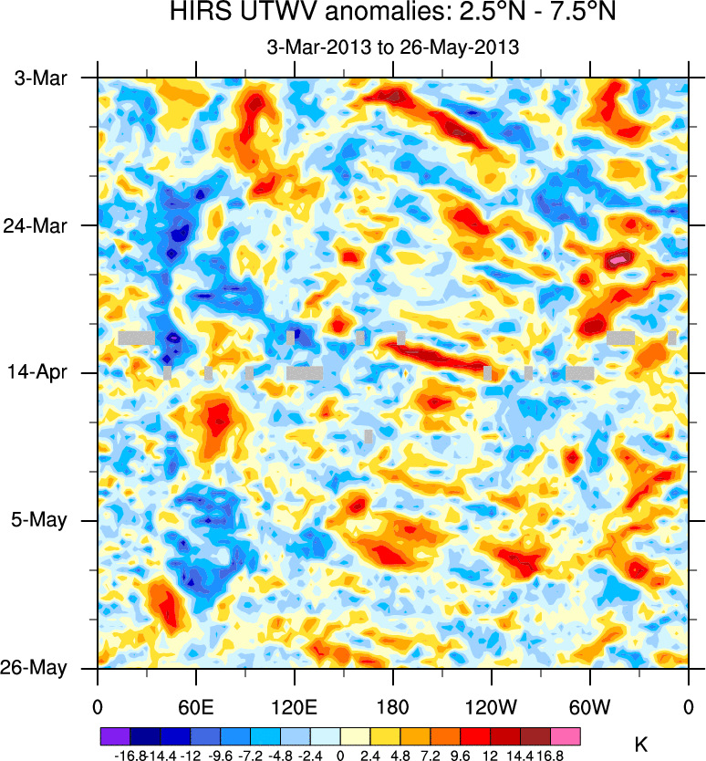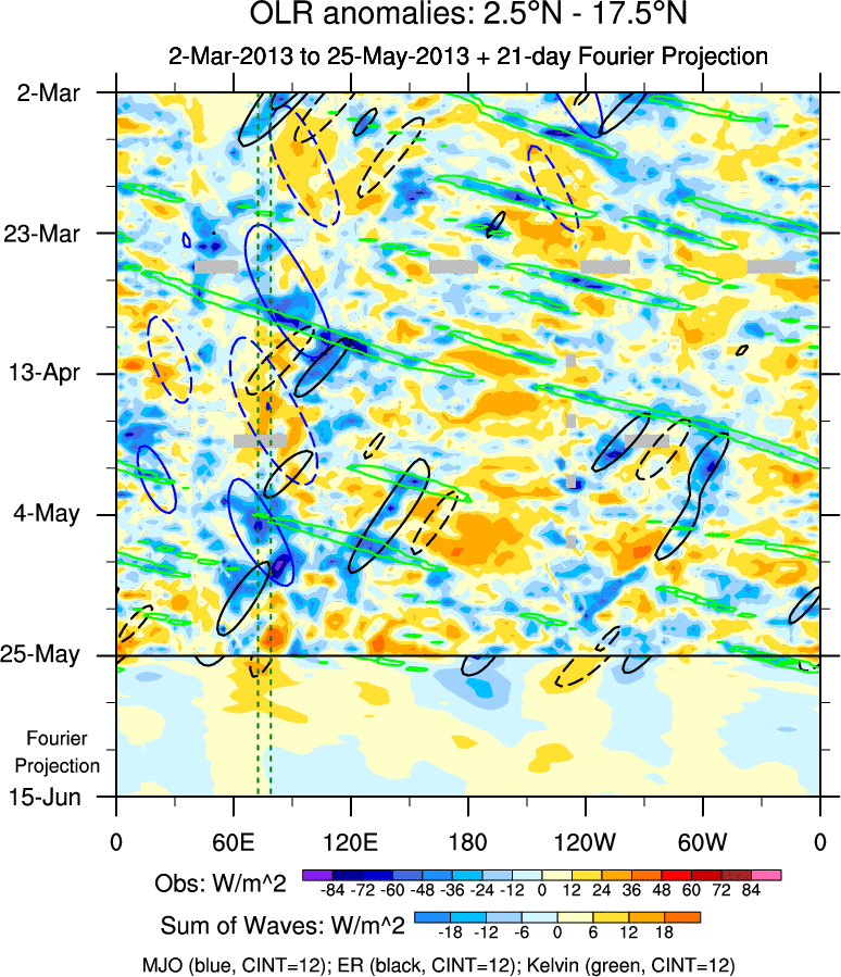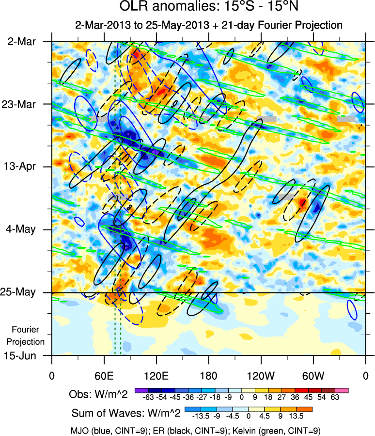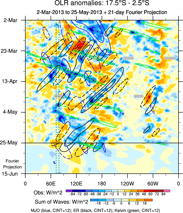 To identify tropical waves in near real-time, the OLR and UTWV data are filtered following Wheeler & Weickmann (2001 MWR). The daily anomalies are calculated using the first 3 harmonics of the seasonal cycle for 1979–2009. Missing values are then filled using linear interpolation in space and time. The most recent 365 days of anomalies are padded with 659 days of zeroes, and the result is filtered for each wave type.
