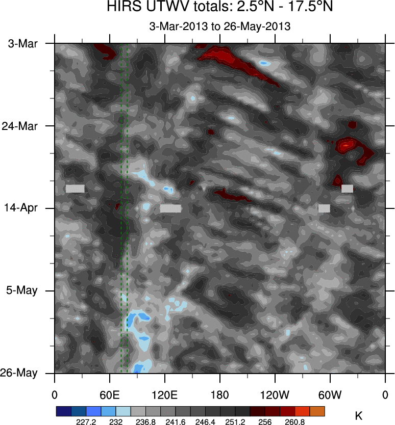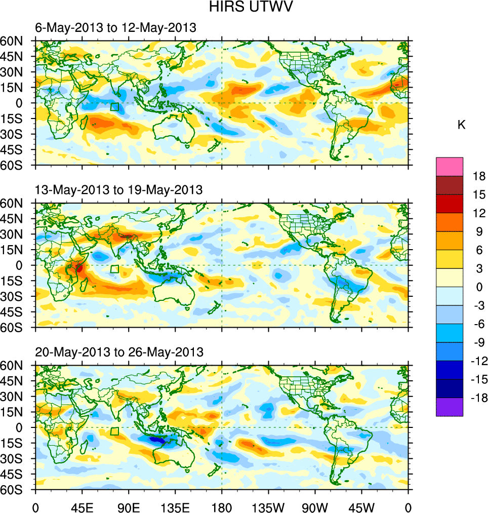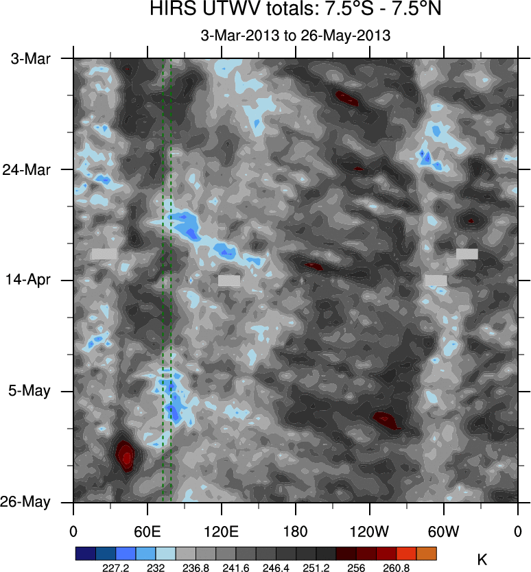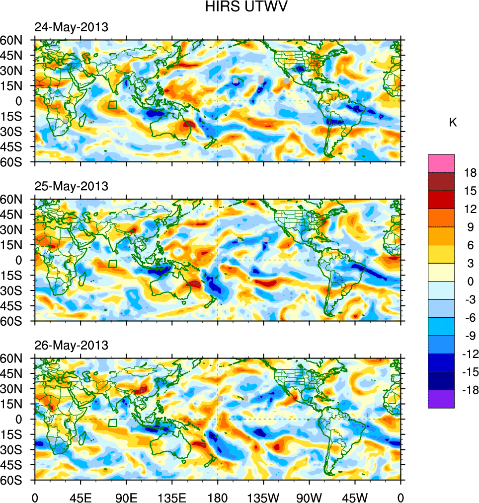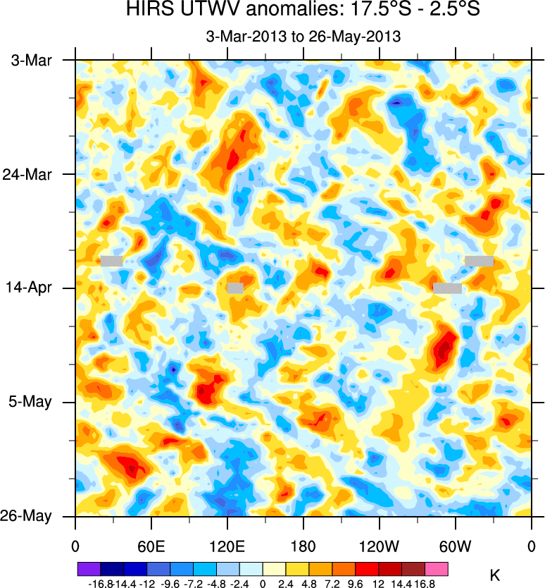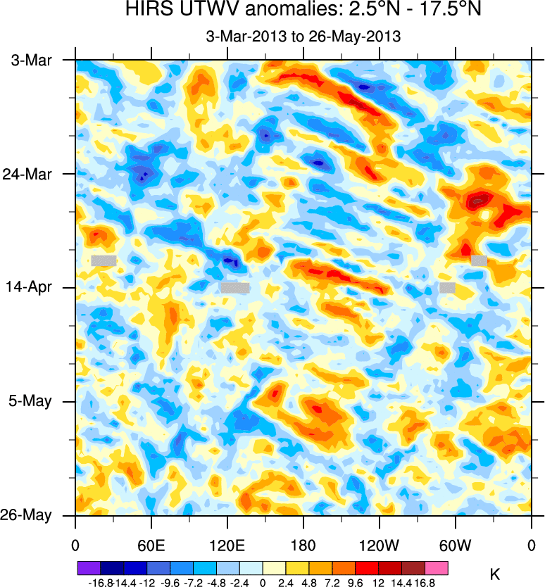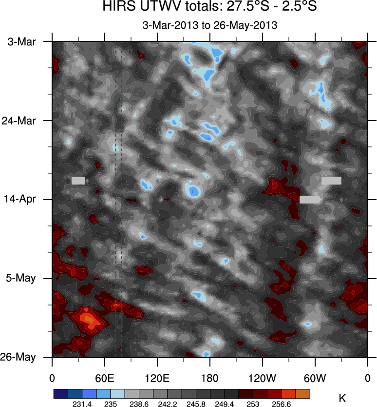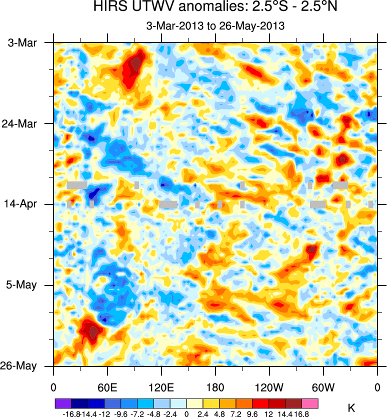 To identify tropical waves in near real-time, the OLR and UTWV data are filtered following Wheeler & Weickmann (2001 MWR). The daily anomalies are calculated using the first 3 harmonics of the seasonal cycle for 1979–2009. Missing values are then filled using linear interpolation in space and time. The most recent 365 days of anomalies are padded with 659 days of zeroes, and the result is filtered for each wave type.