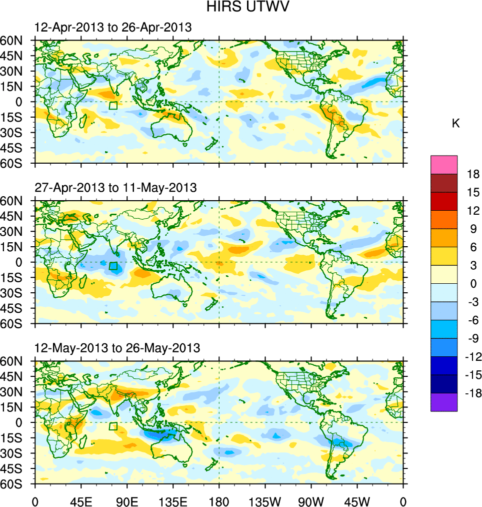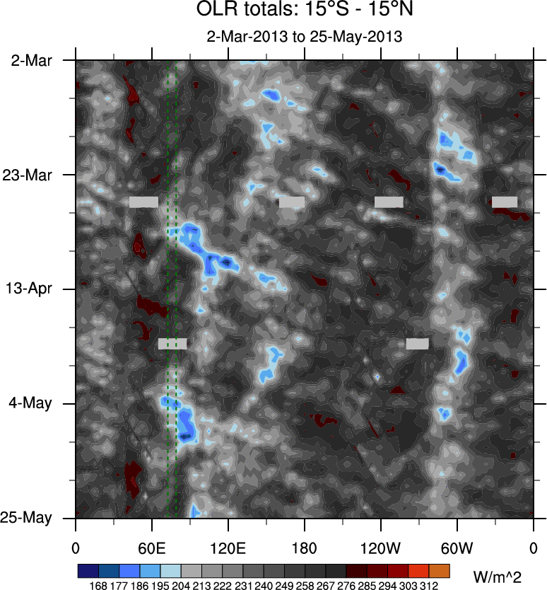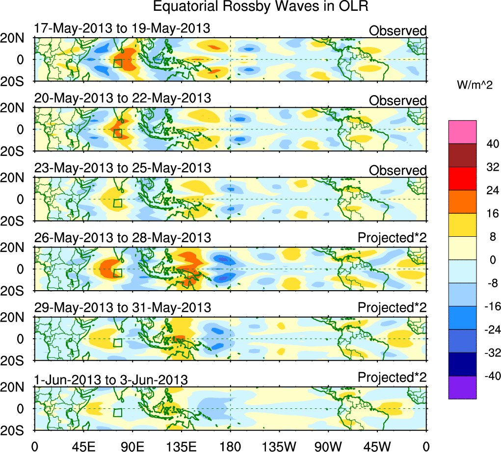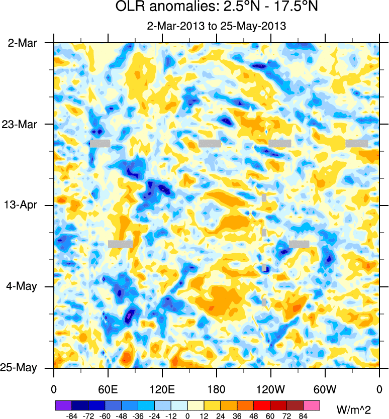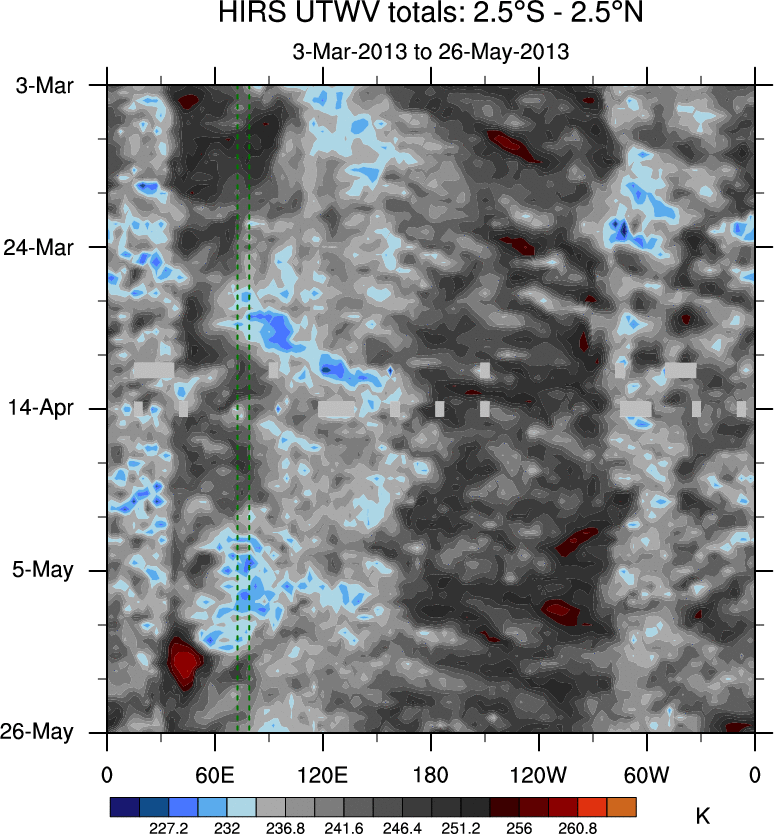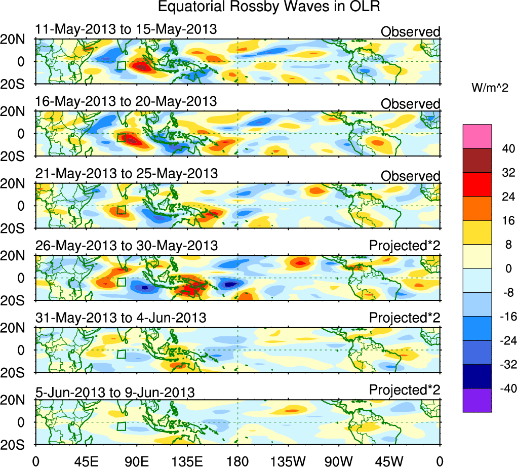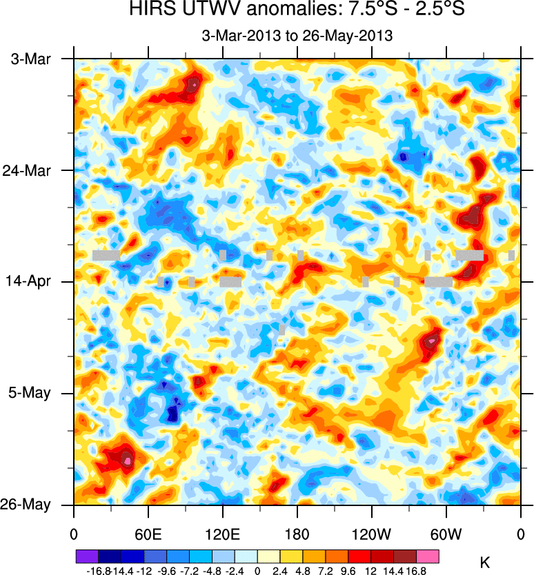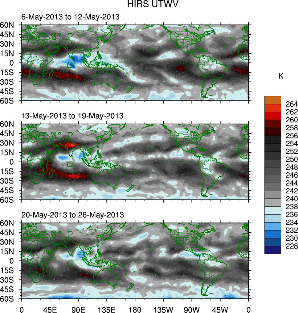 To identify tropical waves in near real-time, the OLR and UTWV data are filtered following Wheeler & Weickmann (2001 MWR). The daily anomalies are calculated using the first 3 harmonics of the seasonal cycle for 1979–2009. Missing values are then filled using linear interpolation in space and time. The most recent 365 days of anomalies are padded with 659 days of zeroes, and the result is filtered for each wave type.