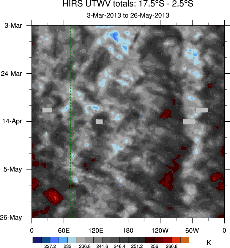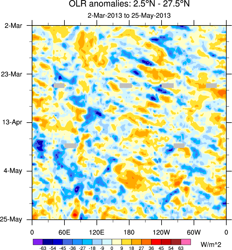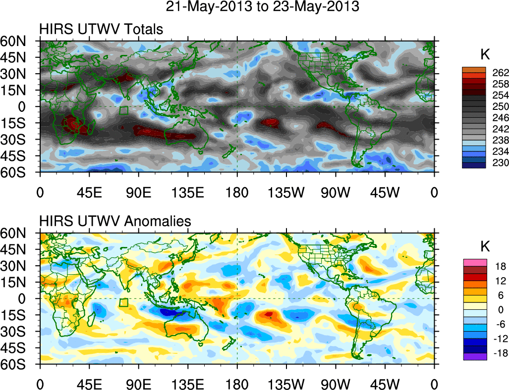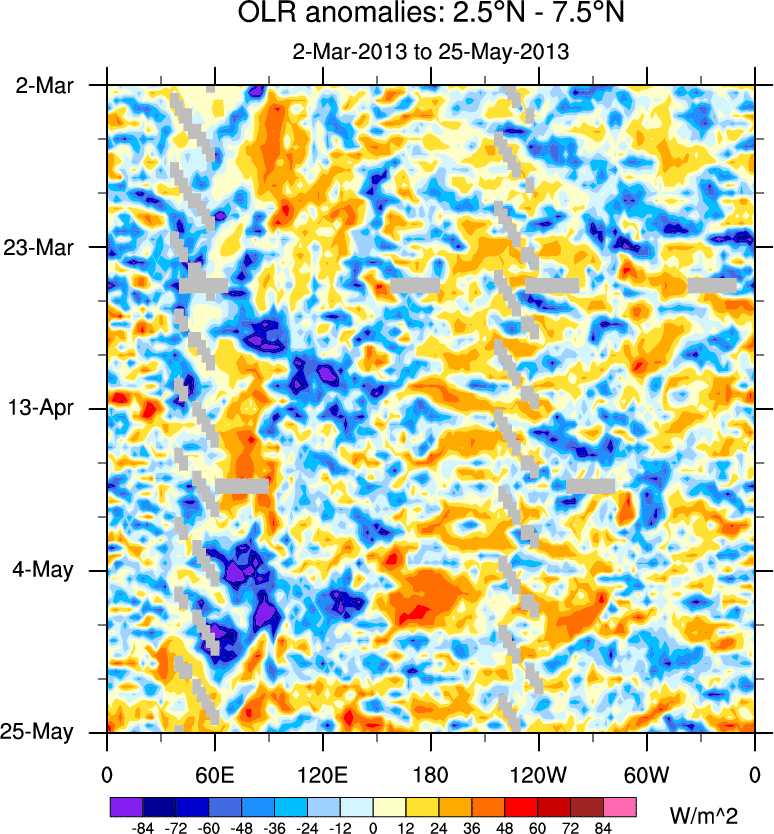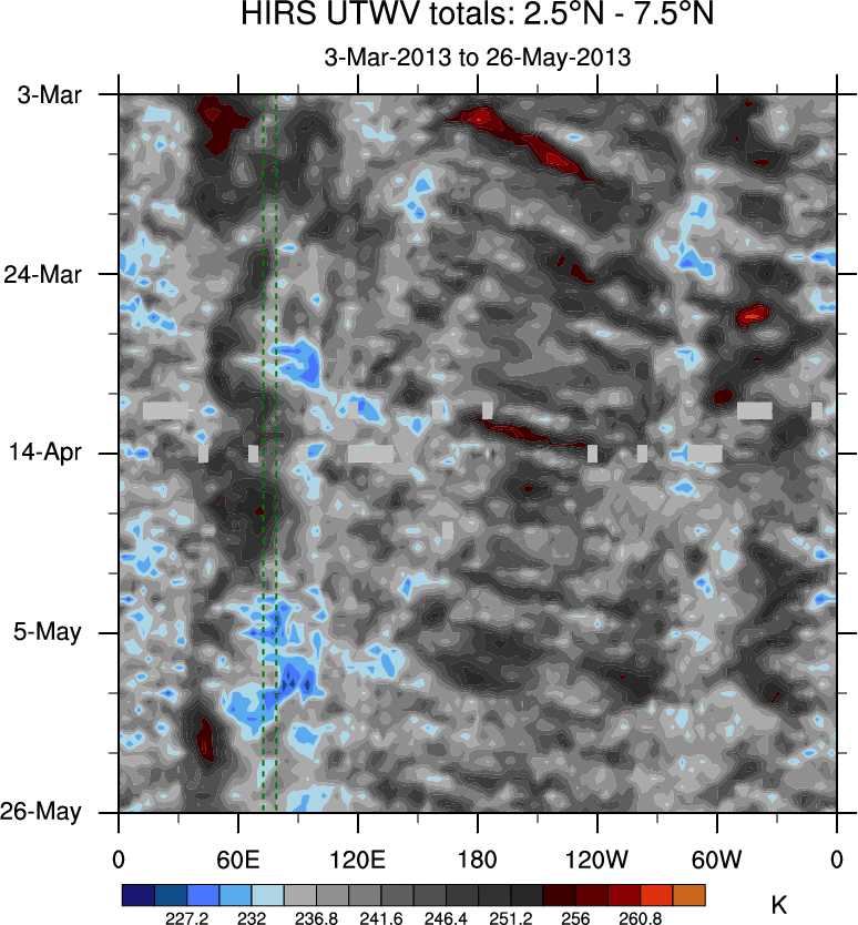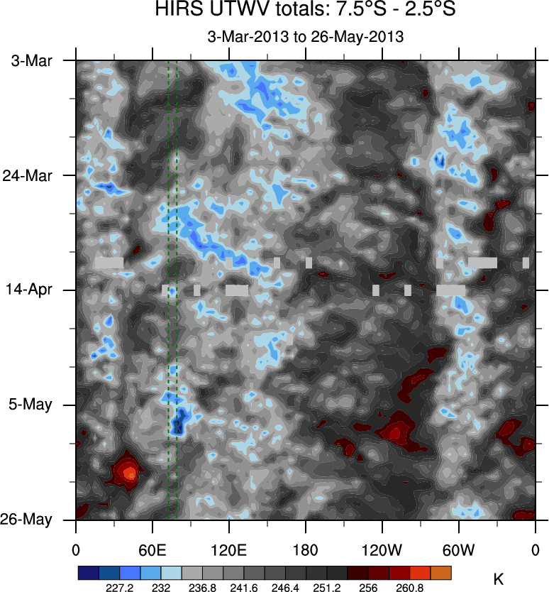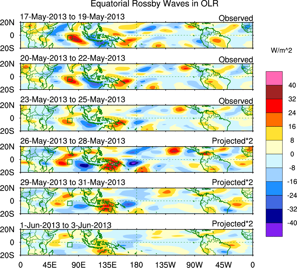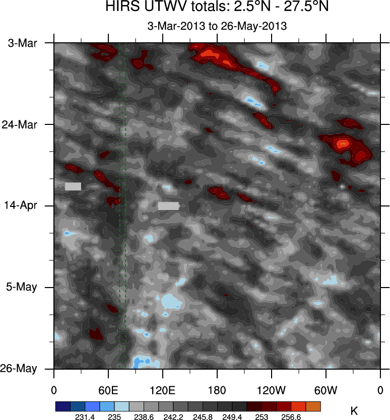 To identify tropical waves in near real-time, the OLR and UTWV data are filtered following Wheeler & Weickmann (2001 MWR). The daily anomalies are calculated using the first 3 harmonics of the seasonal cycle for 1979–2009. Missing values are then filled using linear interpolation in space and time. The most recent 365 days of anomalies are padded with 659 days of zeroes, and the result is filtered for each wave type.