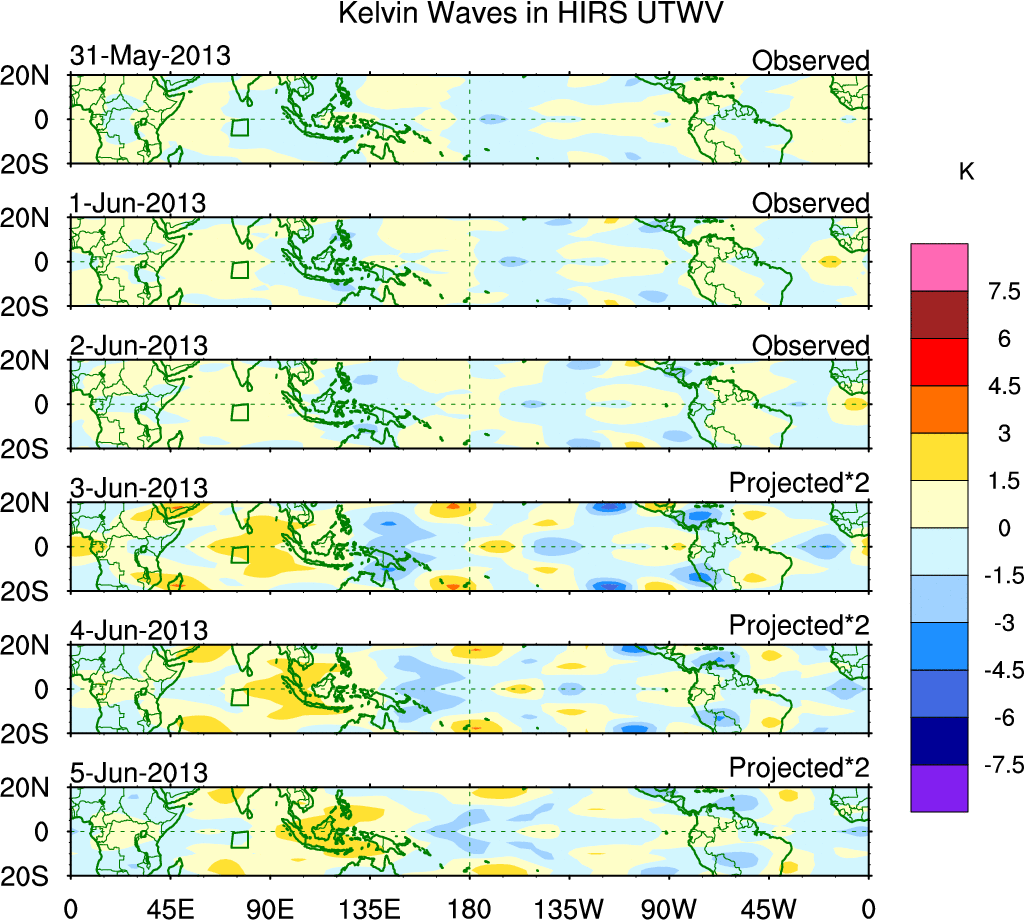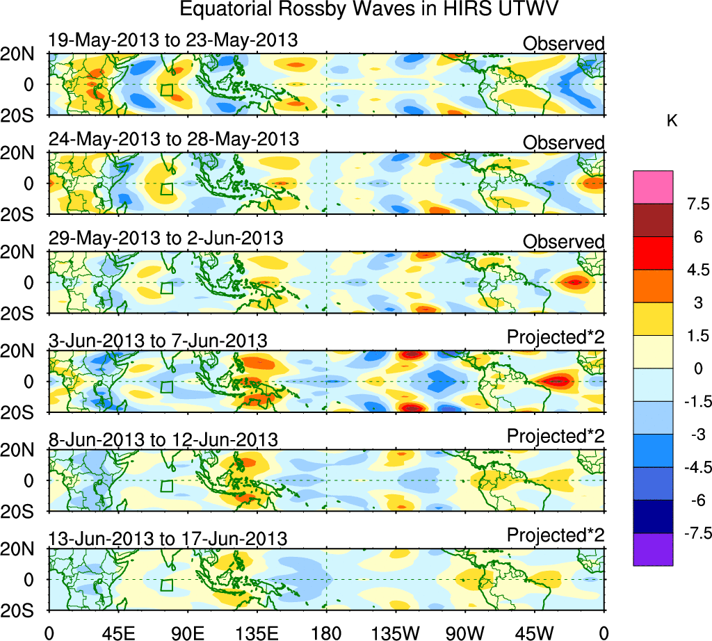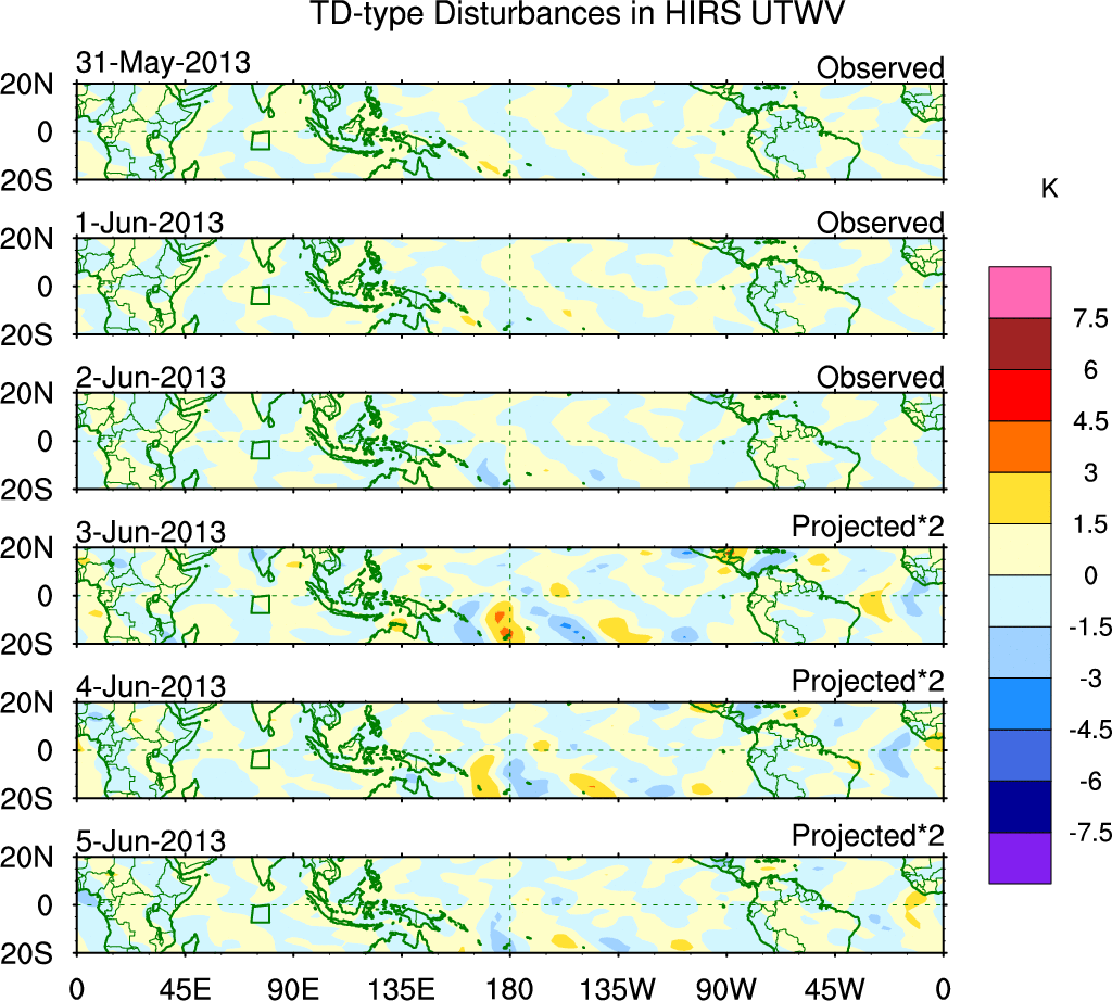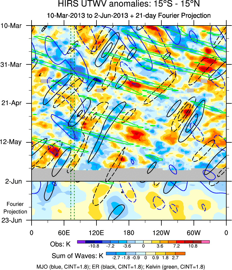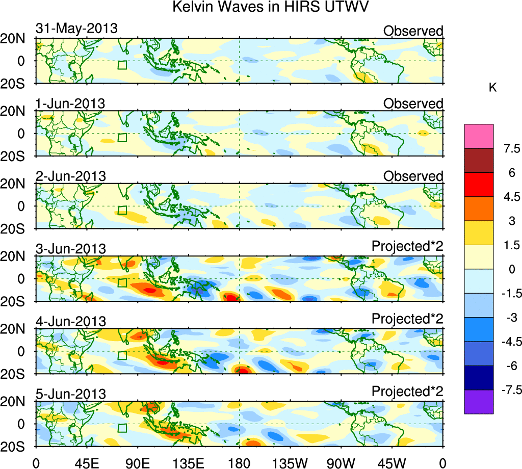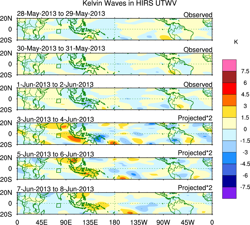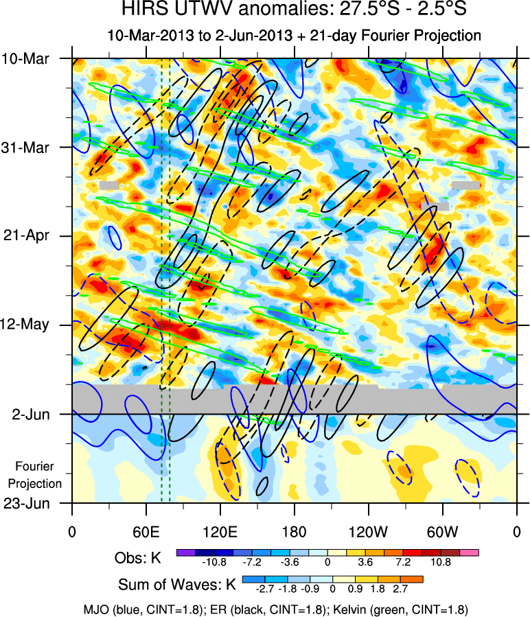 To identify tropical waves in near real-time, the OLR and UTWV data are filtered following Wheeler & Weickmann (2001 MWR). The daily anomalies are calculated using the first 3 harmonics of the seasonal cycle for 1979–2009. Missing values are then filled using linear interpolation in space and time. The most recent 365 days of anomalies are padded with 659 days of zeroes, and the result is filtered for each wave type.