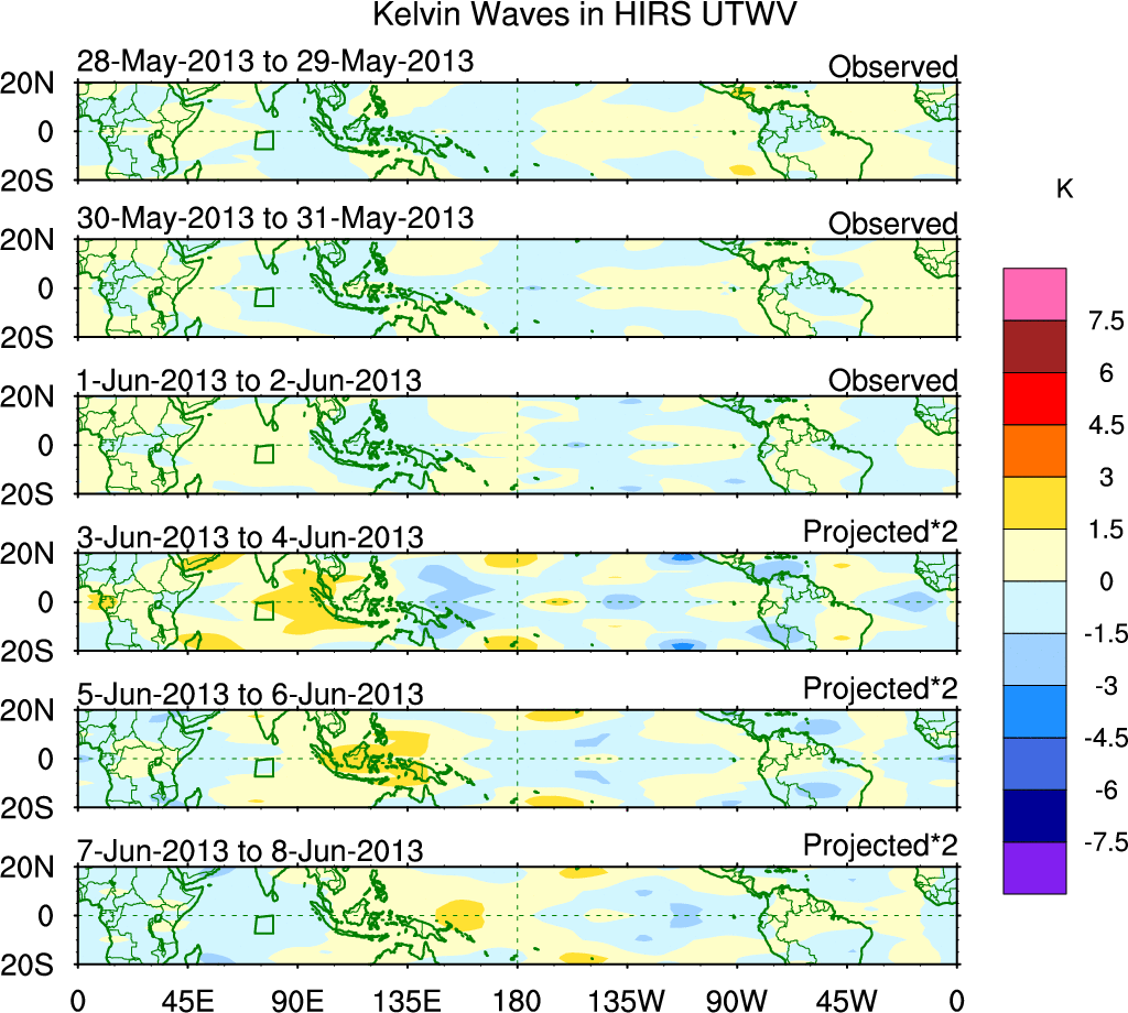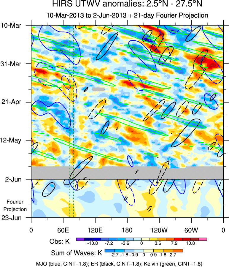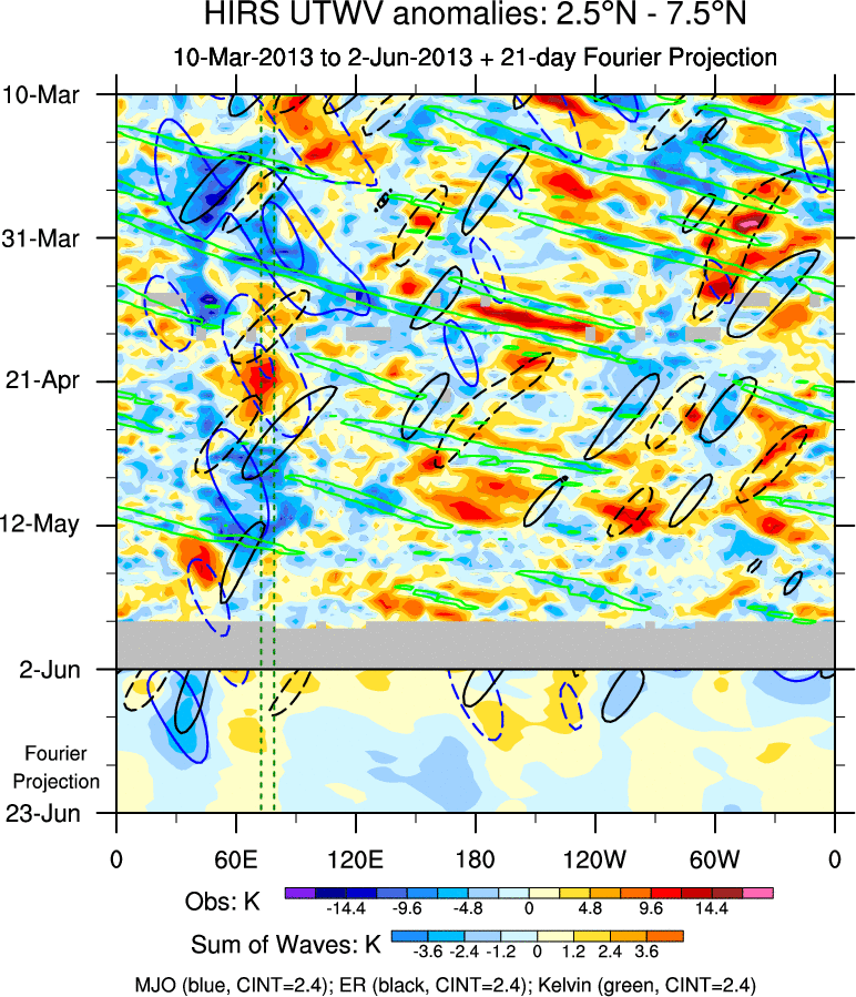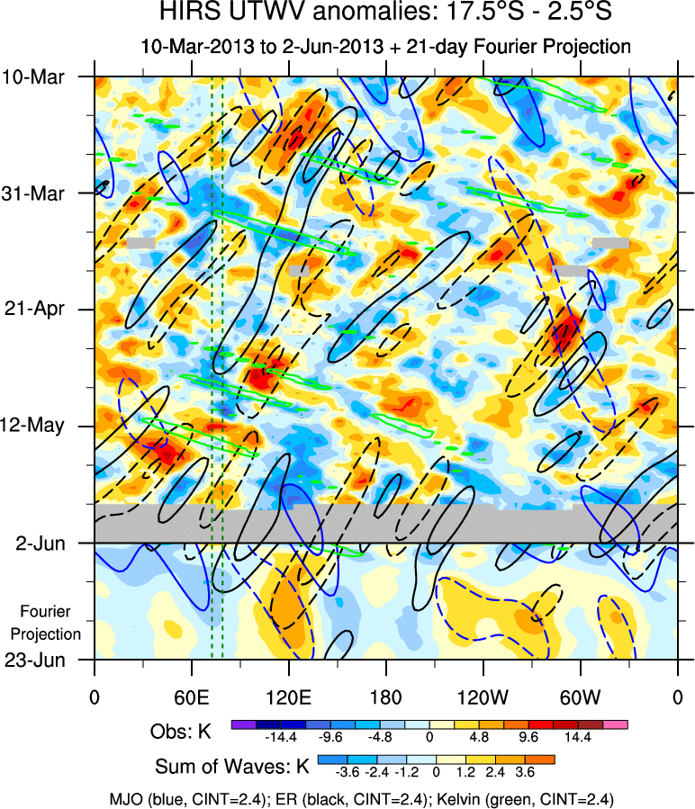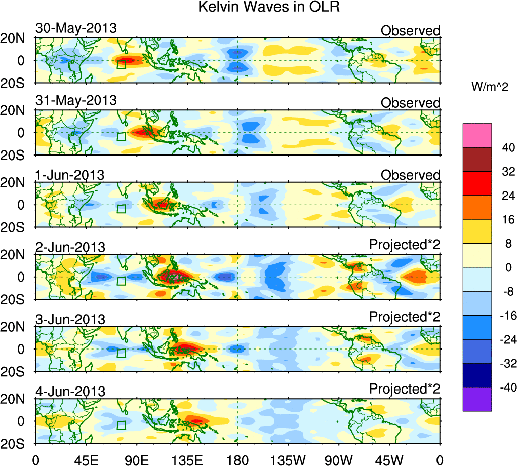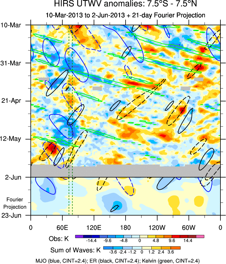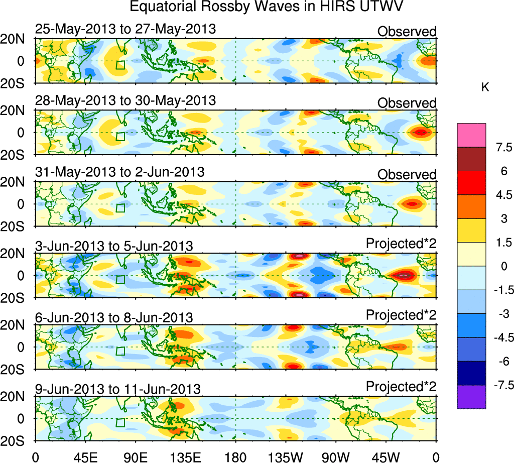 To identify tropical waves in near real-time, the OLR and UTWV data are filtered following Wheeler & Weickmann (2001 MWR). The daily anomalies are calculated using the first 3 harmonics of the seasonal cycle for 1979–2009. Missing values are then filled using linear interpolation in space and time. The most recent 365 days of anomalies are padded with 659 days of zeroes, and the result is filtered for each wave type.