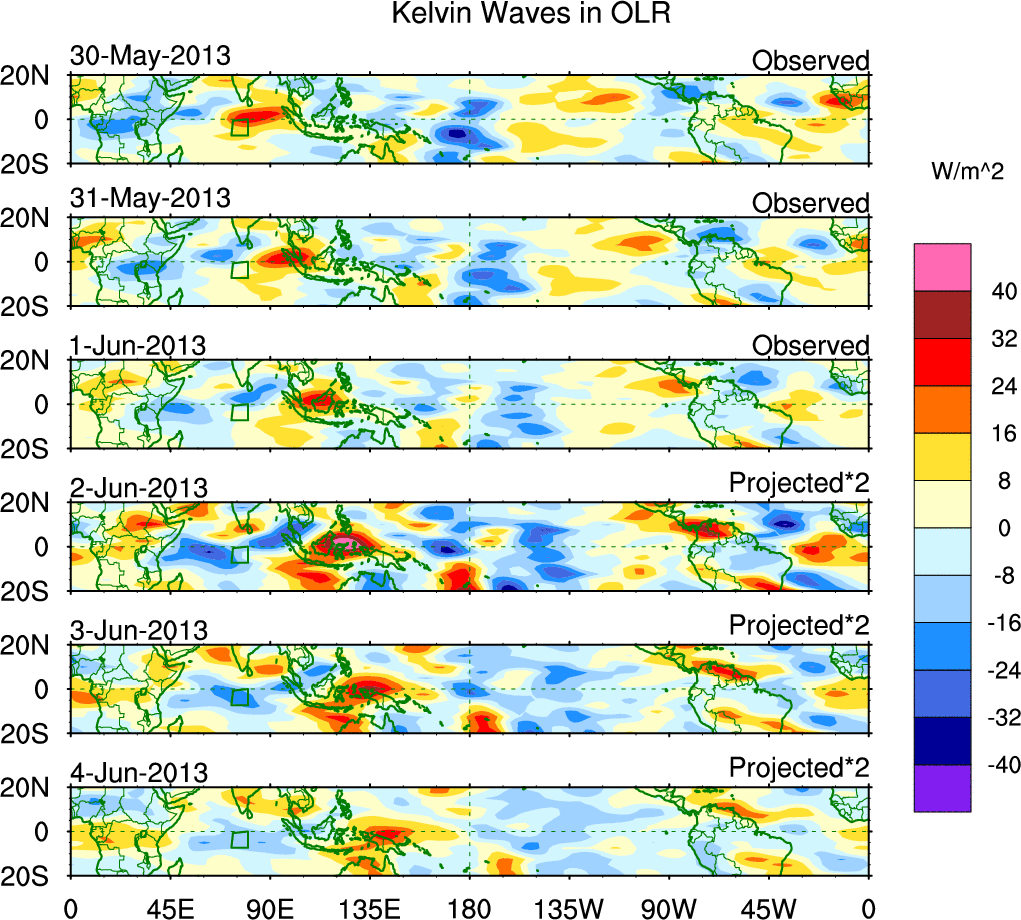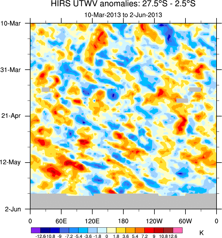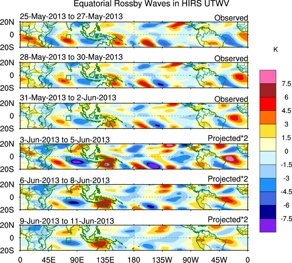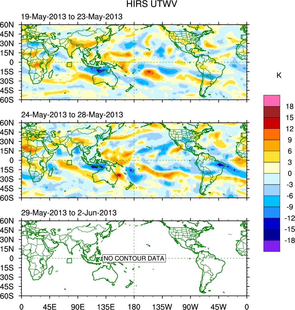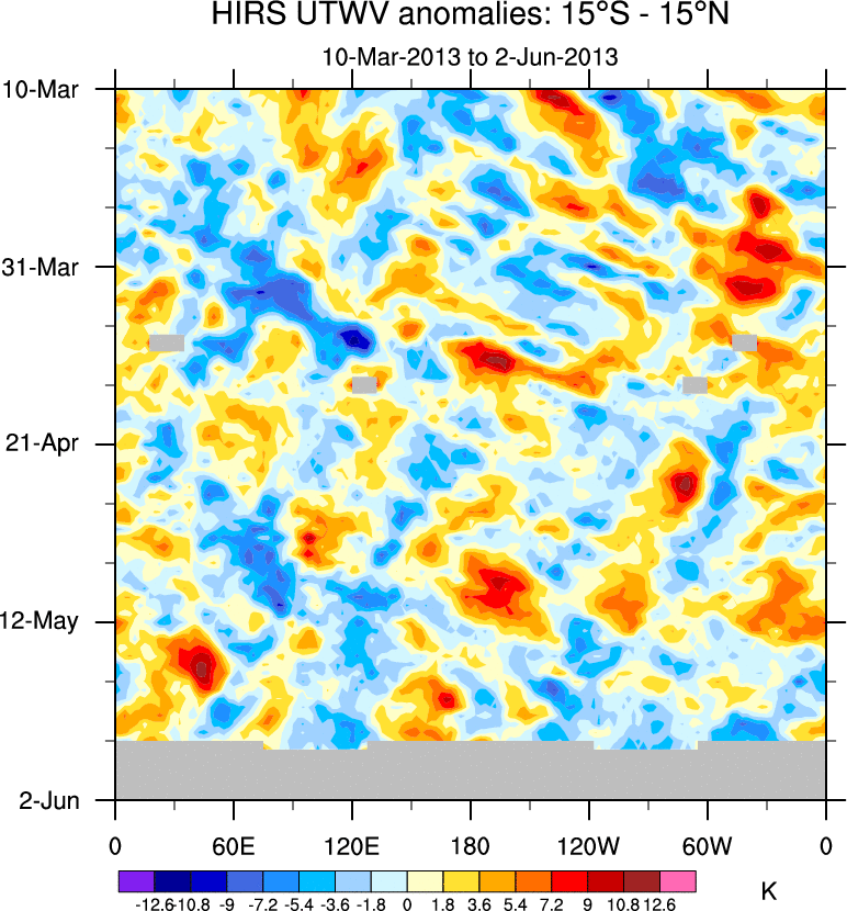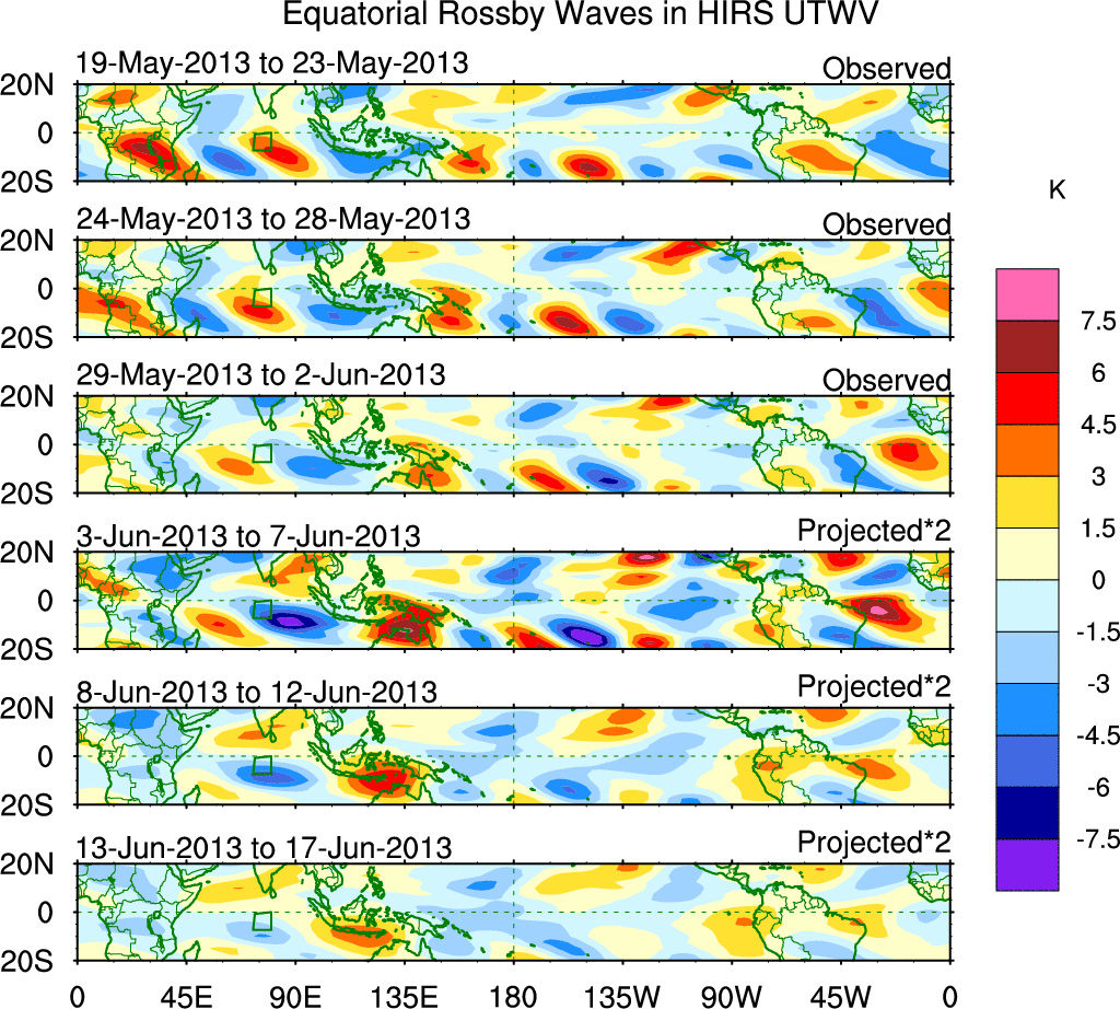 To identify tropical waves in near real-time, the OLR and UTWV data are filtered following Wheeler & Weickmann (2001 MWR). The daily anomalies are calculated using the first 3 harmonics of the seasonal cycle for 1979–2009. Missing values are then filled using linear interpolation in space and time. The most recent 365 days of anomalies are padded with 659 days of zeroes, and the result is filtered for each wave type.