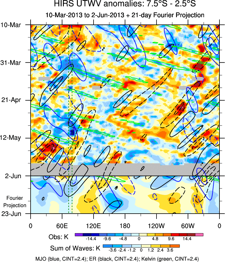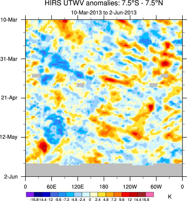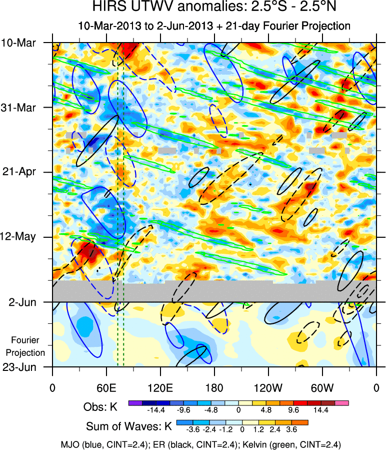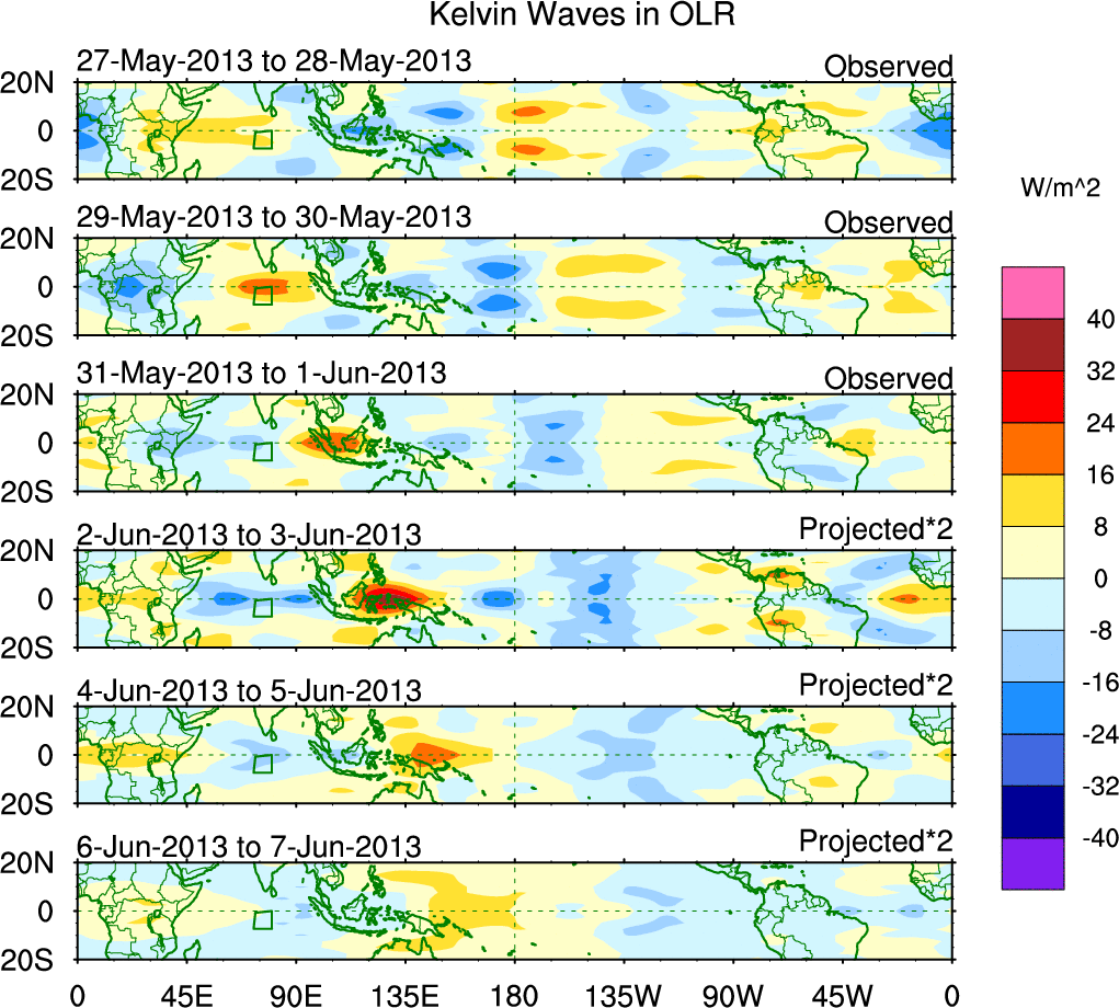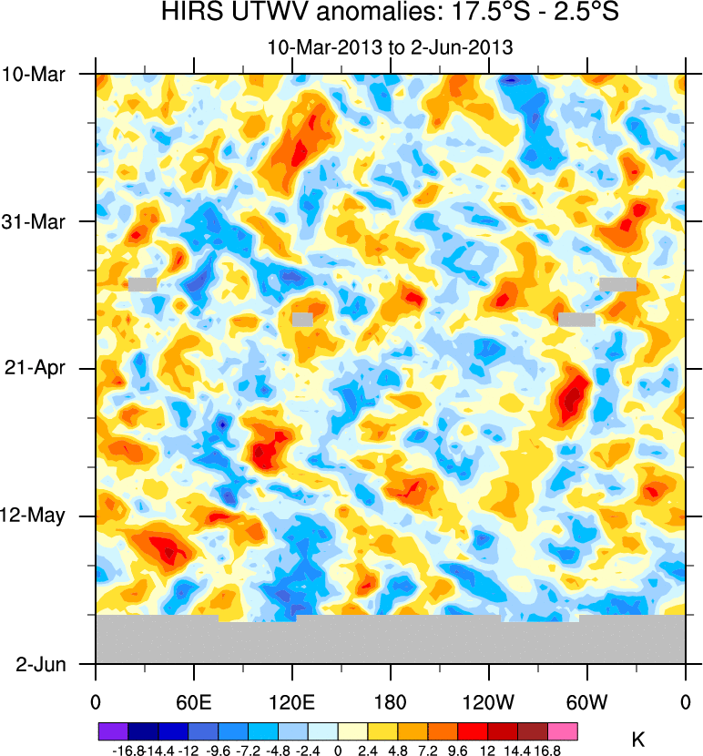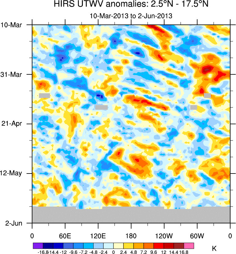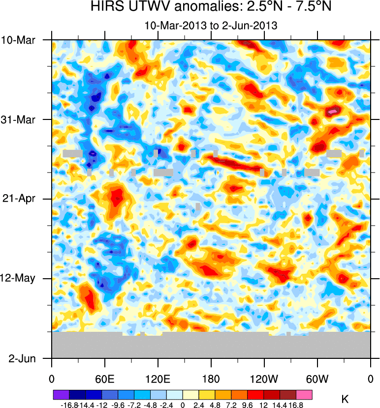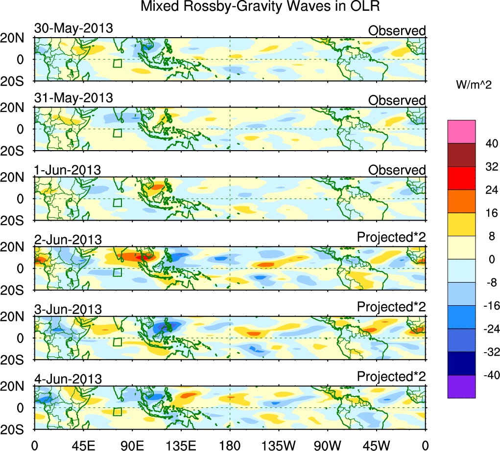 To identify tropical waves in near real-time, the OLR and UTWV data are filtered following Wheeler & Weickmann (2001 MWR). The daily anomalies are calculated using the first 3 harmonics of the seasonal cycle for 1979–2009. Missing values are then filled using linear interpolation in space and time. The most recent 365 days of anomalies are padded with 659 days of zeroes, and the result is filtered for each wave type.