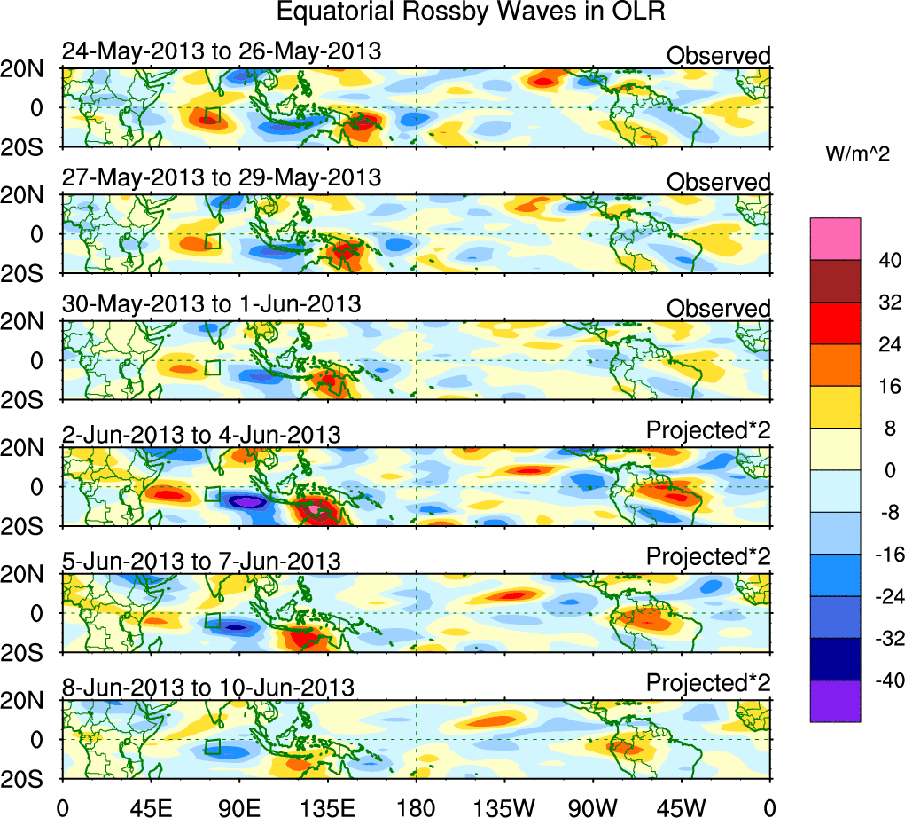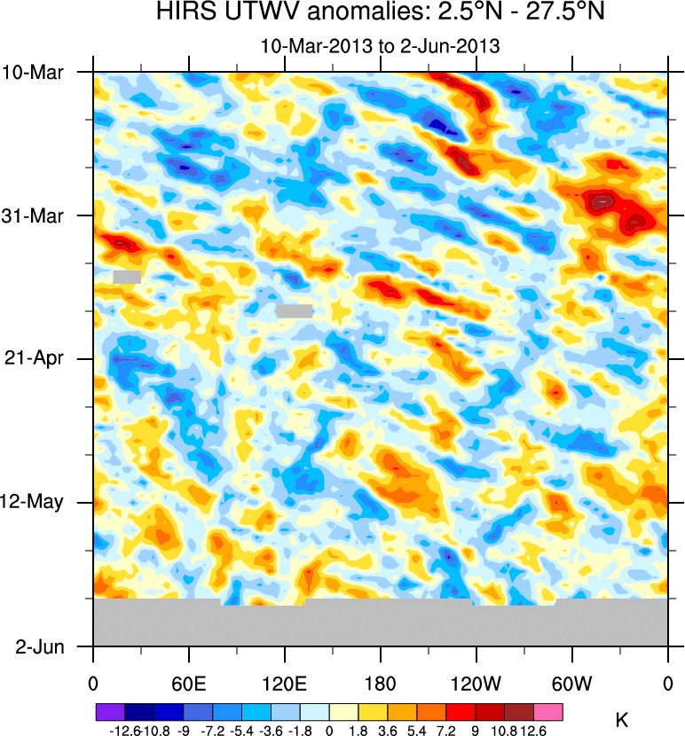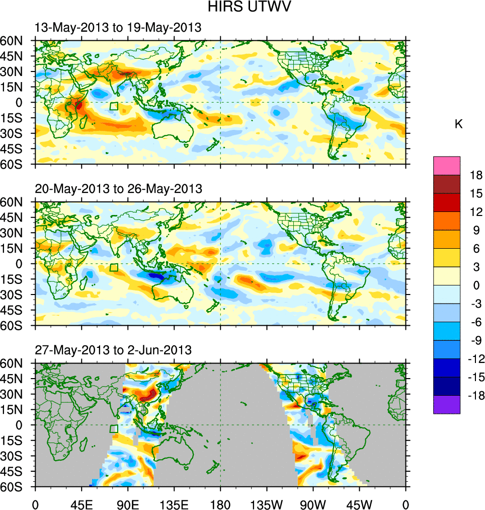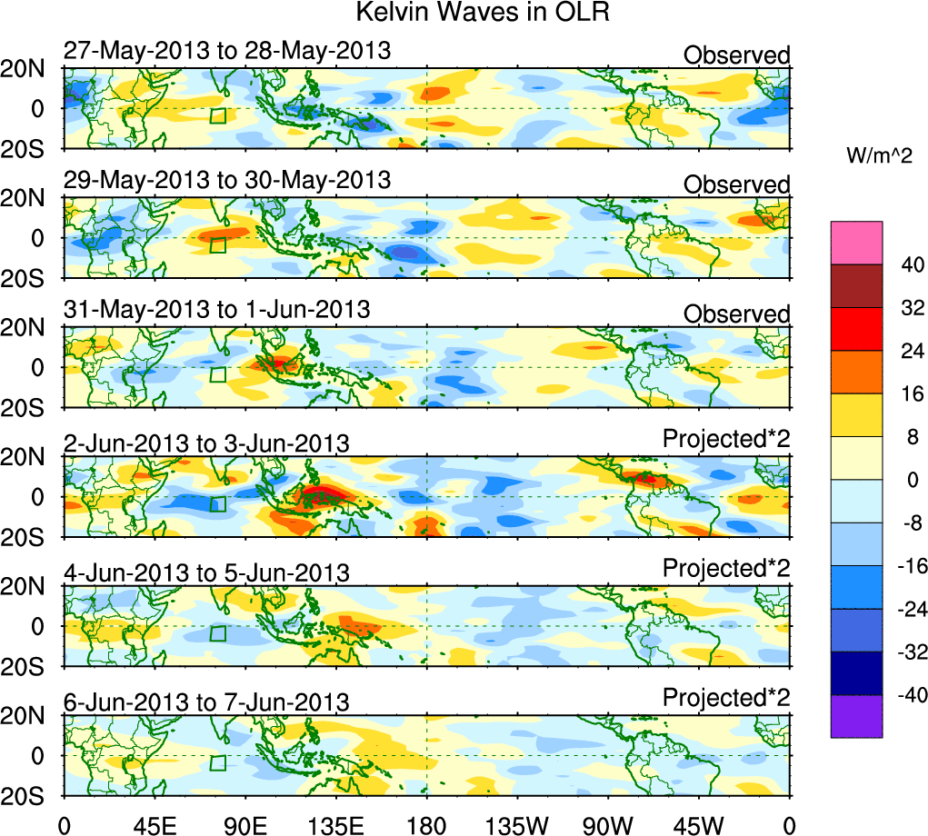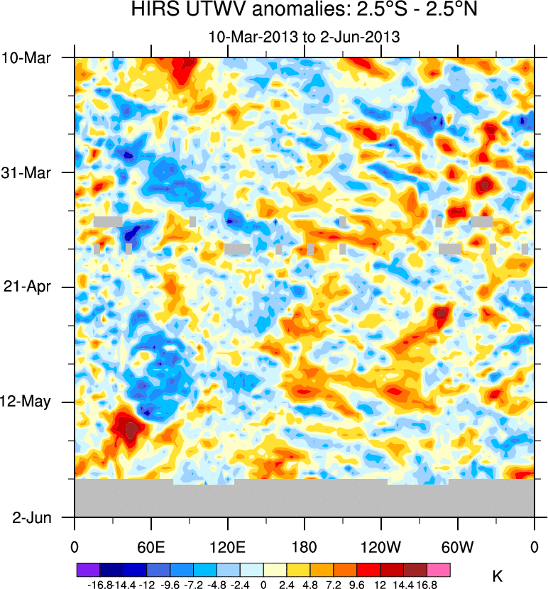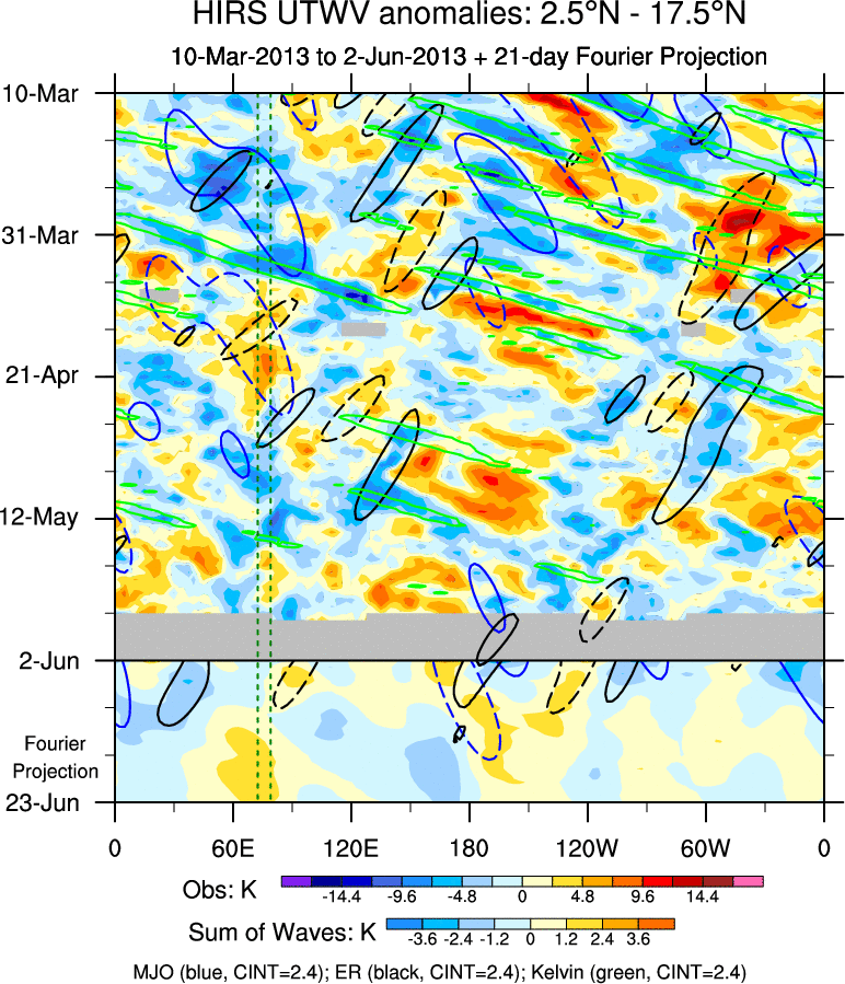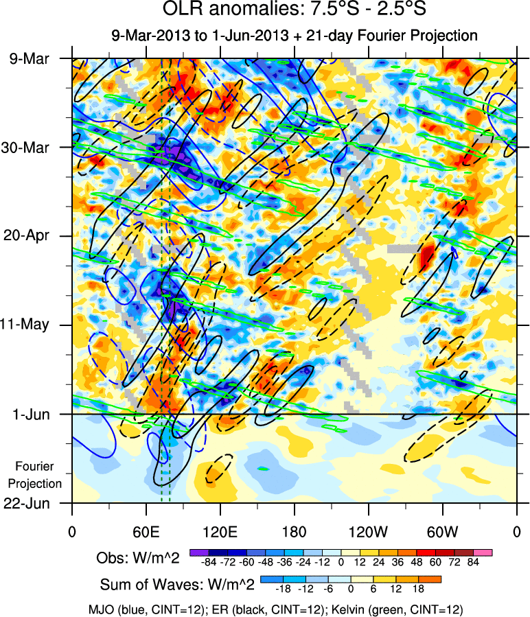 To identify tropical waves in near real-time, the OLR and UTWV data are filtered following Wheeler & Weickmann (2001 MWR). The daily anomalies are calculated using the first 3 harmonics of the seasonal cycle for 1979–2009. Missing values are then filled using linear interpolation in space and time. The most recent 365 days of anomalies are padded with 659 days of zeroes, and the result is filtered for each wave type.