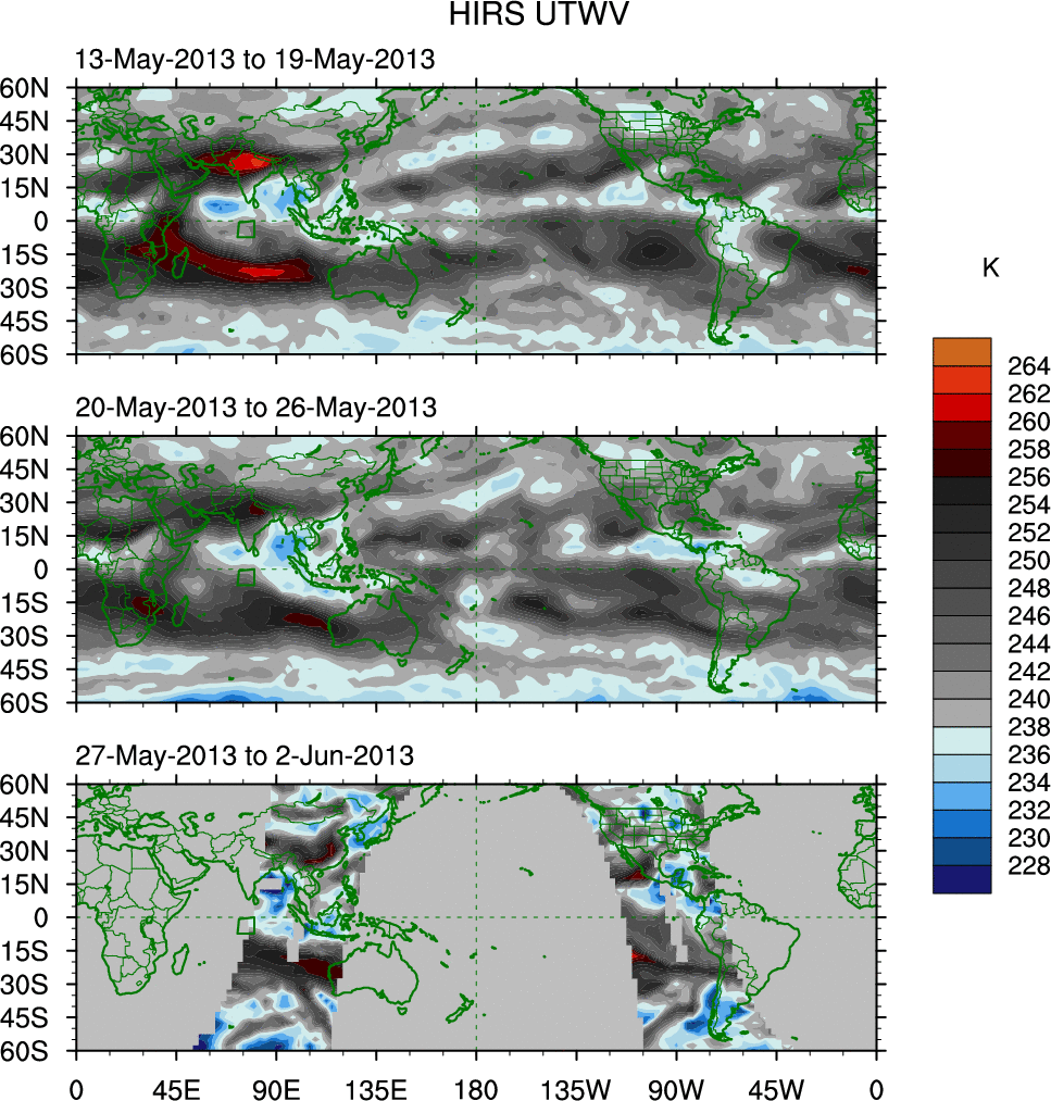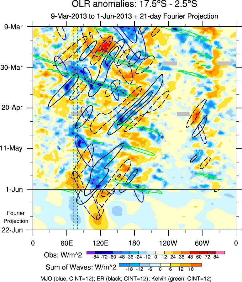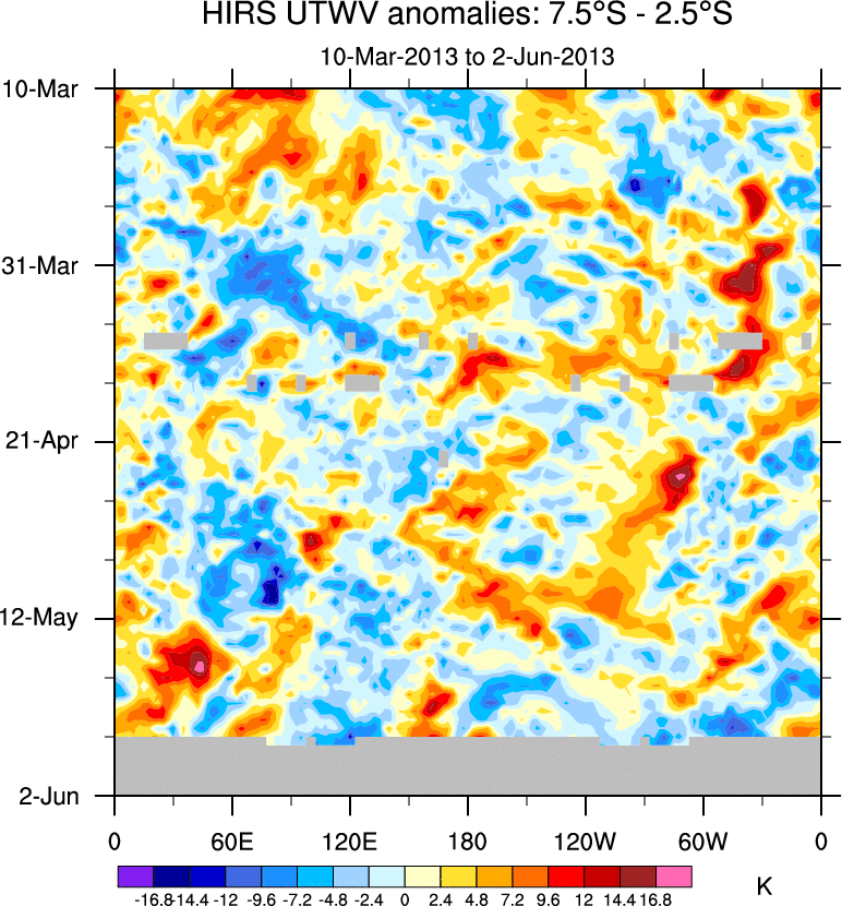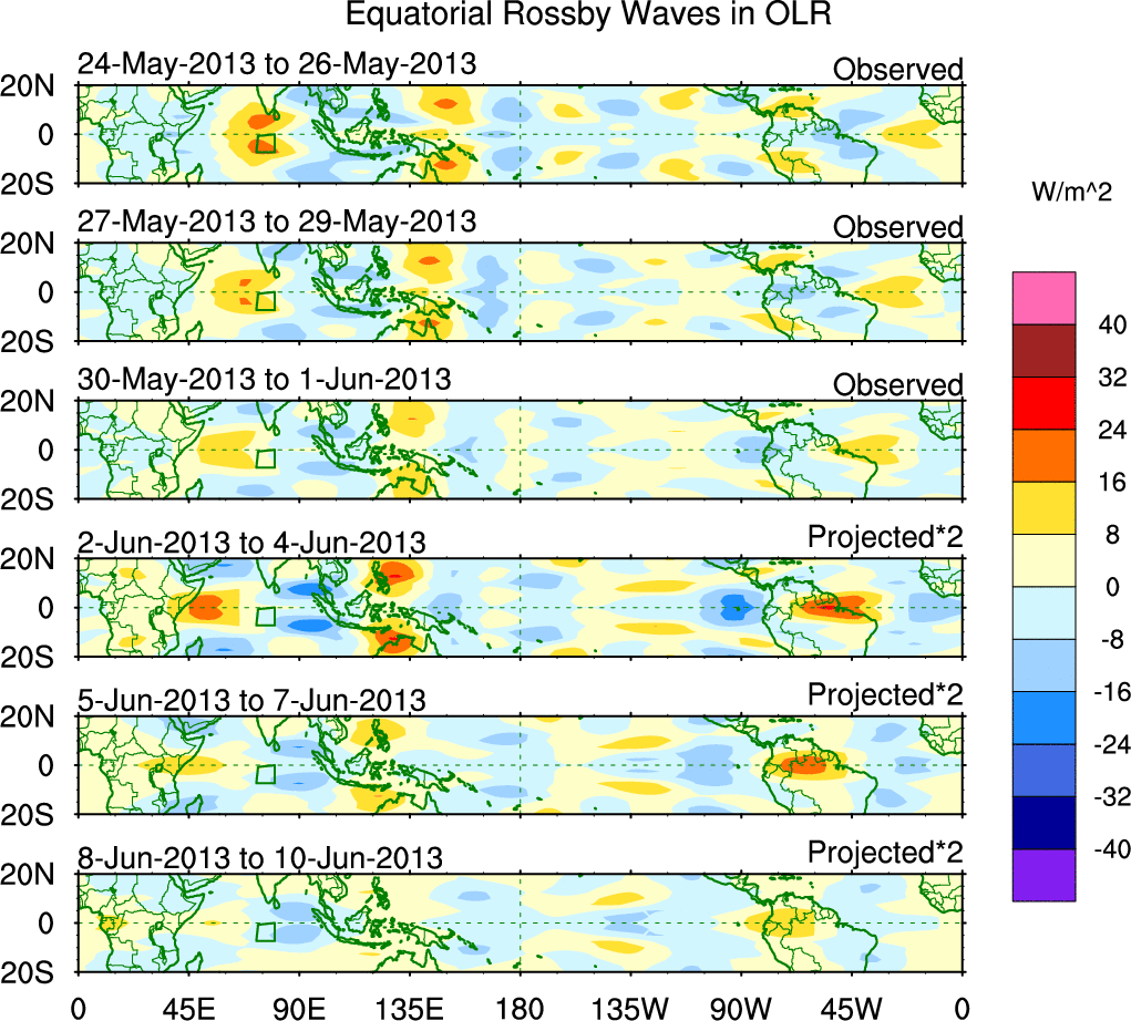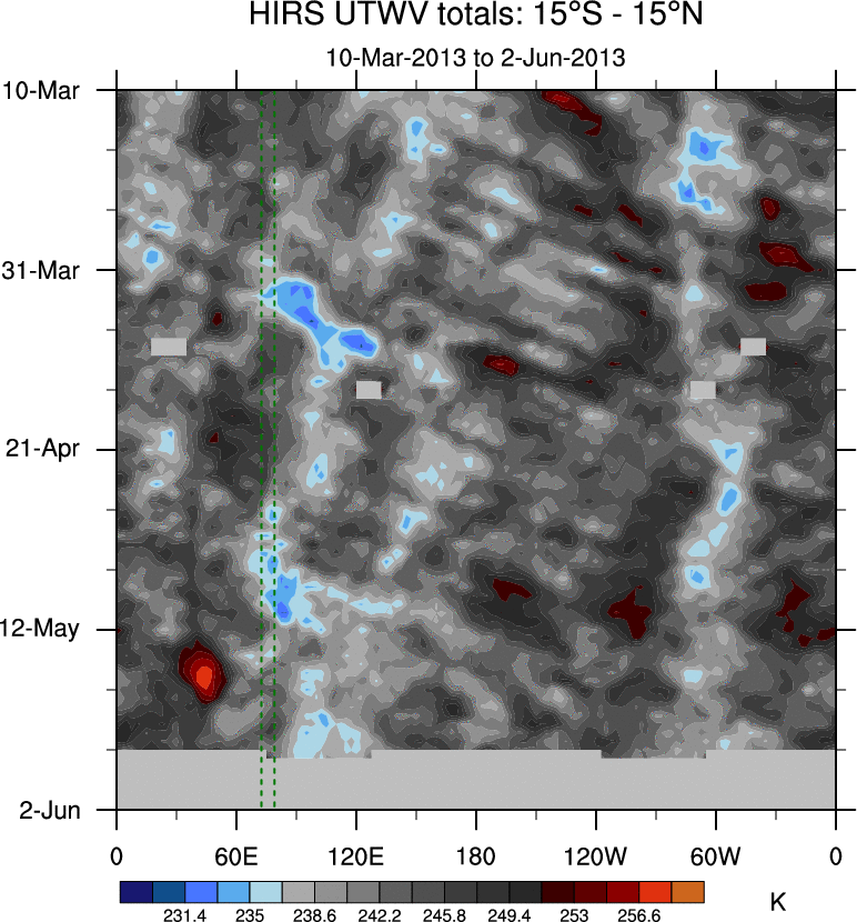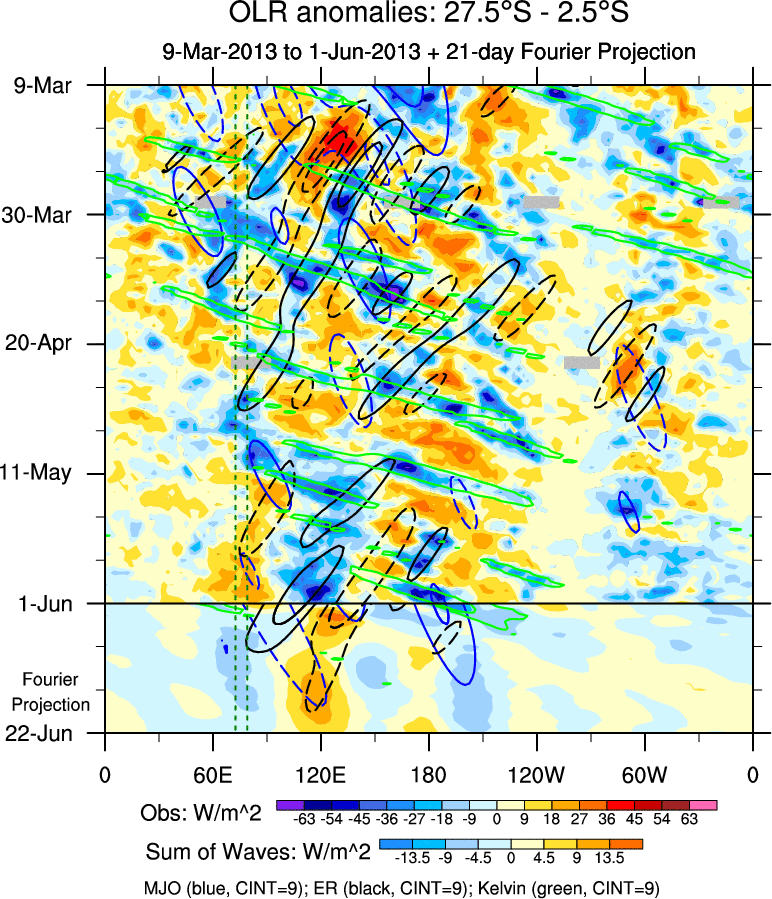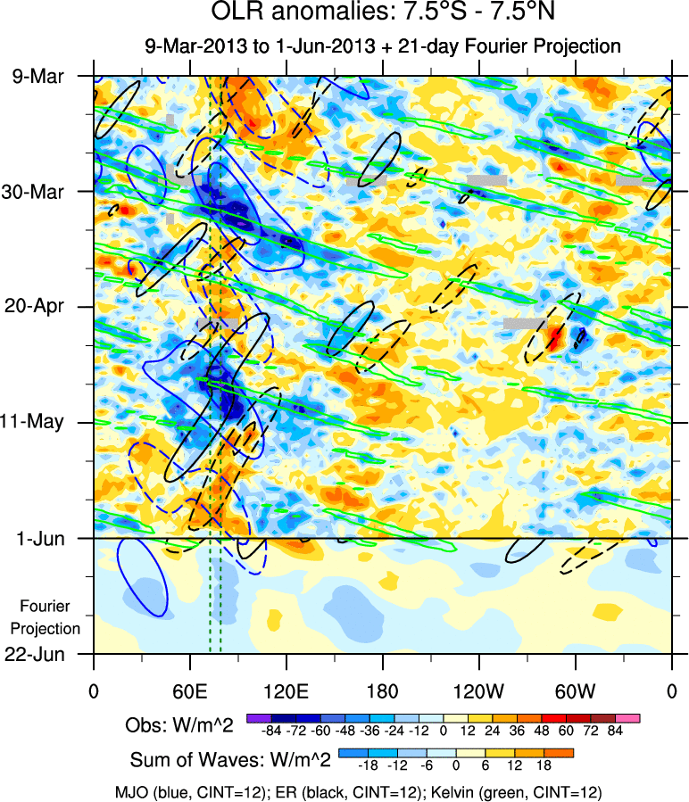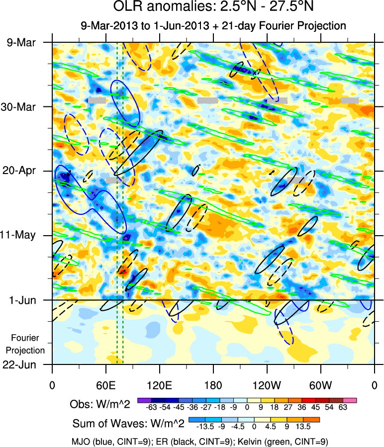 To identify tropical waves in near real-time, the OLR and UTWV data are filtered following Wheeler & Weickmann (2001 MWR). The daily anomalies are calculated using the first 3 harmonics of the seasonal cycle for 1979–2009. Missing values are then filled using linear interpolation in space and time. The most recent 365 days of anomalies are padded with 659 days of zeroes, and the result is filtered for each wave type.