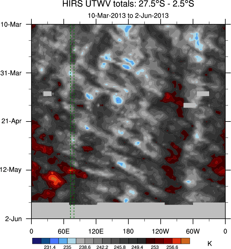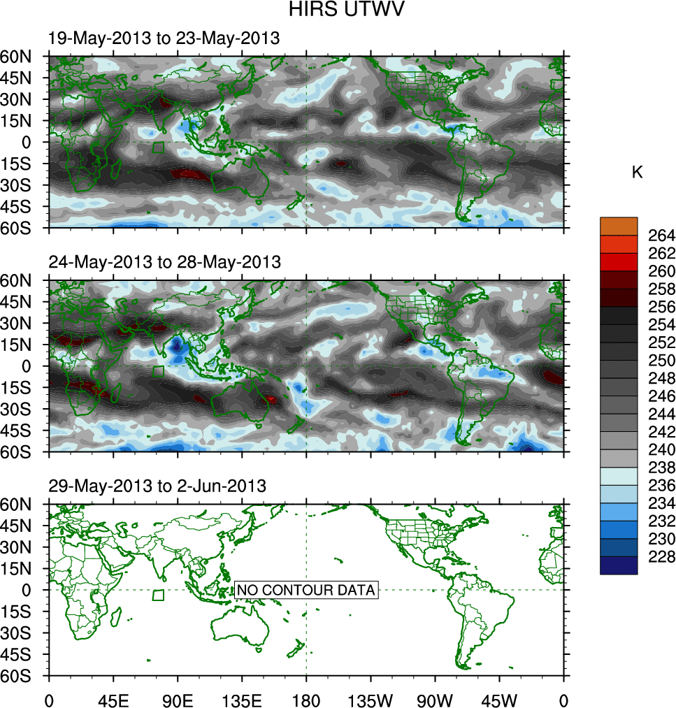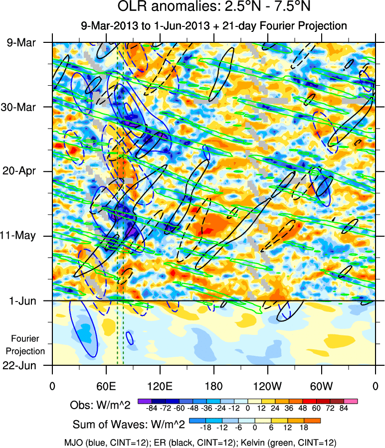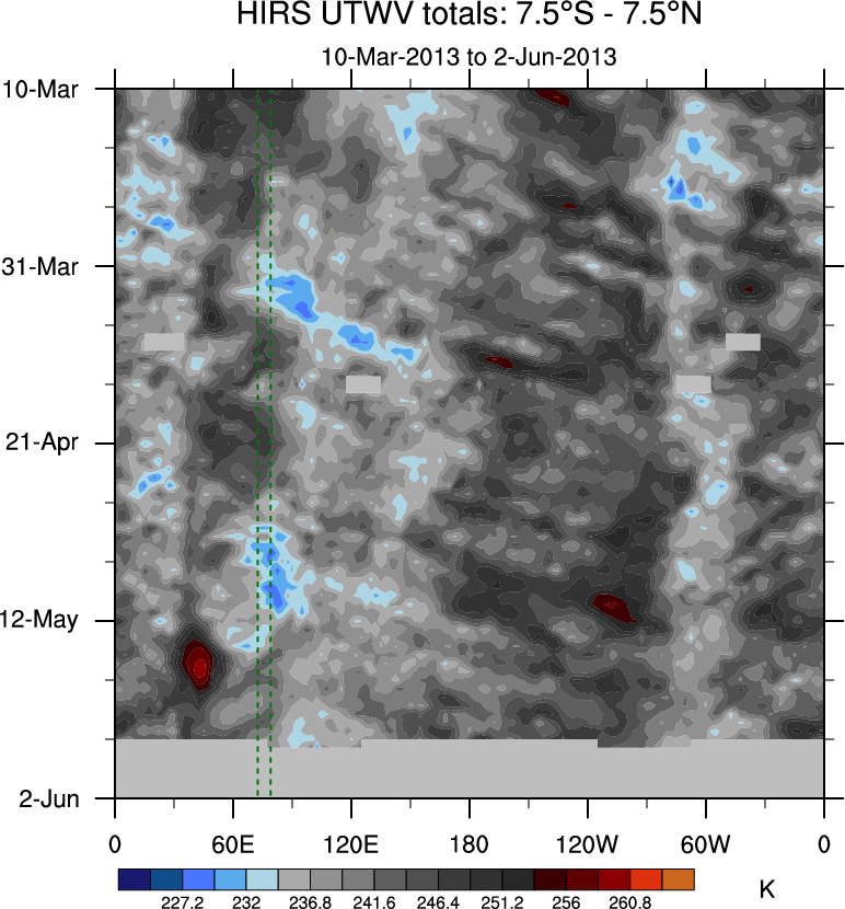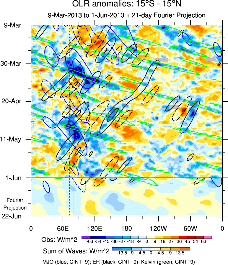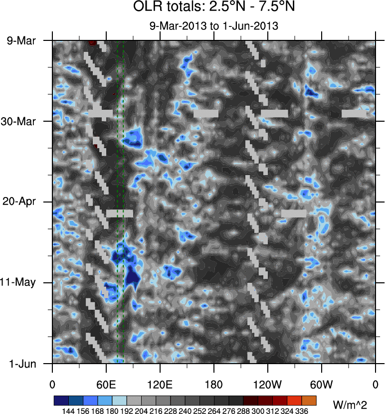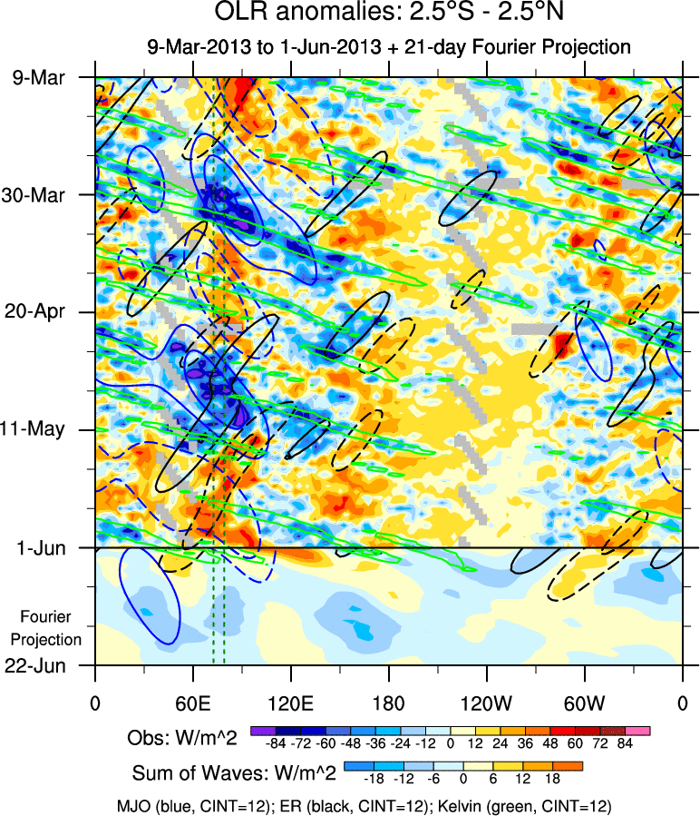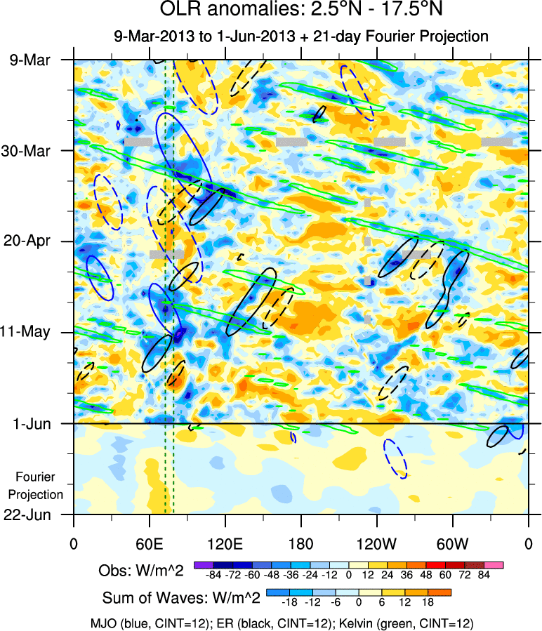 To identify tropical waves in near real-time, the OLR and UTWV data are filtered following Wheeler & Weickmann (2001 MWR). The daily anomalies are calculated using the first 3 harmonics of the seasonal cycle for 1979–2009. Missing values are then filled using linear interpolation in space and time. The most recent 365 days of anomalies are padded with 659 days of zeroes, and the result is filtered for each wave type.
