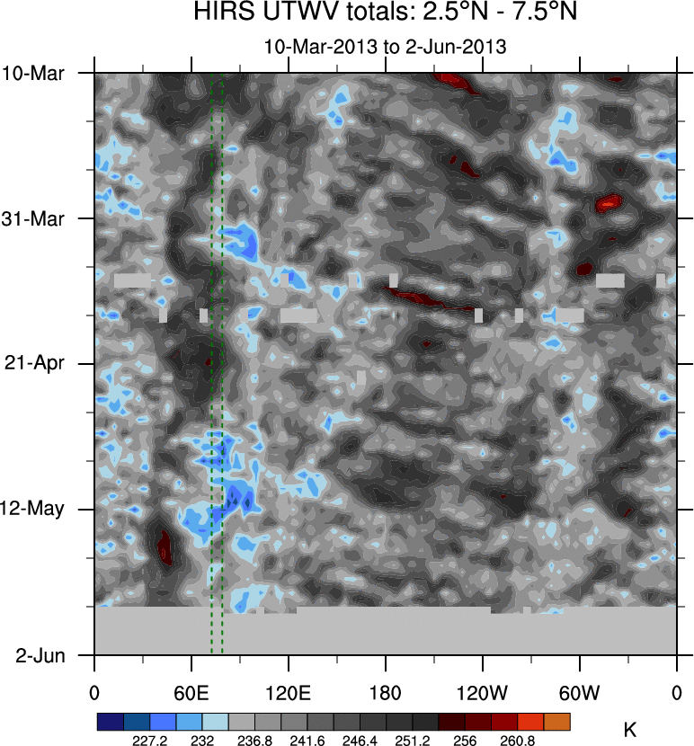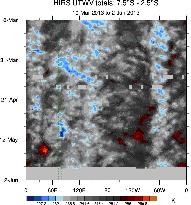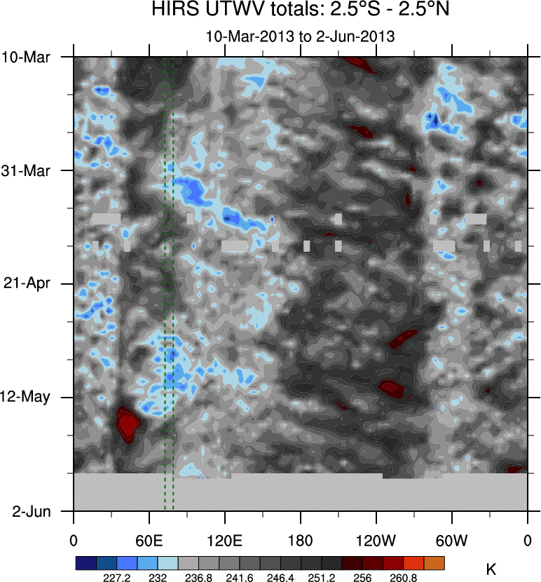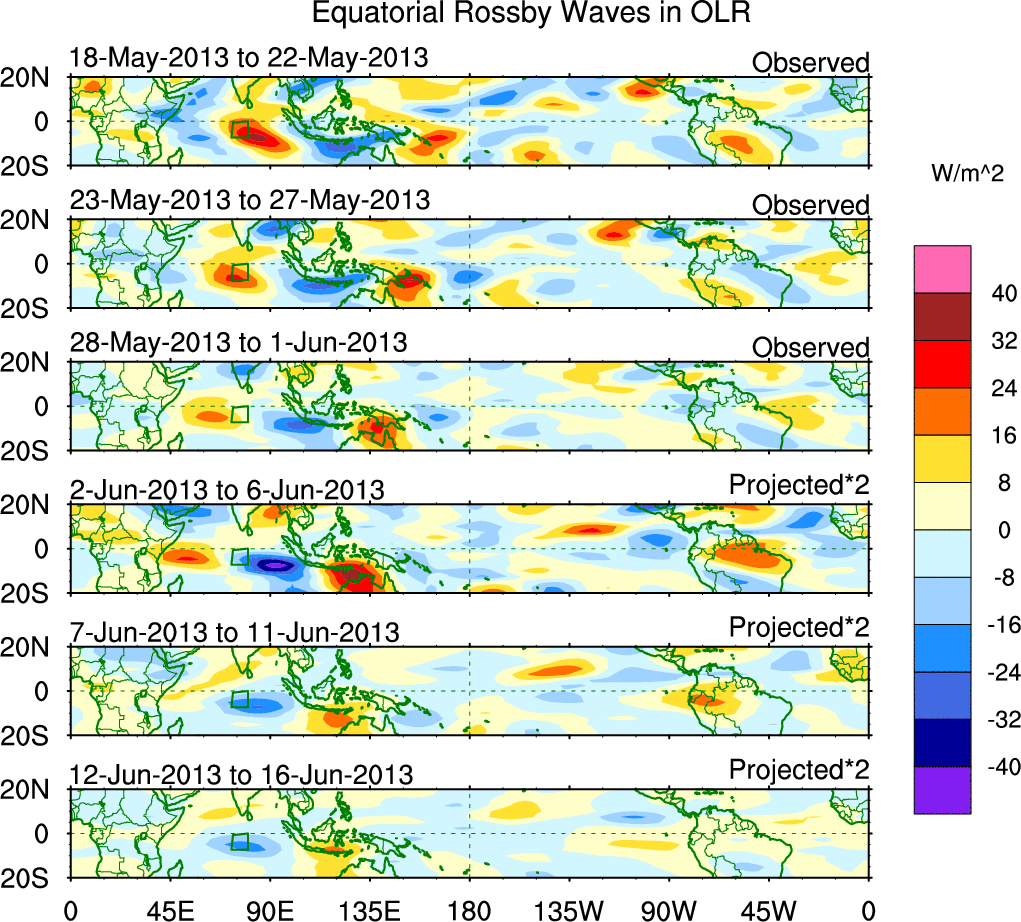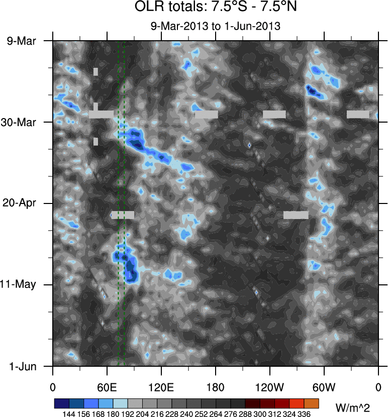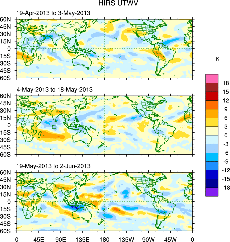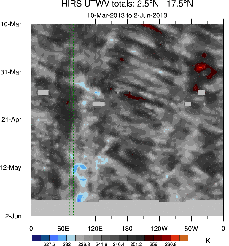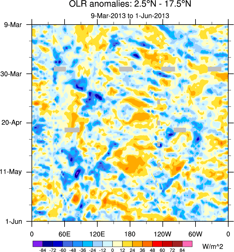 To identify tropical waves in near real-time, the OLR and UTWV data are filtered following Wheeler & Weickmann (2001 MWR). The daily anomalies are calculated using the first 3 harmonics of the seasonal cycle for 1979–2009. Missing values are then filled using linear interpolation in space and time. The most recent 365 days of anomalies are padded with 659 days of zeroes, and the result is filtered for each wave type.