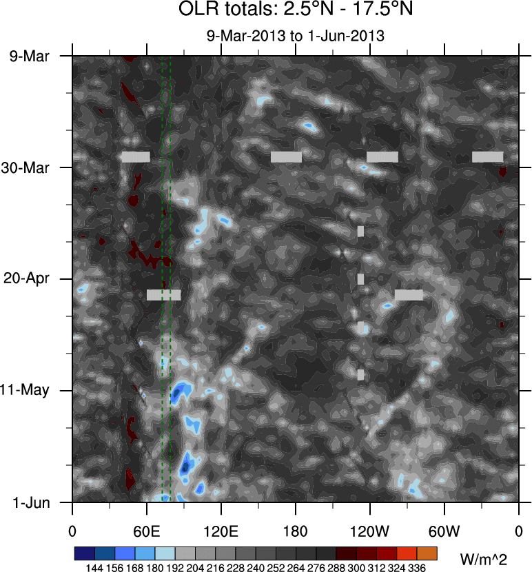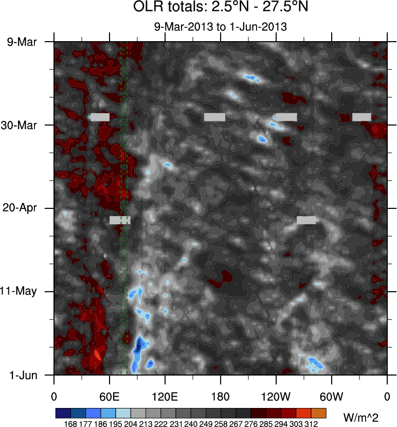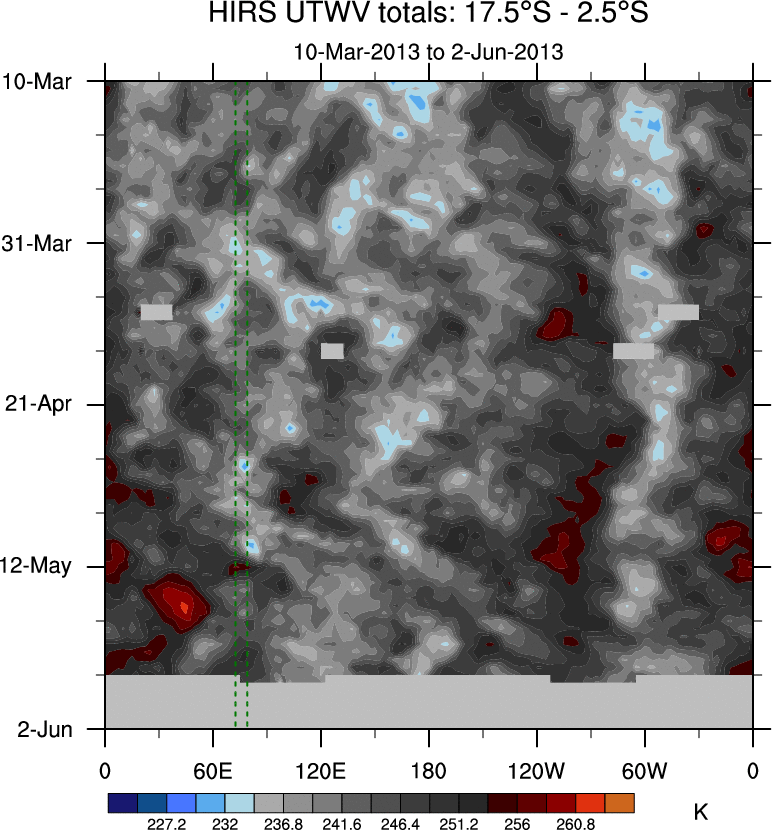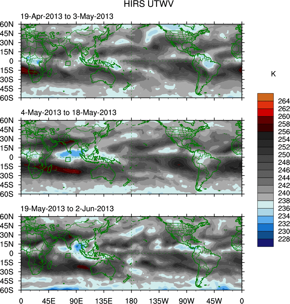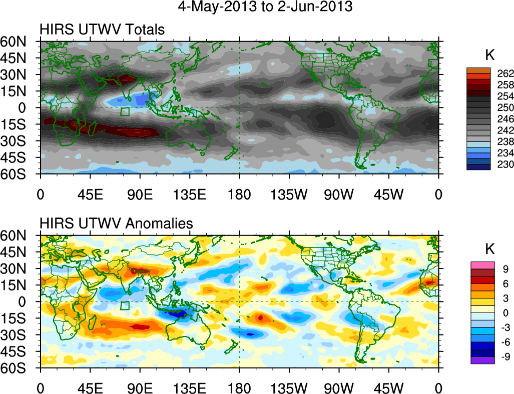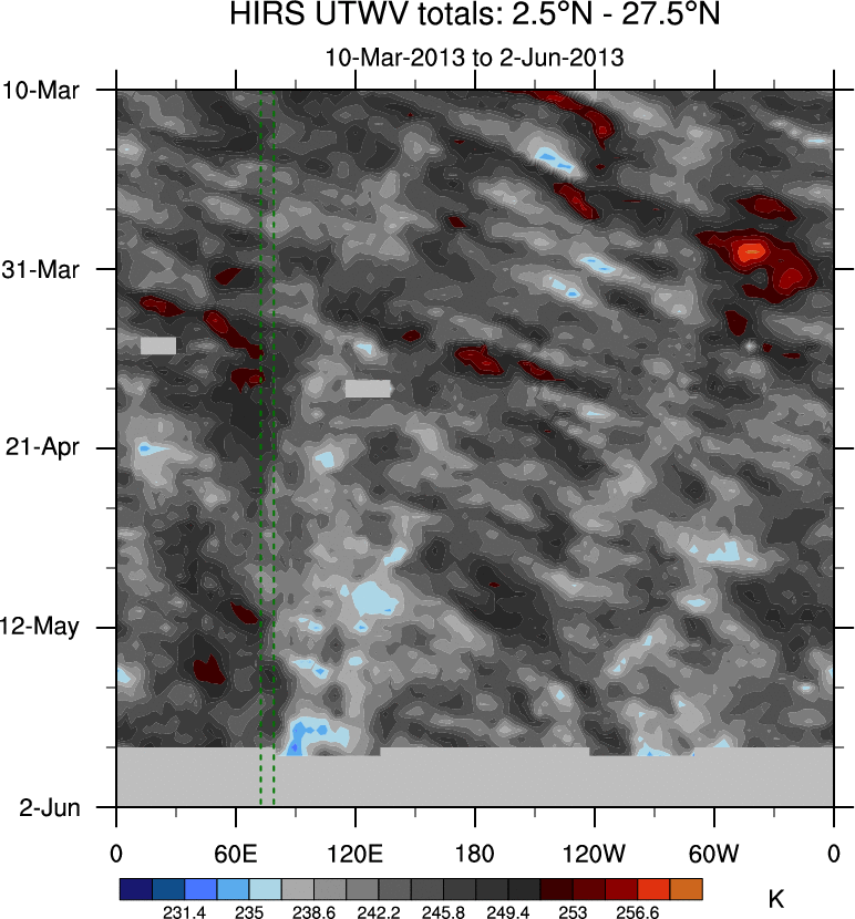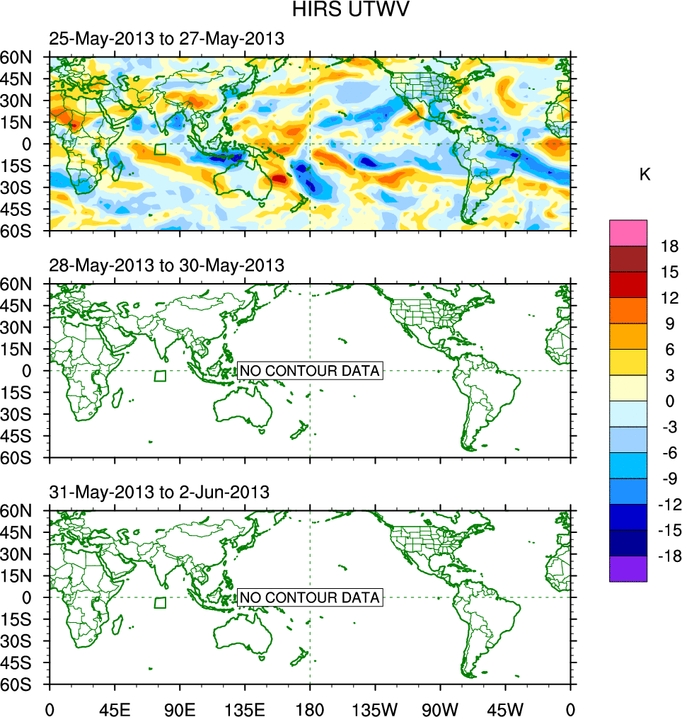 To identify tropical waves in near real-time, the OLR and UTWV data are filtered following Wheeler & Weickmann (2001 MWR). The daily anomalies are calculated using the first 3 harmonics of the seasonal cycle for 1979–2009. Missing values are then filled using linear interpolation in space and time. The most recent 365 days of anomalies are padded with 659 days of zeroes, and the result is filtered for each wave type.