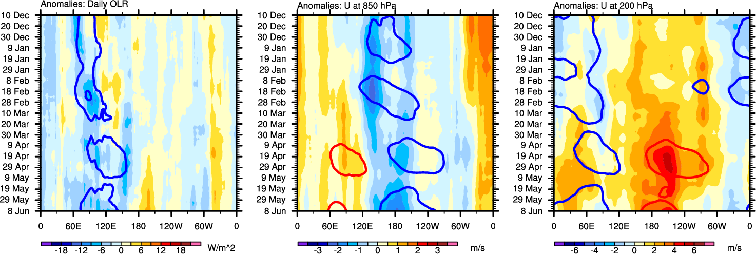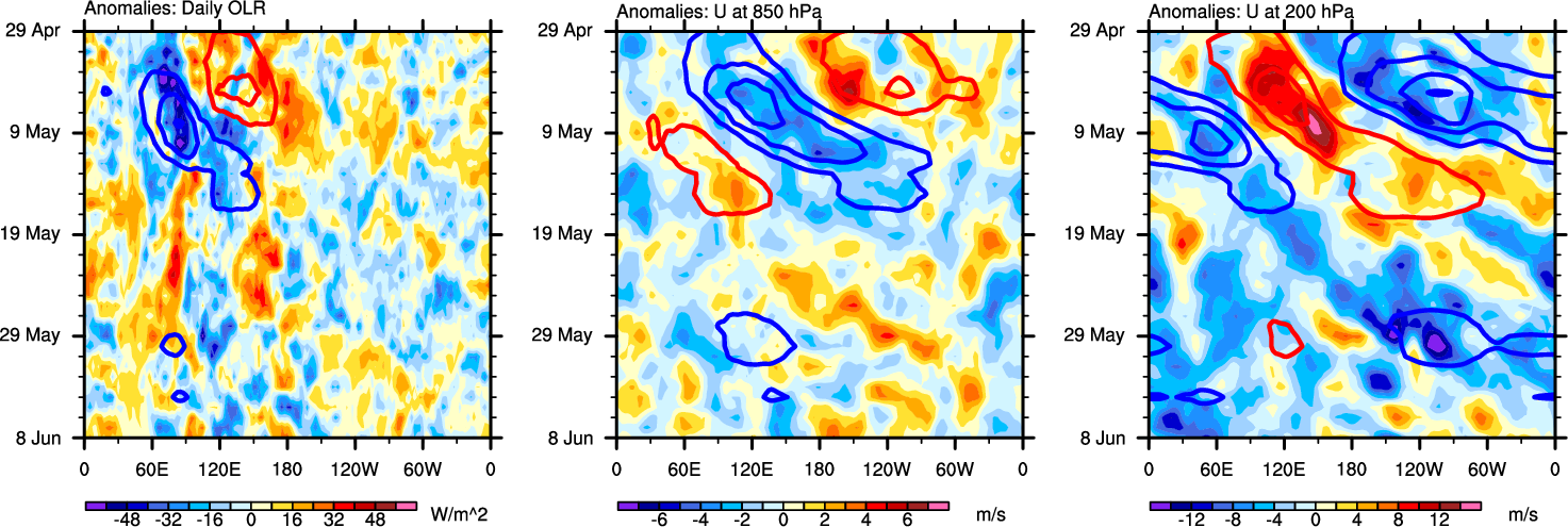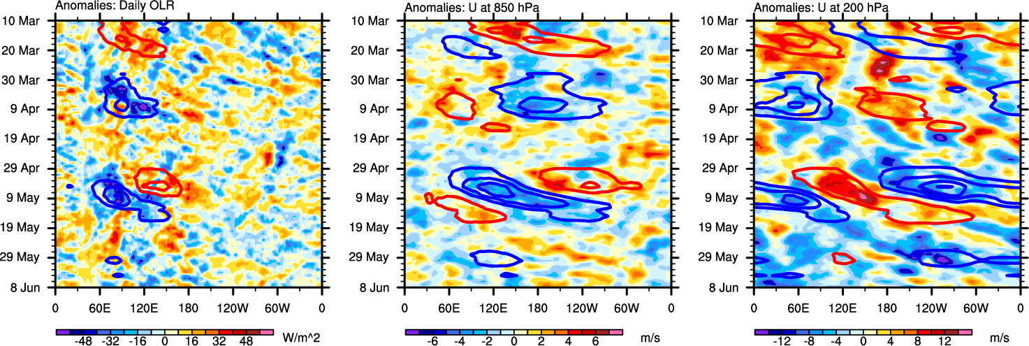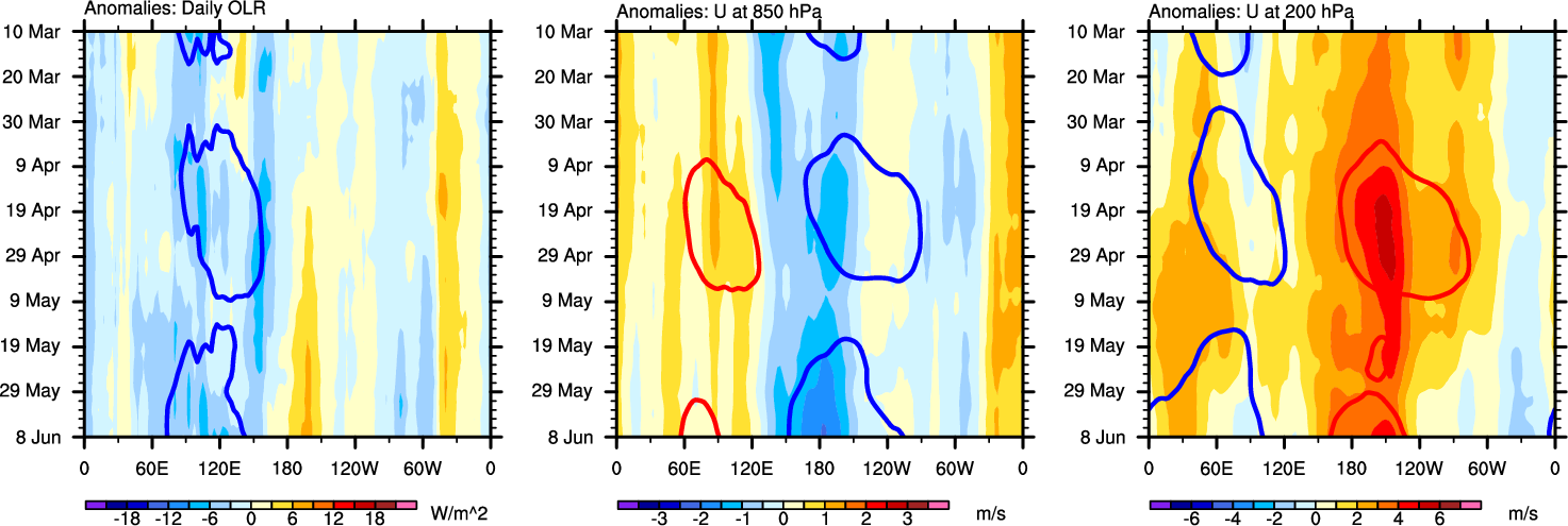 The Hovmollers show longitude-time plots for OLR, U-850, and U-200. The shading indicates the observed anomalies, while the contours are the projection of those anomalies onto the RMM EOFs.