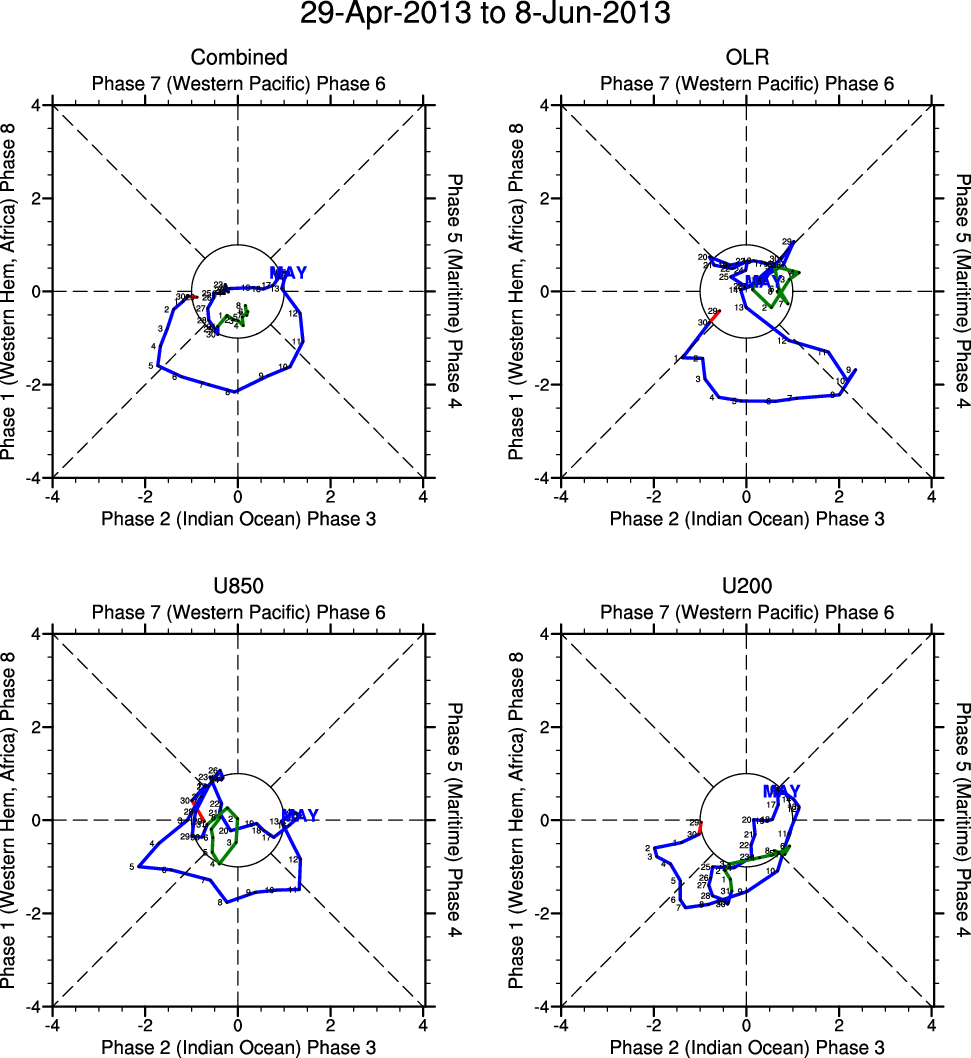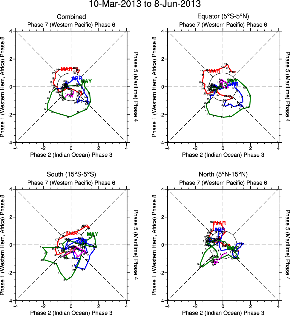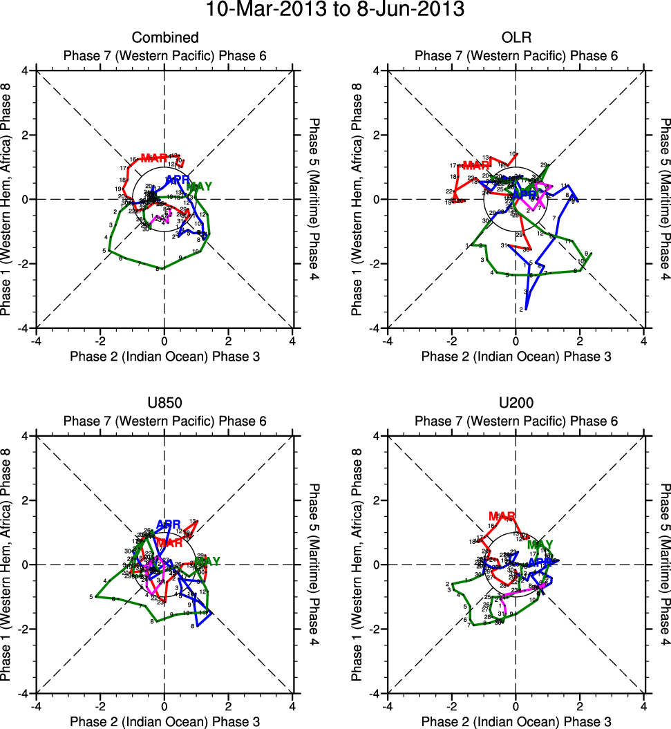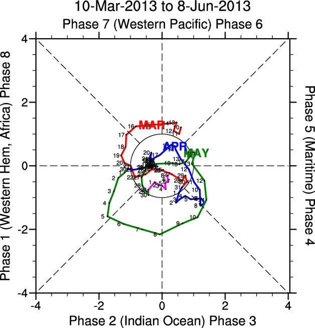 Wheeler and Hendon (2004) constructed the RMM index for monitoring the MJO. This index consists of the first two principal components (PCs) of OLR, 850-hPa zonal wind, and 200-hPa zonal wind averaged 15S-15N.