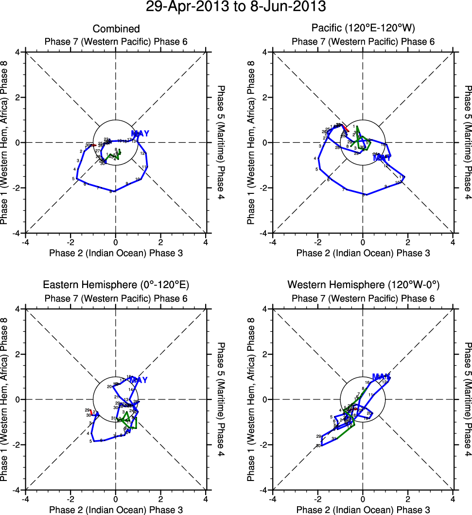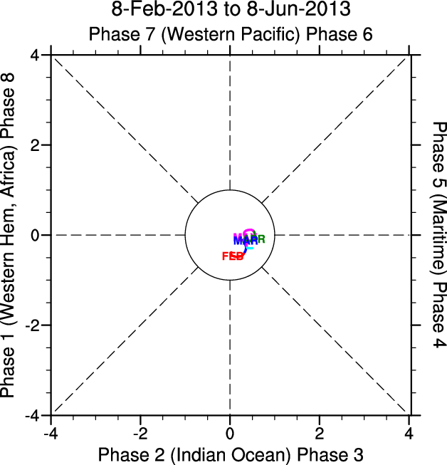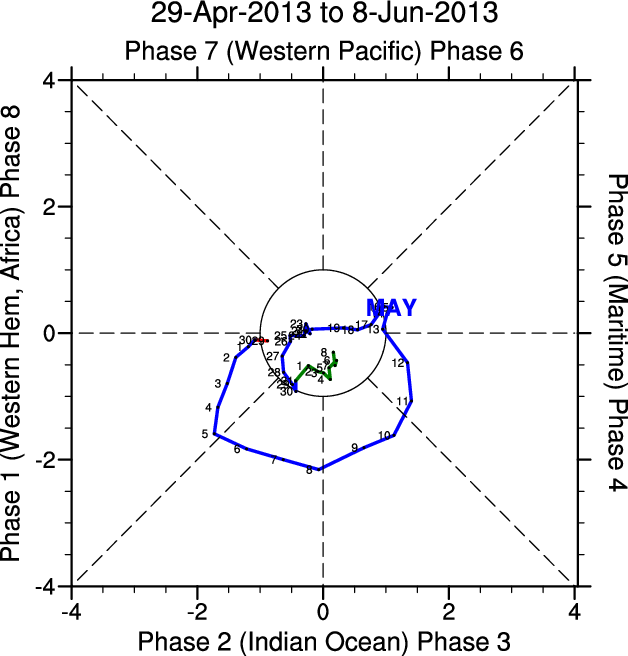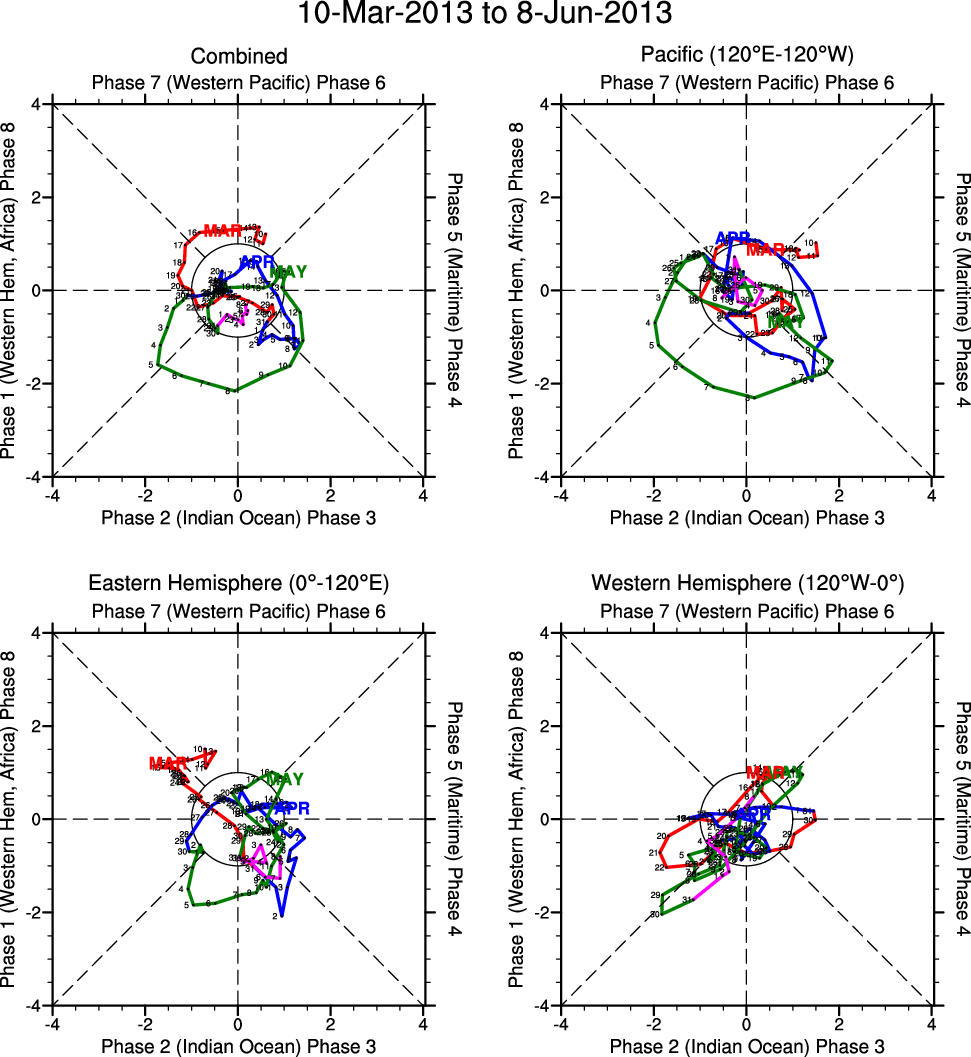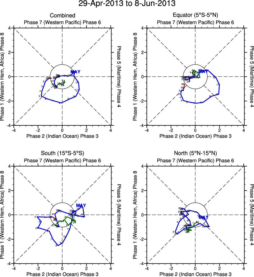 Wheeler and Hendon (2004) constructed the RMM index for monitoring the MJO. This index consists of the first two principal components (PCs) of OLR, 850-hPa zonal wind, and 200-hPa zonal wind averaged 15S-15N.