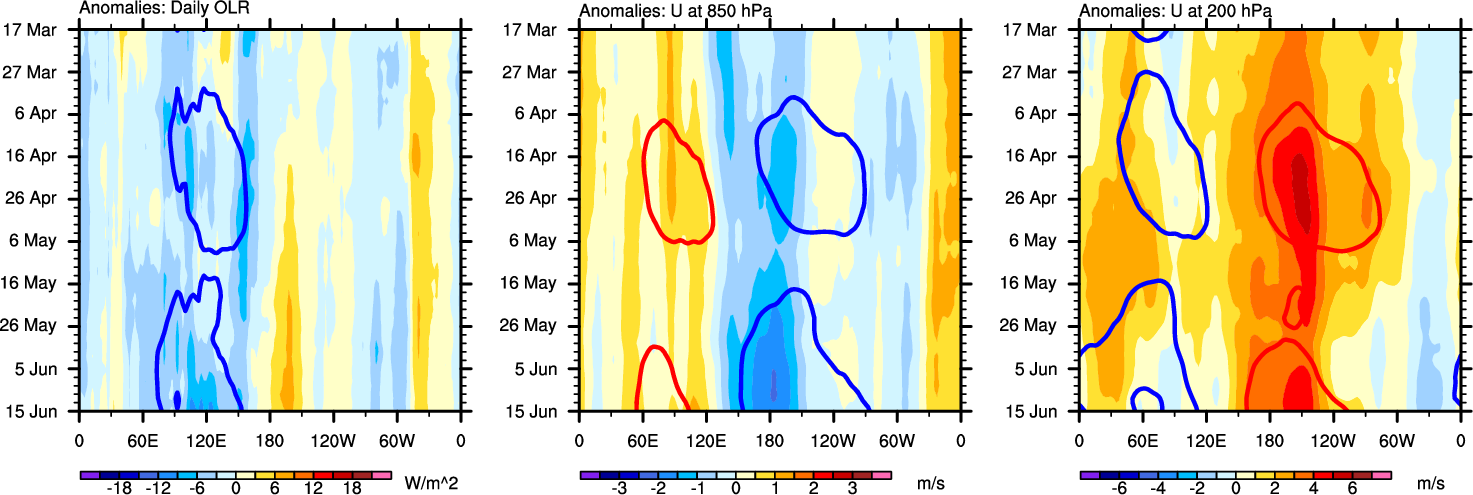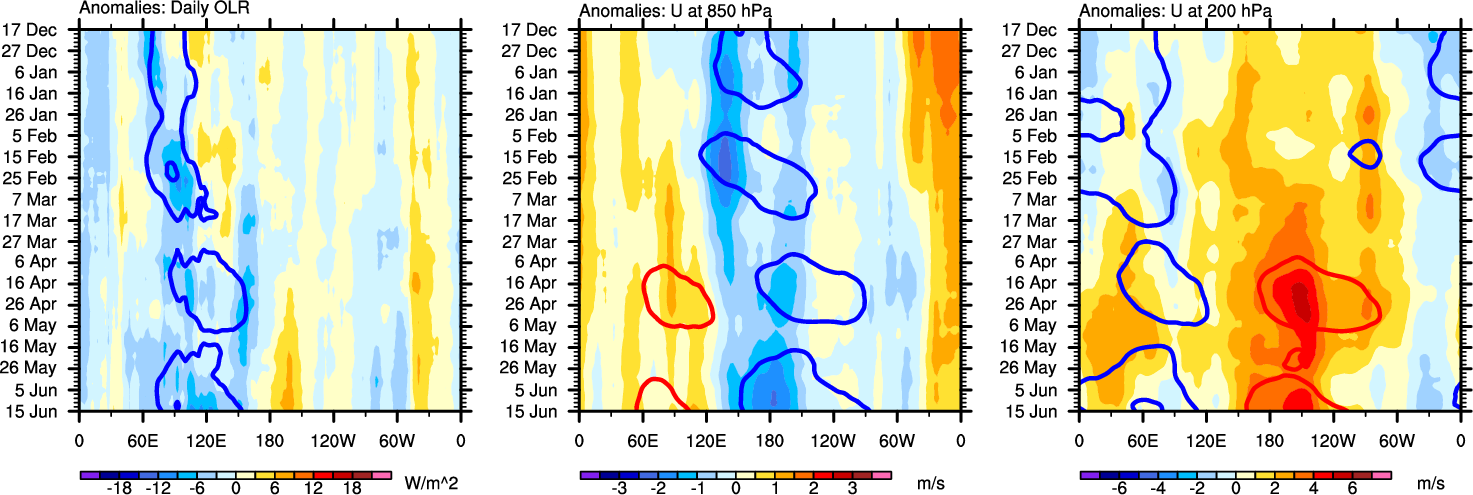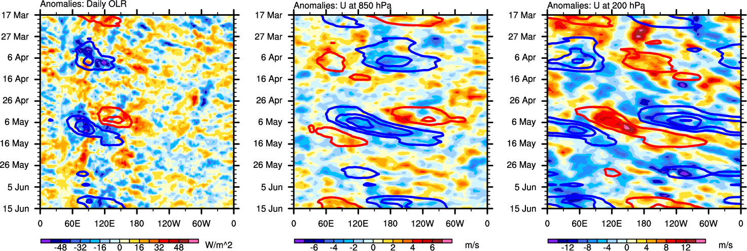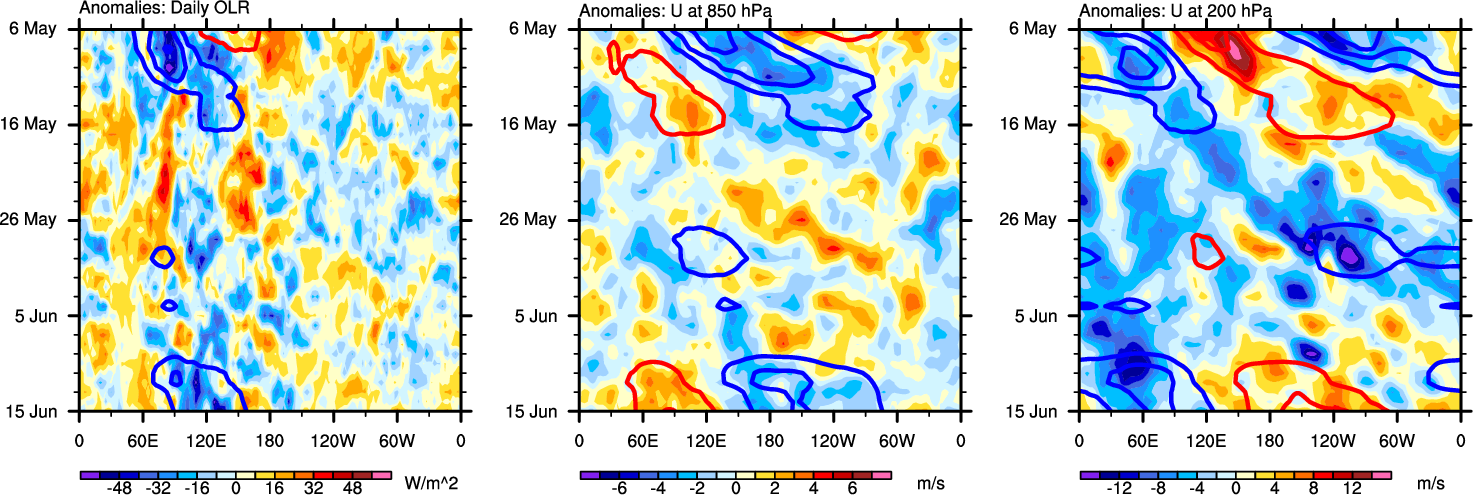 The Hovmollers show longitude-time plots for OLR, U-850, and U-200. The shading indicates the observed anomalies, while the contours are the projection of those anomalies onto the RMM EOFs.