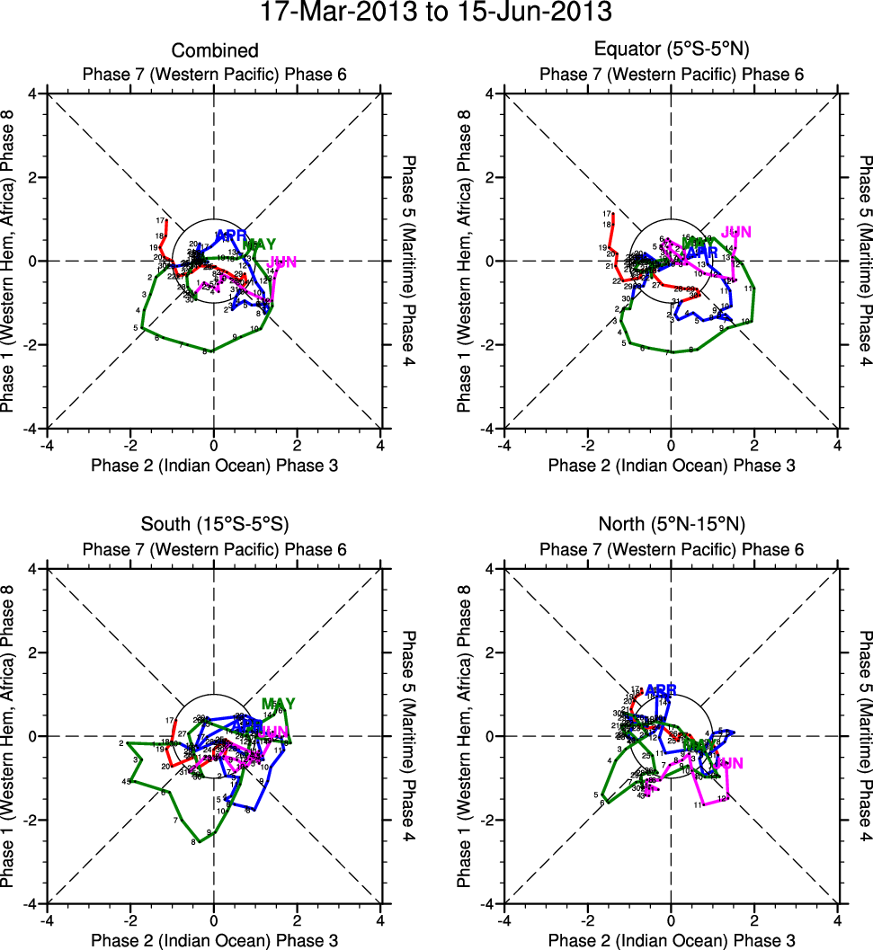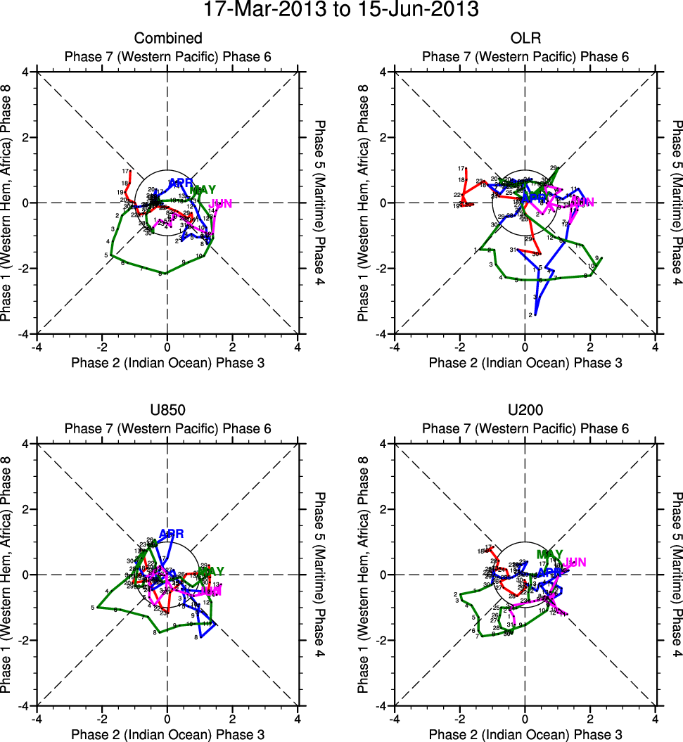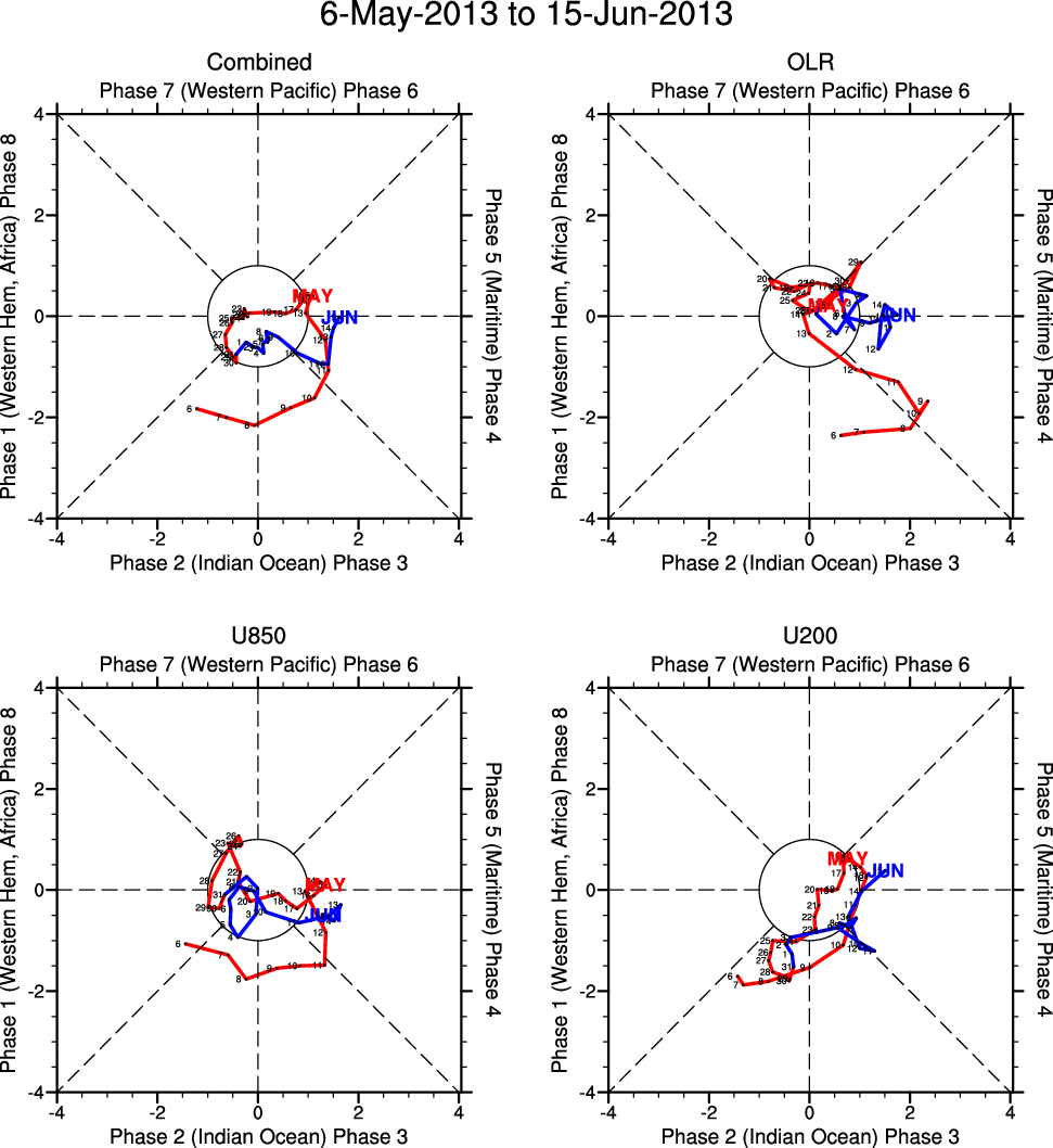 Wheeler and Hendon (2004) constructed the RMM index for monitoring the MJO. This index consists of the first two principal components (PCs) of OLR, 850-hPa zonal wind, and 200-hPa zonal wind averaged 15S-15N.