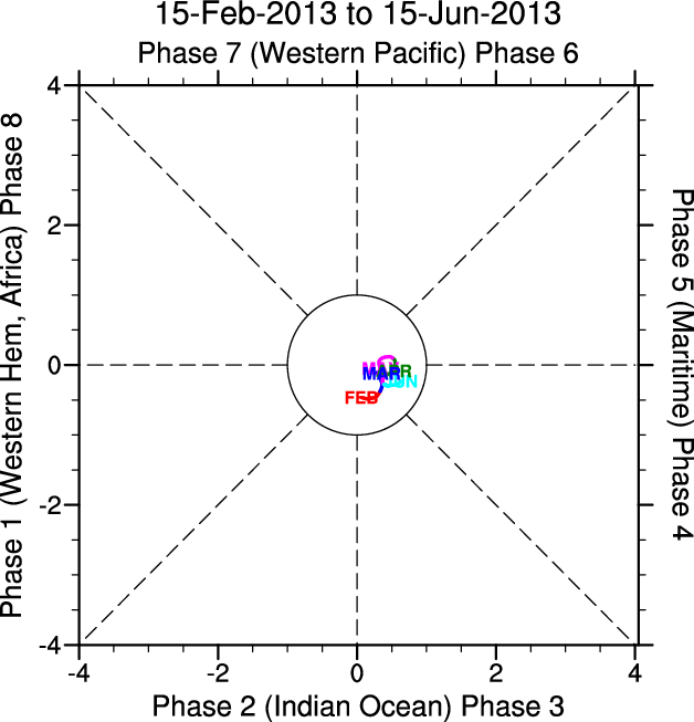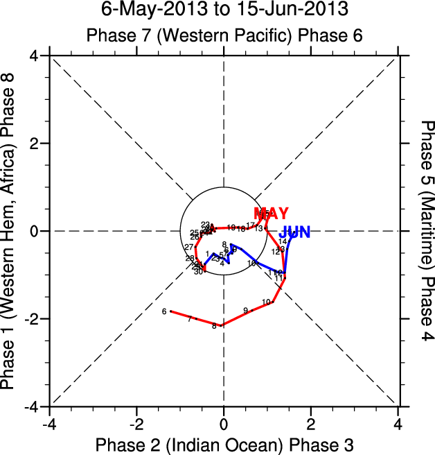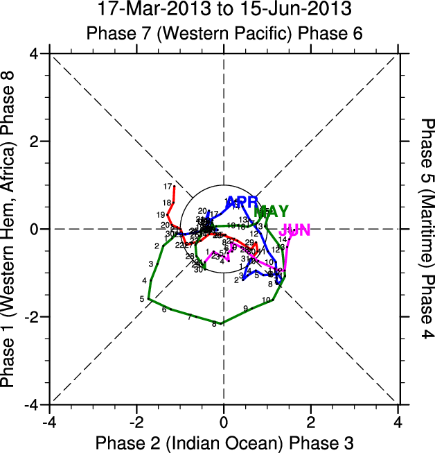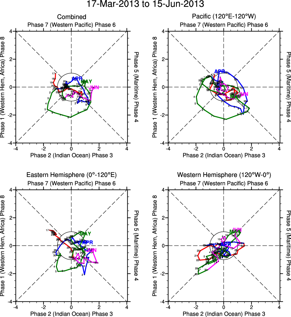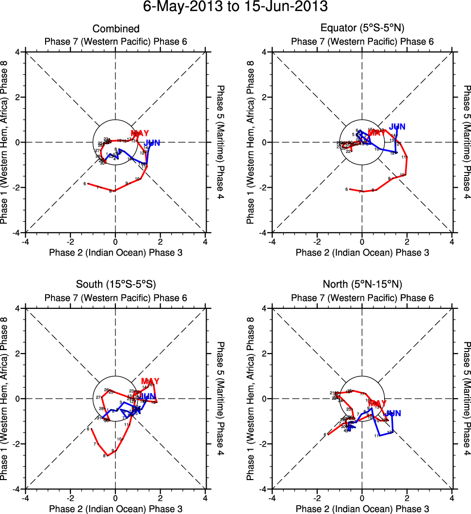 Wheeler and Hendon (2004) constructed the RMM index for monitoring the MJO. This index consists of the first two principal components (PCs) of OLR, 850-hPa zonal wind, and 200-hPa zonal wind averaged 15S-15N.