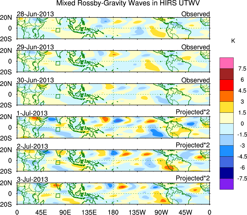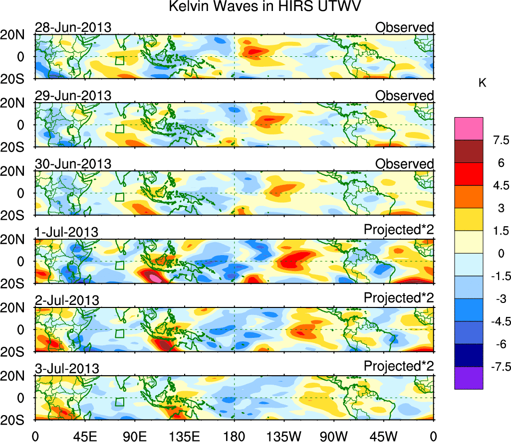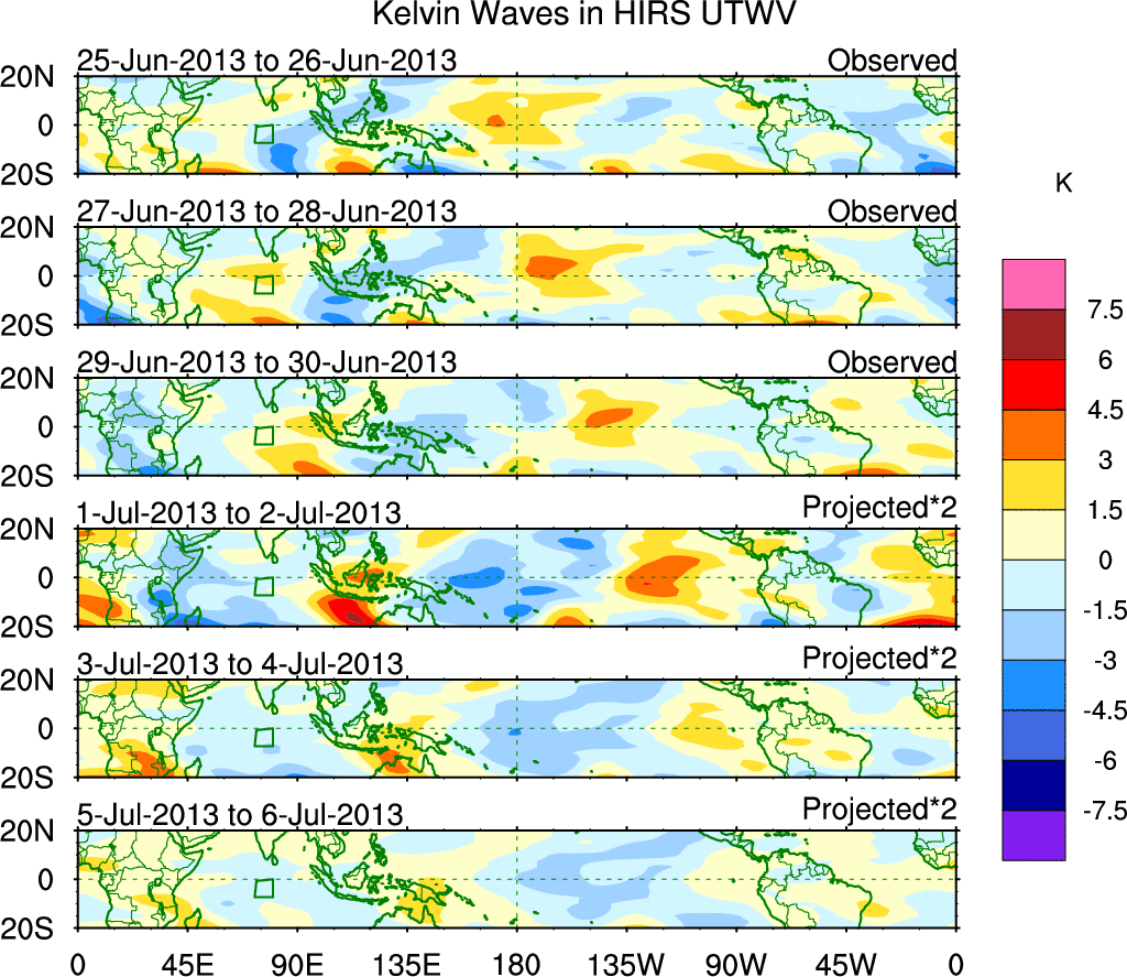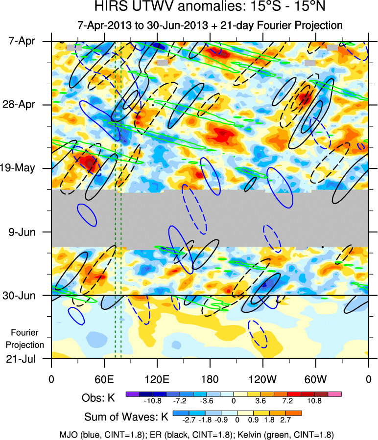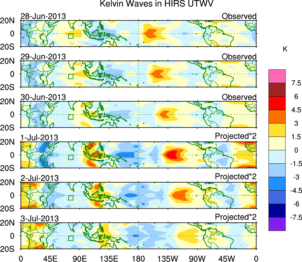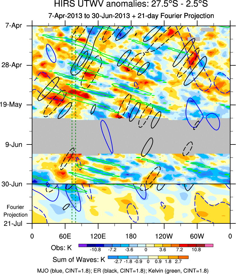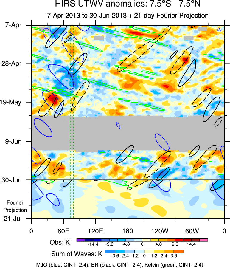 To identify tropical waves in near real-time, the OLR and UTWV data are filtered following Wheeler & Weickmann (2001 MWR). The daily anomalies are calculated using the first 3 harmonics of the seasonal cycle for 1979–2009. Missing values are then filled using linear interpolation in space and time. The most recent 365 days of anomalies are padded with 659 days of zeroes, and the result is filtered for each wave type.