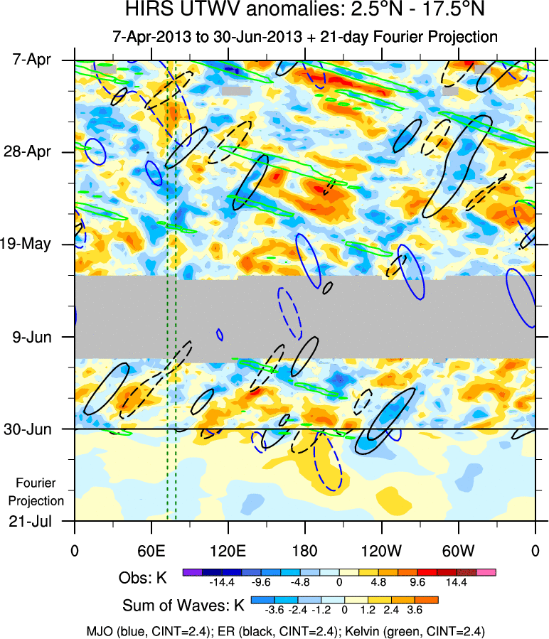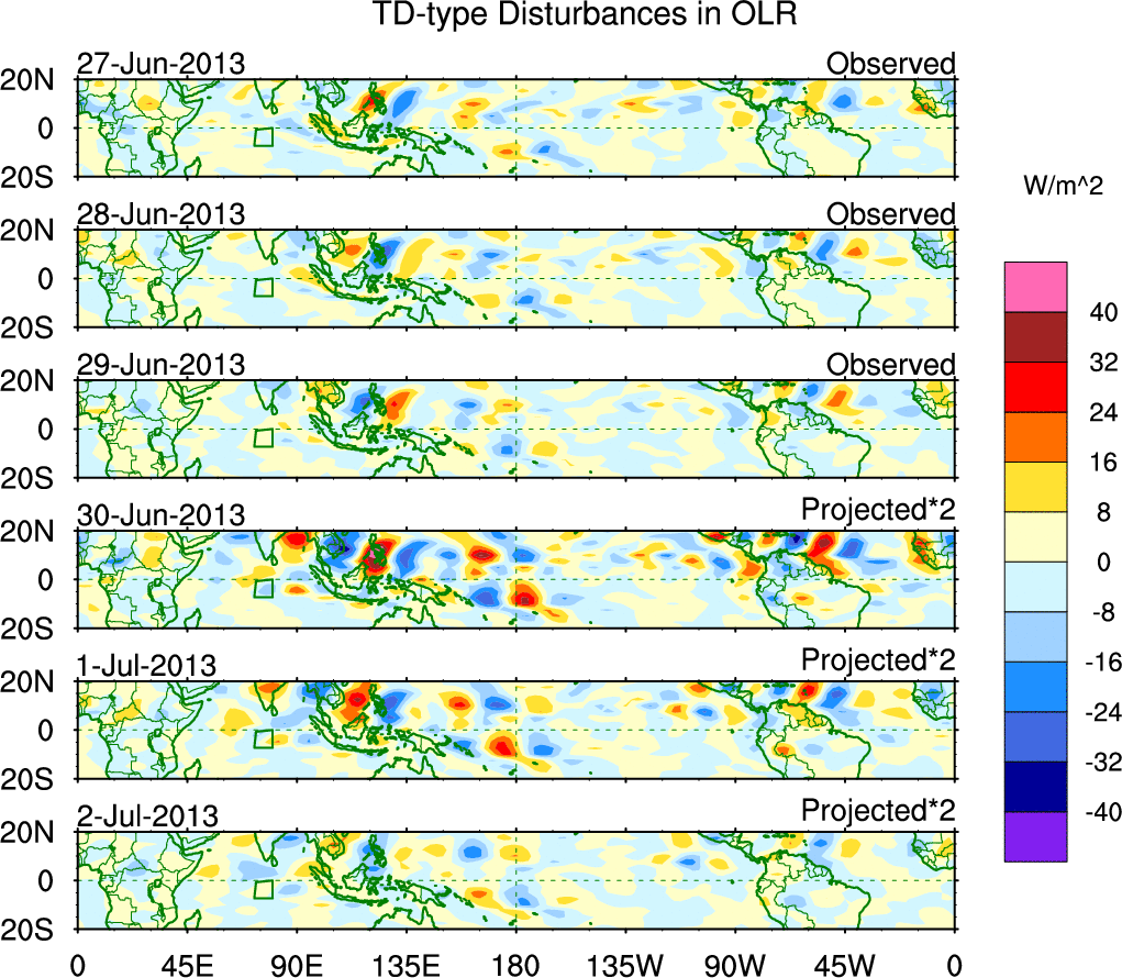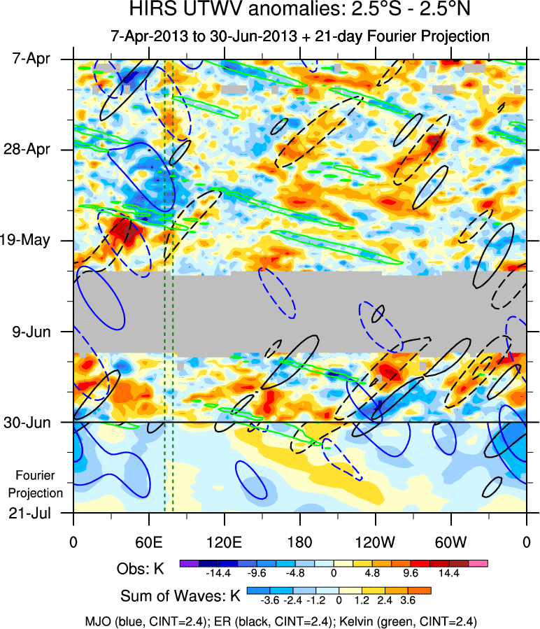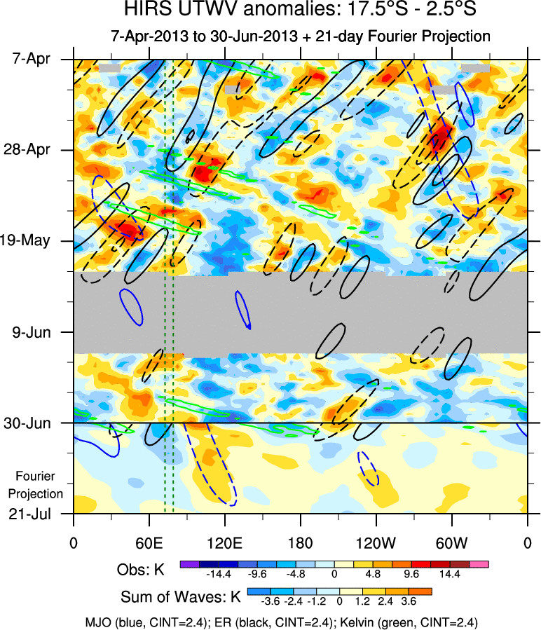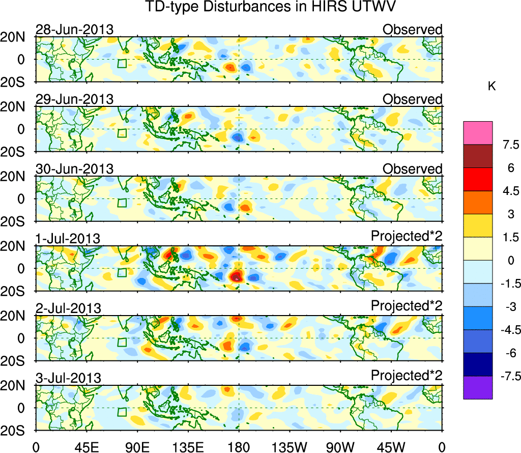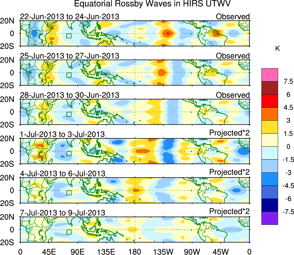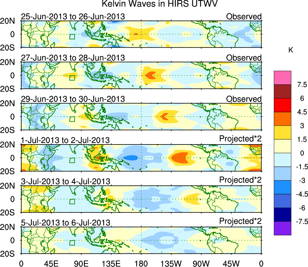 To identify tropical waves in near real-time, the OLR and UTWV data are filtered following Wheeler & Weickmann (2001 MWR). The daily anomalies are calculated using the first 3 harmonics of the seasonal cycle for 1979–2009. Missing values are then filled using linear interpolation in space and time. The most recent 365 days of anomalies are padded with 659 days of zeroes, and the result is filtered for each wave type.