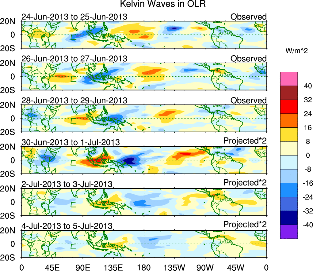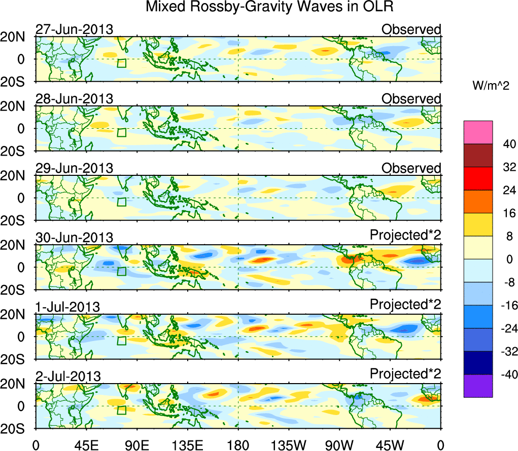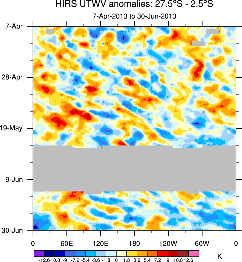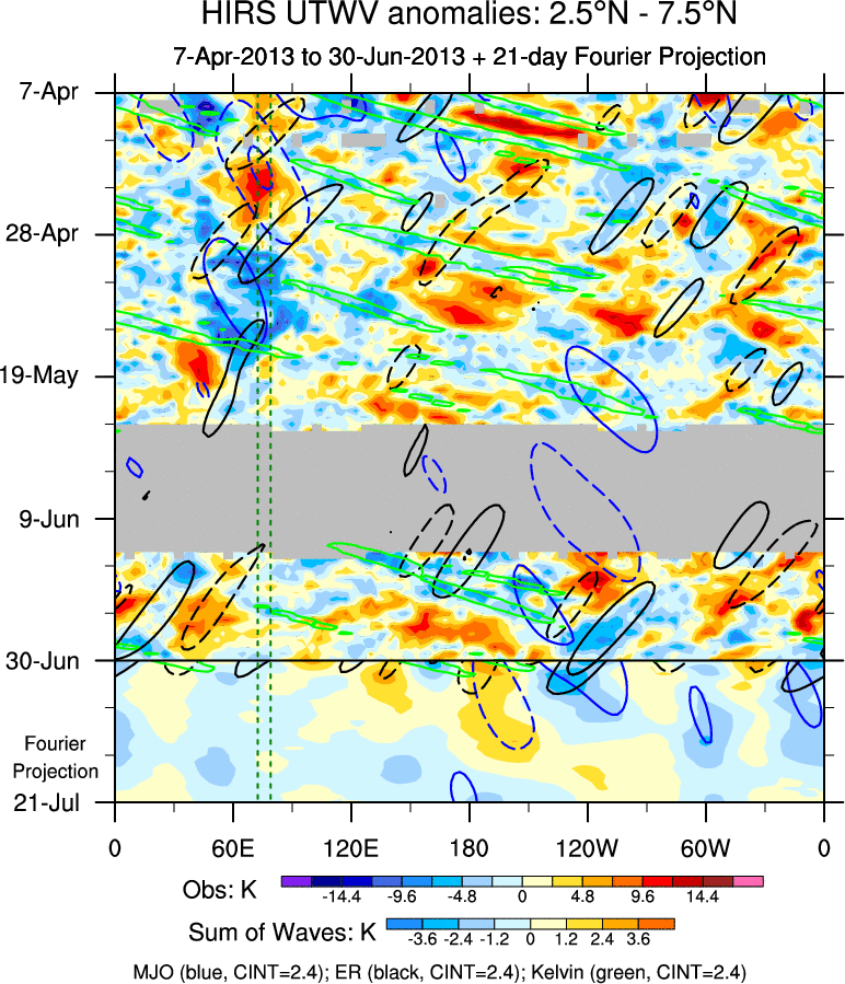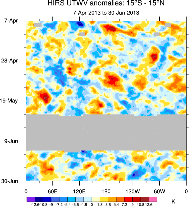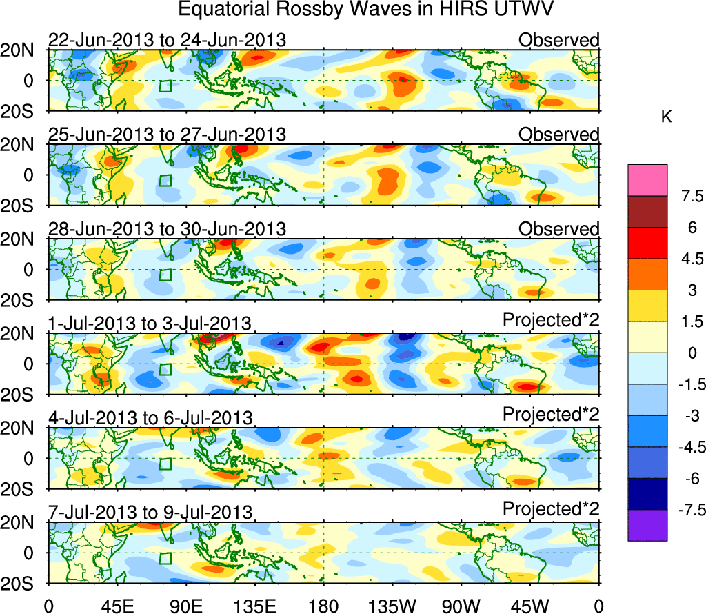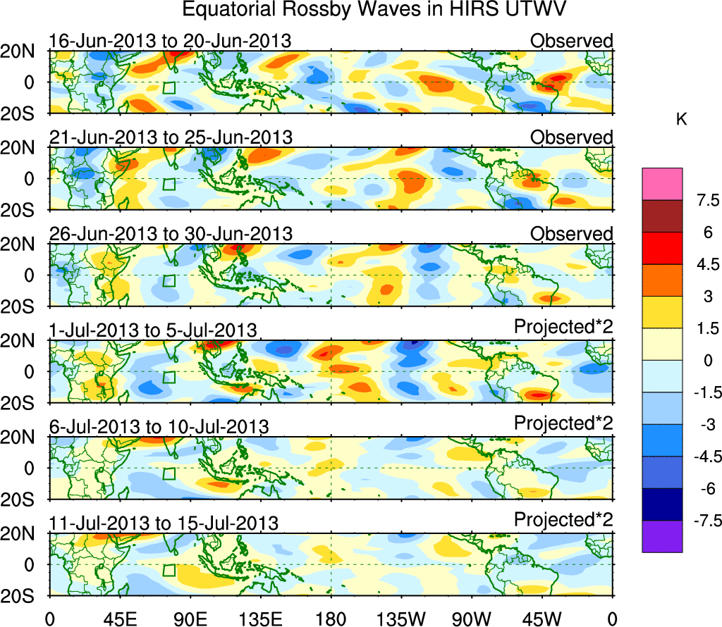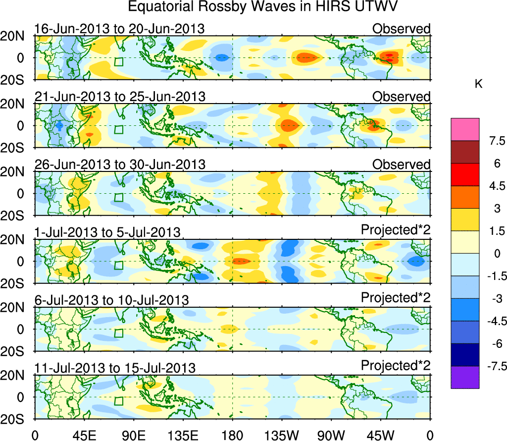 To identify tropical waves in near real-time, the OLR and UTWV data are filtered following Wheeler & Weickmann (2001 MWR). The daily anomalies are calculated using the first 3 harmonics of the seasonal cycle for 1979–2009. Missing values are then filled using linear interpolation in space and time. The most recent 365 days of anomalies are padded with 659 days of zeroes, and the result is filtered for each wave type.