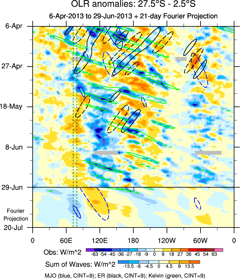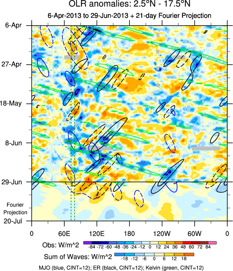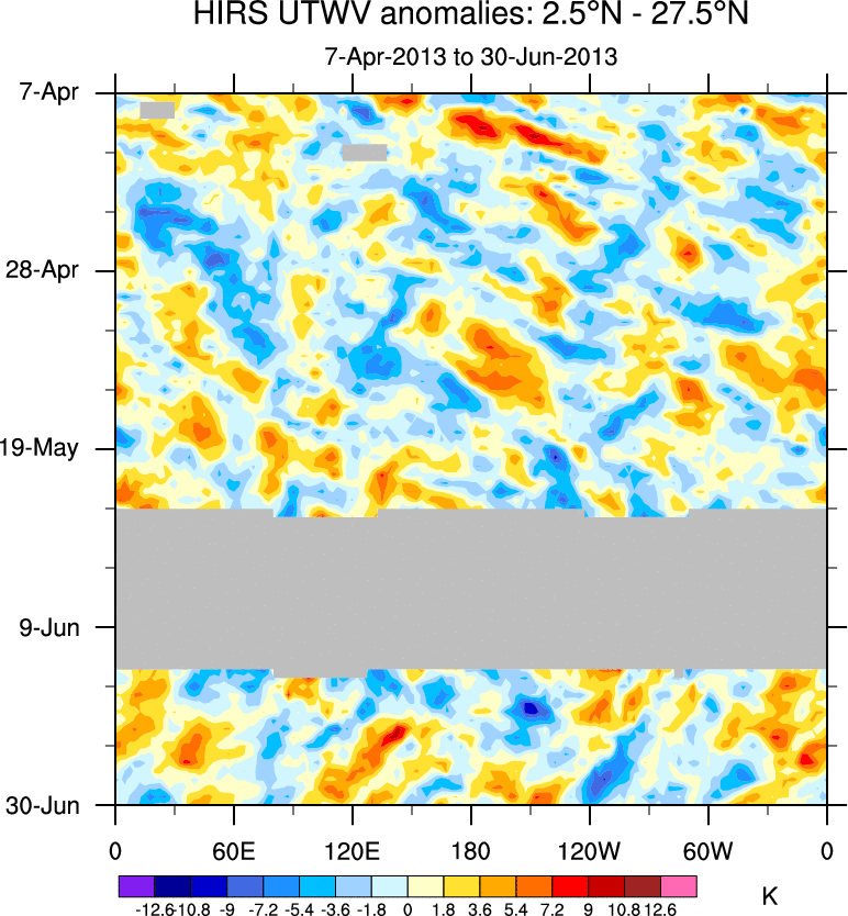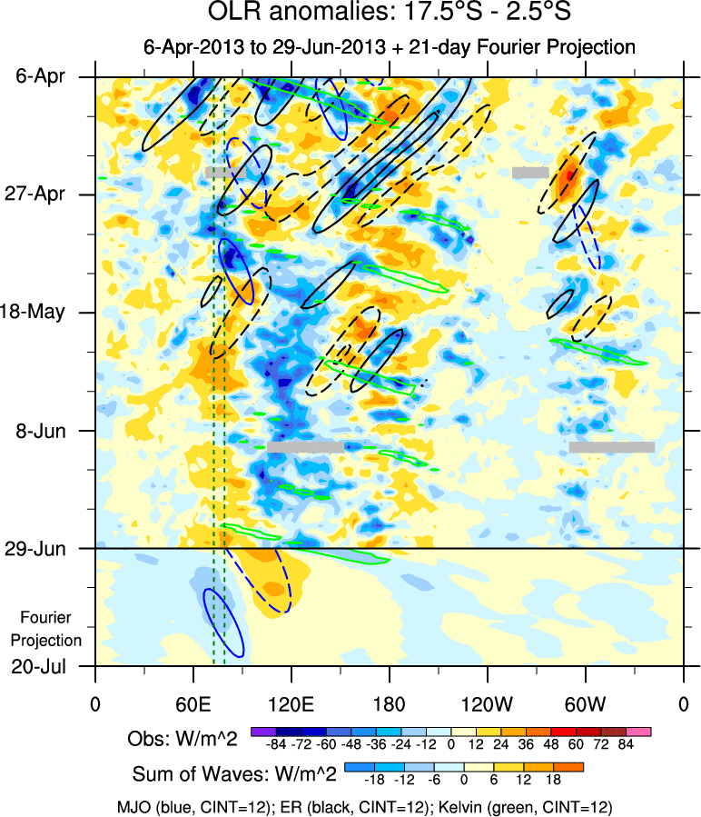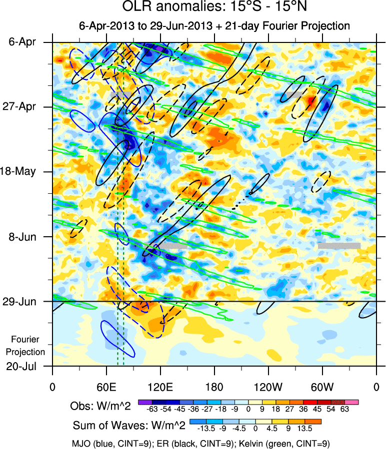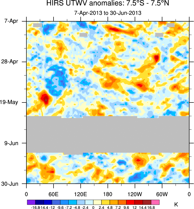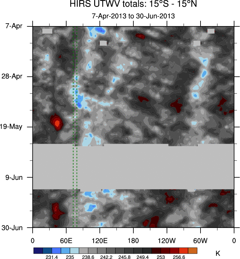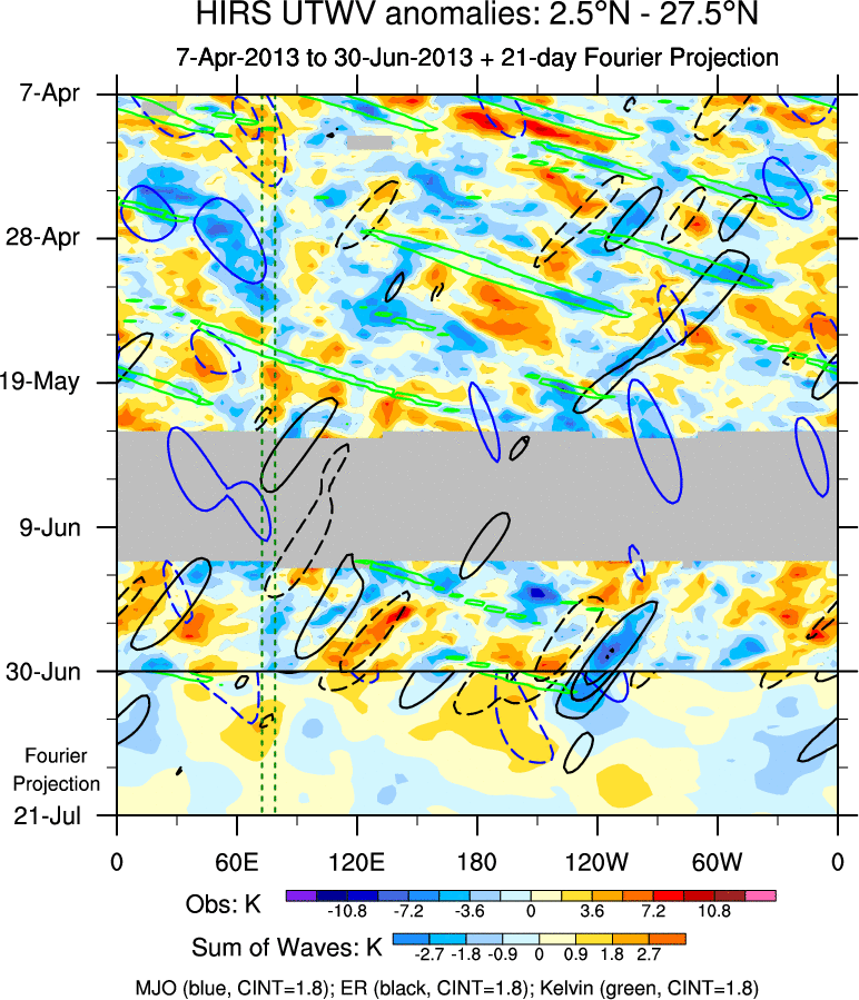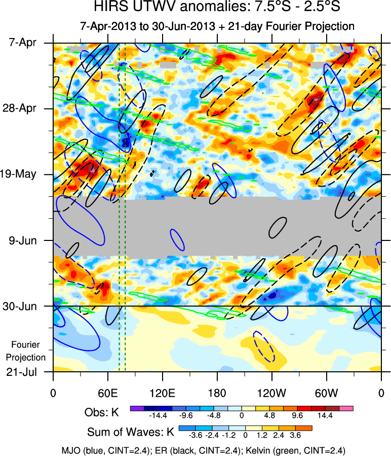 To identify tropical waves in near real-time, the OLR and UTWV data are filtered following Wheeler & Weickmann (2001 MWR). The daily anomalies are calculated using the first 3 harmonics of the seasonal cycle for 1979–2009. Missing values are then filled using linear interpolation in space and time. The most recent 365 days of anomalies are padded with 659 days of zeroes, and the result is filtered for each wave type.