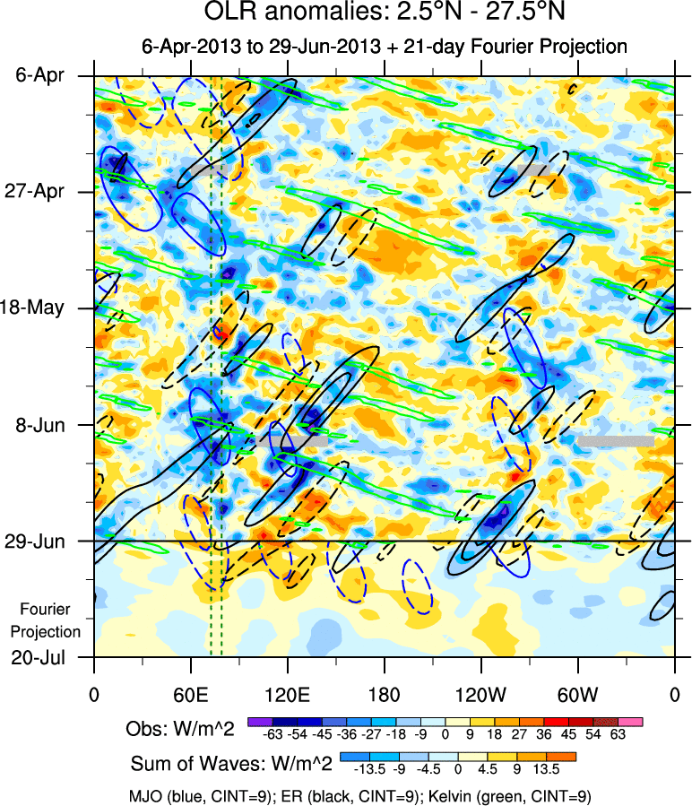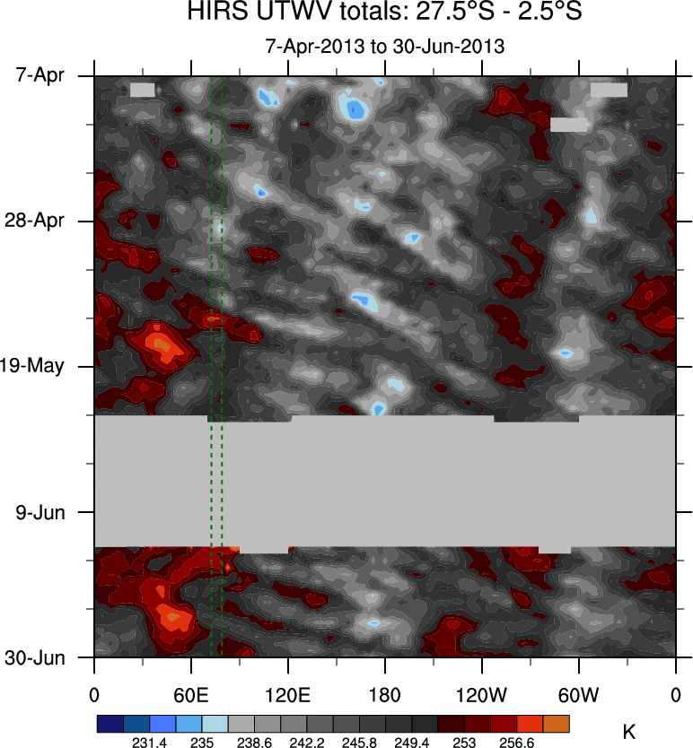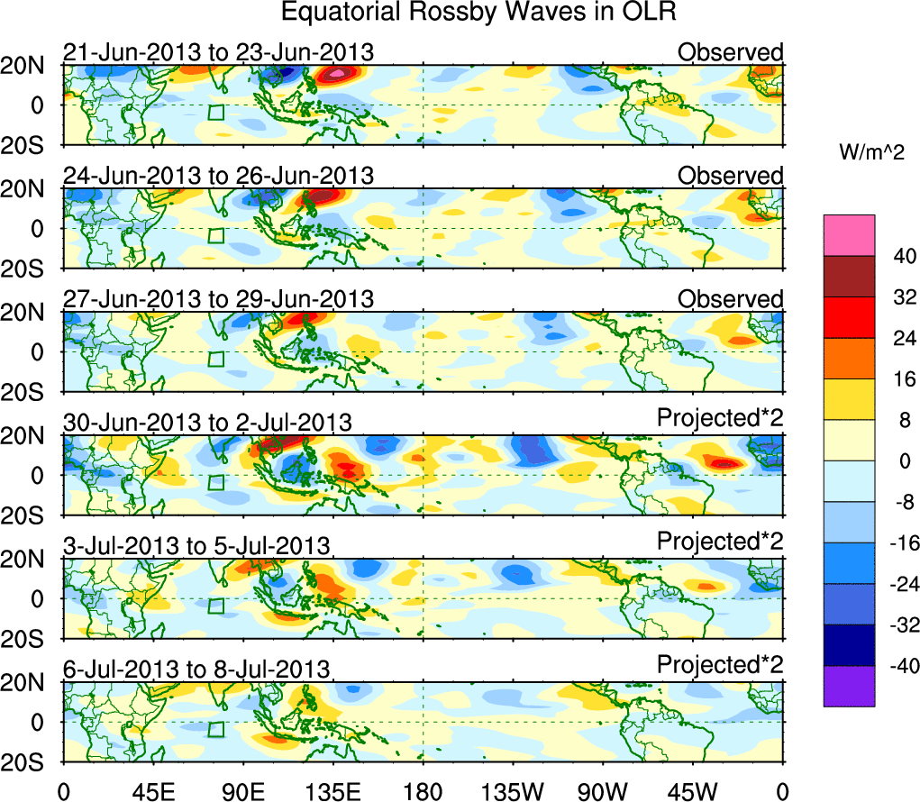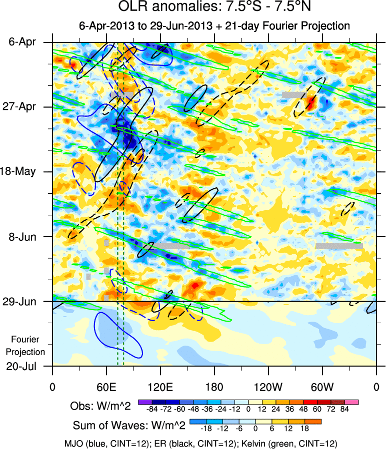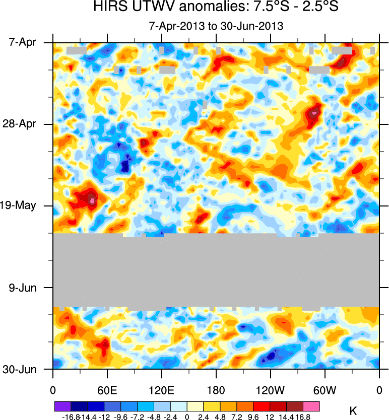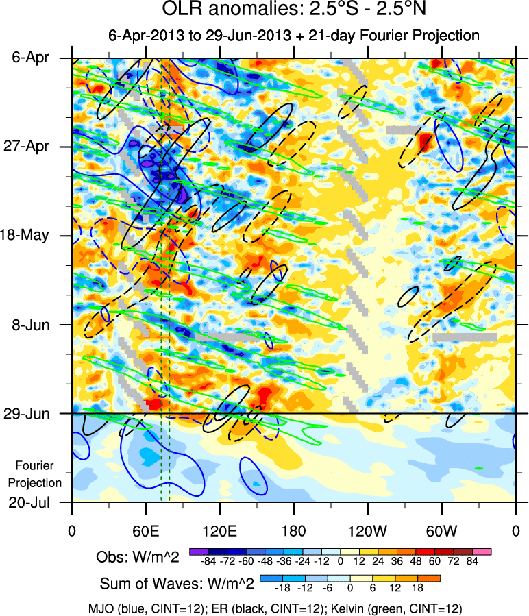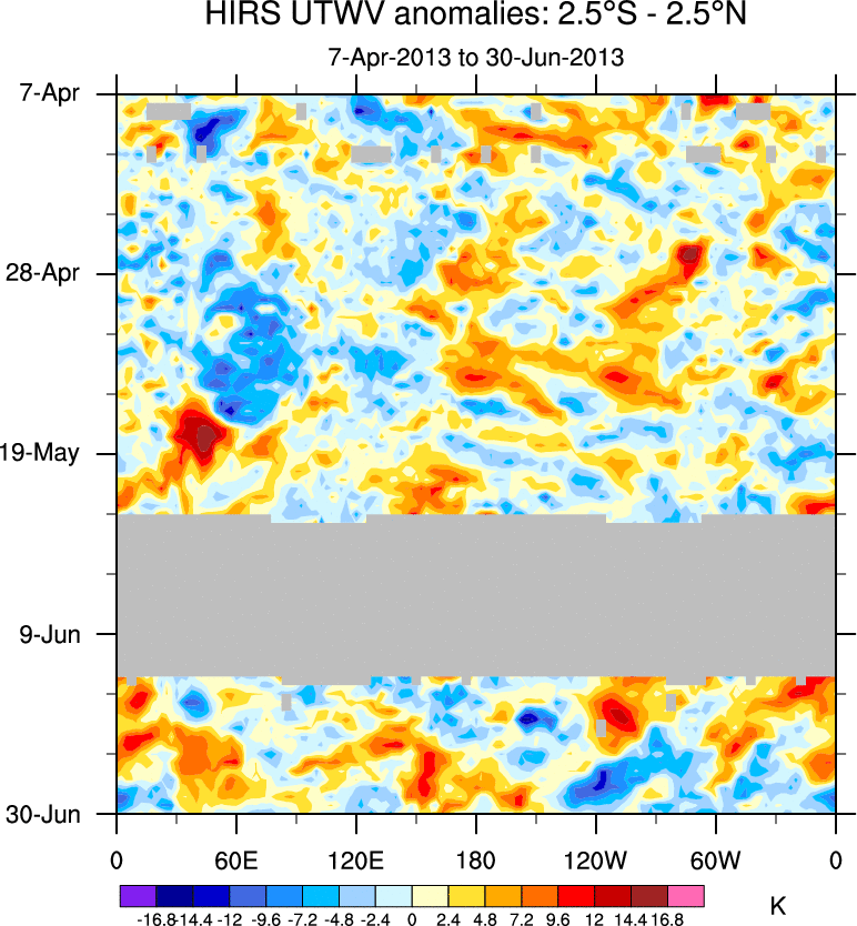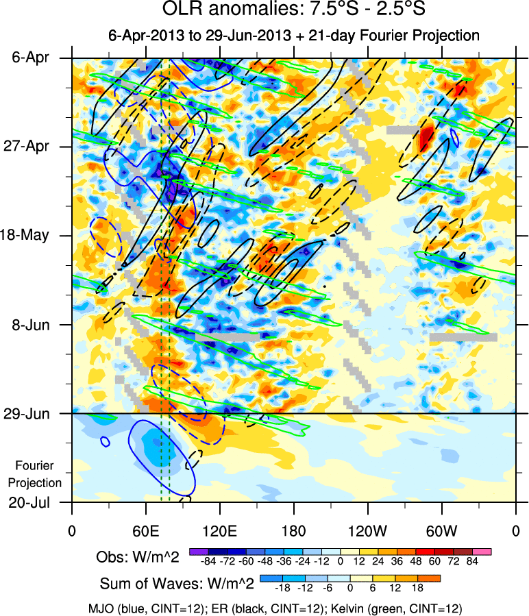 To identify tropical waves in near real-time, the OLR and UTWV data are filtered following Wheeler & Weickmann (2001 MWR). The daily anomalies are calculated using the first 3 harmonics of the seasonal cycle for 1979–2009. Missing values are then filled using linear interpolation in space and time. The most recent 365 days of anomalies are padded with 659 days of zeroes, and the result is filtered for each wave type.