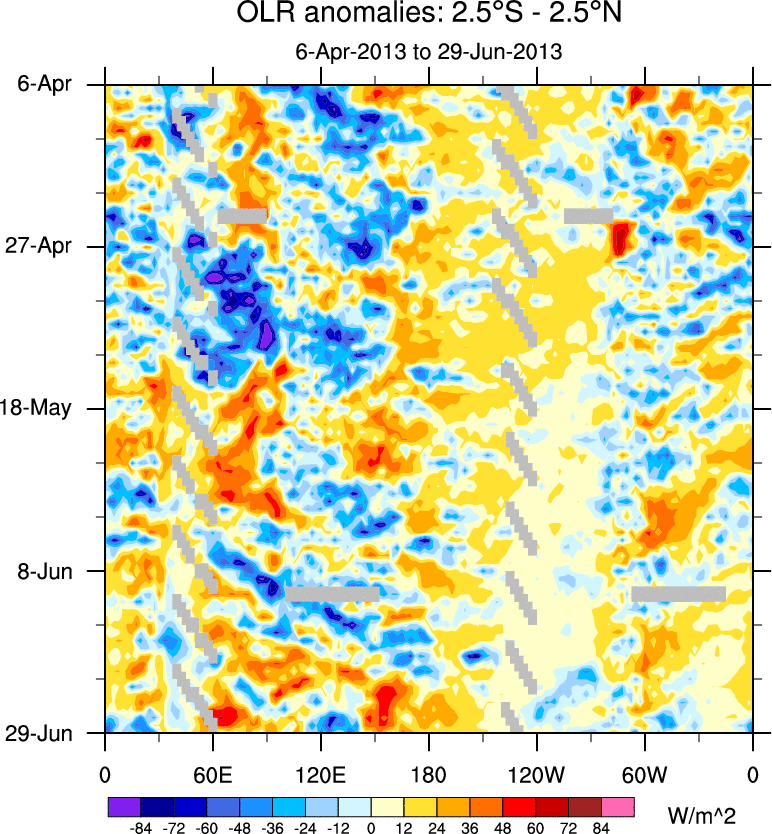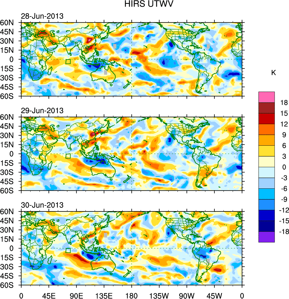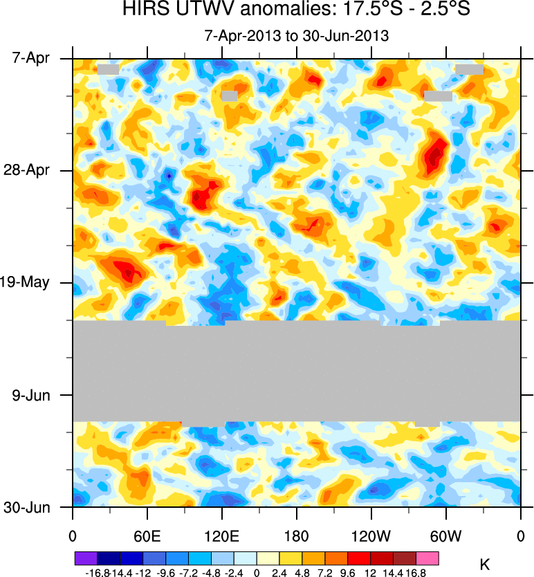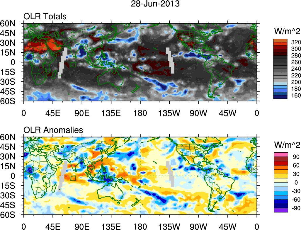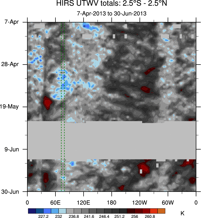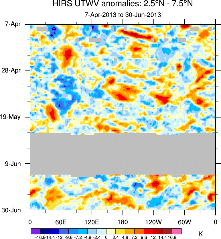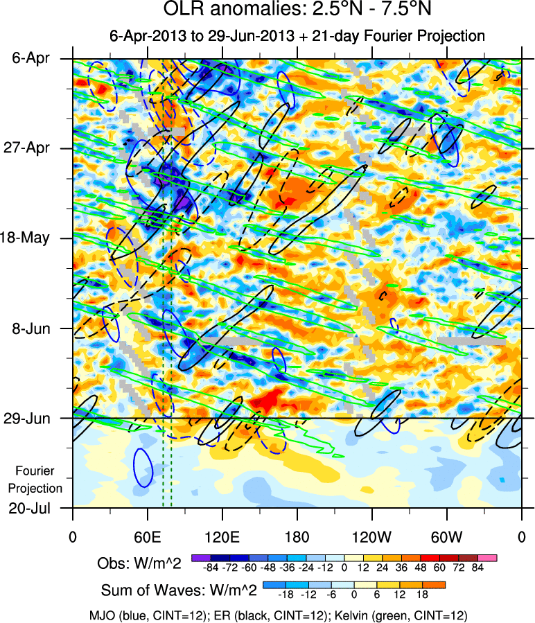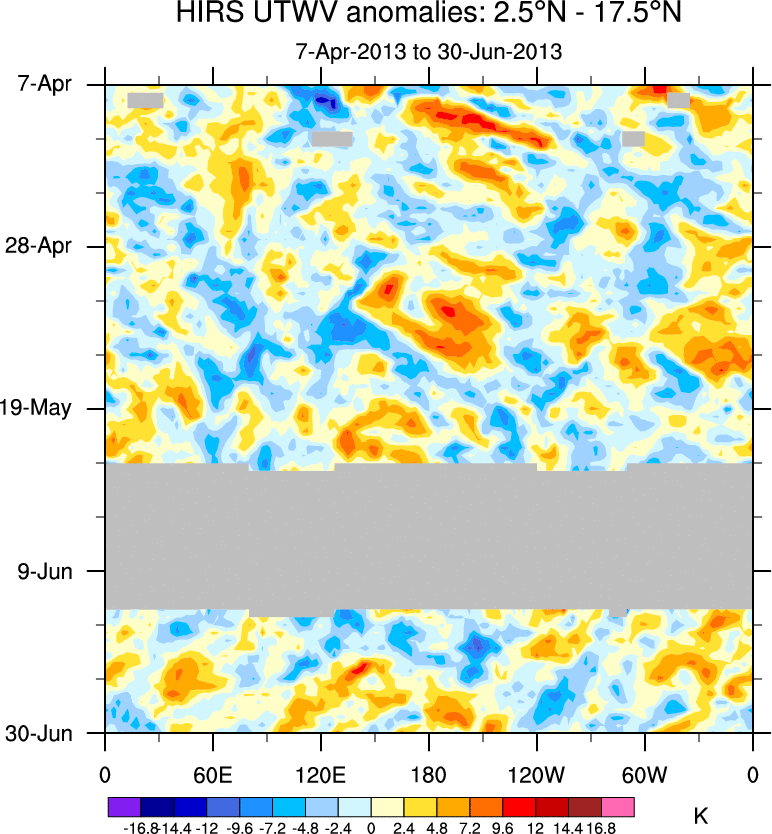 To identify tropical waves in near real-time, the OLR and UTWV data are filtered following Wheeler & Weickmann (2001 MWR). The daily anomalies are calculated using the first 3 harmonics of the seasonal cycle for 1979–2009. Missing values are then filled using linear interpolation in space and time. The most recent 365 days of anomalies are padded with 659 days of zeroes, and the result is filtered for each wave type.