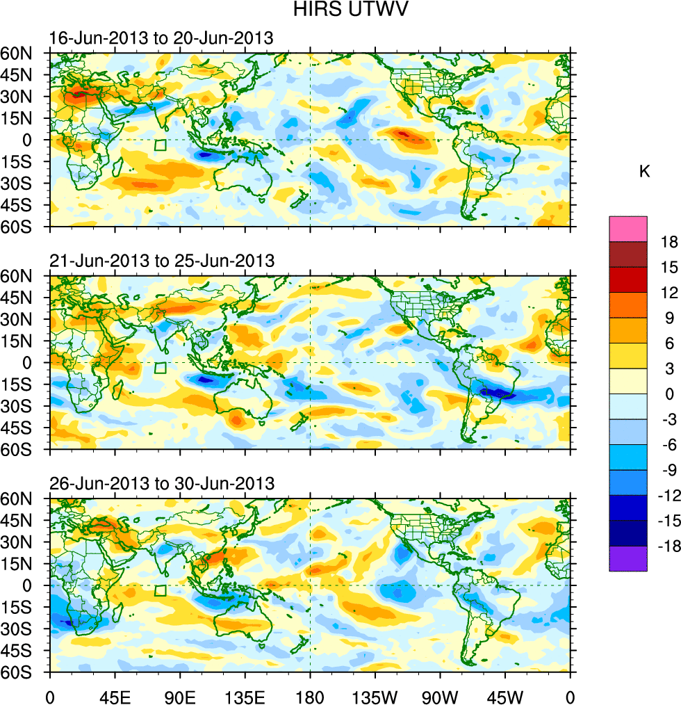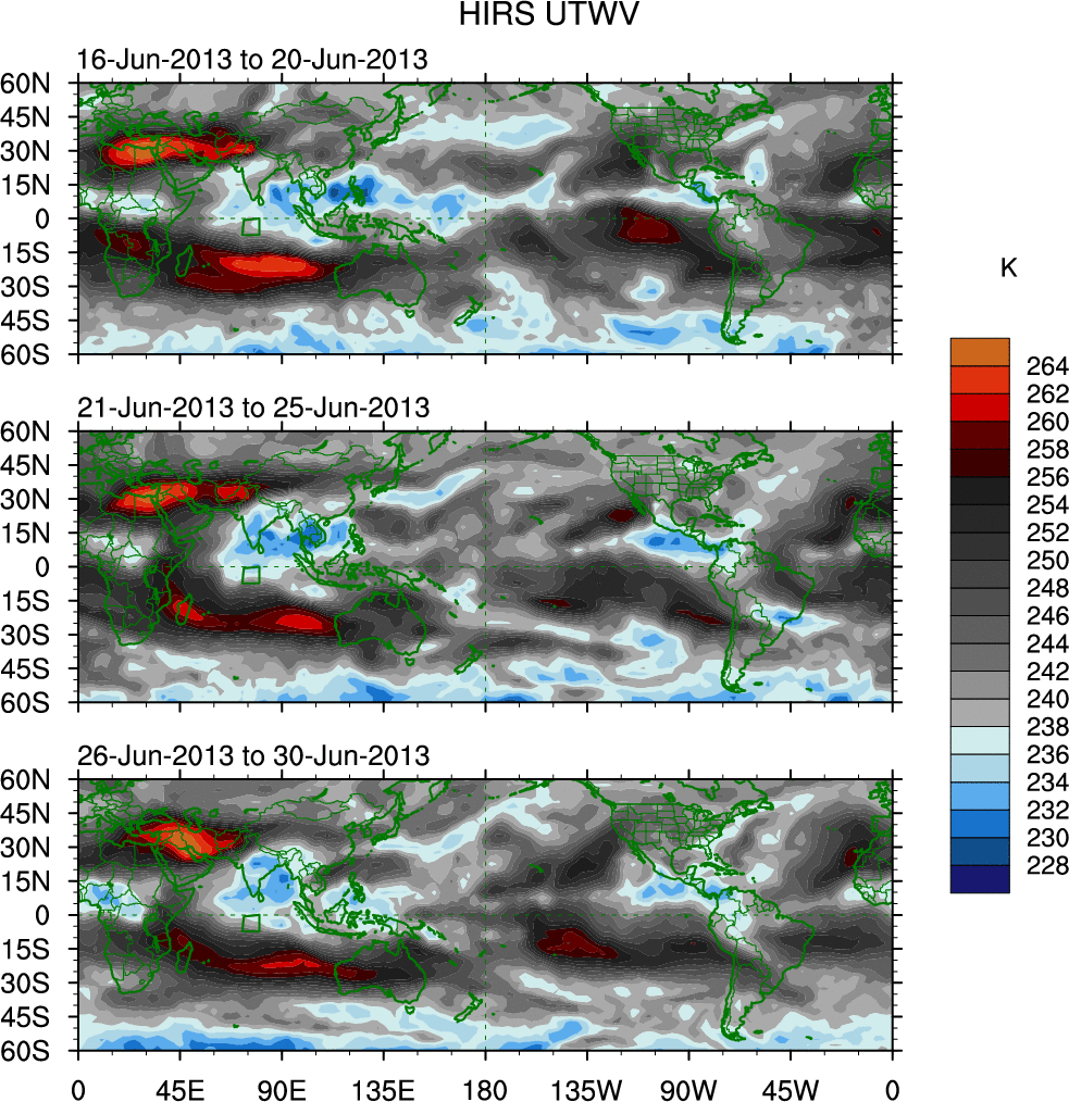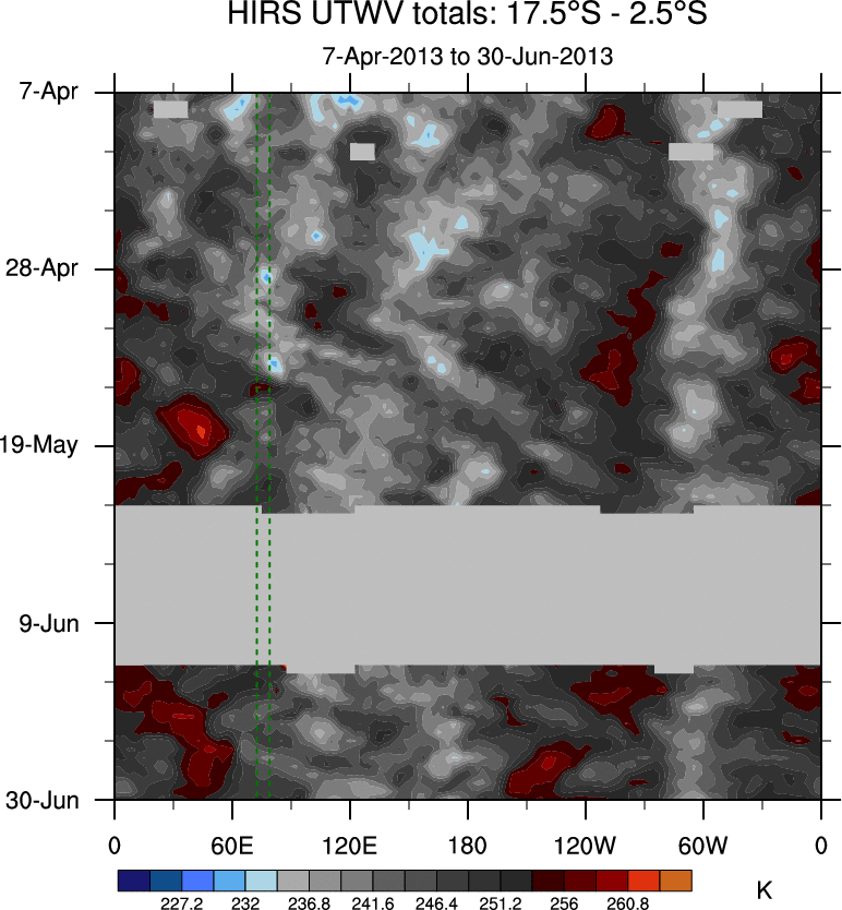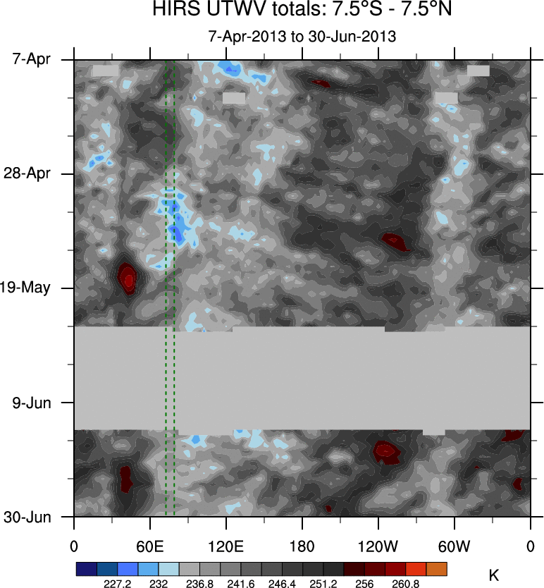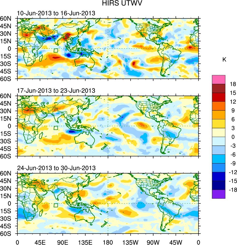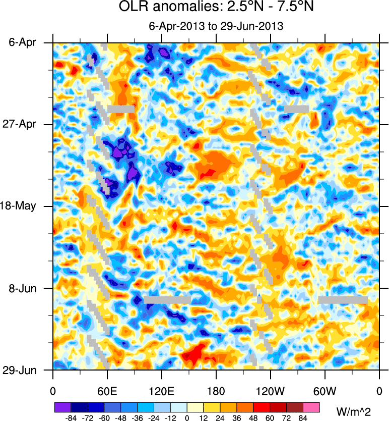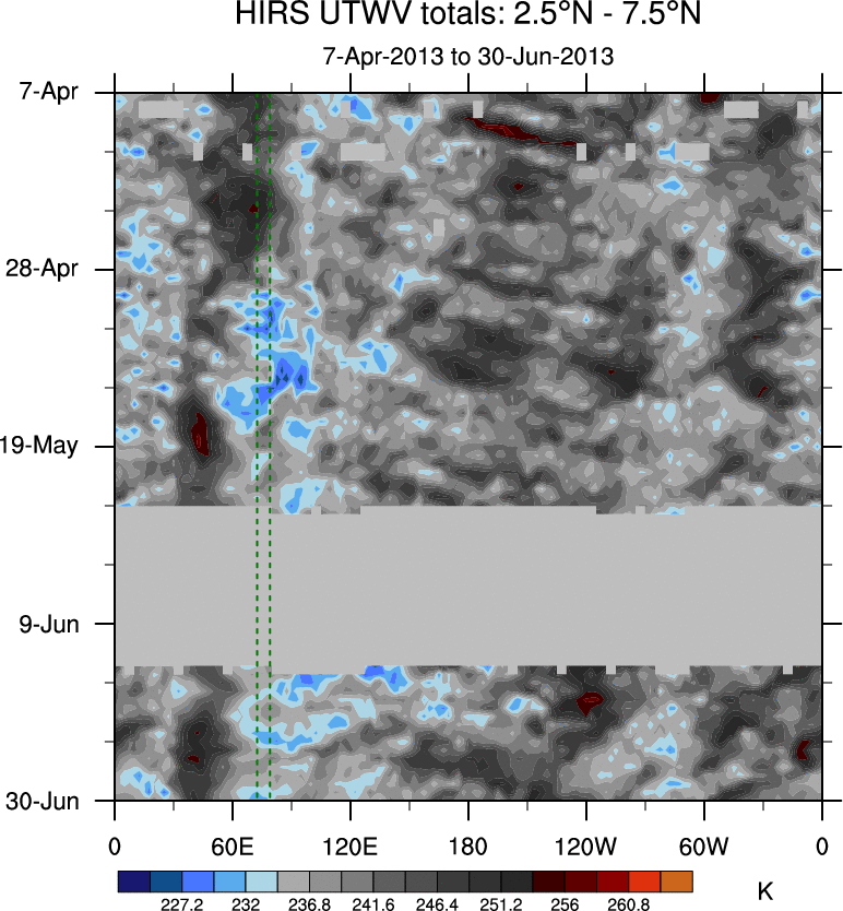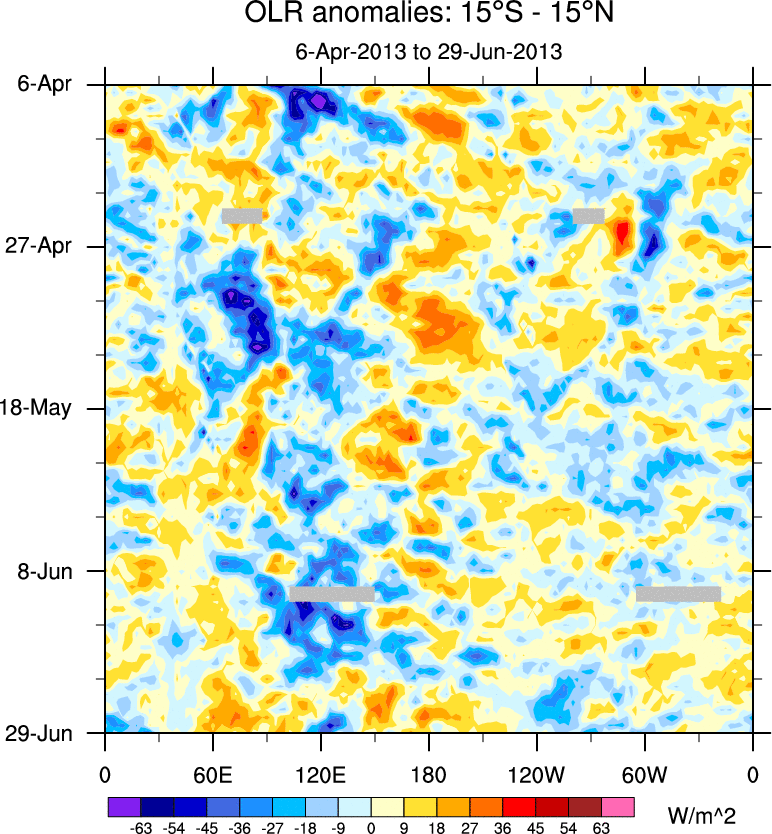 To identify tropical waves in near real-time, the OLR and UTWV data are filtered following Wheeler & Weickmann (2001 MWR). The daily anomalies are calculated using the first 3 harmonics of the seasonal cycle for 1979–2009. Missing values are then filled using linear interpolation in space and time. The most recent 365 days of anomalies are padded with 659 days of zeroes, and the result is filtered for each wave type.